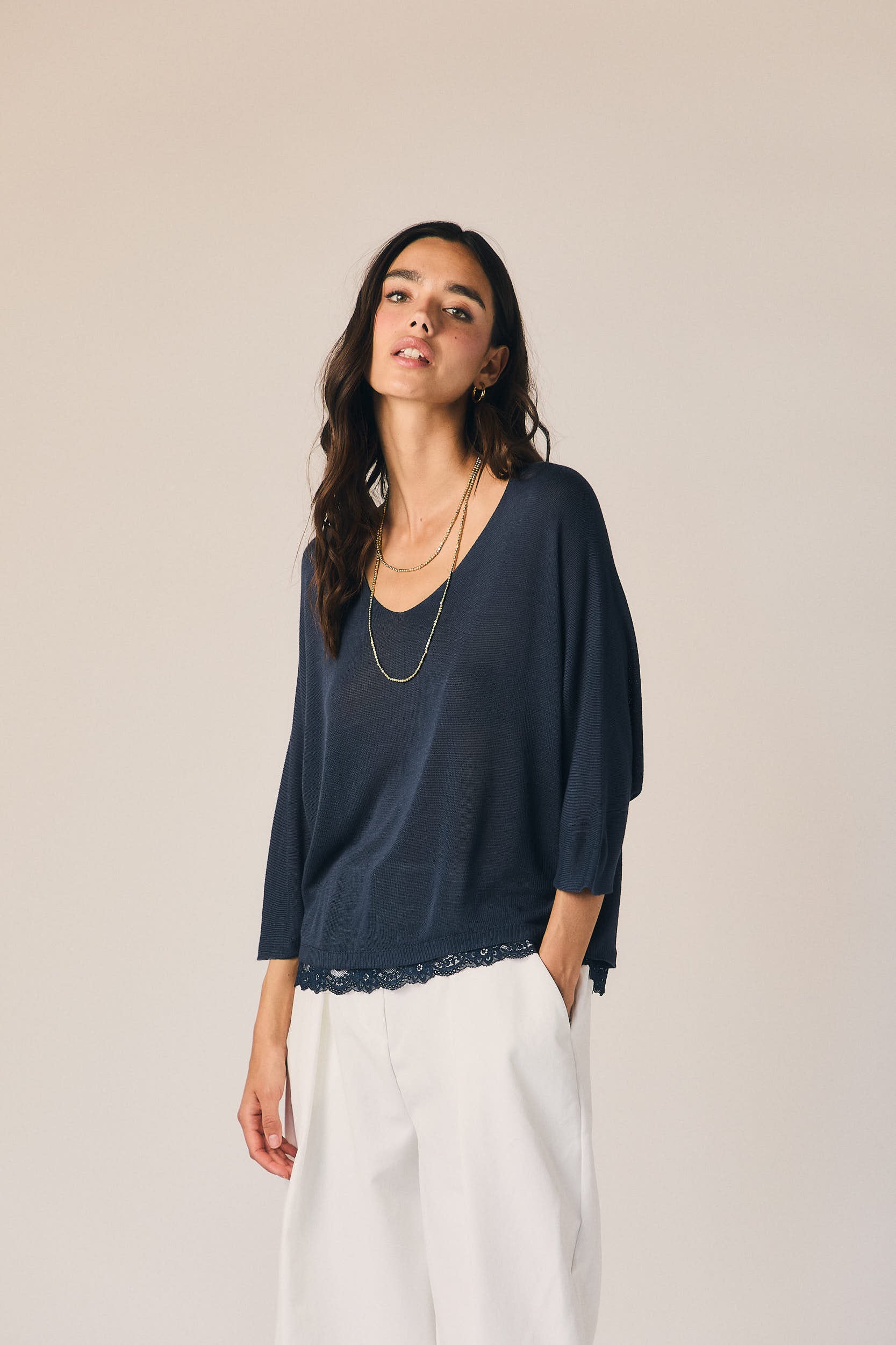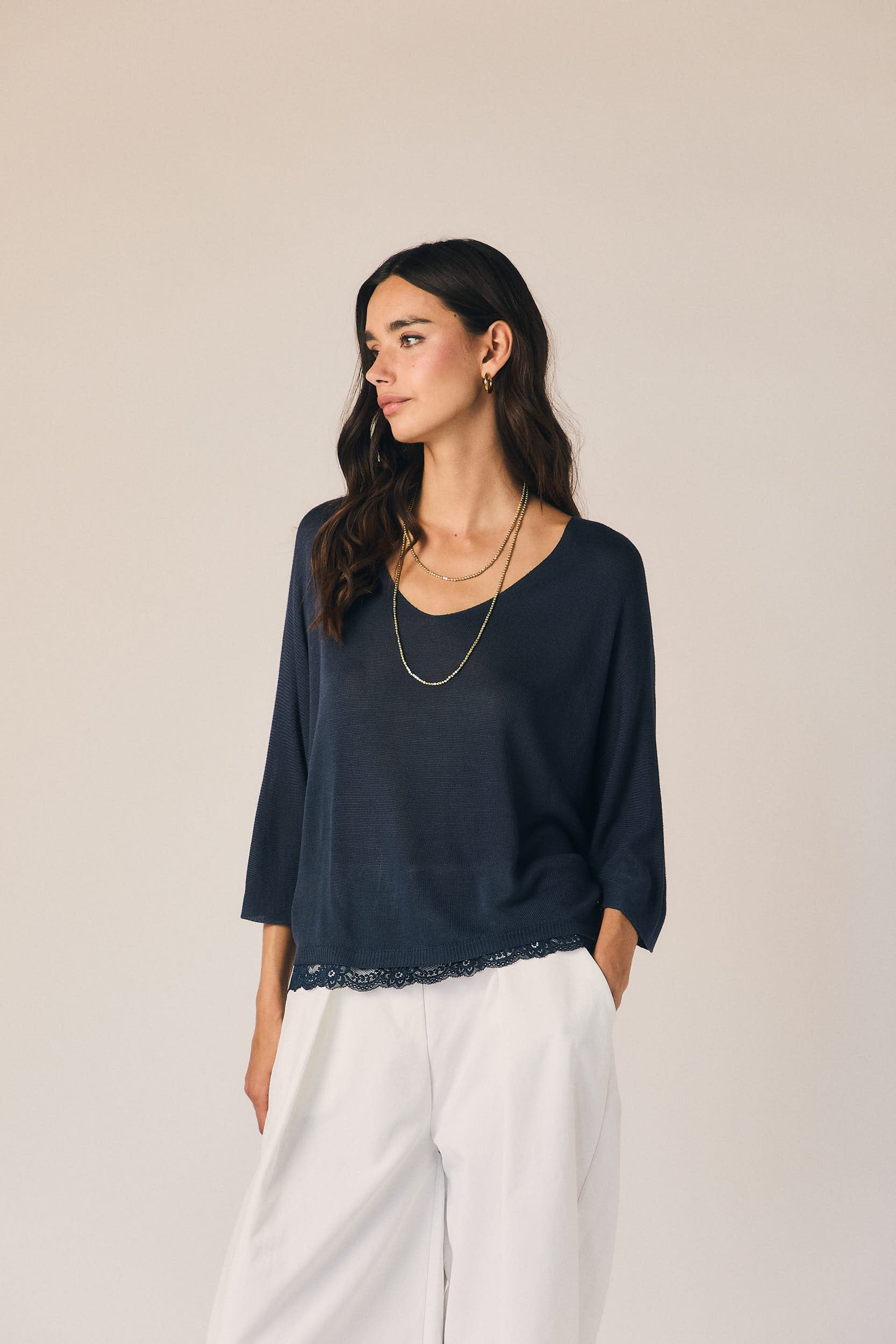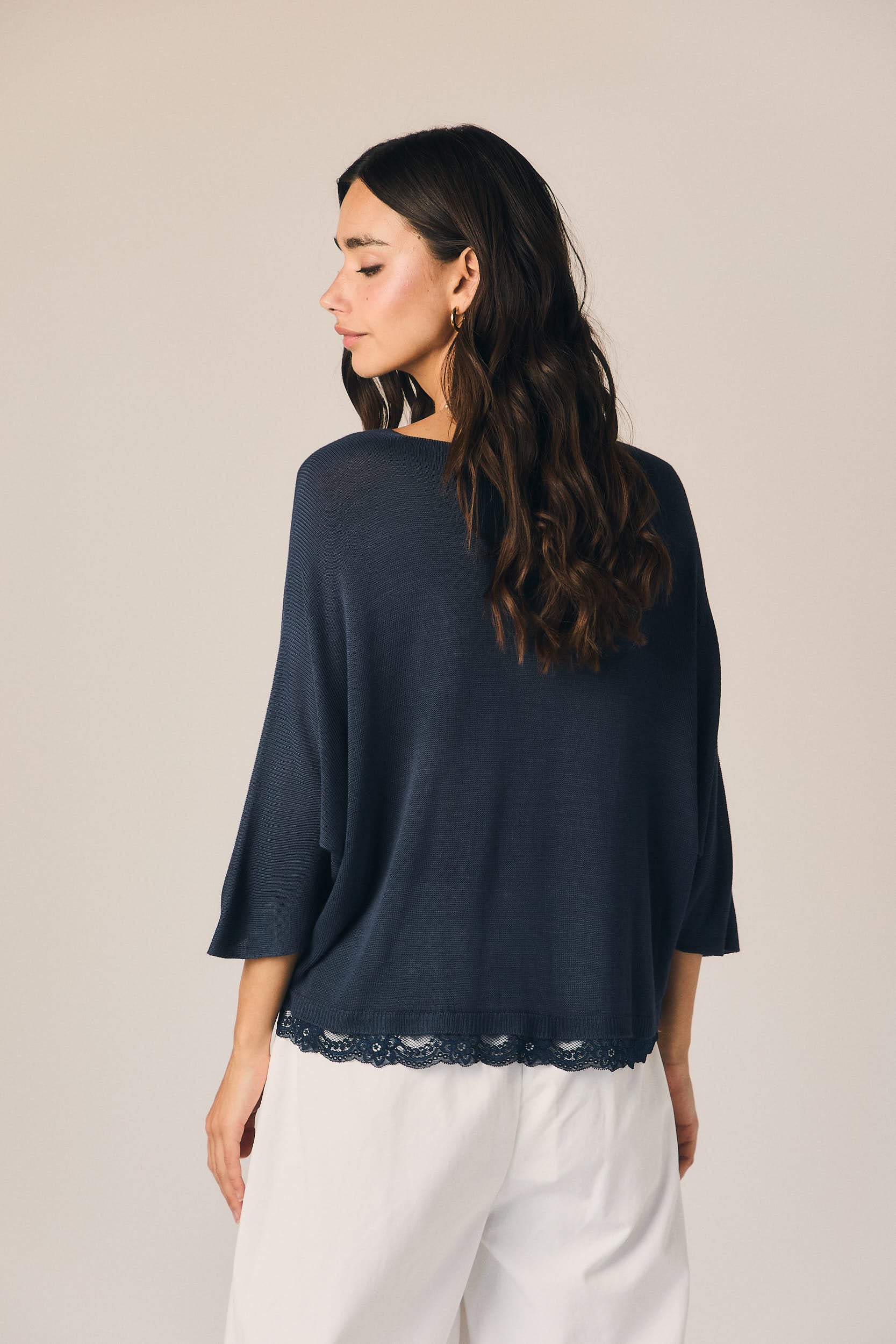 Top en tono azul marino de corte recto y caída fluida. Escote en pico y manga tres cuartos amplia, con detalle de puntilla en el bajo que aporta un acabado delicado y contraste sutil.