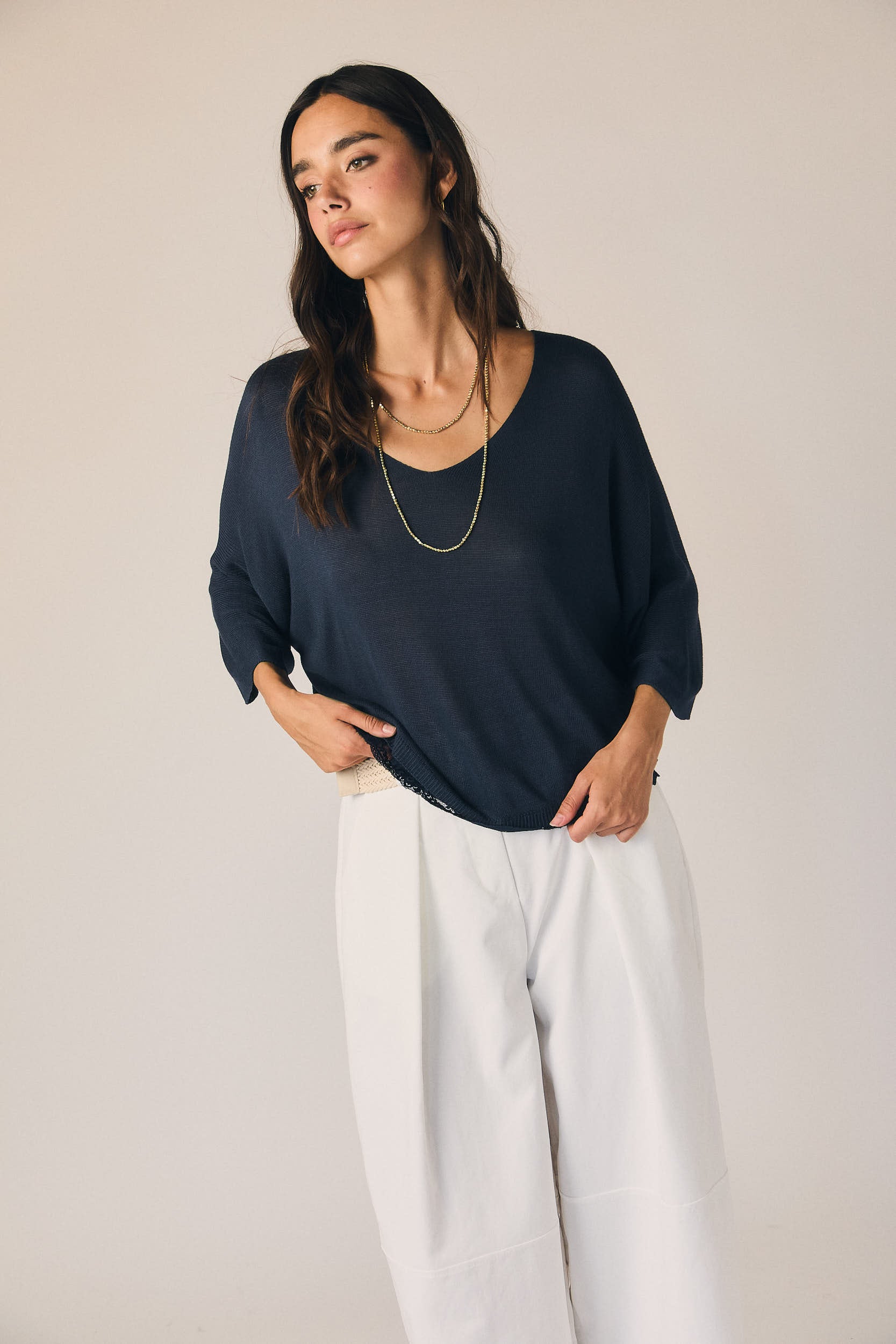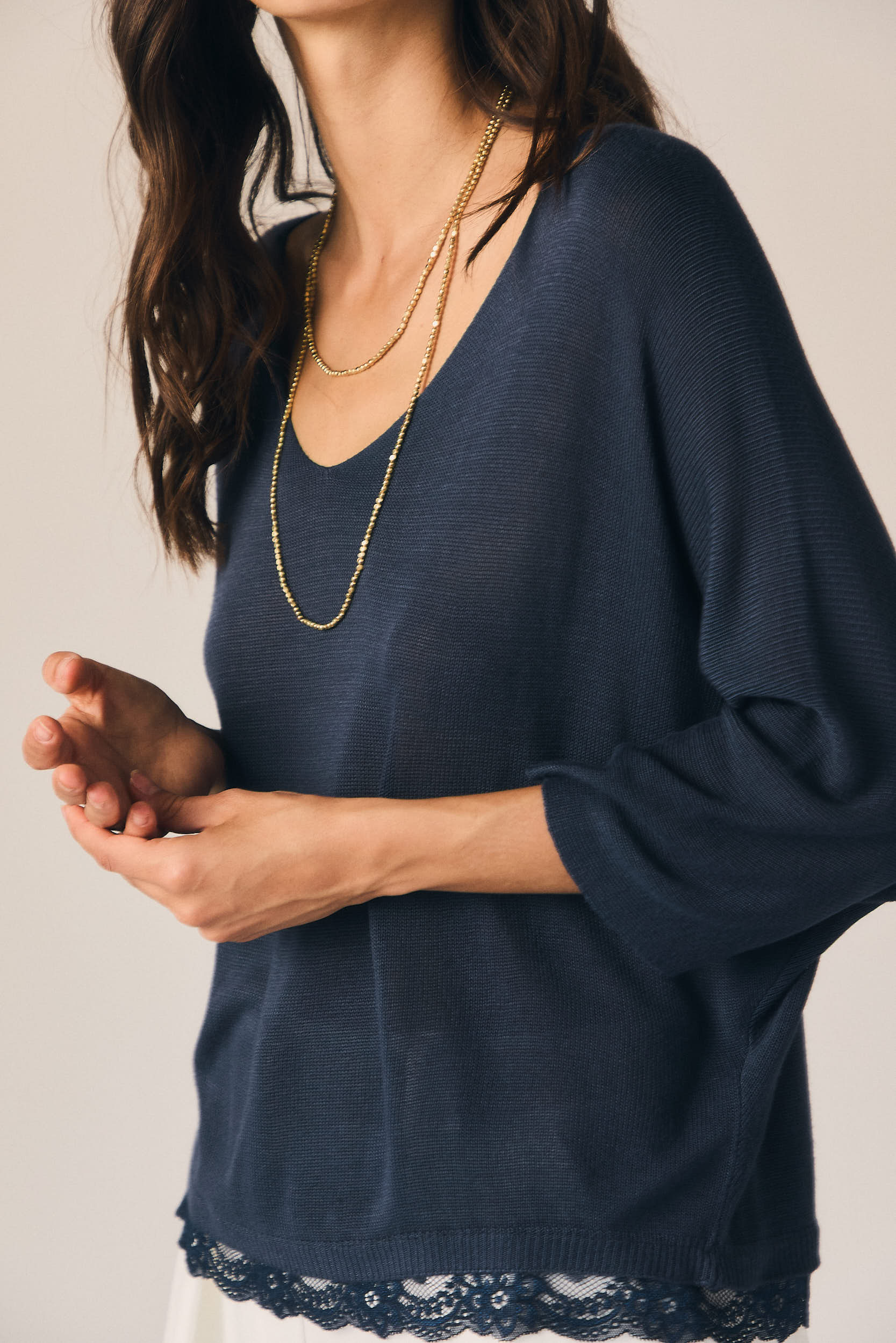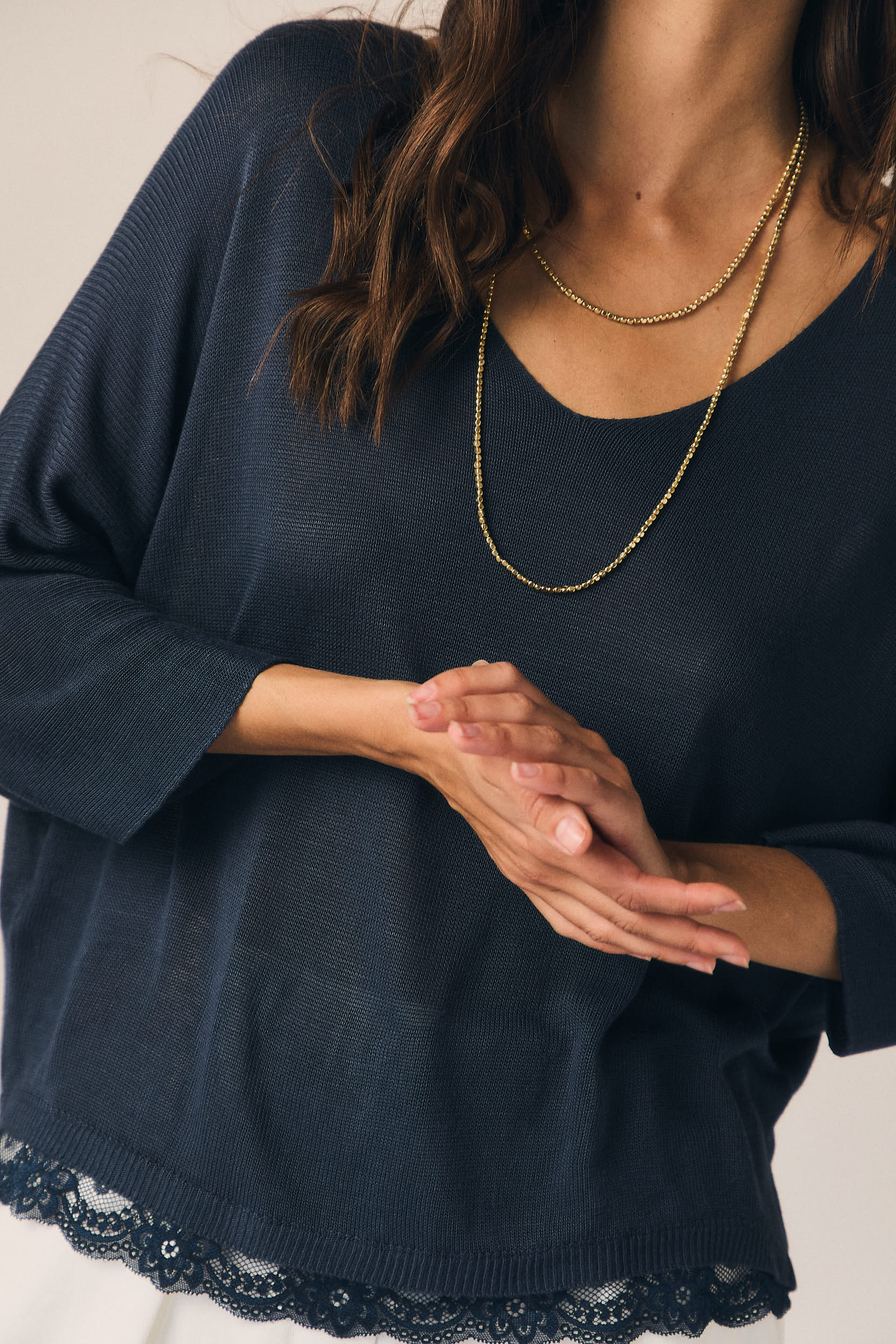 Top en tono azul marino de corte recto y caída fluida. Escote en pico y manga tres cuartos amplia, con detalle de puntilla en el bajo que aporta un acabado delicado y contraste sutil.