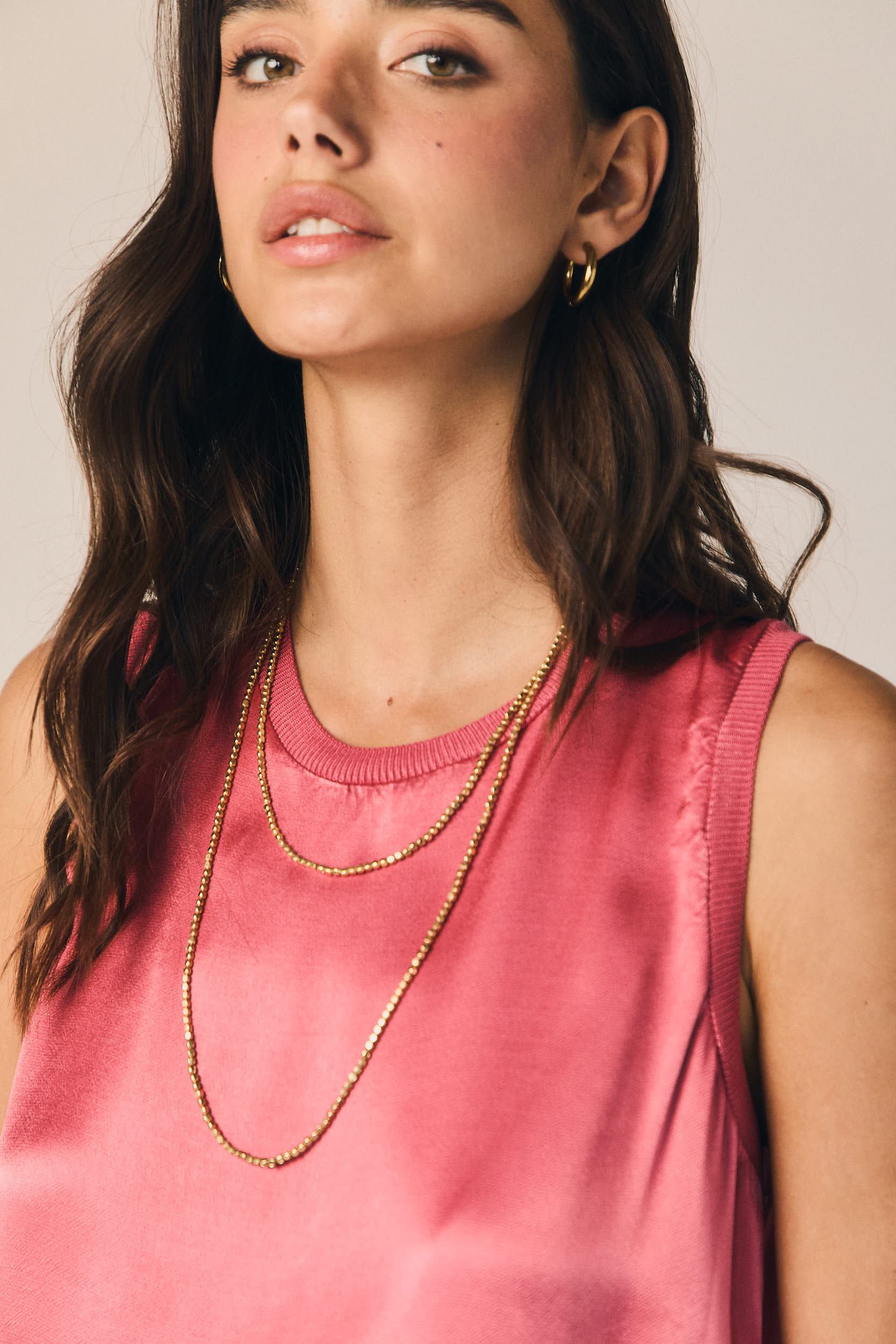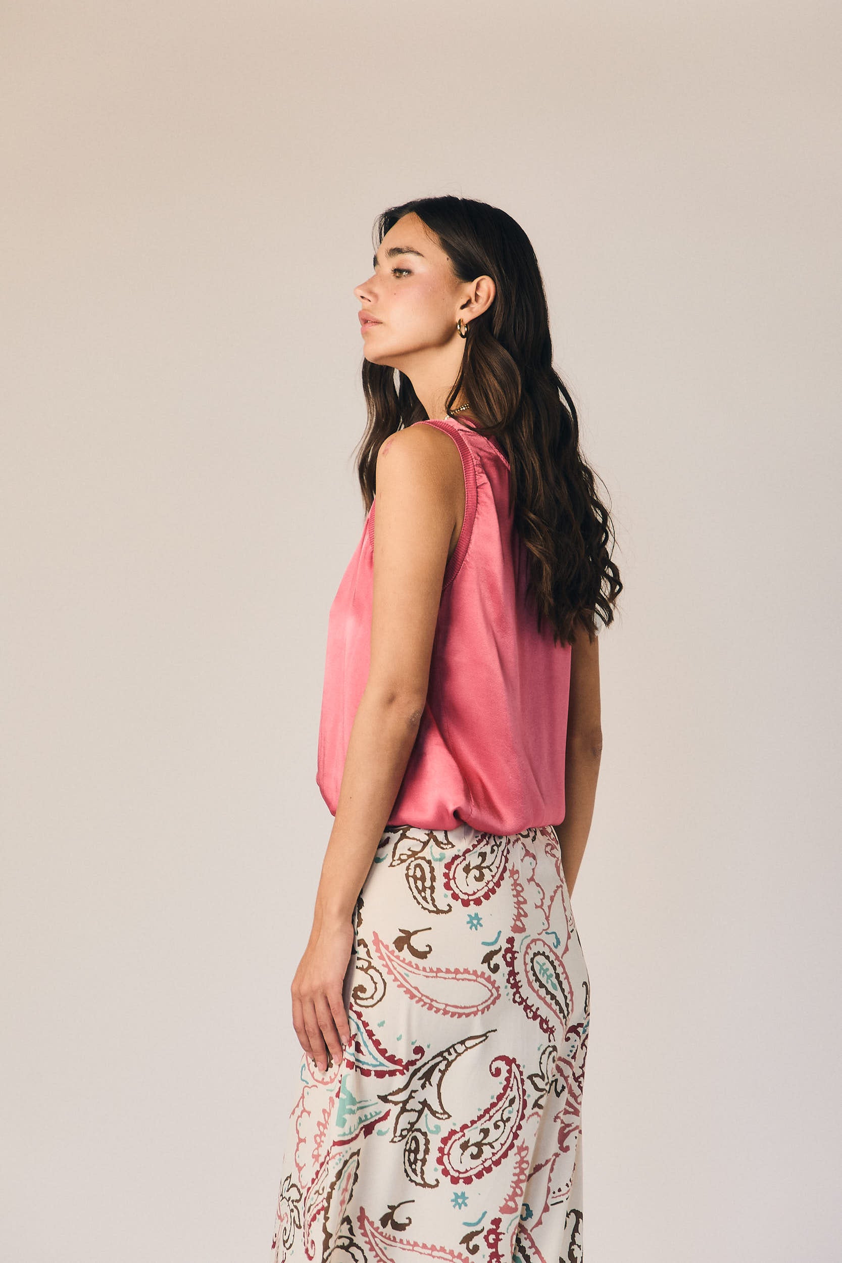 Top sin mangas en tono fresa con acabado satinado y caída fluida. Escote redondo con ribete marcado en cuello y sisas que aporta estructura y contraste.