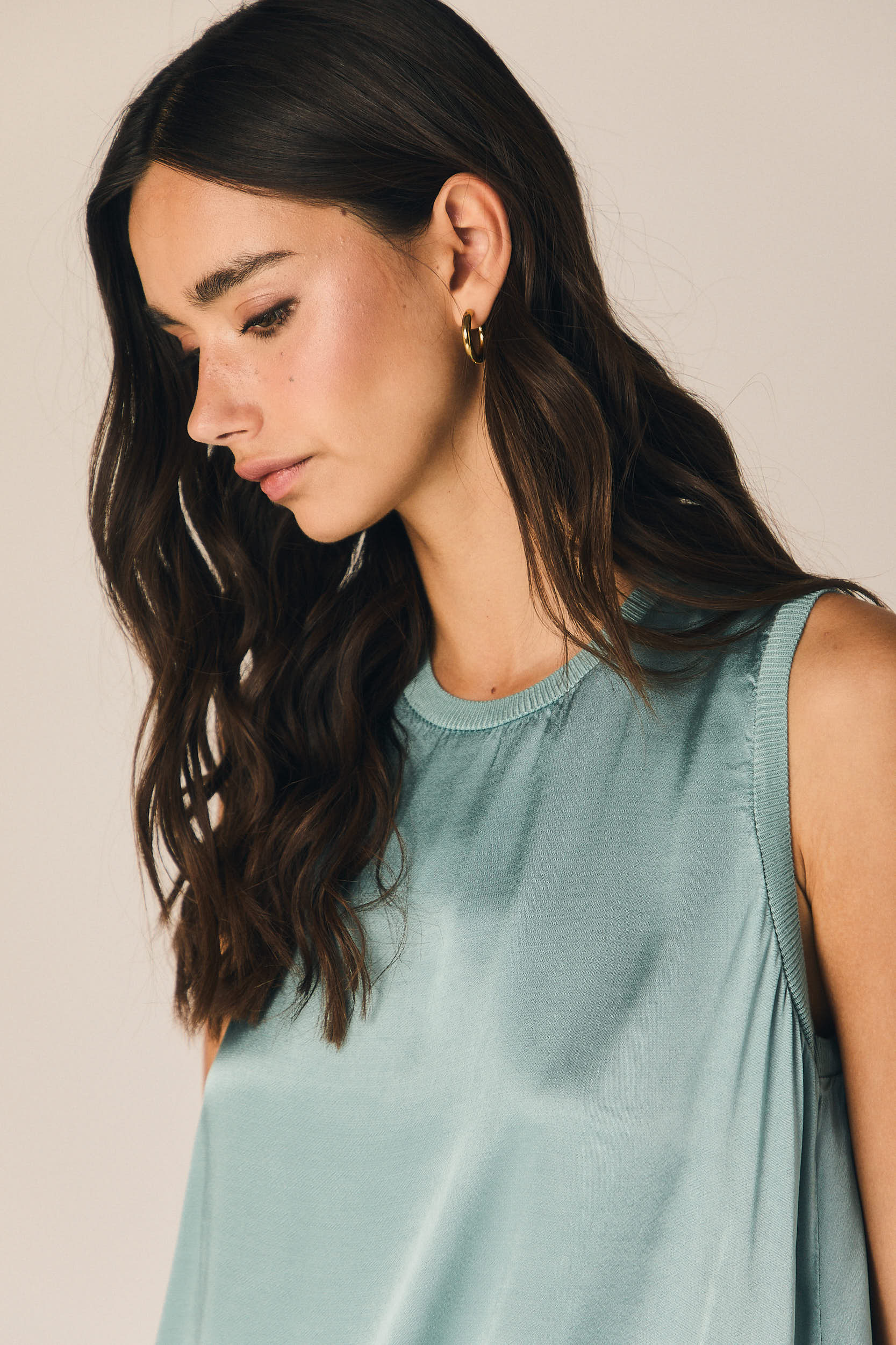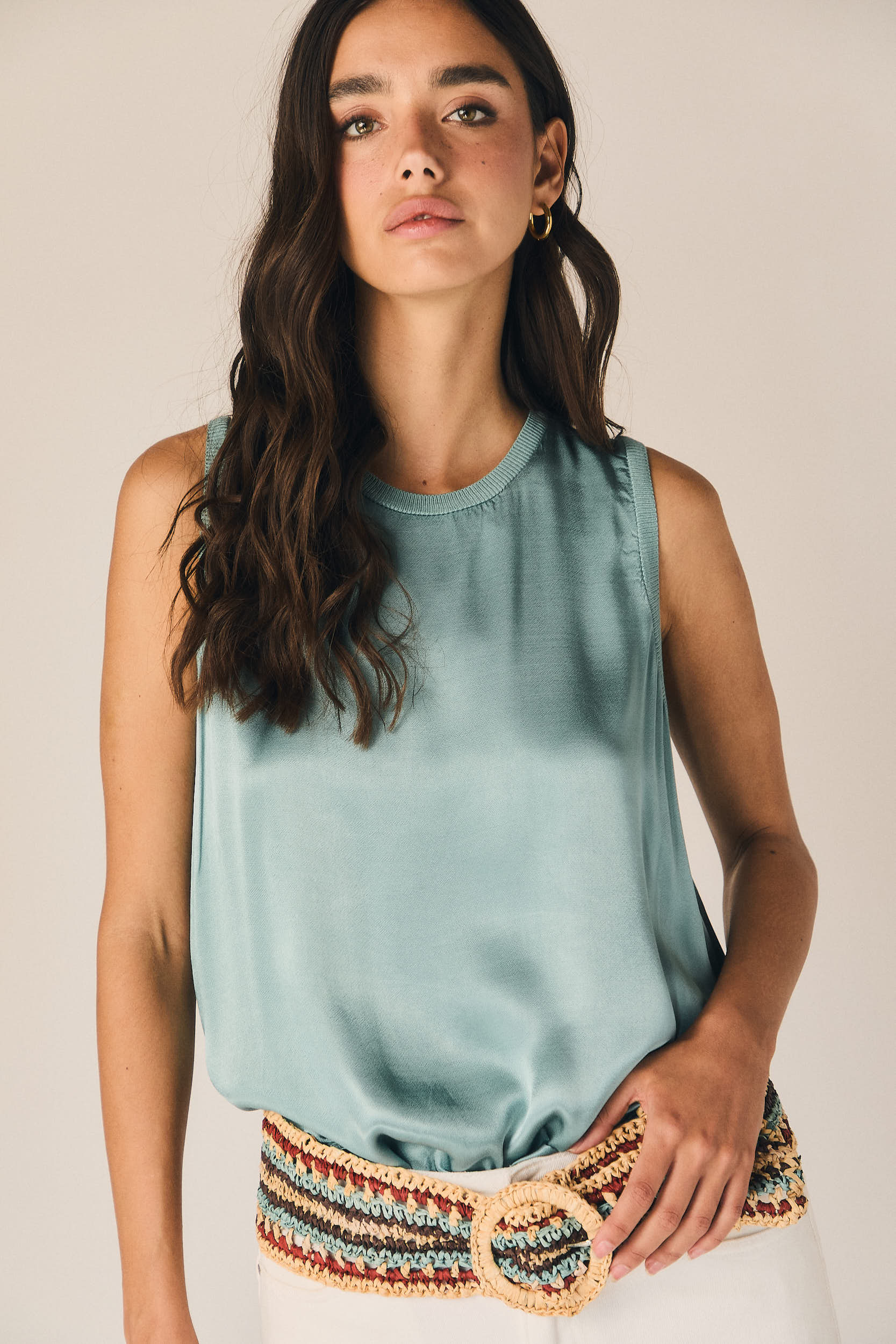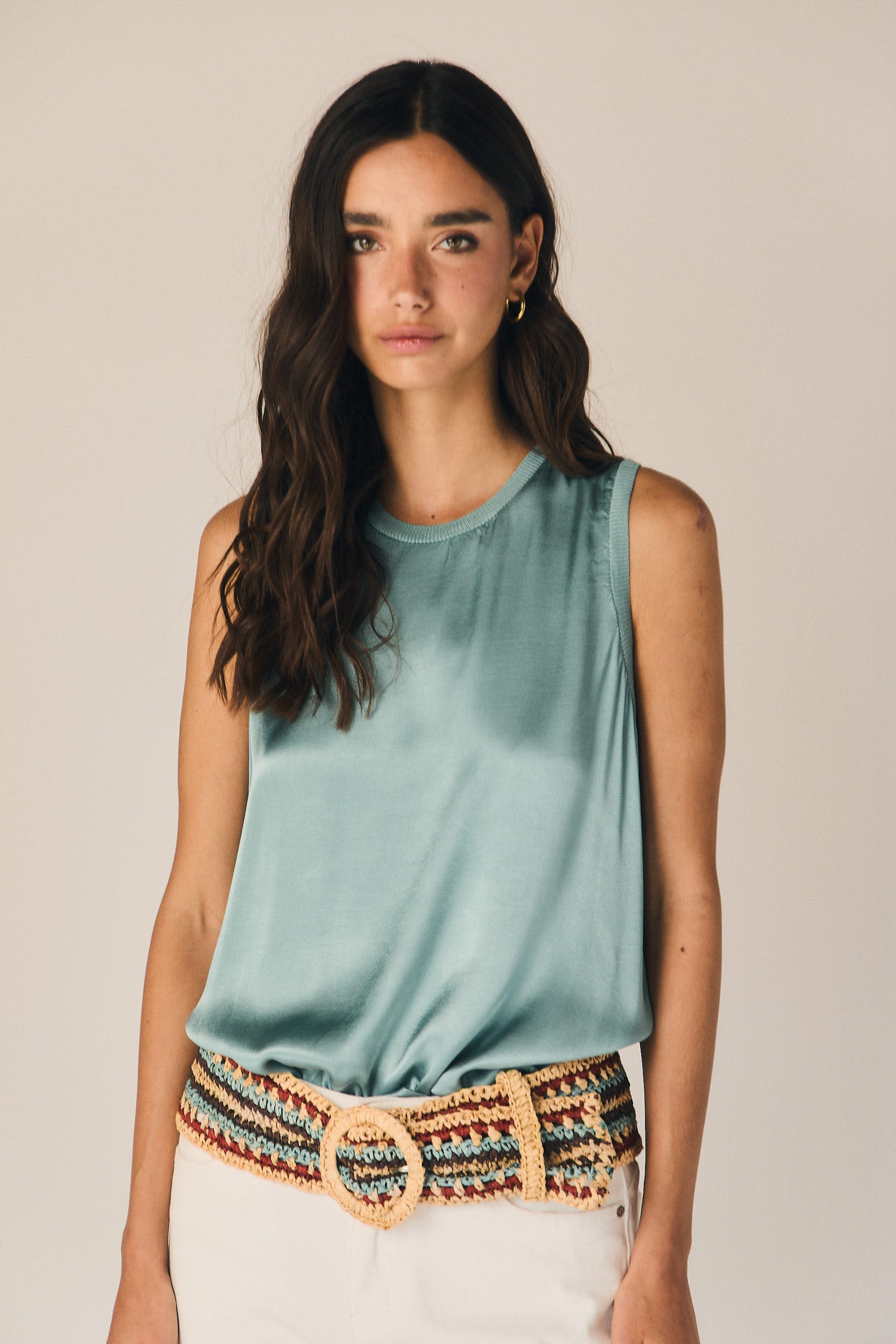 Top sin mangas en tono aguamarina con acabado satinado y caída fluida. Escote redondo con ribete que aporta estructura y remate limpio. Corte recto, ligero y con movimiento.