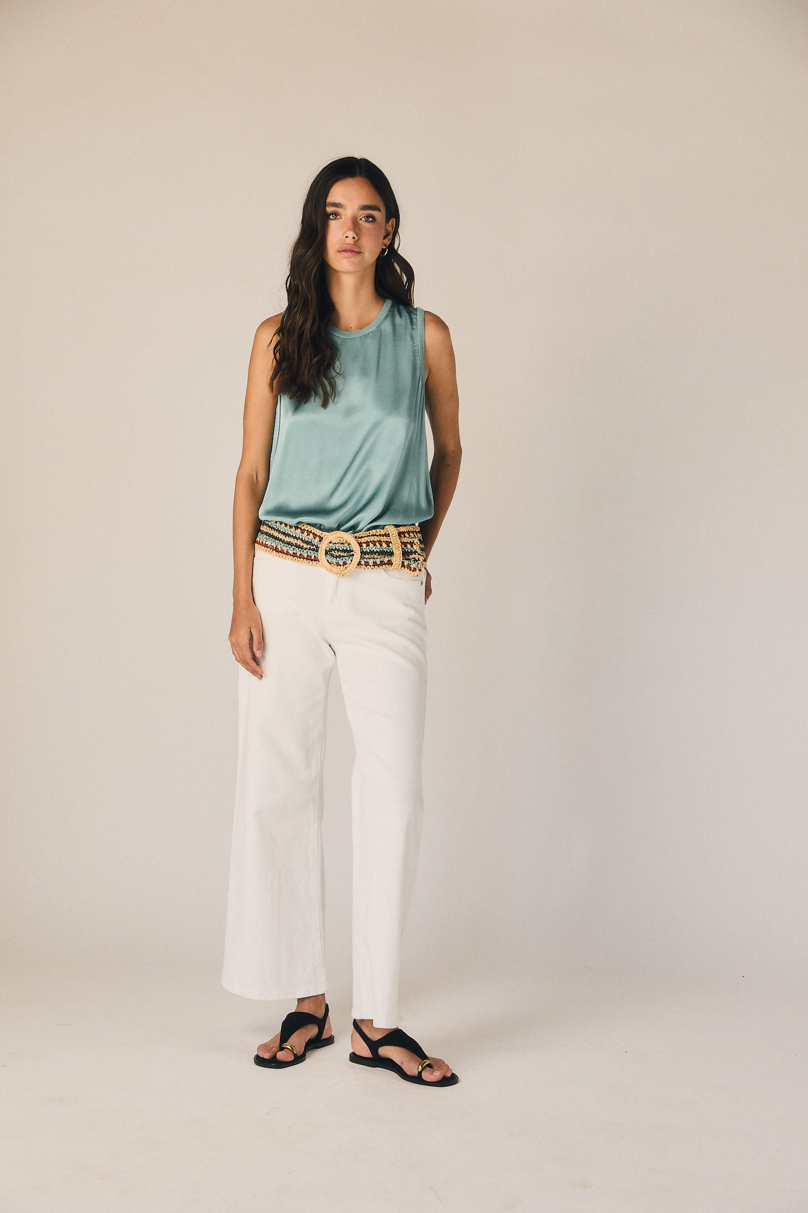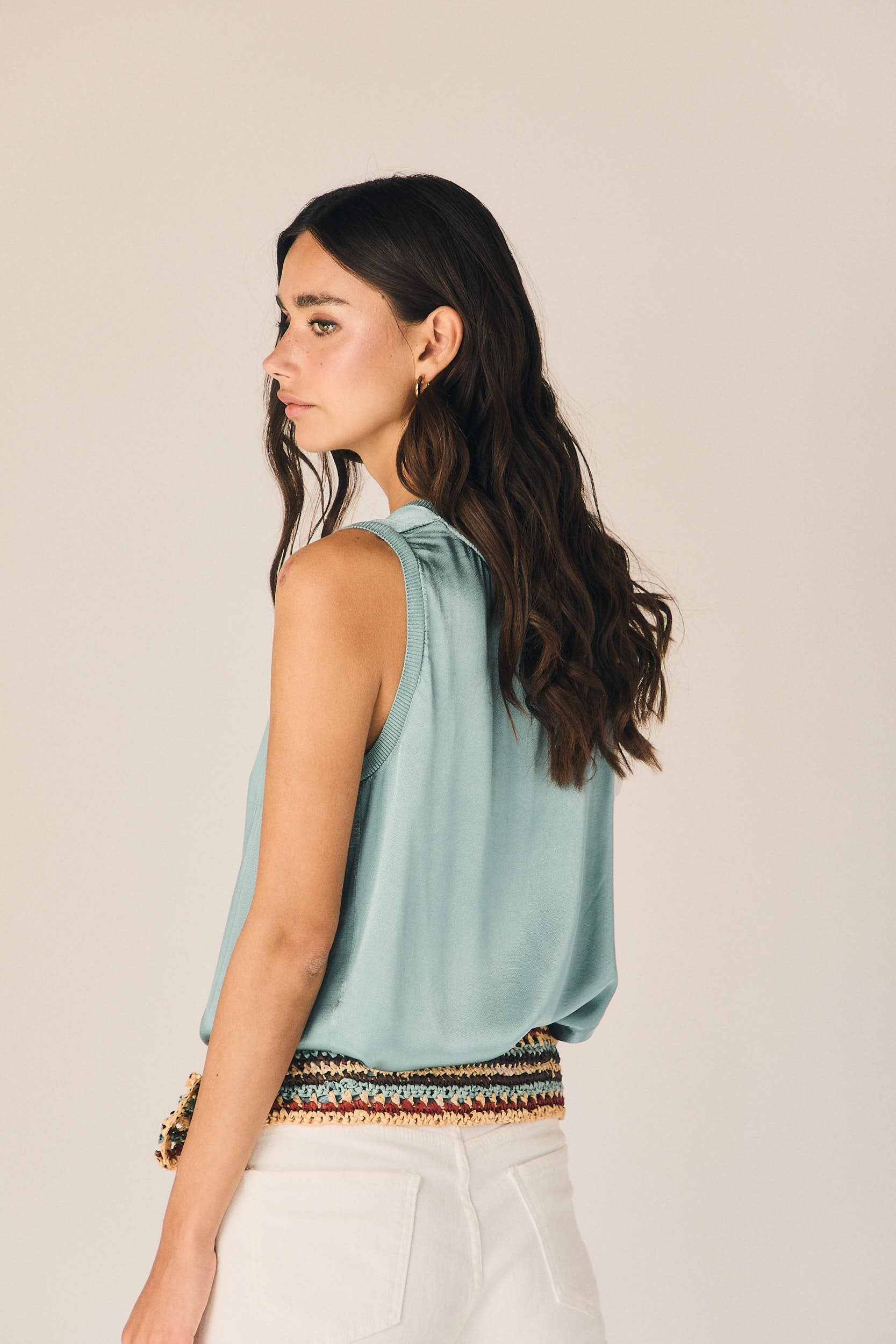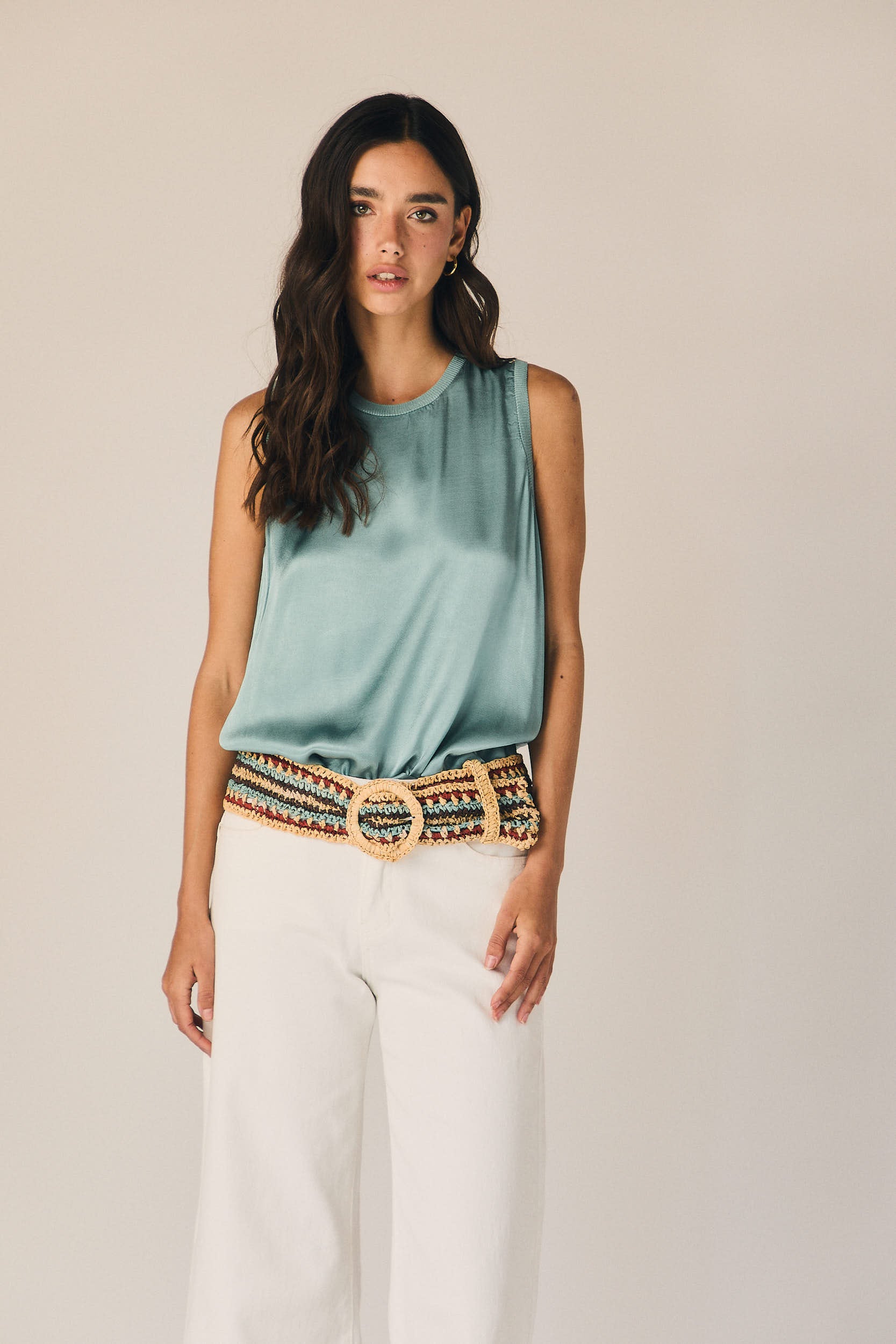 Top sin mangas en tono aguamarina con acabado satinado y caída fluida. Escote redondo con ribete que aporta estructura y remate limpio. Corte recto, ligero y con movimiento.