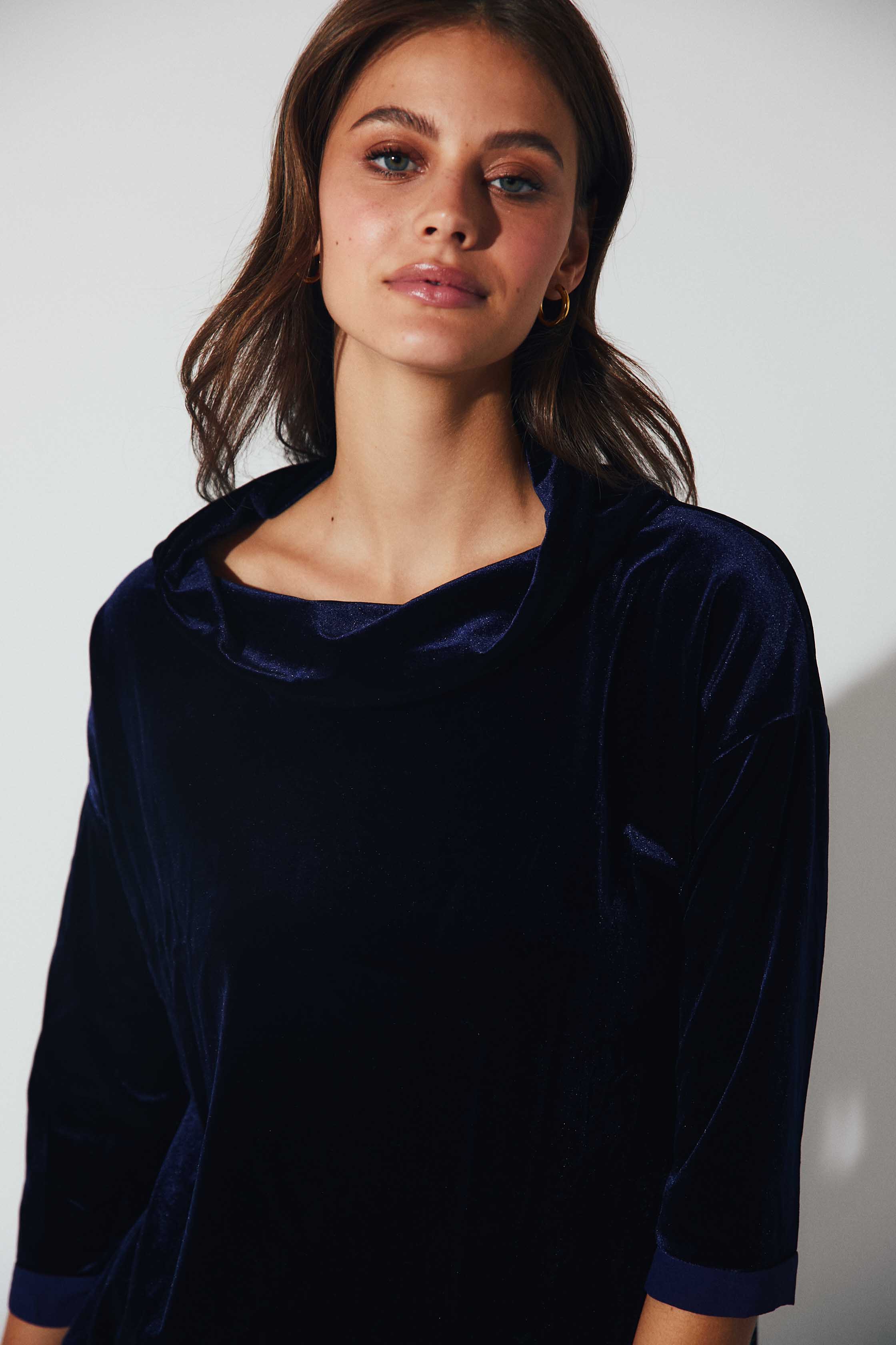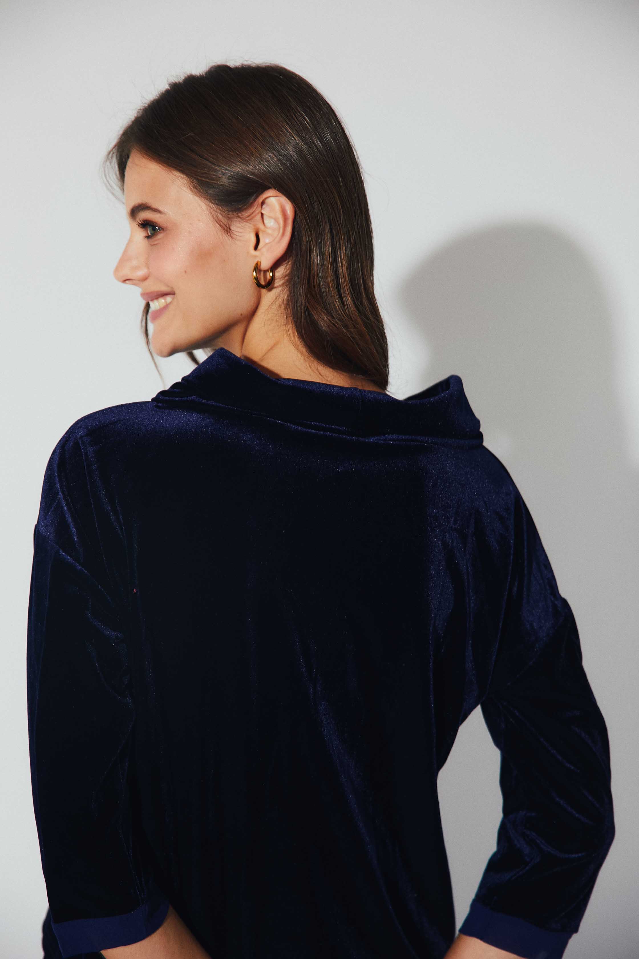 Top de terciopelo azul noche con textura suave y ligera. Presenta cuello barco con caída natural, manga tres cuartos y un corte relajado que aporta movimiento y comodidad. Su brillo sutil y su silueta sencilla lo convierten en una prenda versátil para looks tanto de día como de noche.