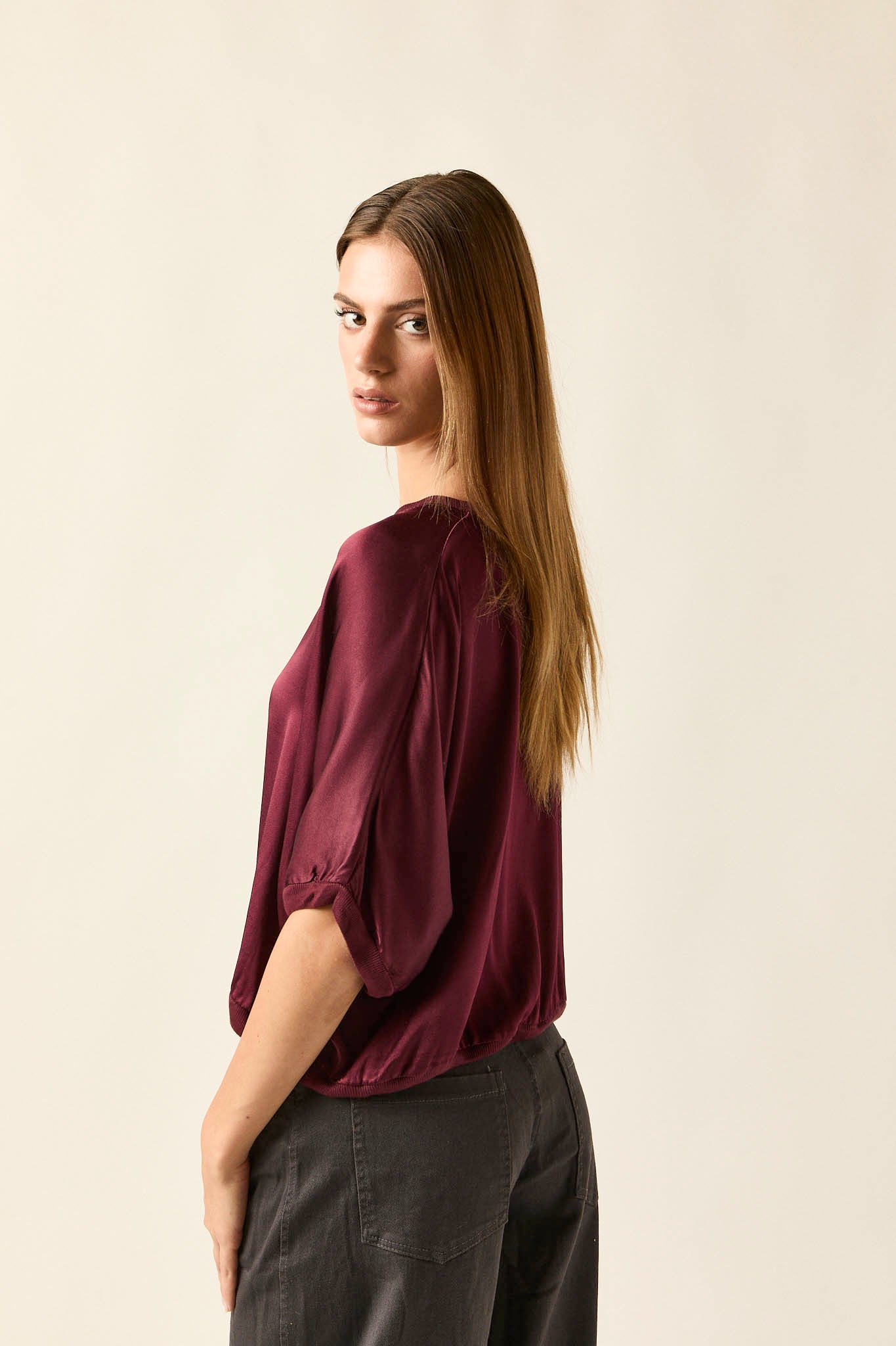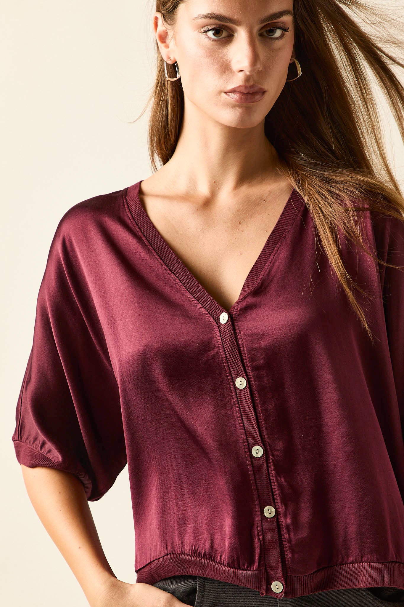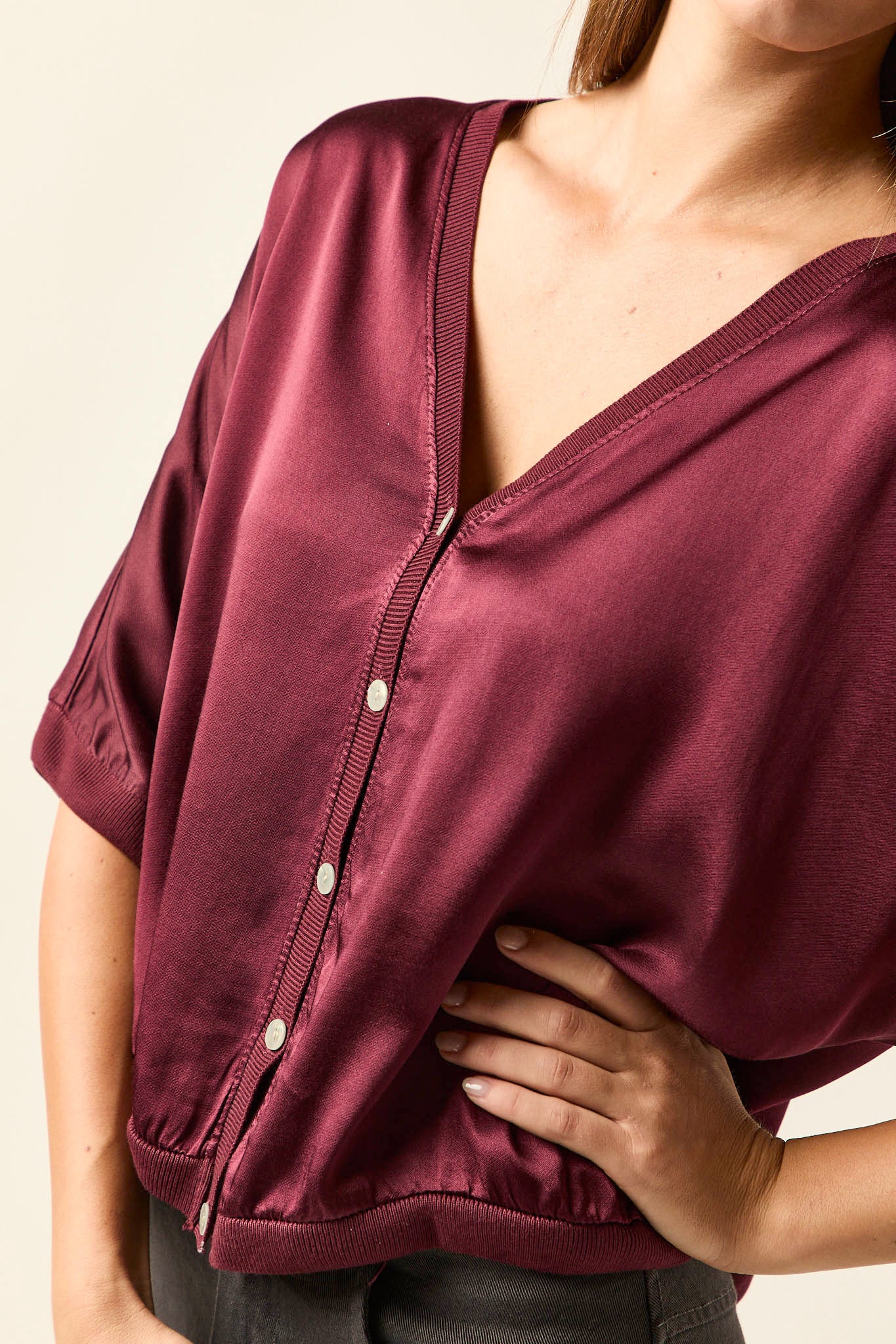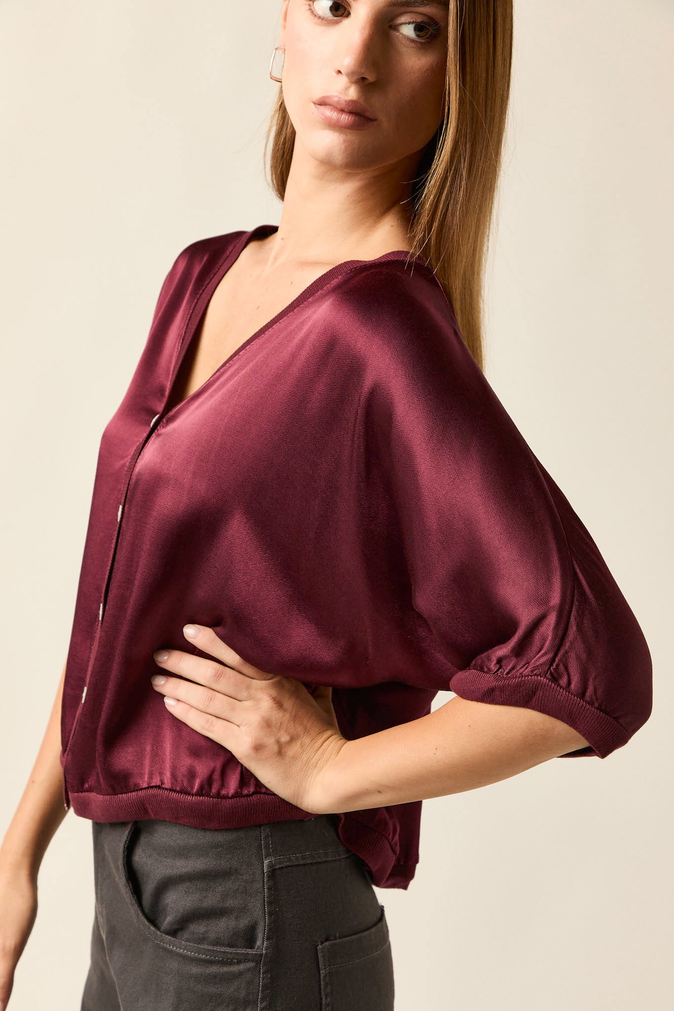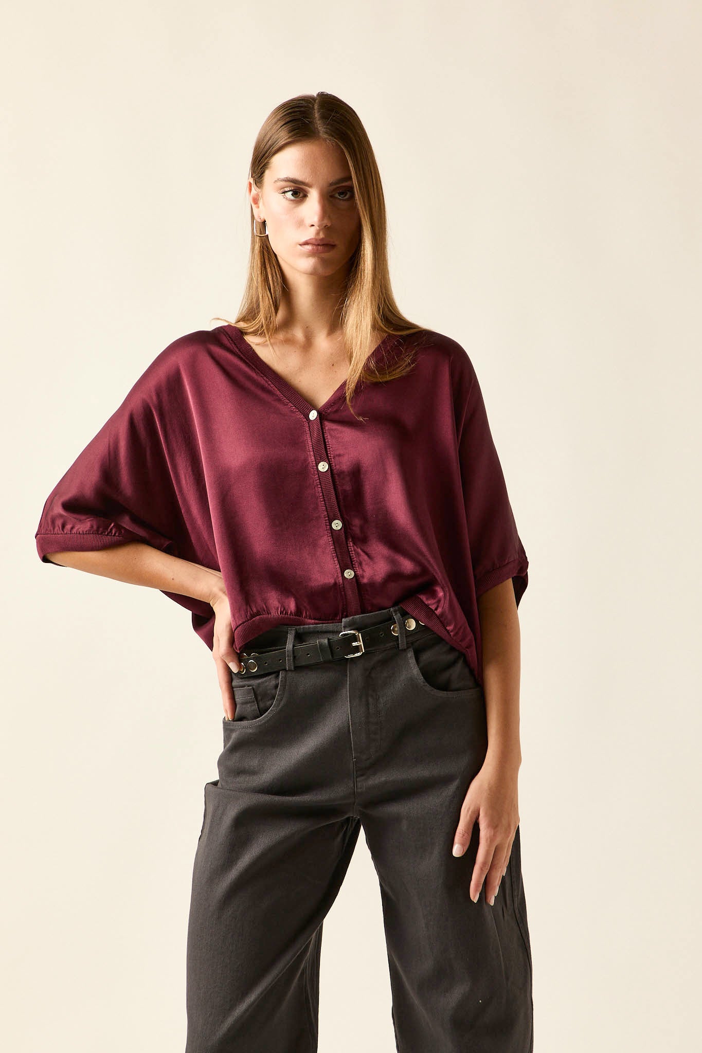 Top ligero de raso en tono burdeos. De corte recto y fluido, presenta escote pico, cierre frontal de botones y manga amplia que aporta comodidad al diseño.