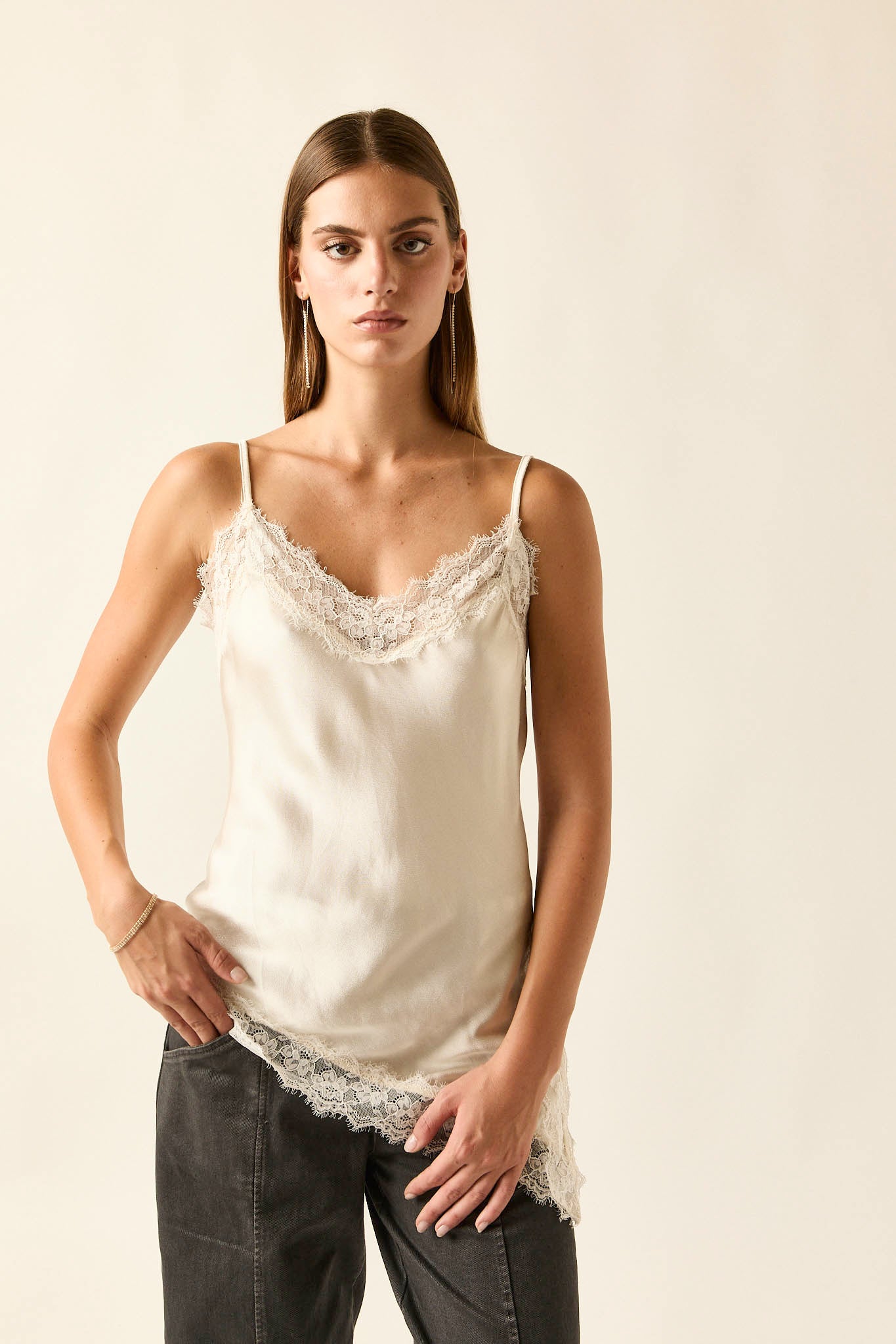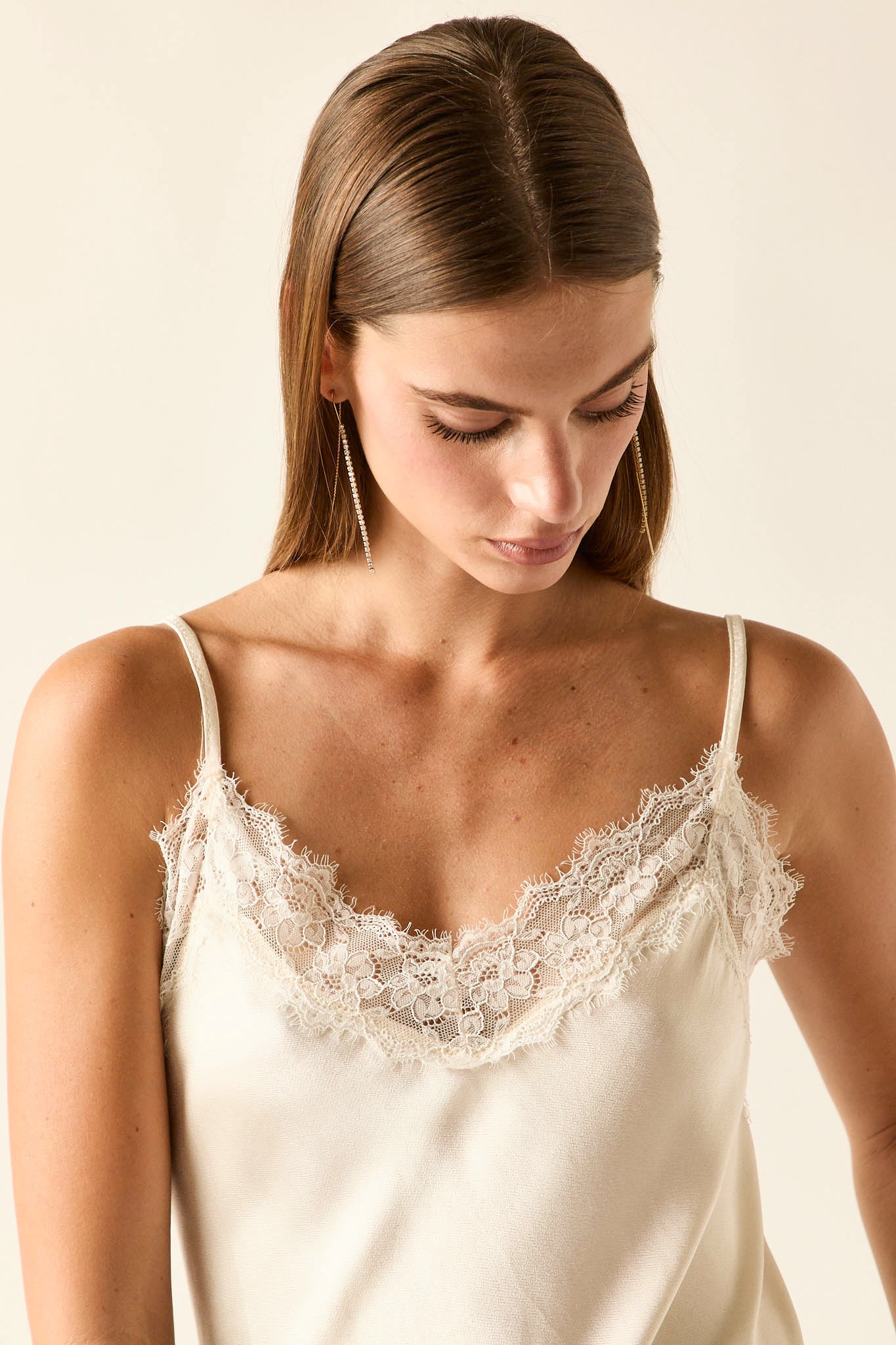 Top lencero en tono crudo con tirantes finos ajustables. Presenta un delicado encaje en el escote en pico y en el bajo, aportando un acabado femenino y sofisticado. Su caída fluida y ligera lo convierte en una prenda versátil para llevar tanto en looks de día como en estilismos de noche.