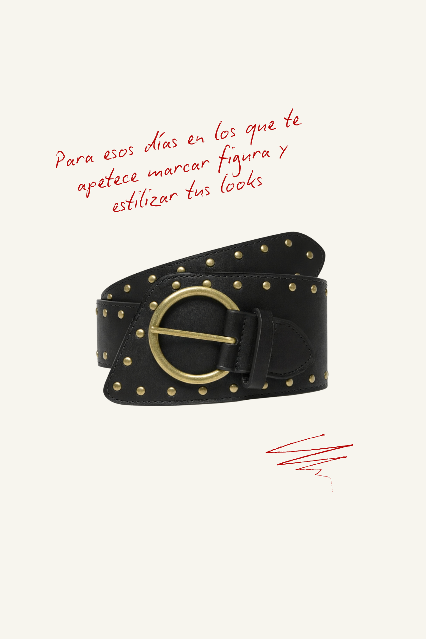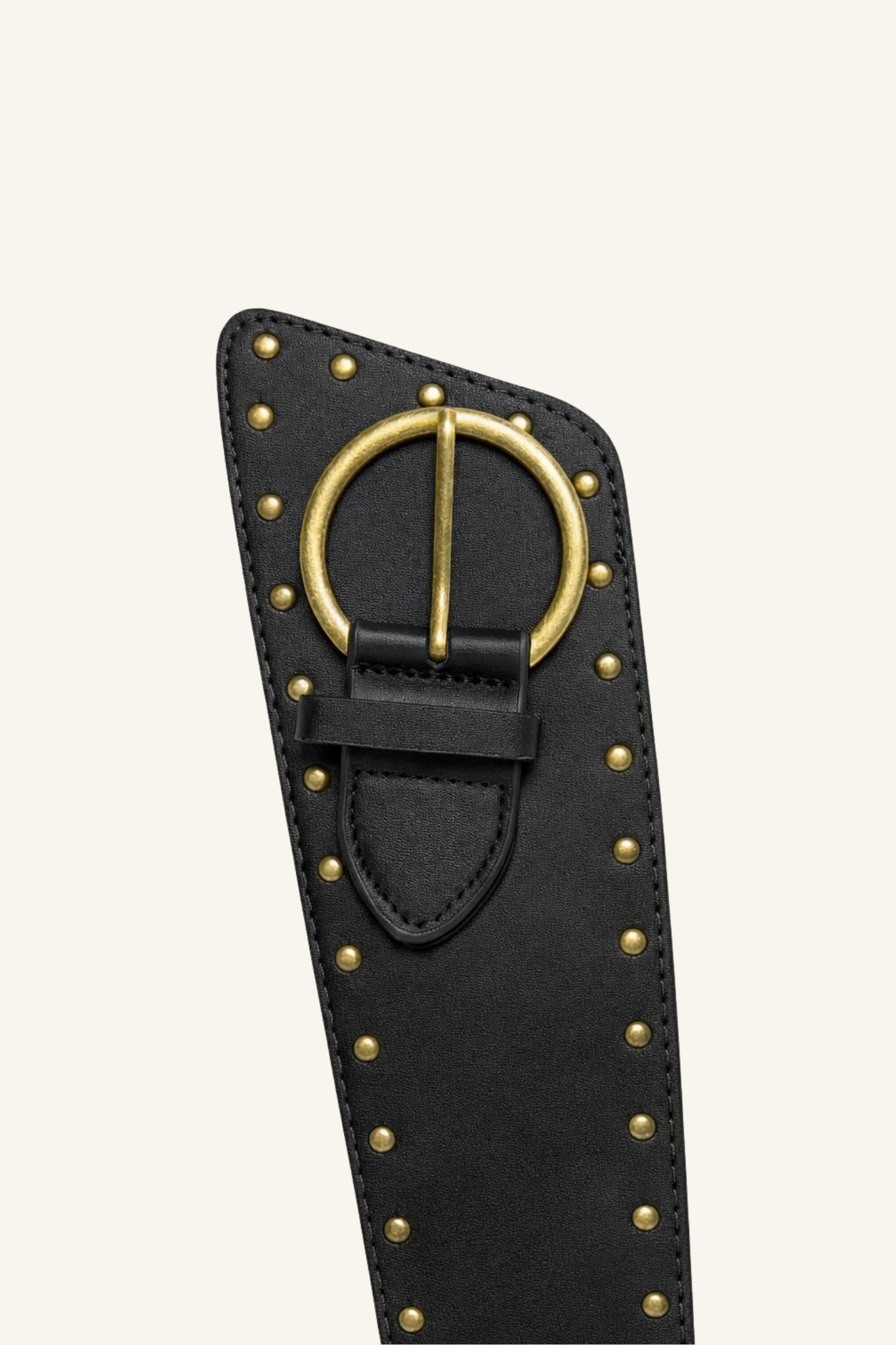 Cinturón tipo fajín en color negro, de ancho medio y estructura envolvente. Diseño con tachas metálicas distribuidas de forma regular y hebilla redonda en tono dorado envejecido. Ajuste clásico con pasador y cierre frontal, pensado para marcar la cintura y aportar carácter al look.