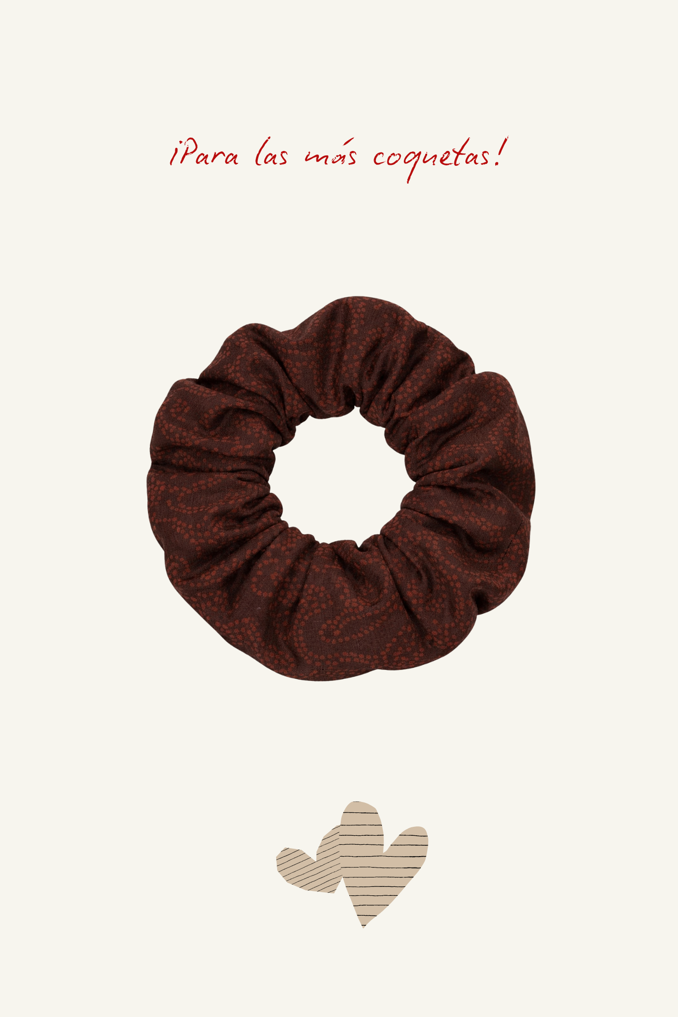 Coletero de tela con estampado paisley en tonos marrón y granate. Diseño fruncido, suave y con buena sujeción, pensado para recoger el cabello sin marcar ni tirar. Un accesorio pequeño que suma coherencia al look y conecta con las prendas de la misma línea de estampado.