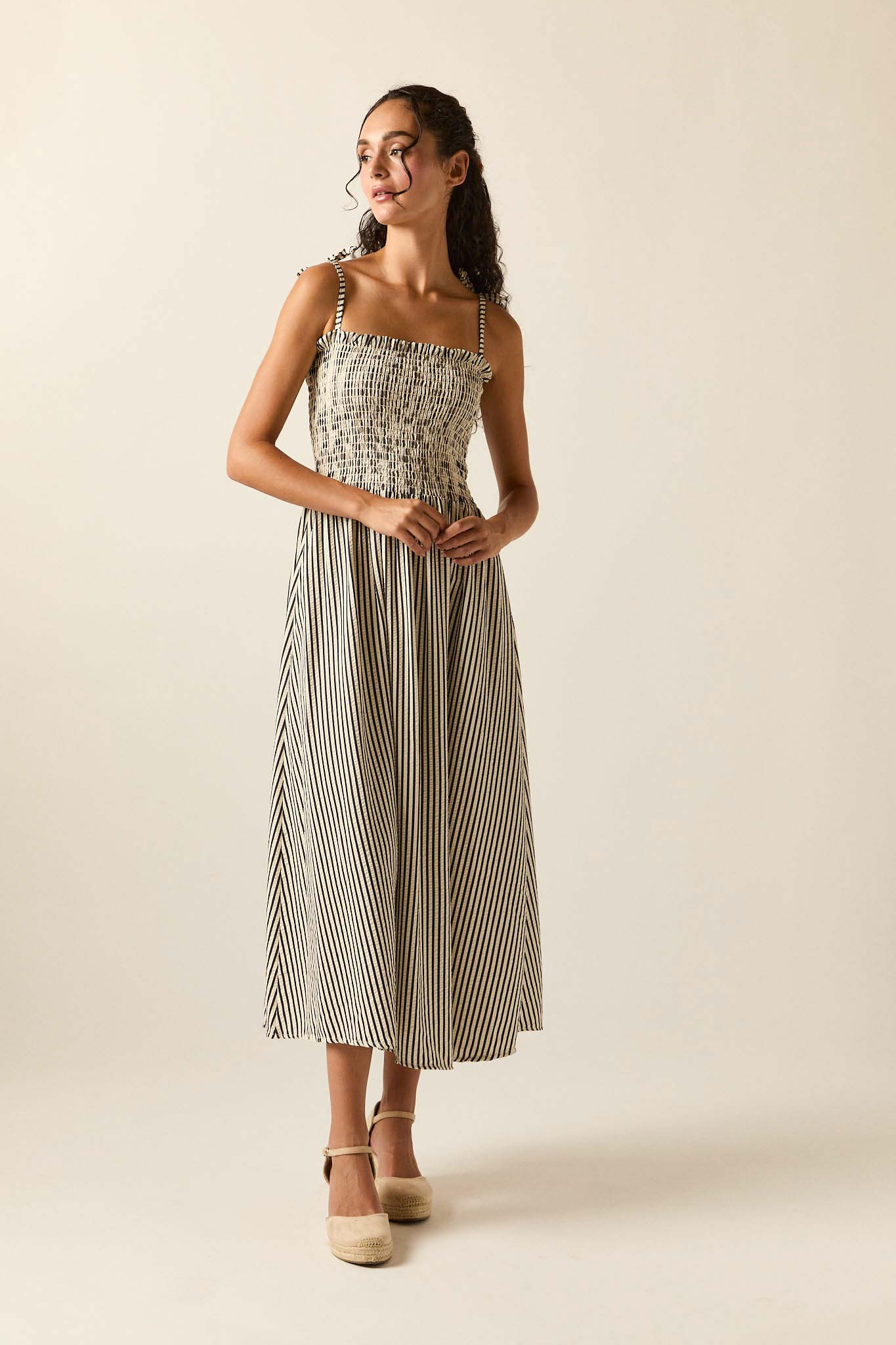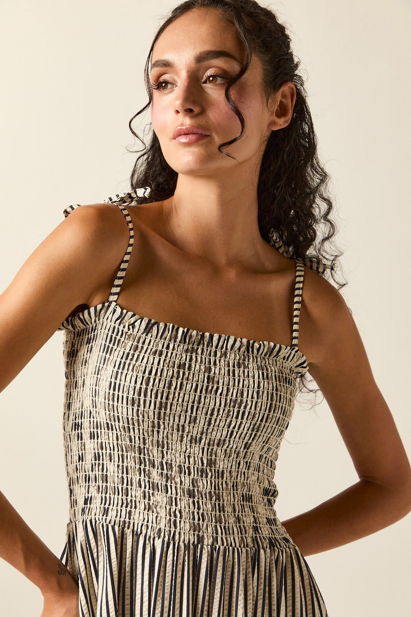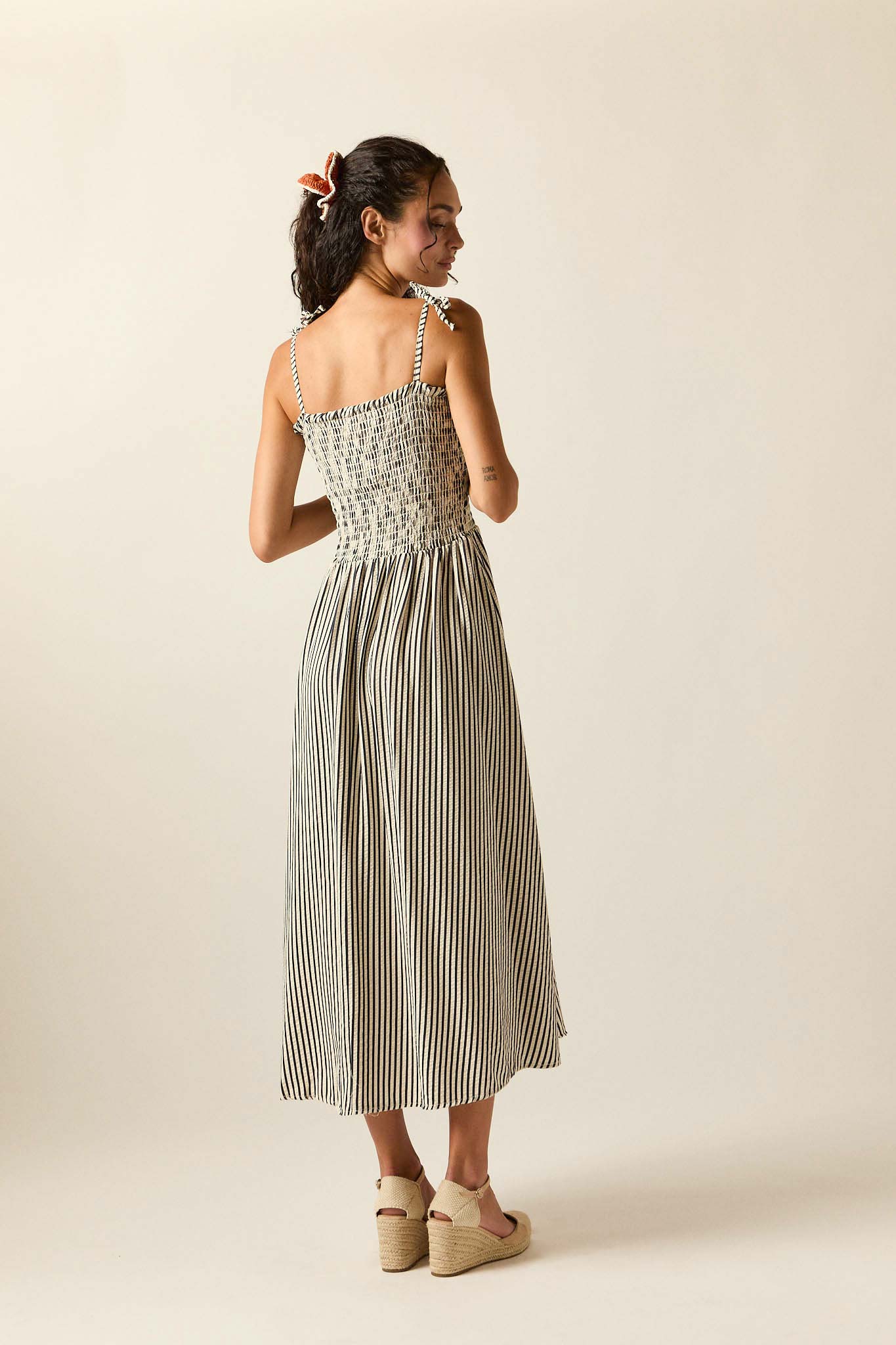 Vestido midi de tirantes finos anudados en los hombros. Presenta cuerpo fruncido tipo nido de abeja y falda amplia con caída fluida. El estampado de rayas finas en crudo y azul marino combina con la textura ligeramente arrugada del tejido seersucker, aportando un aire fresco y veraniego.