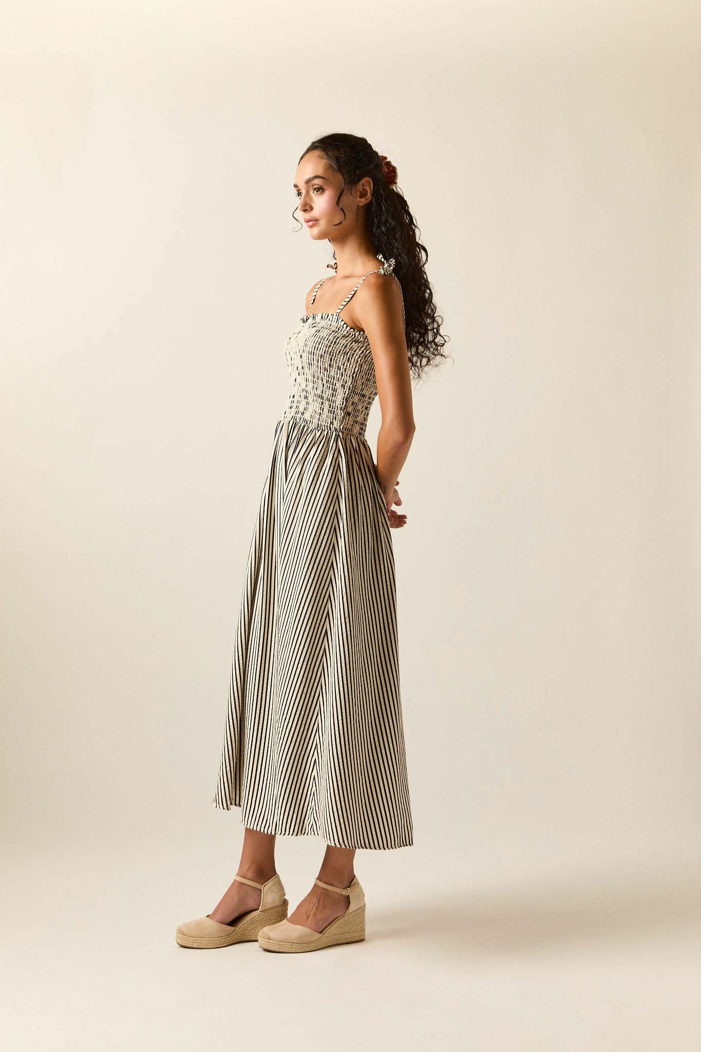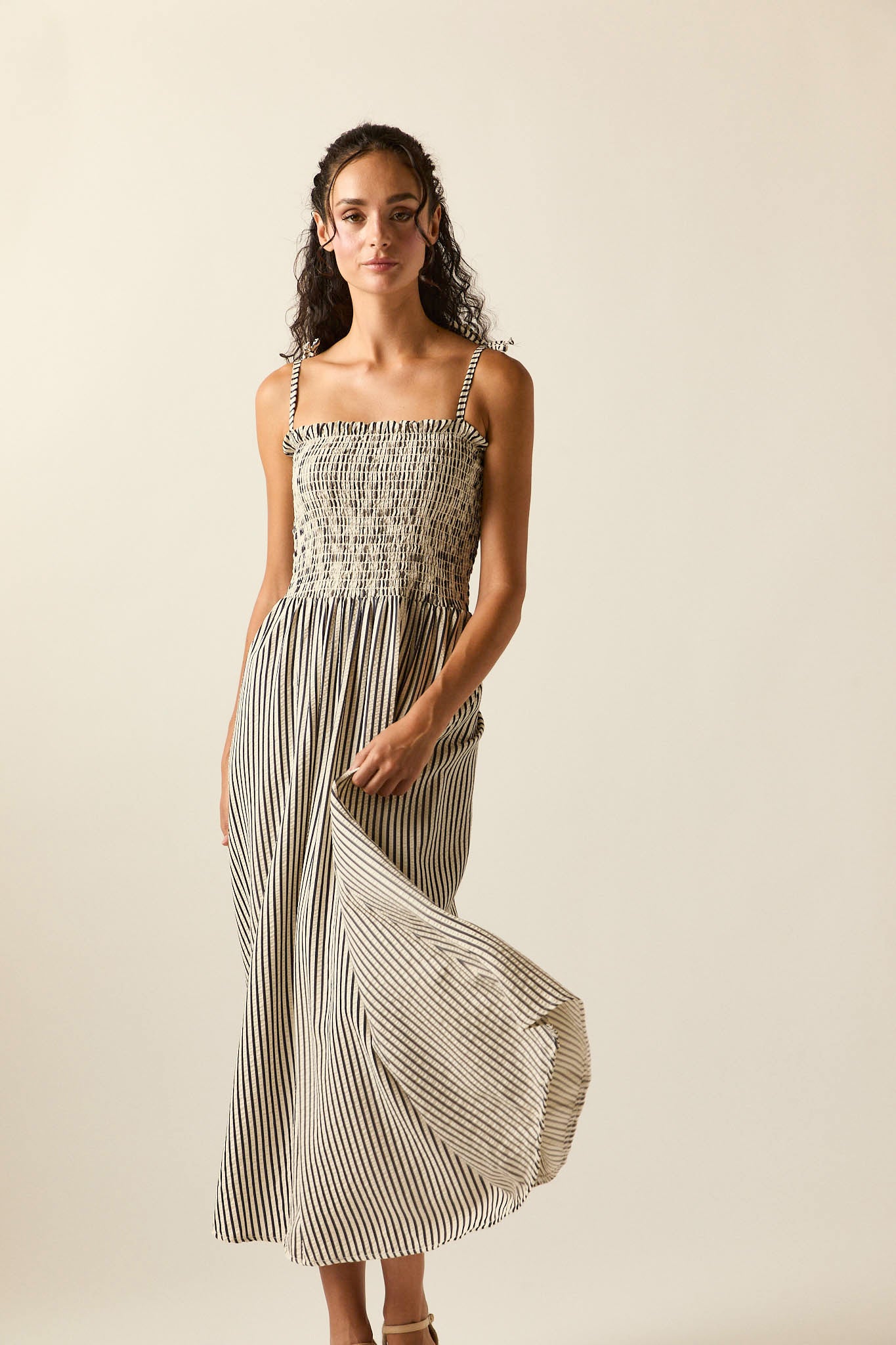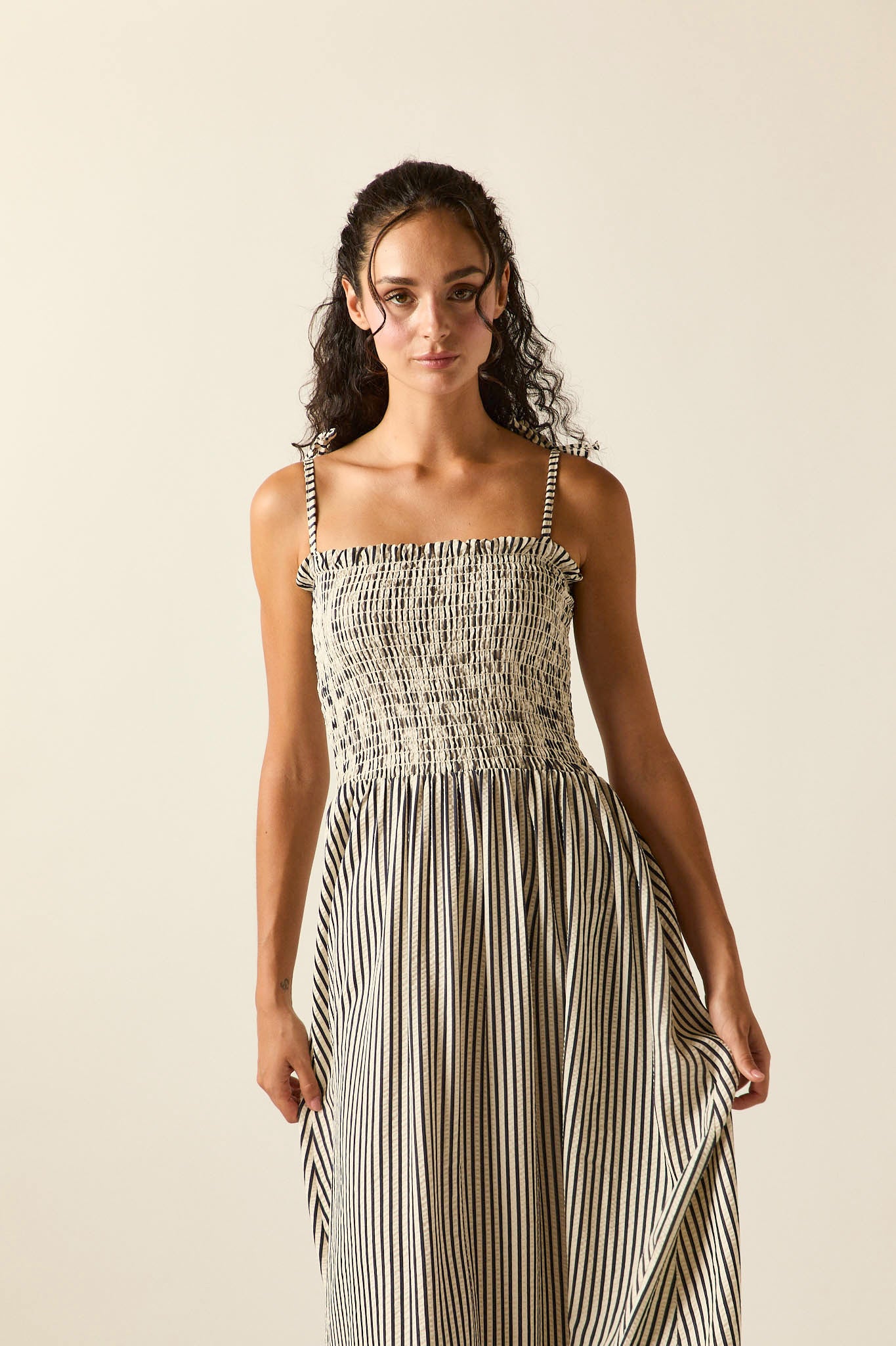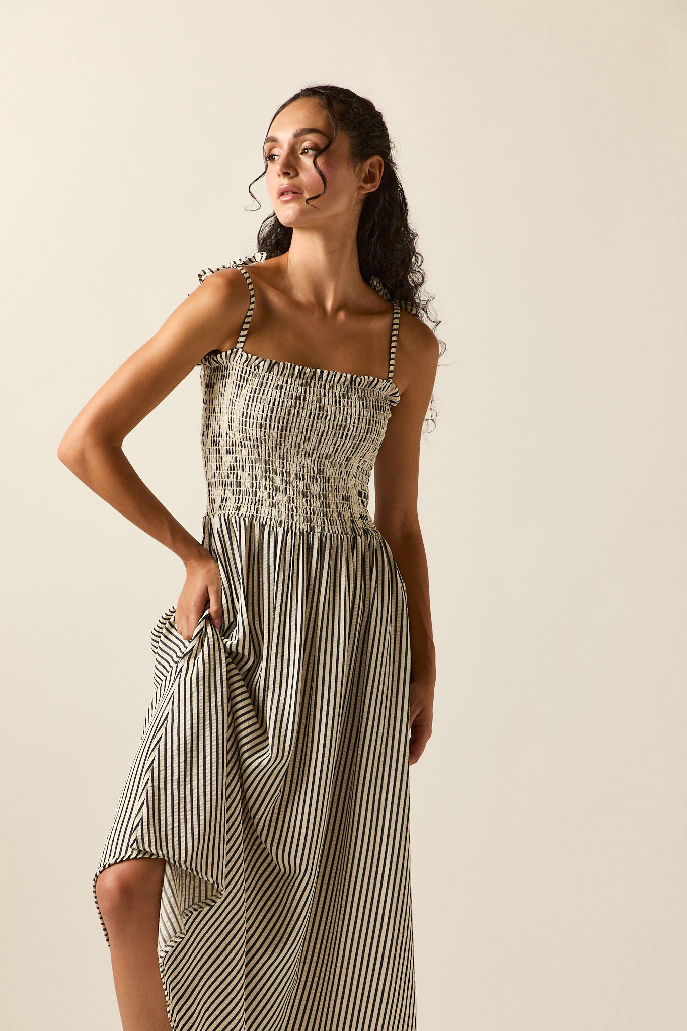 Vestido midi de tirantes finos anudados en los hombros. Presenta cuerpo fruncido tipo nido de abeja y falda amplia con caída fluida. El estampado de rayas finas en crudo y azul marino combina con la textura ligeramente arrugada del tejido seersucker, aportando un aire fresco y veraniego.