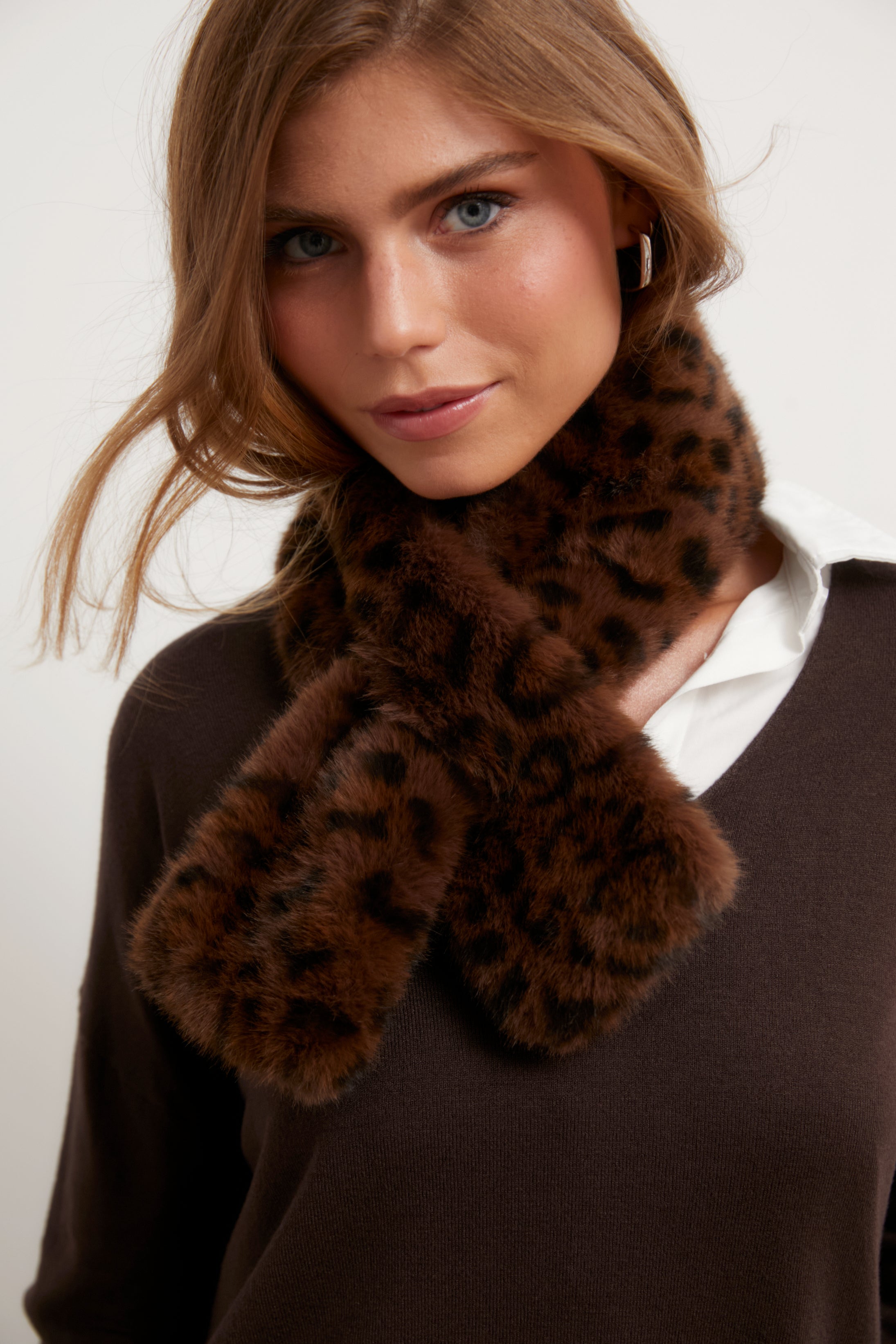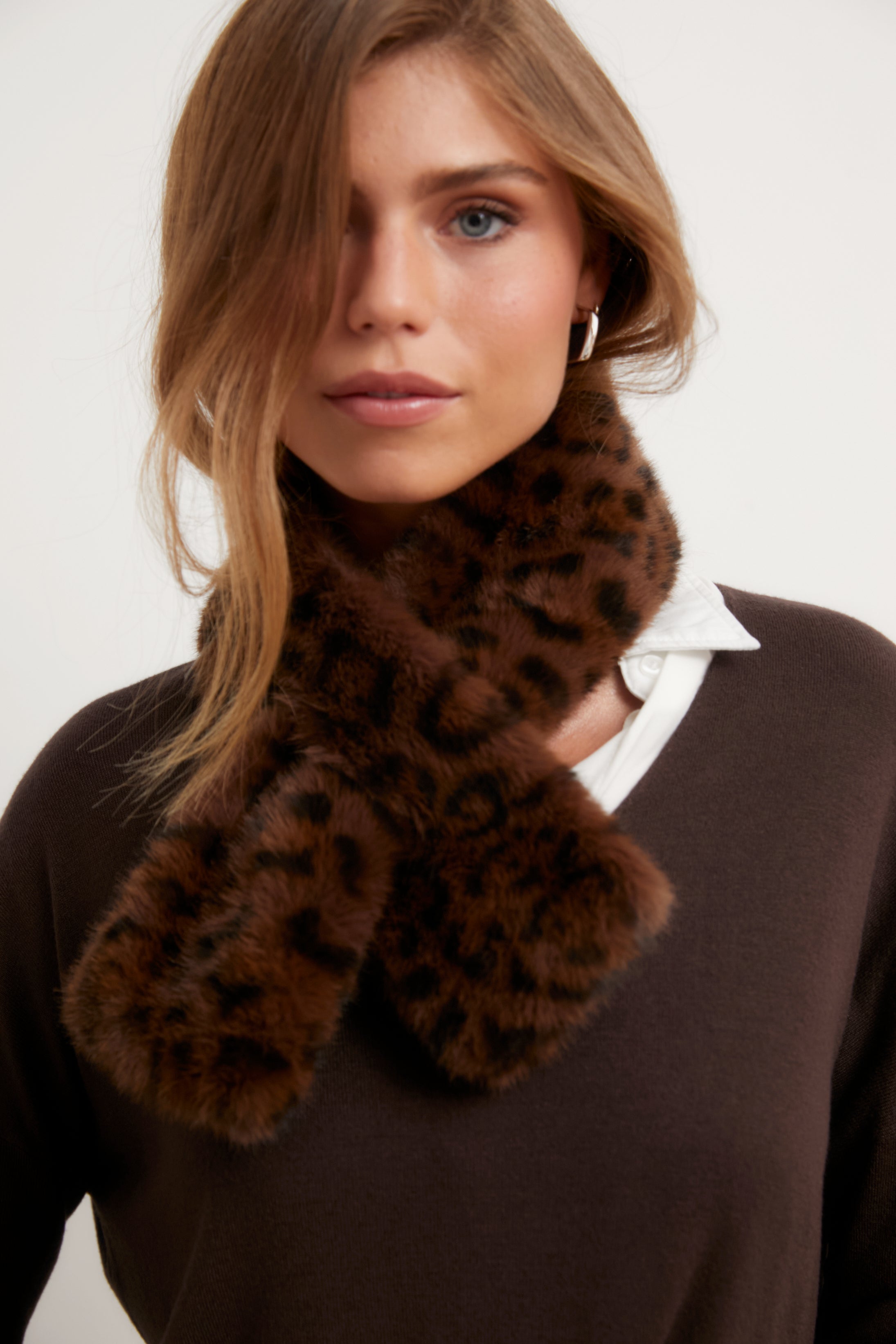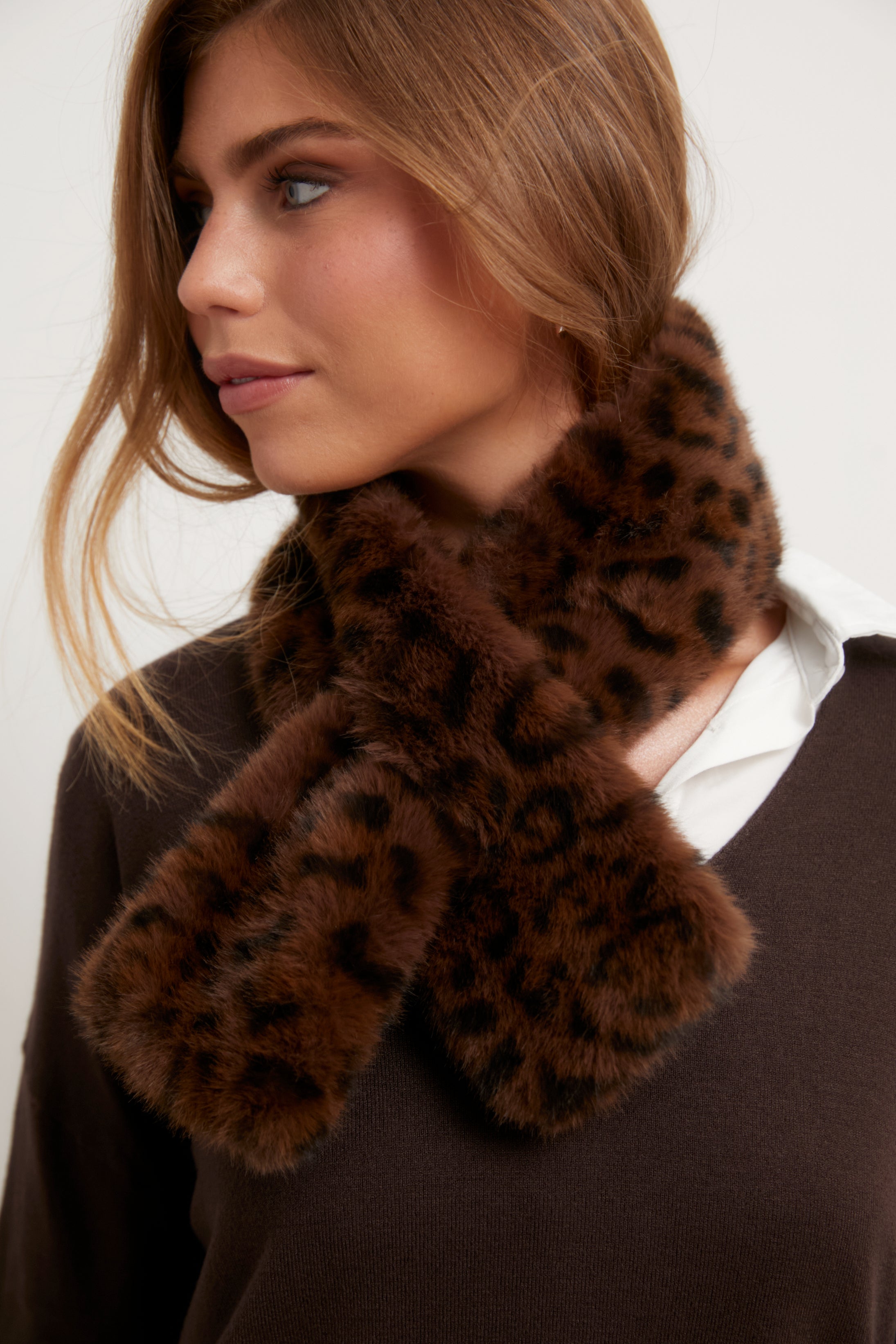Cuello corto de pelo sintético con estampado animal print en tonos marrones. Su textura suave y su diseño cruzado permiten ajustarlo fácilmente al cuello, aportando calidez y un toque de carácter a los looks de invierno.