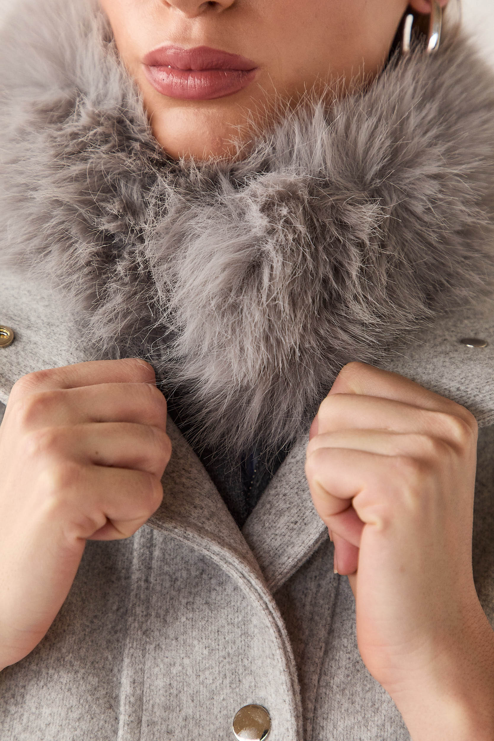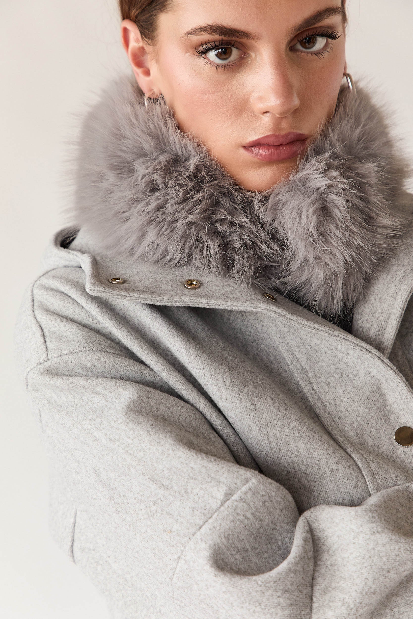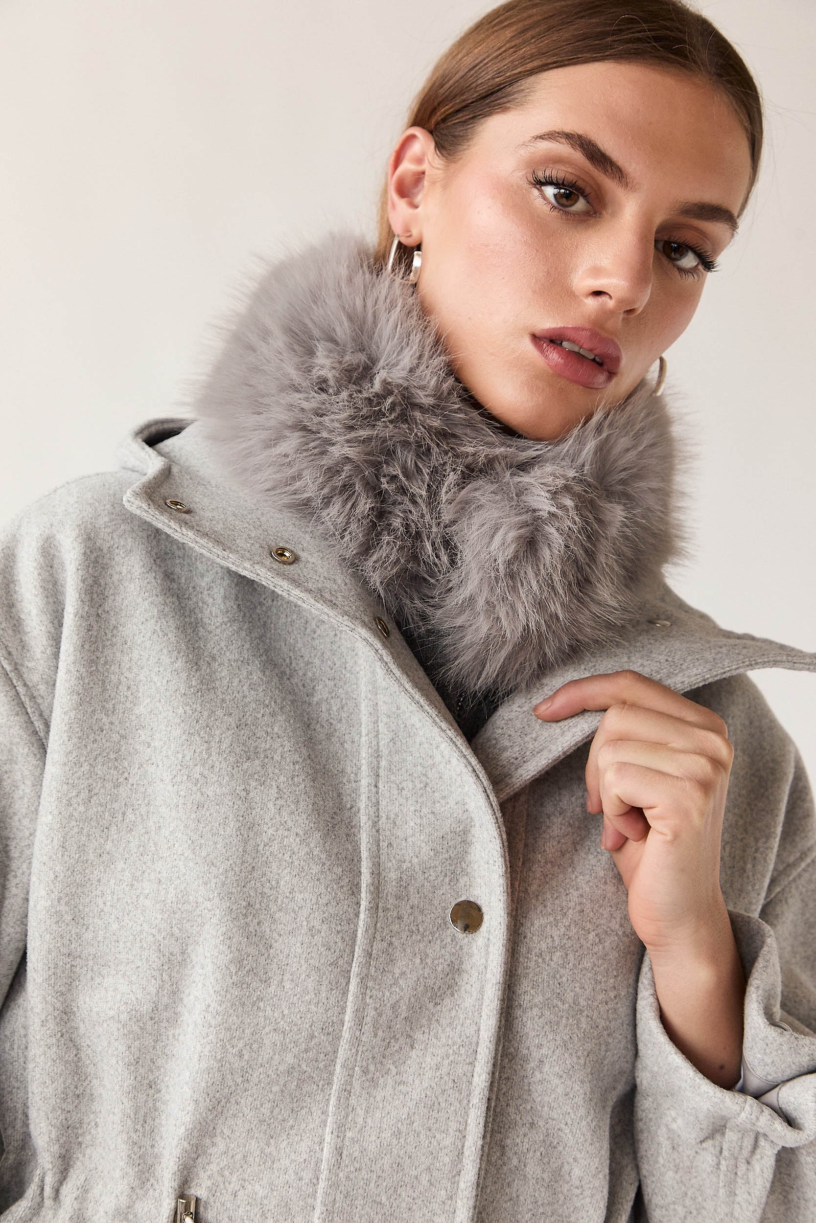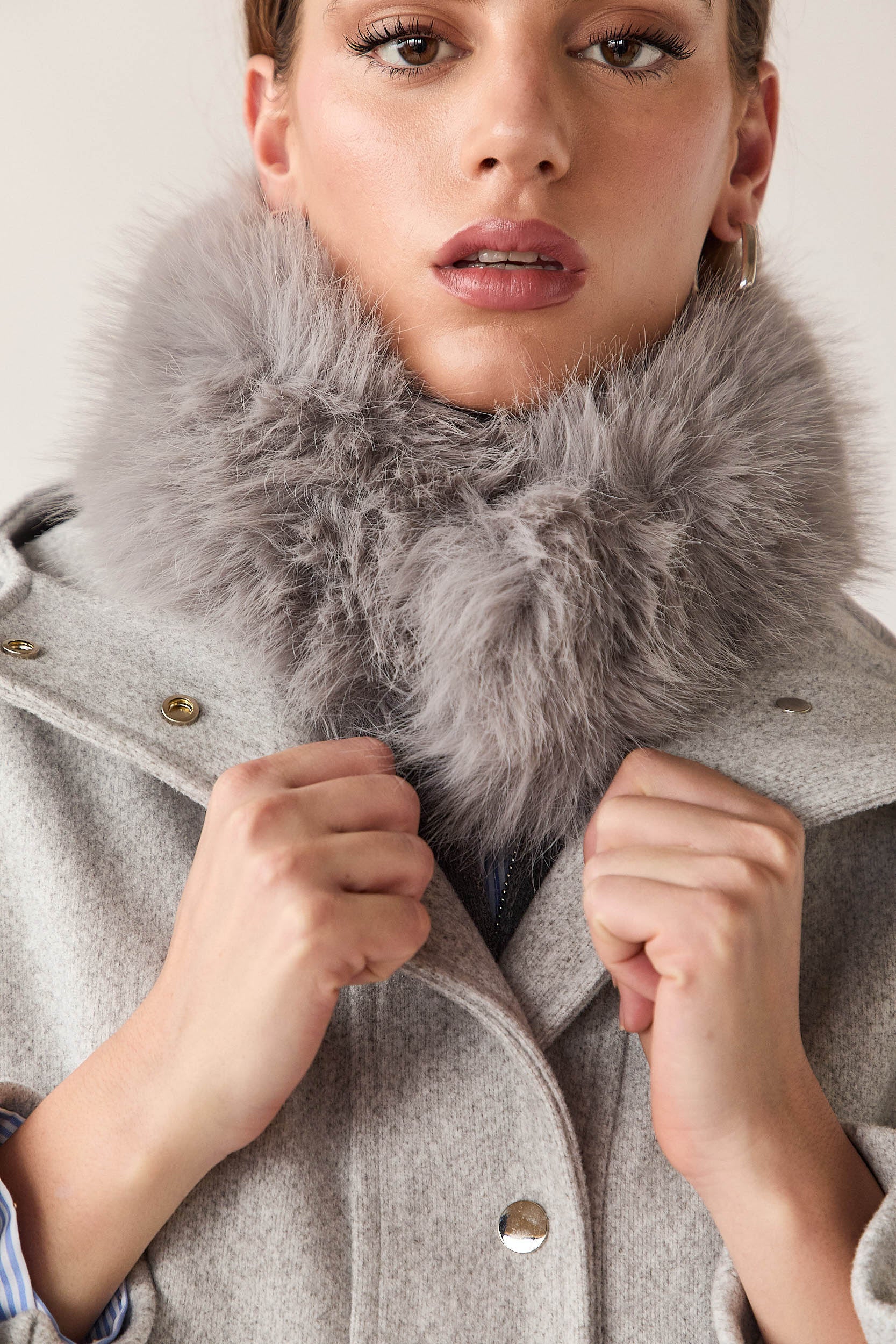 Cuello redondo confeccionado en pelo sintético suave de color gris. Su textura esponjosa y su volumen aportan un efecto envolvente, perfecto para abrigar el cuello en los días más fríos.