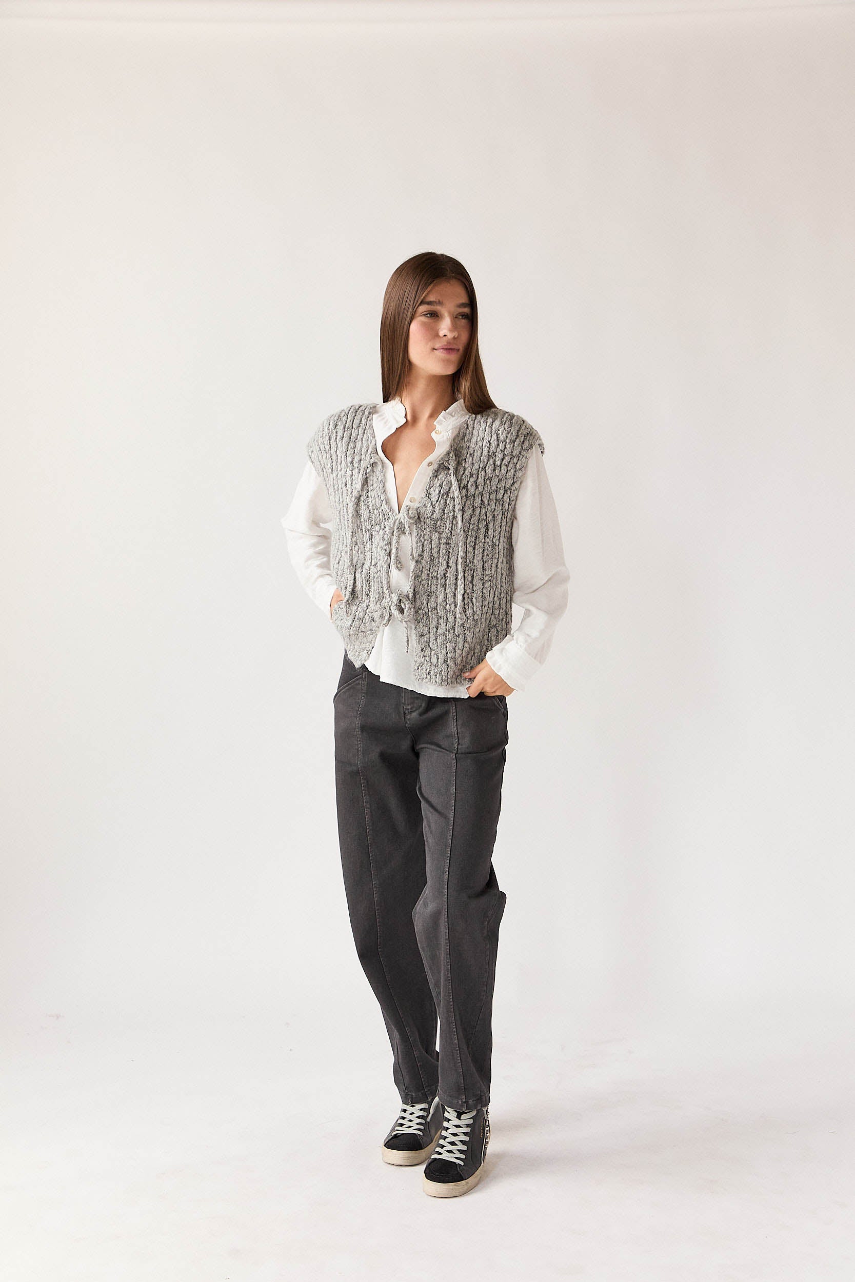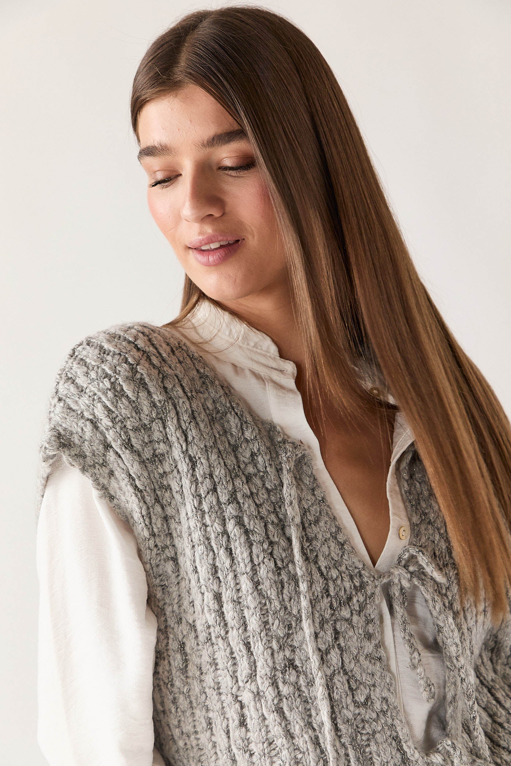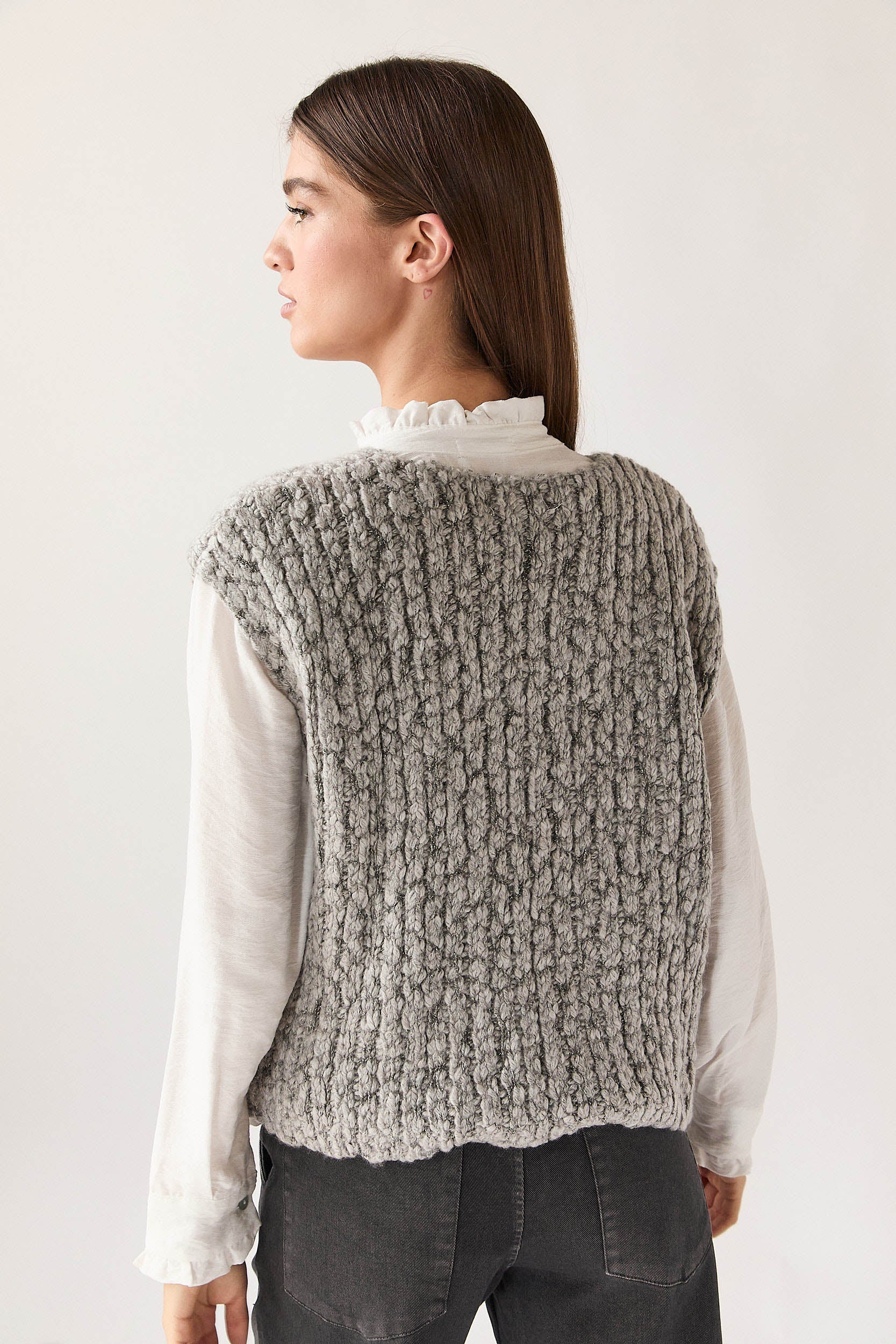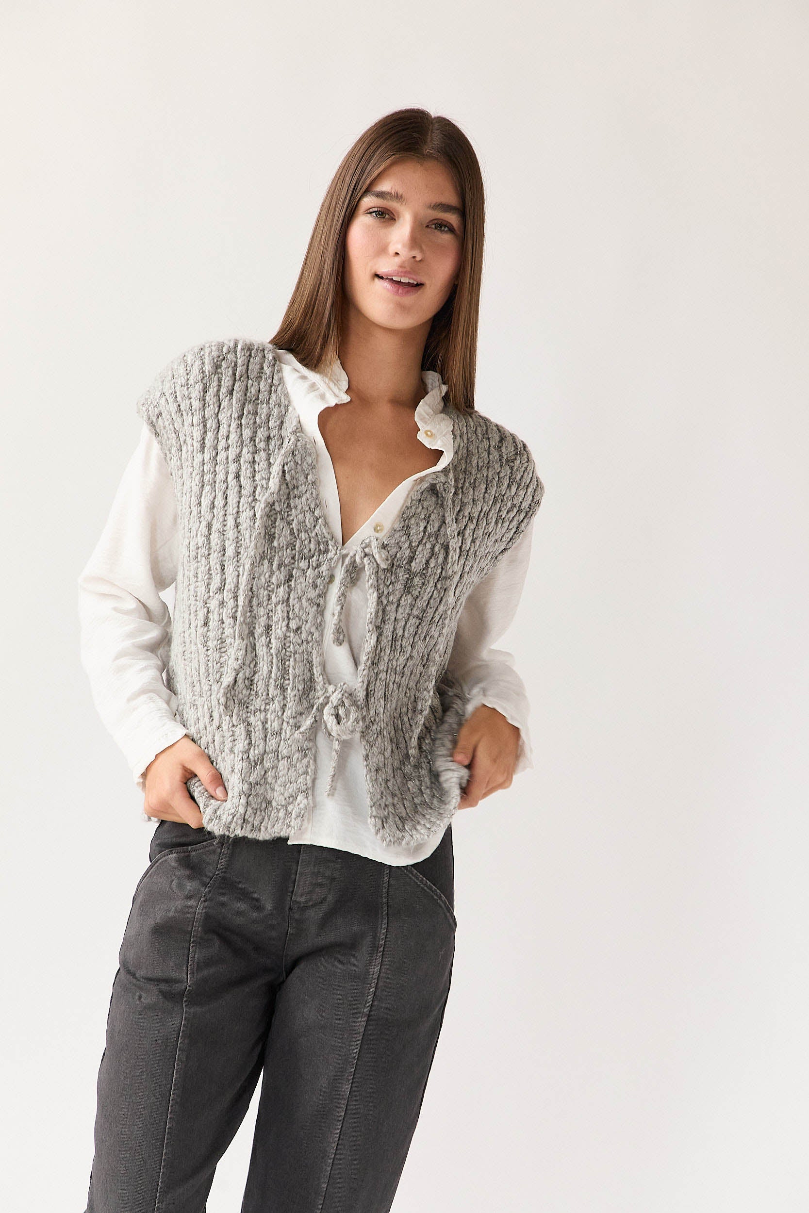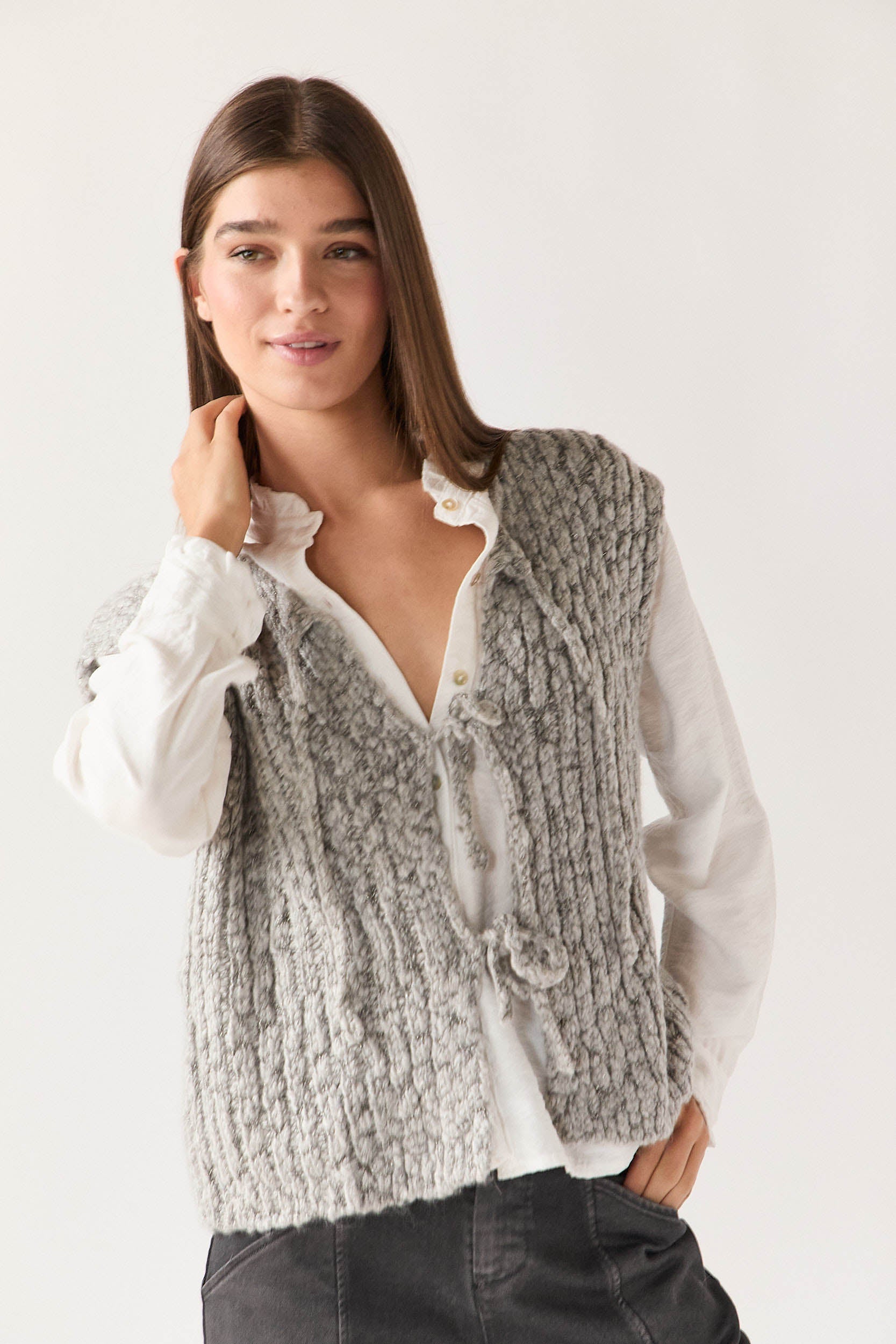 Chaleco de punto grueso en tono gris, con estructura trenzada y cierre frontal mediante tres lazos del mismo tejido. De corte recto y hombro caído, su diseño combina calidez y textura en una prenda que aporta un aire artesanal y relajado.