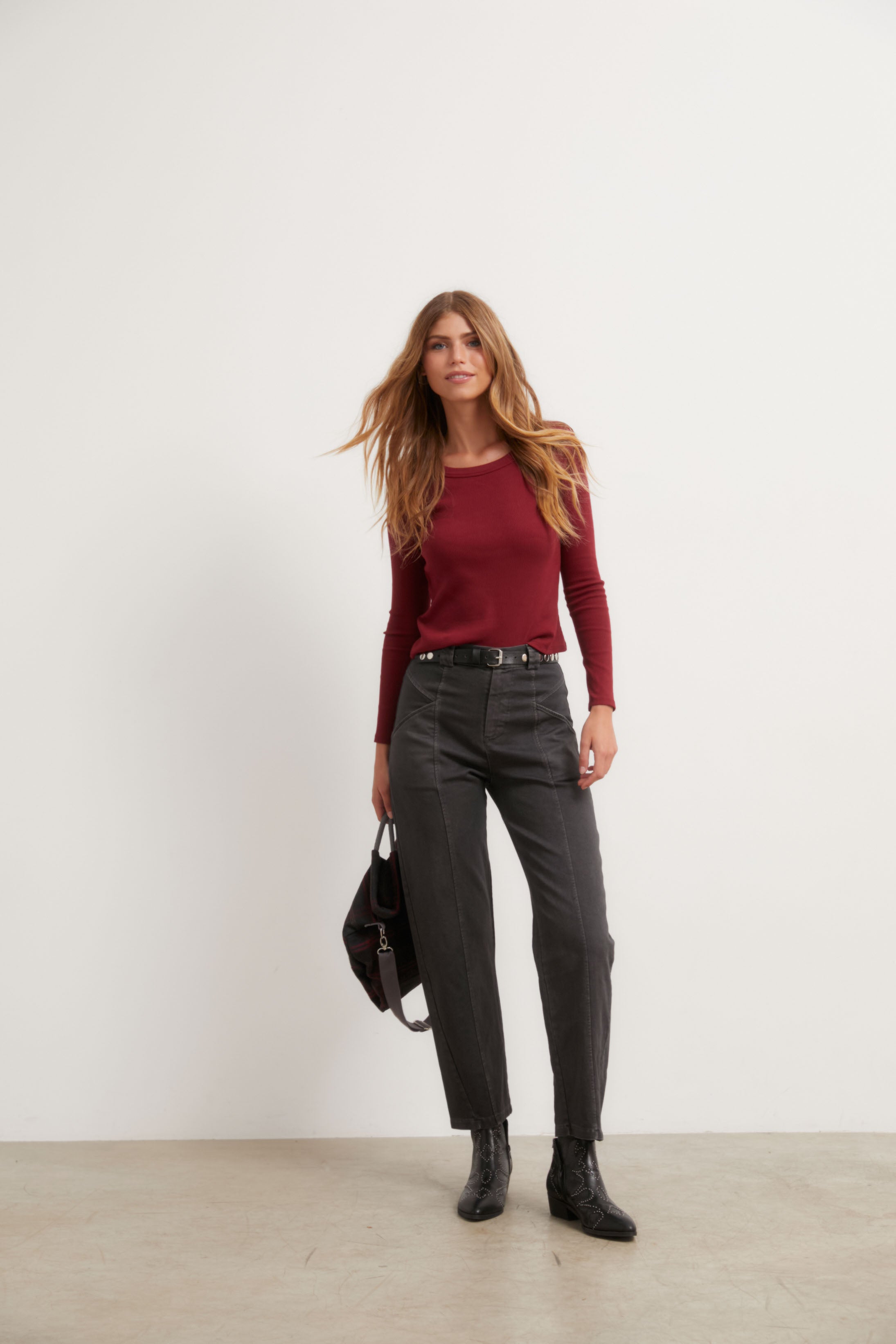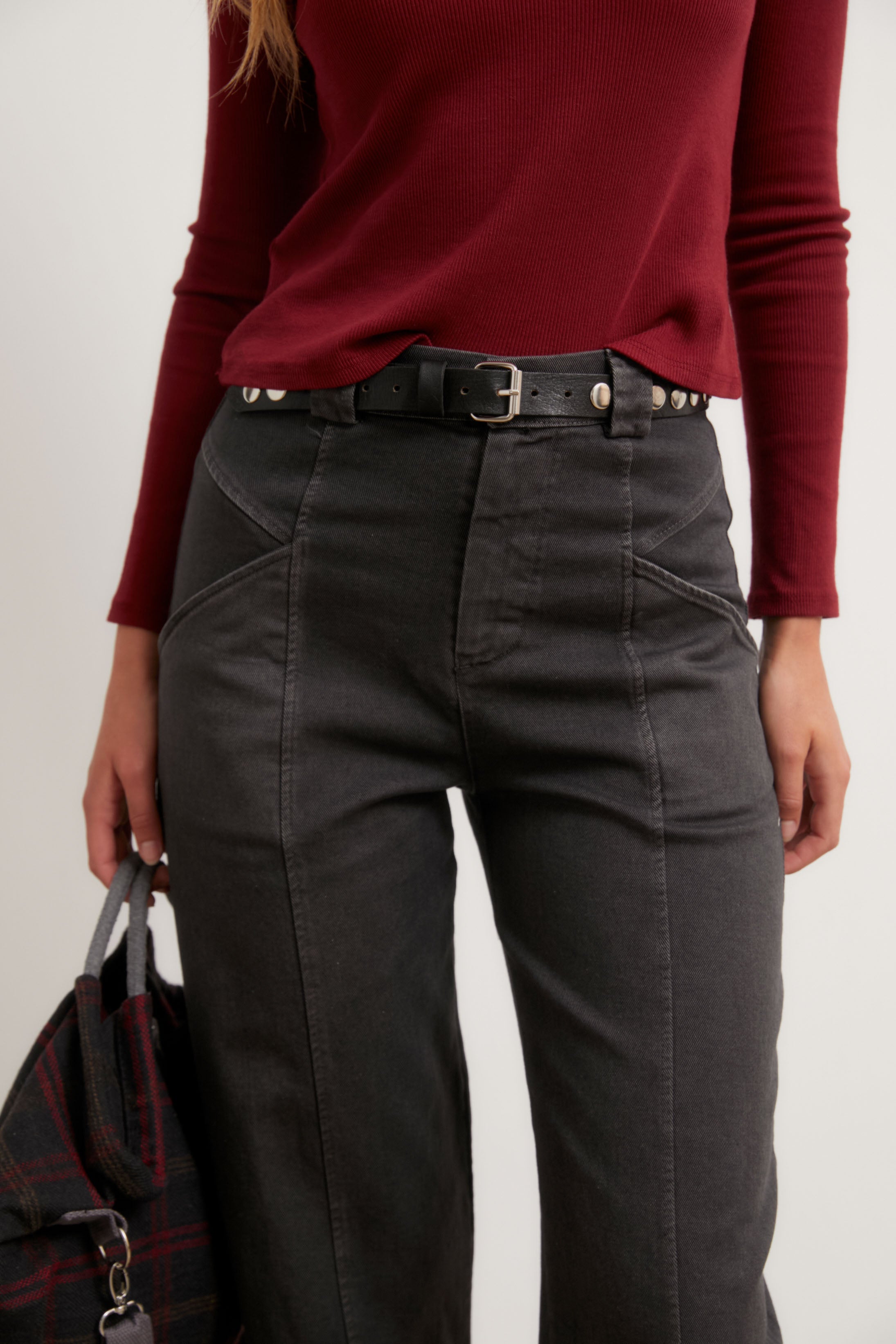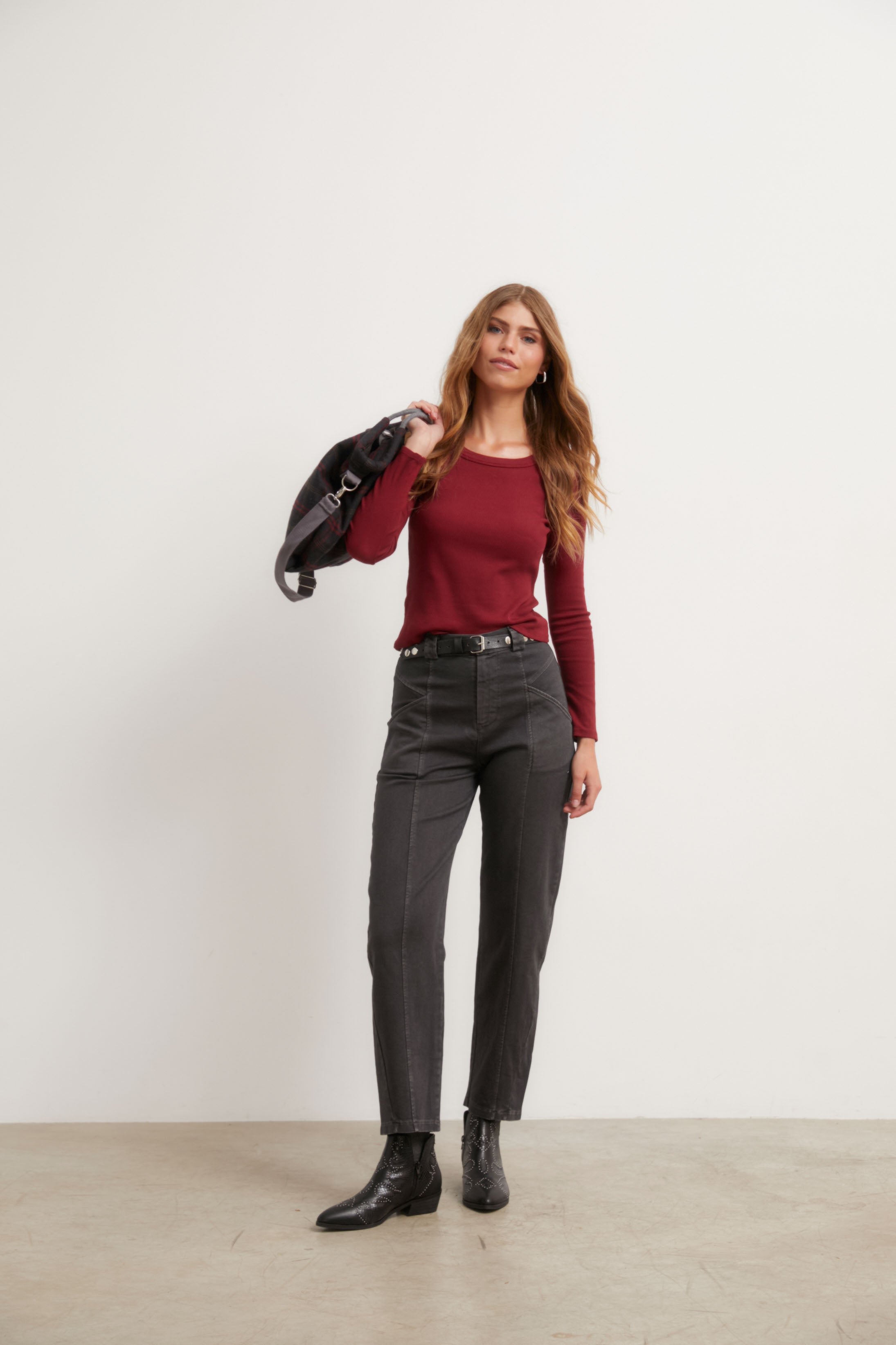 Jeans en color gris lavado con corte barrel, ligeramente holgado en la pernera y más ajustado en el bajo. Presenta costuras marcadas en delantero y bolsillos oblicuos que estilizan la silueta. Cierre frontal con botones metálicos vistos.