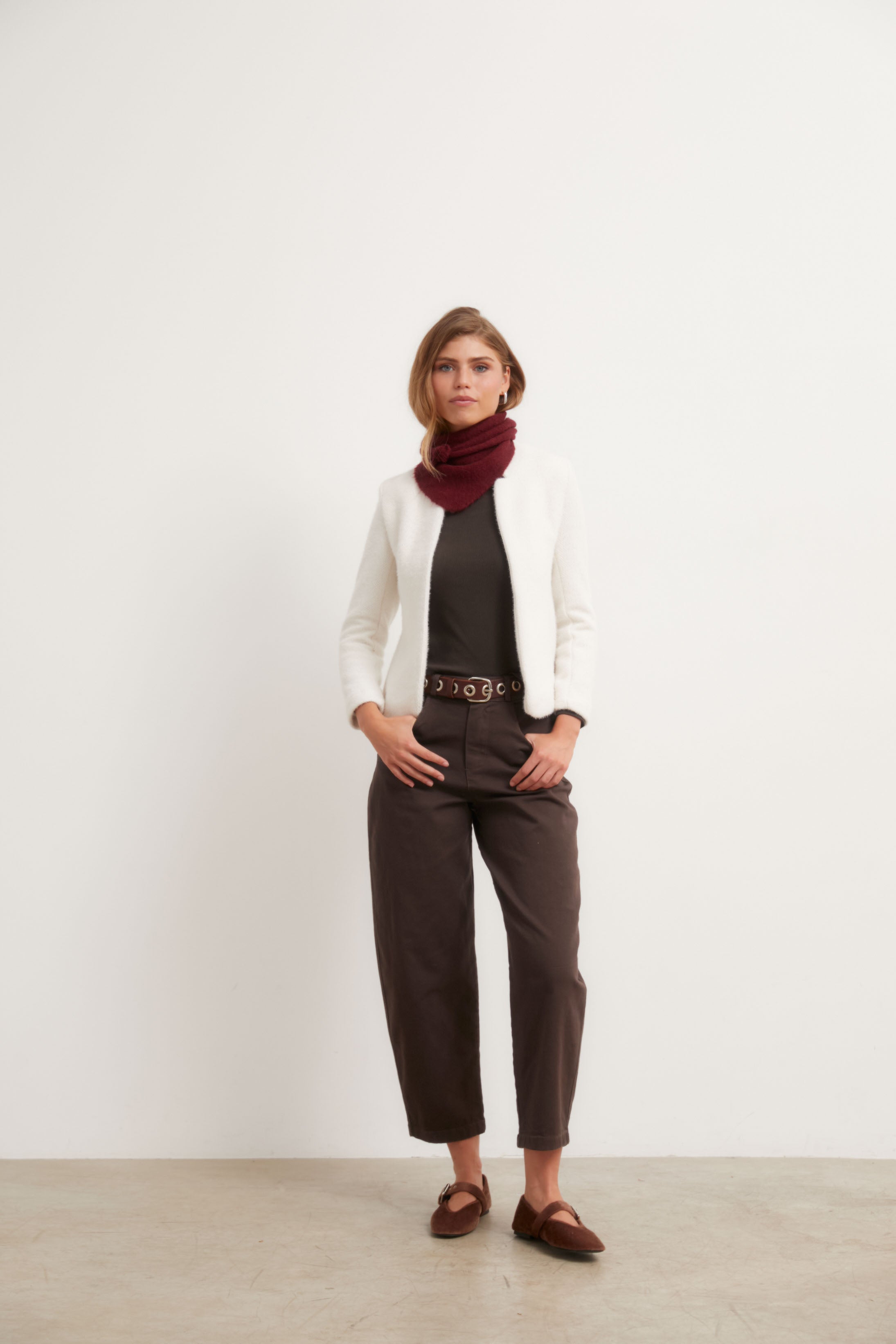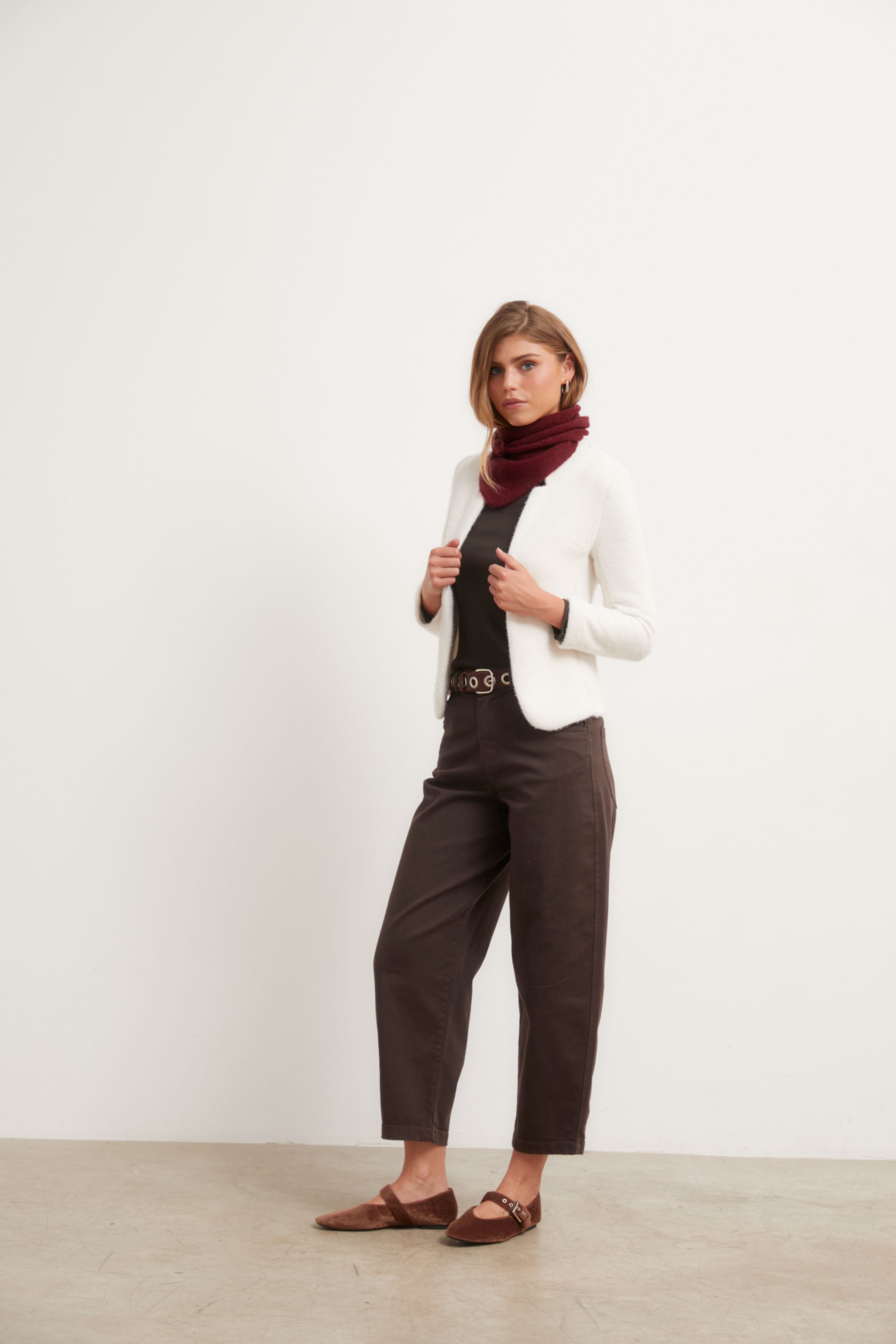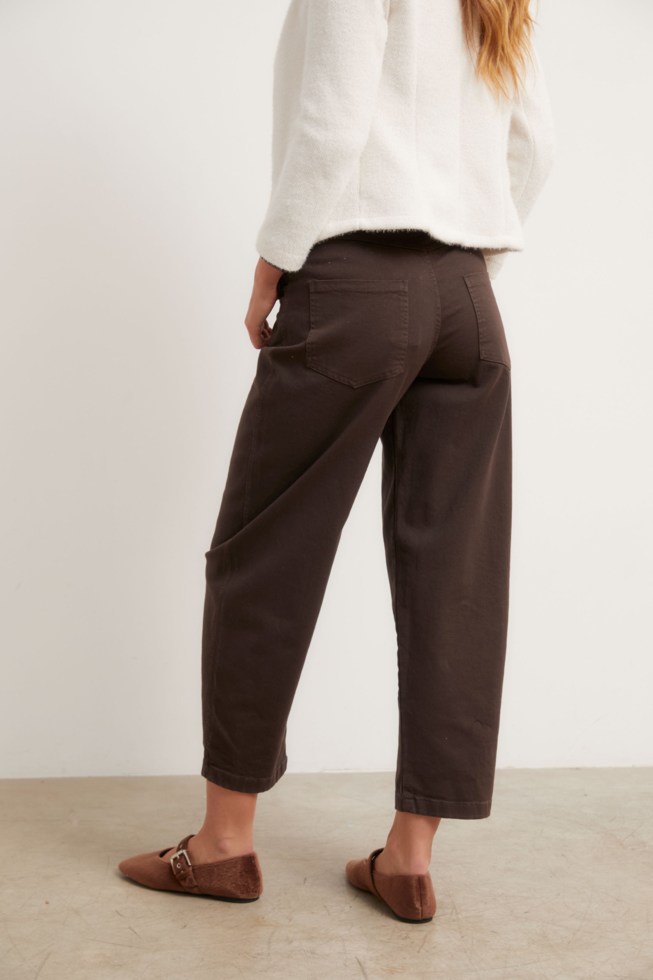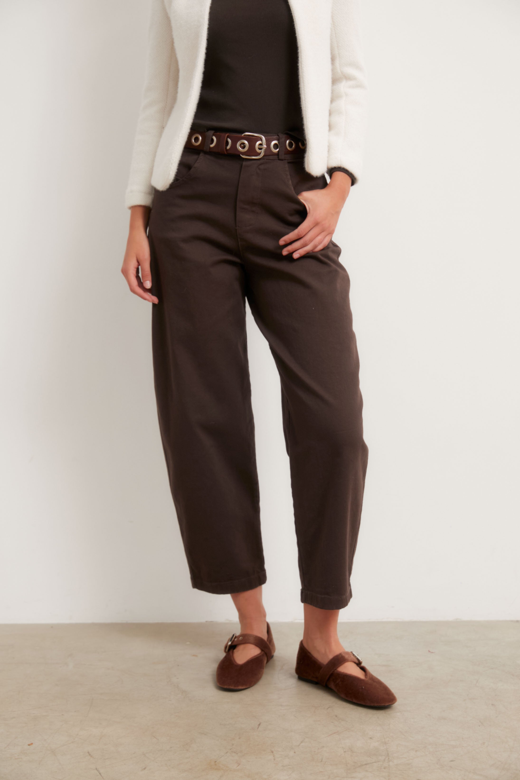 Pantalón con corte barrel en color marrón, con corte relajado y silueta bombacha ligeramente abullonada hacia el bajo. De tiro medio-alto, cuenta con bolsillos delanteros y traseros, trabillas para cinturón y cierre de botón con cremallera. El diseño suelto en la pierna aporta comodidad y un aire desenfadado.