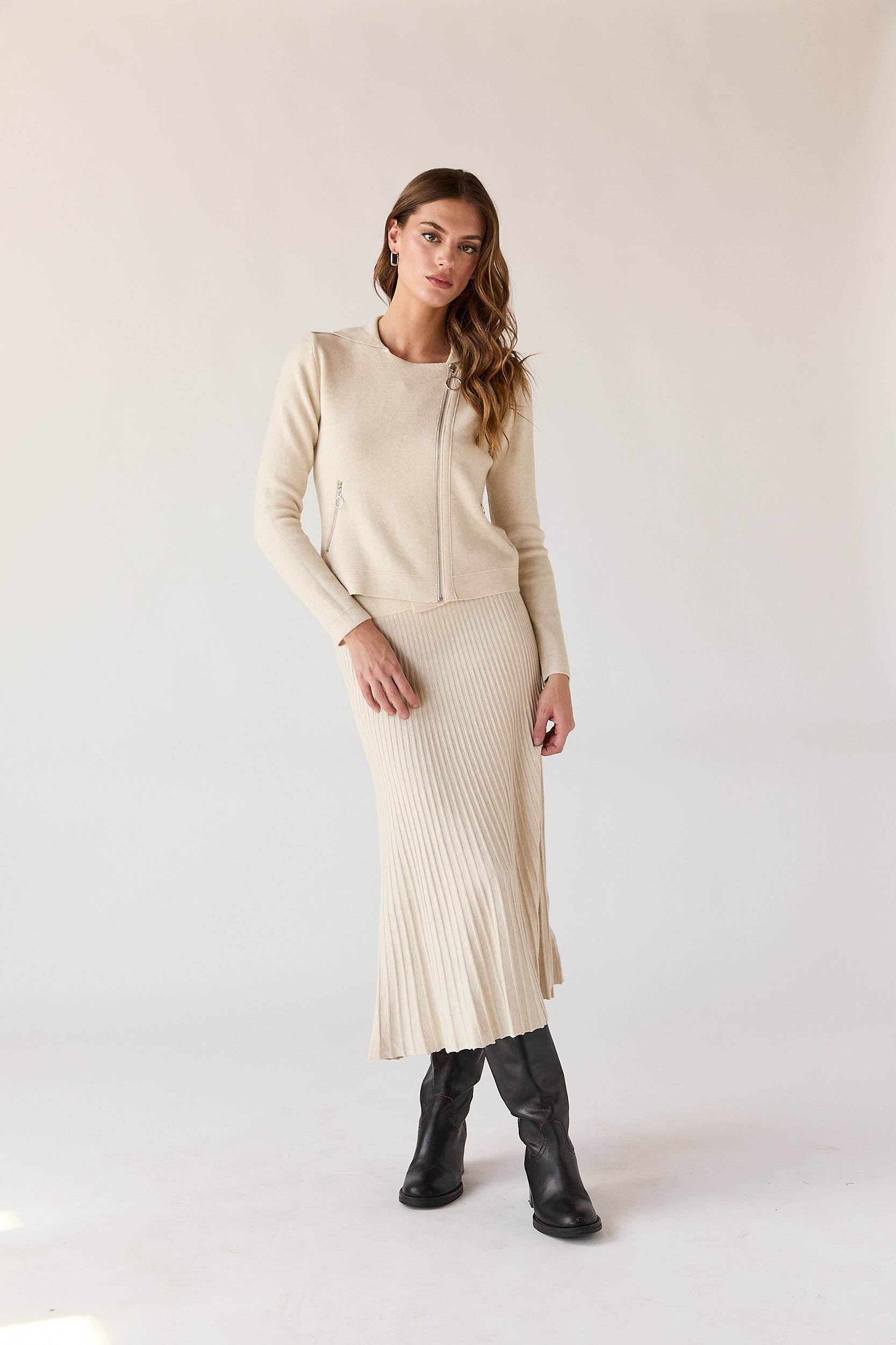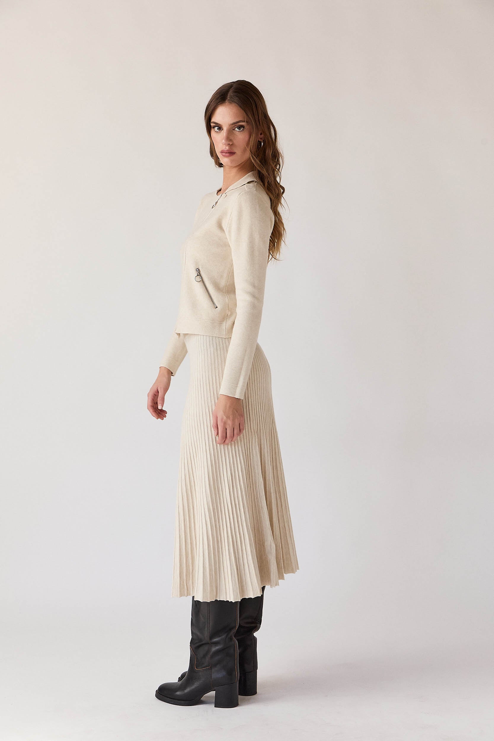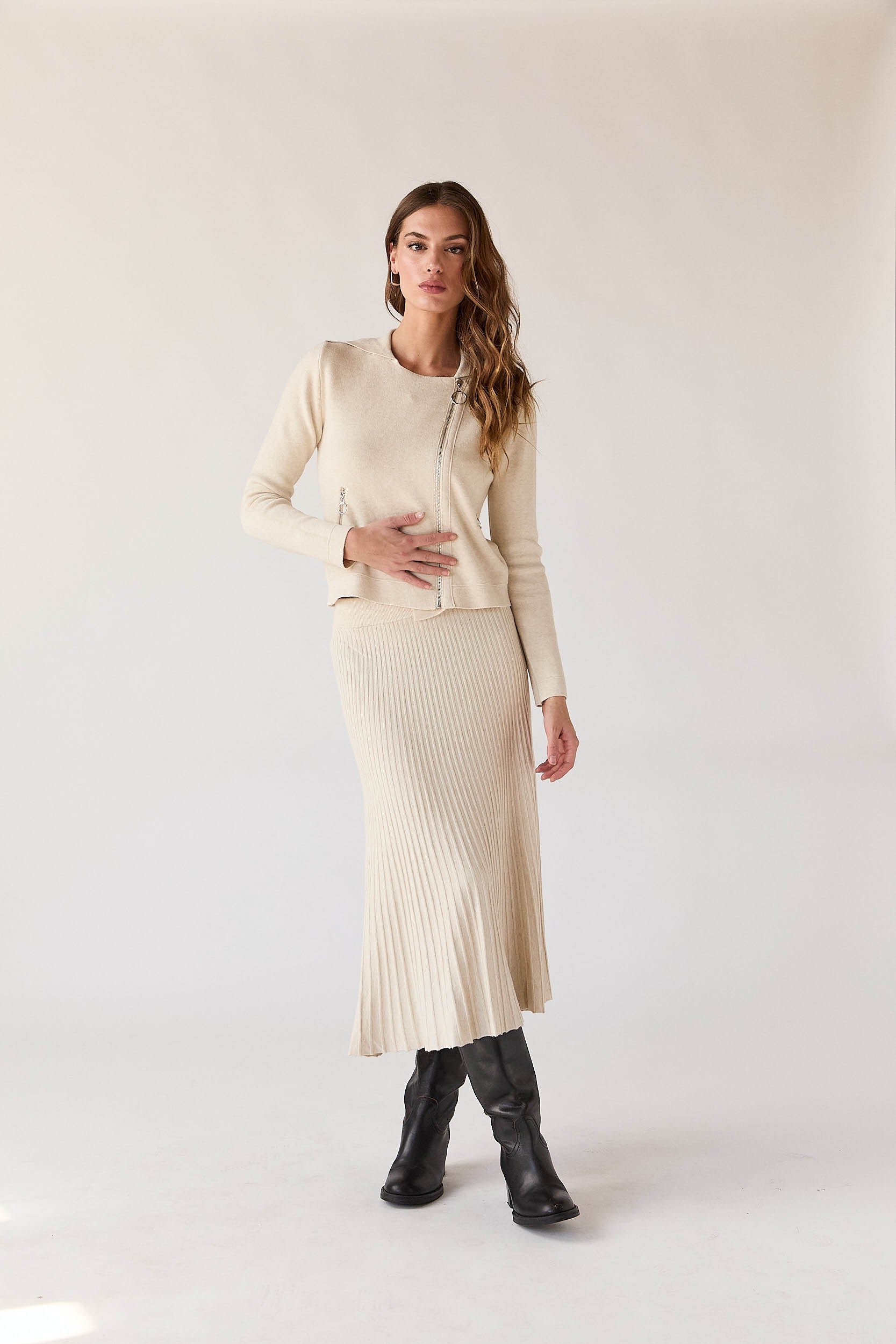 Falda de punto en color beige con diseño de largo midi. Presenta corte recto con vuelo sutil y acabado plisado que aporta movimiento y ligereza. Su cintura elástica favorece la comodidad y se adapta con facilidad a la silueta.