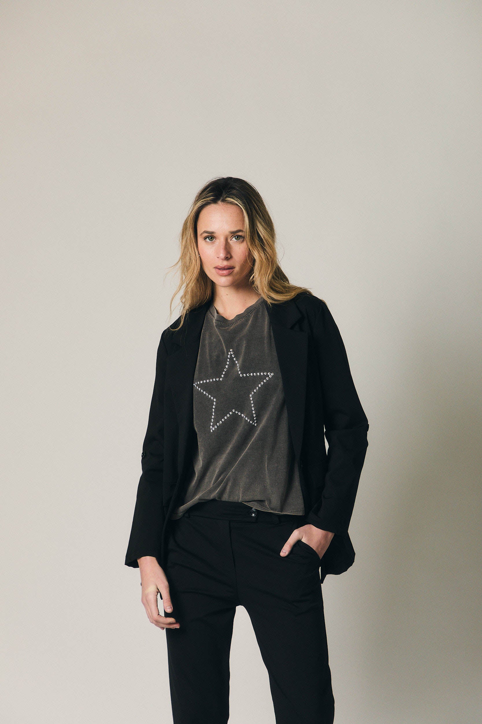 Americana de corte sastre en color negro, con silueta recta y estructura limpia. Presenta solapas clásicas, cierre frontal con botón y bolsillos de tapeta. El largo a la cadera y la caída cuidada aportan un acabado pulido, pensado para completar looks tanto formales como más relajados.