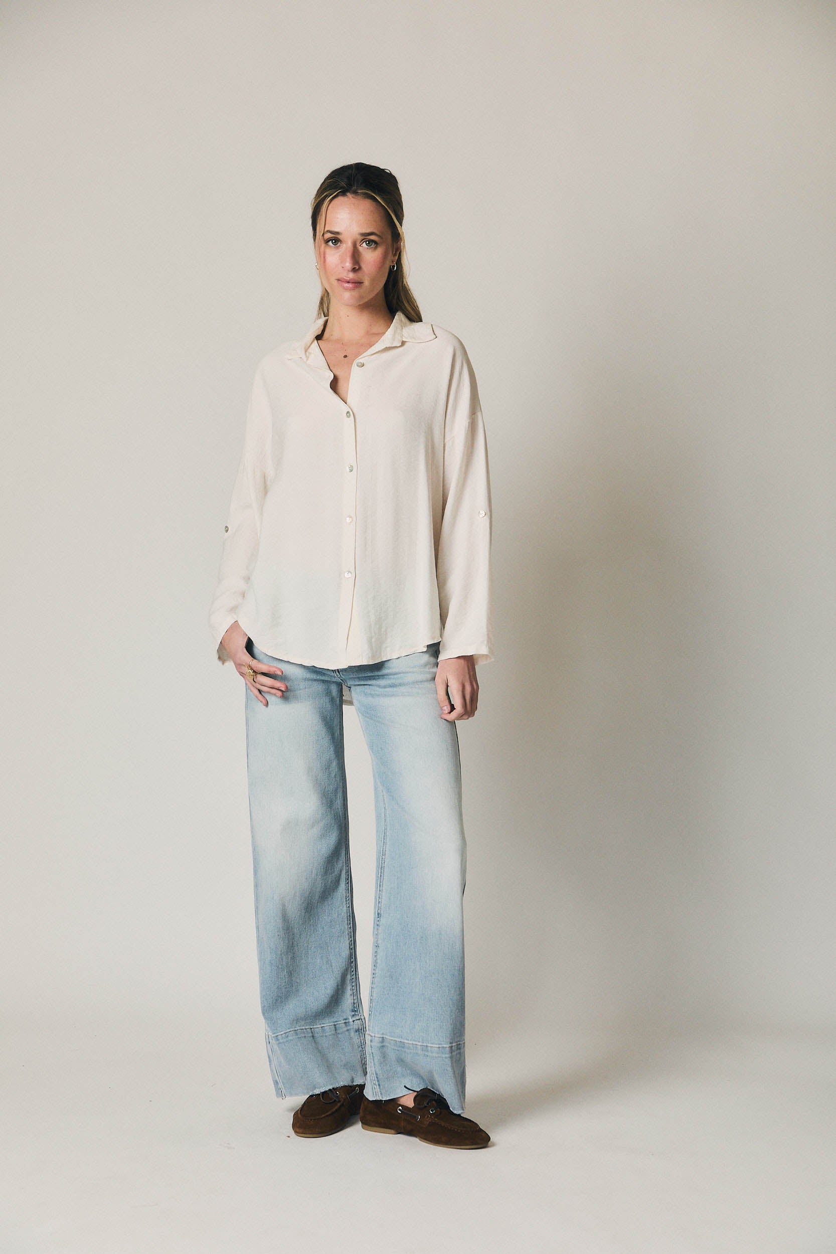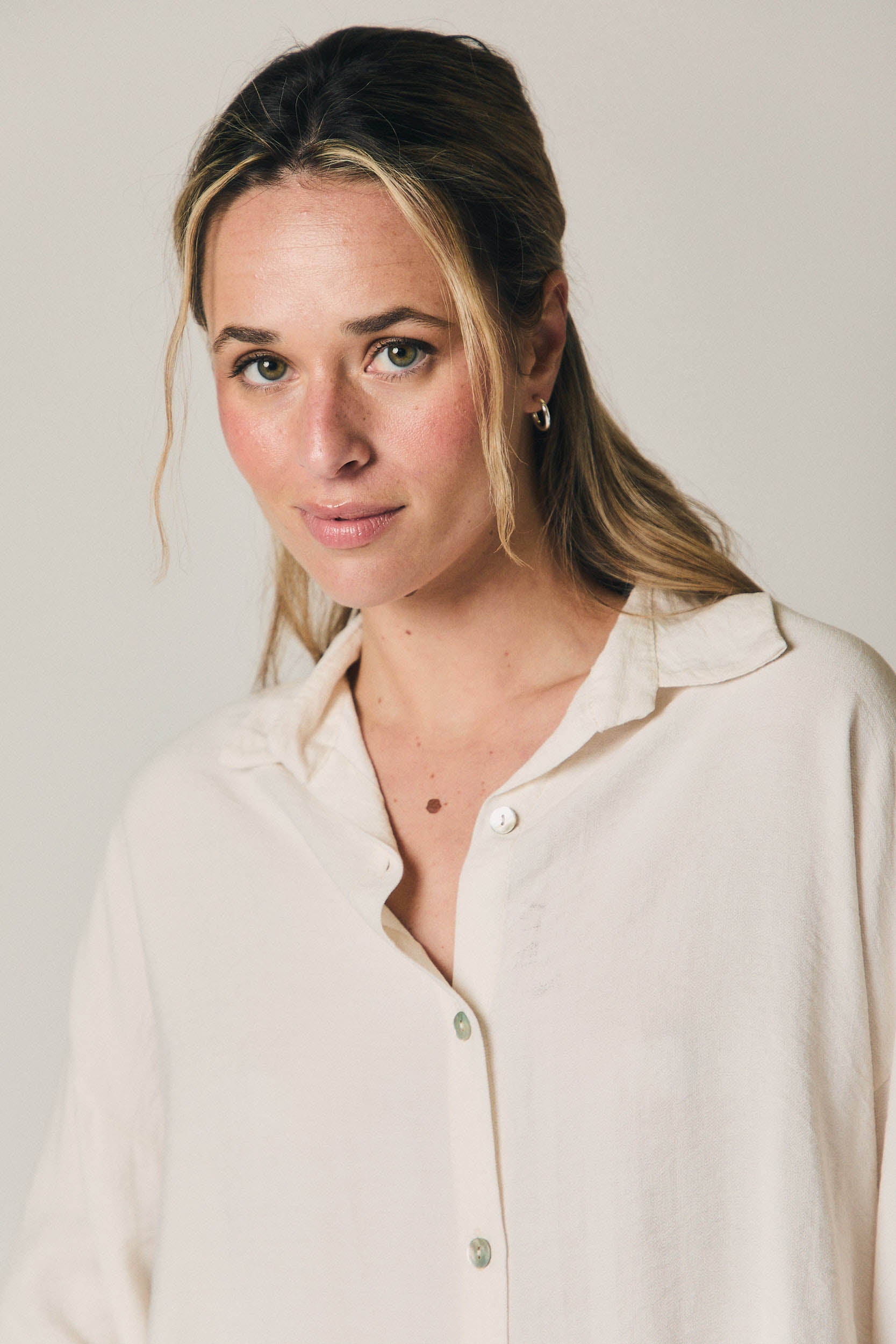 Camisa de tejido fluido en tono crudo, con cuello camisero clásico y cierre frontal de botones. Presenta manga larga con opción de vuelta y trabilla, aportando versatilidad al diseño. Corte recto y caída ligera, pensada para un ajuste cómodo y favorecedor.