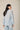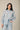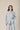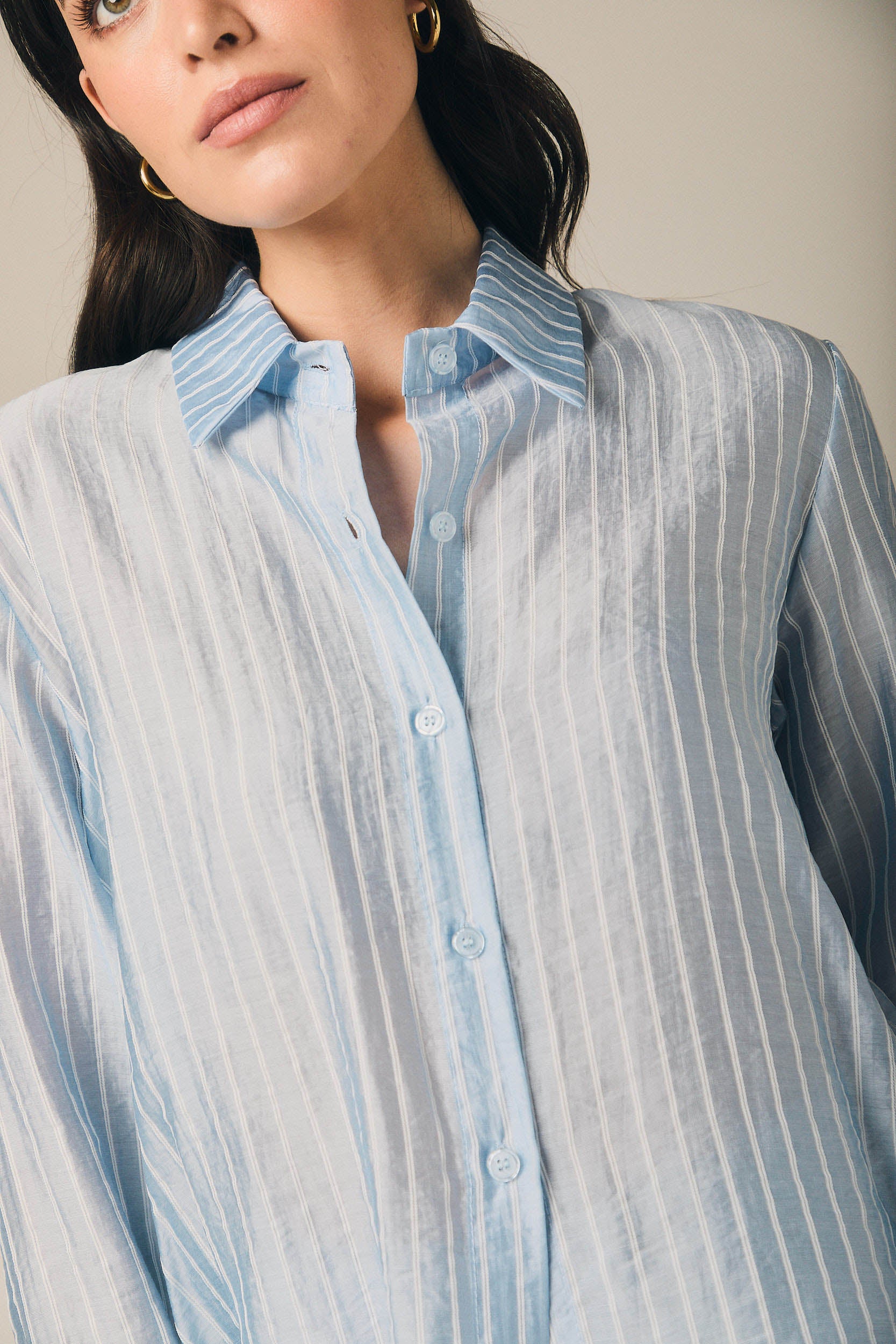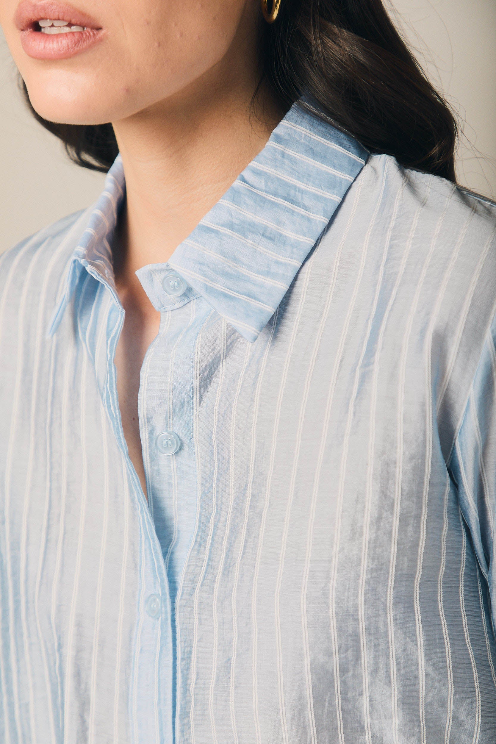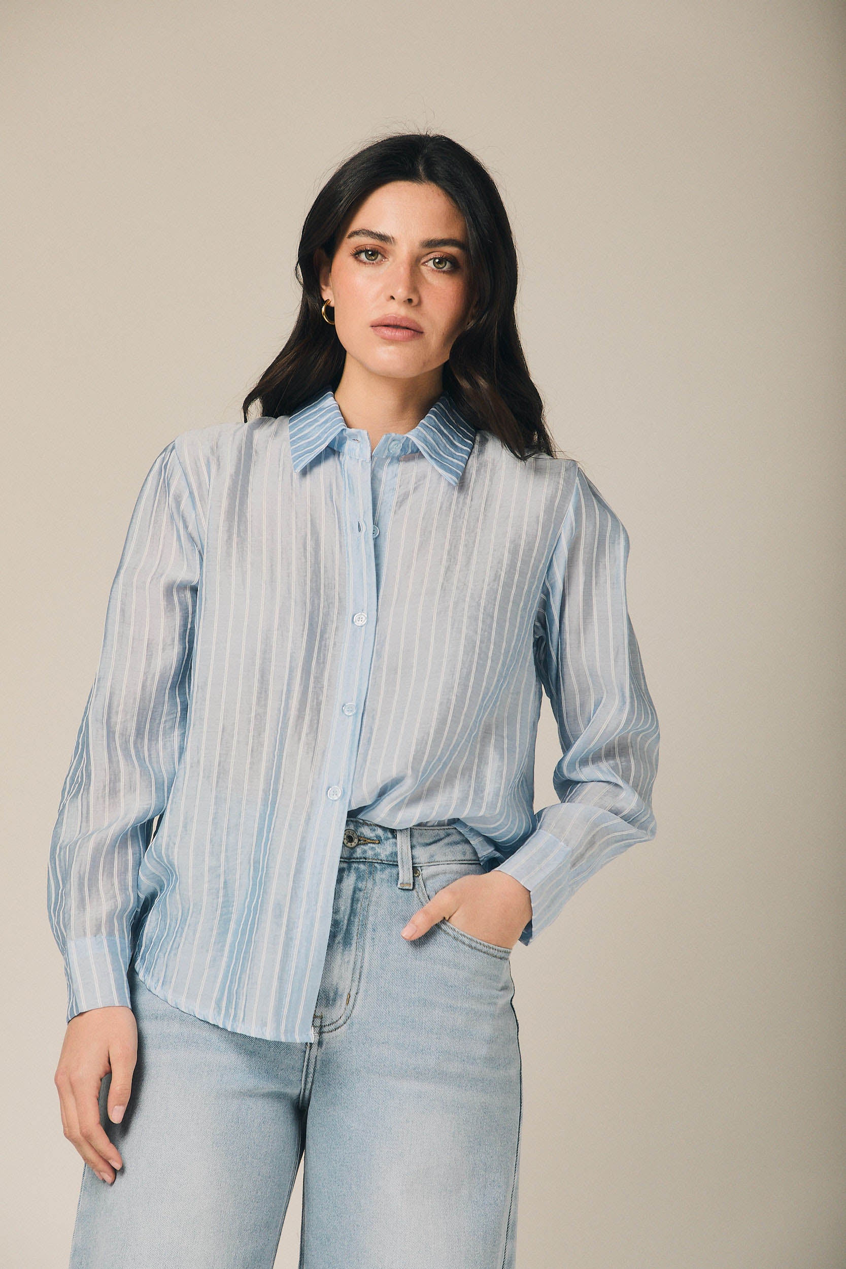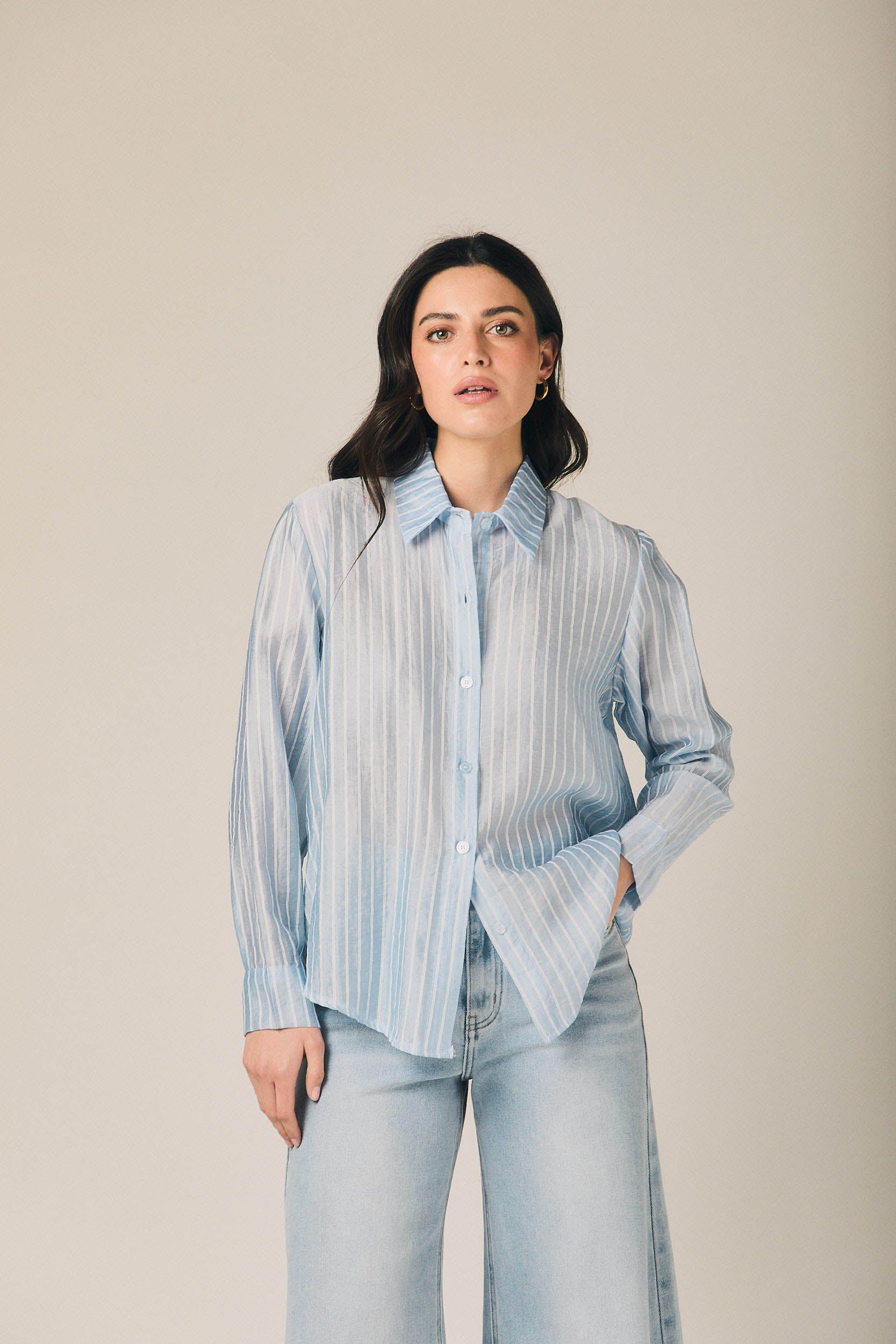 Camisa de mujer en tejido ligero con estampado de rayas verticales en tono celeste y blanco. Diseño de cuello clásico y cierre frontal de botones. Presenta manga larga con puño ancho y ligera amplitud en la caída que aporta movimiento.