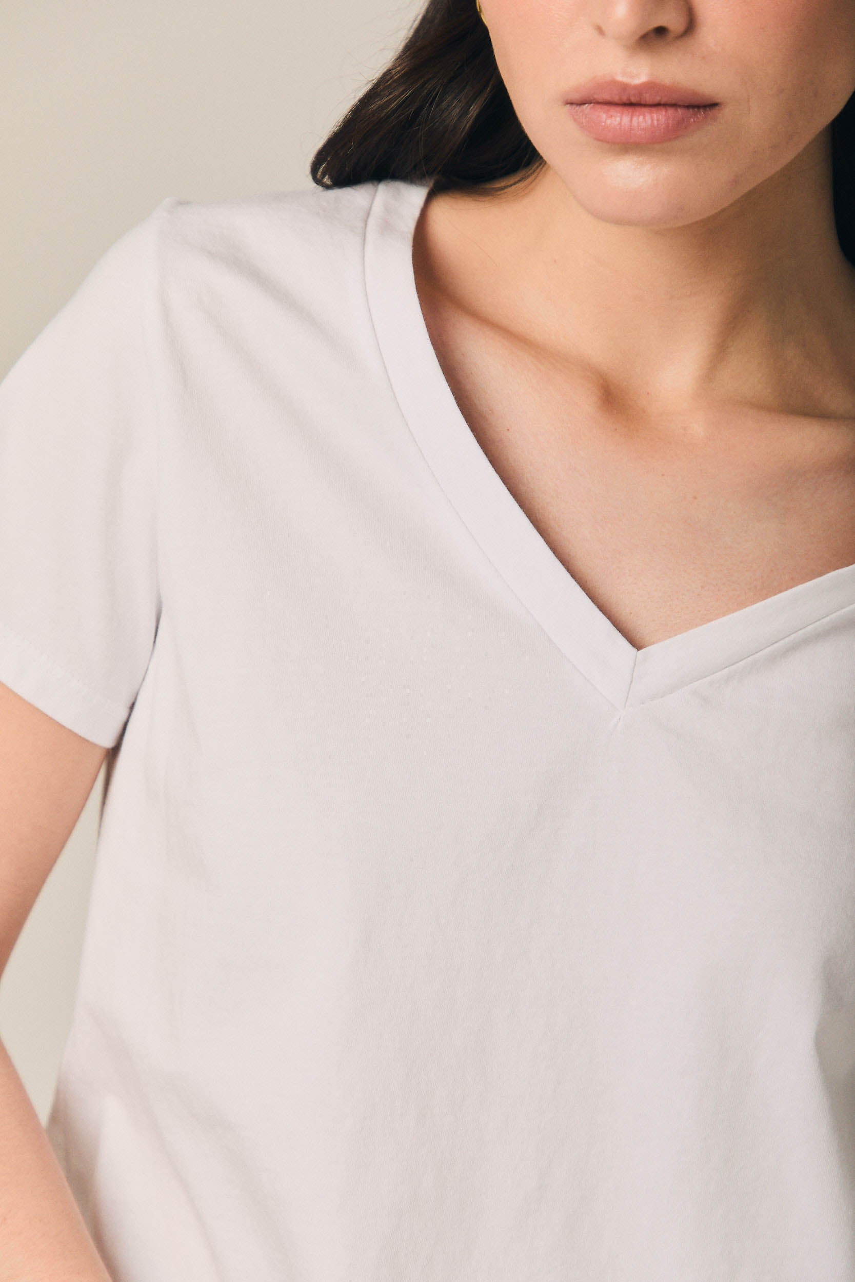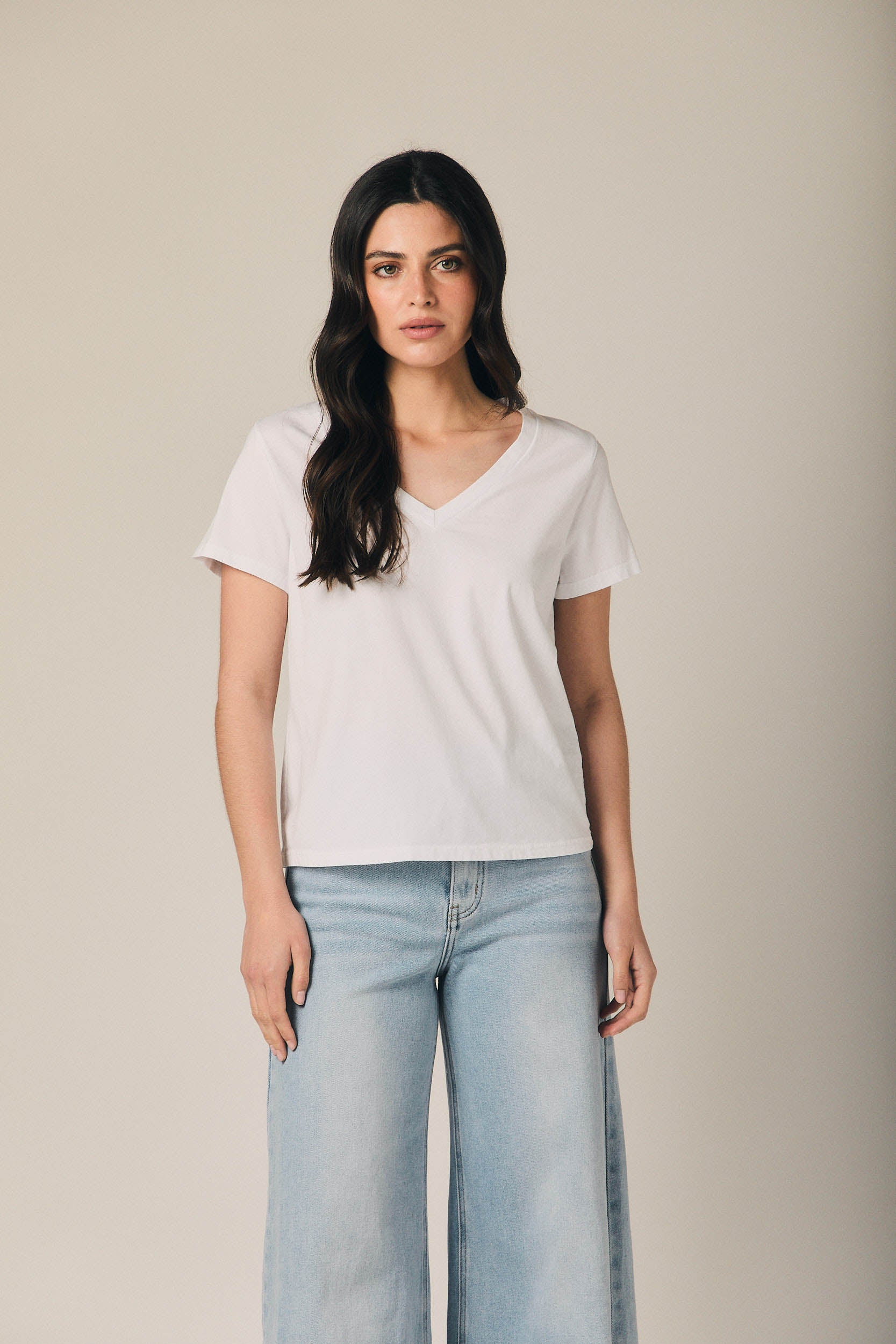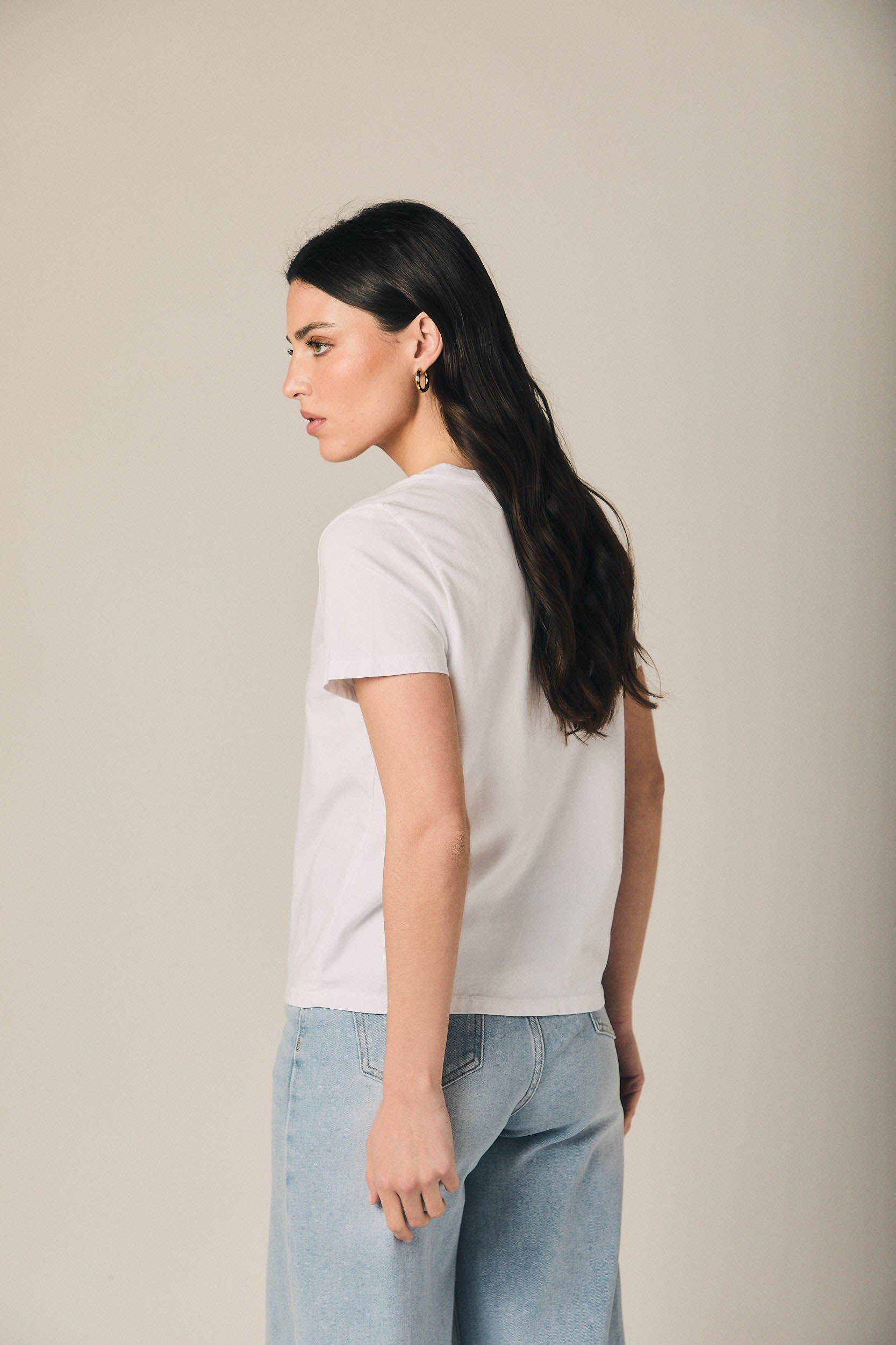 Camiseta de mujer en color blanco con corte recto y cuello en pico. Diseño de manga corta y silueta limpia que favorece sin ceñir. Un básico en tono verde suave que aporta luz y frescura a los looks de diario.