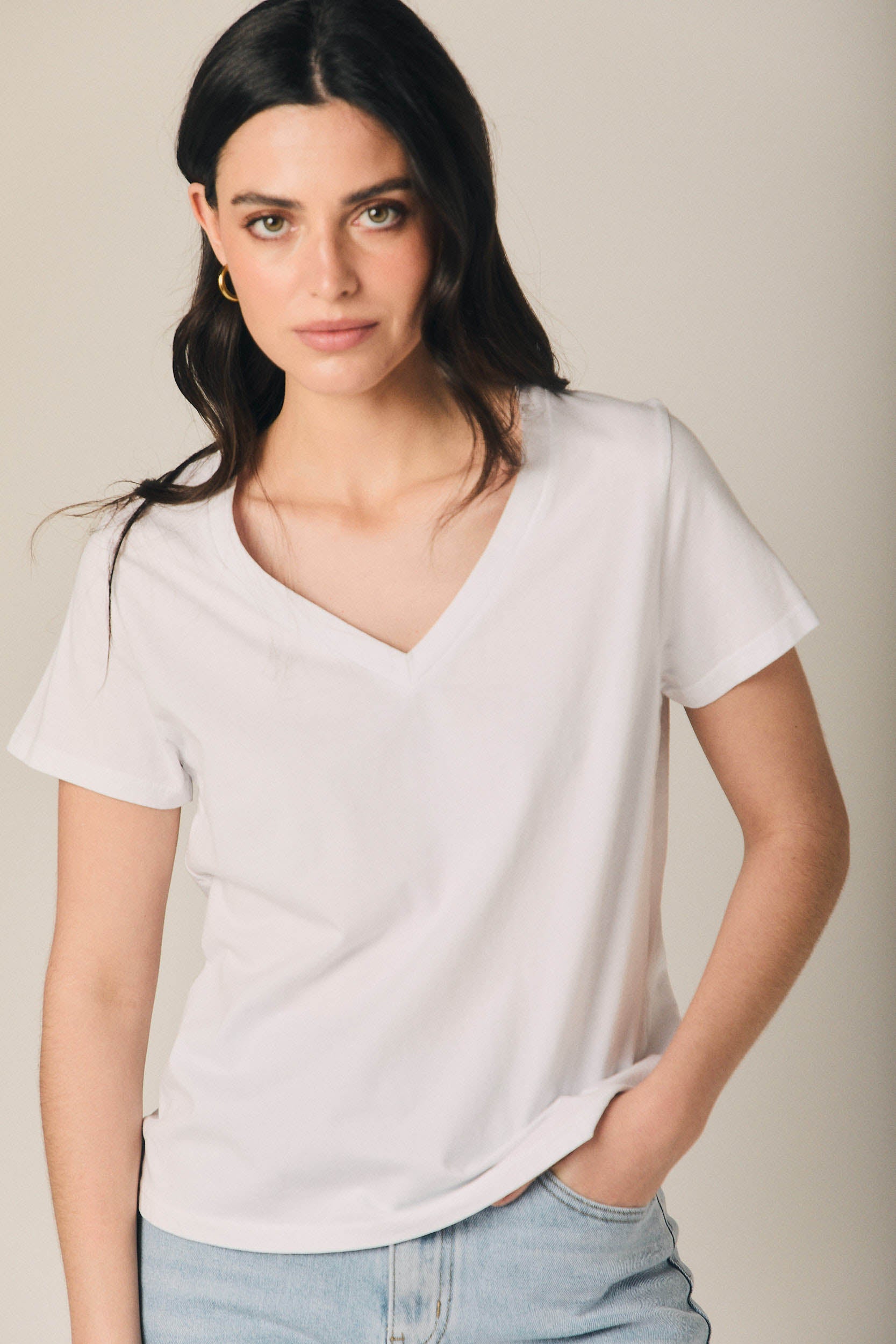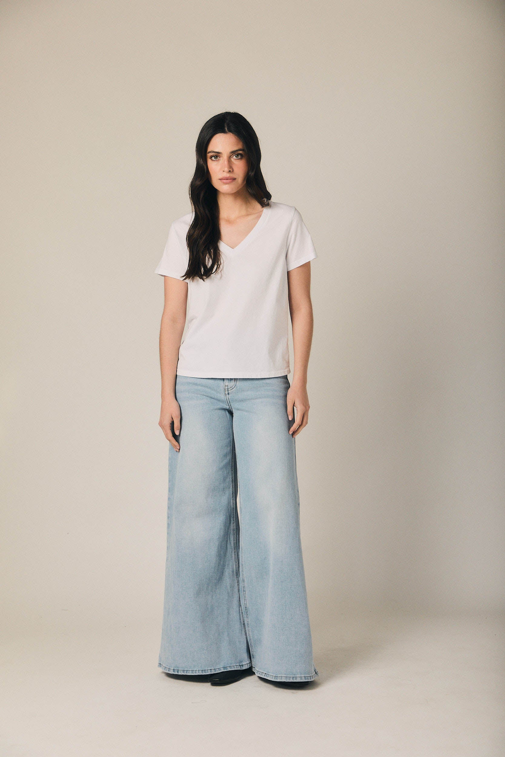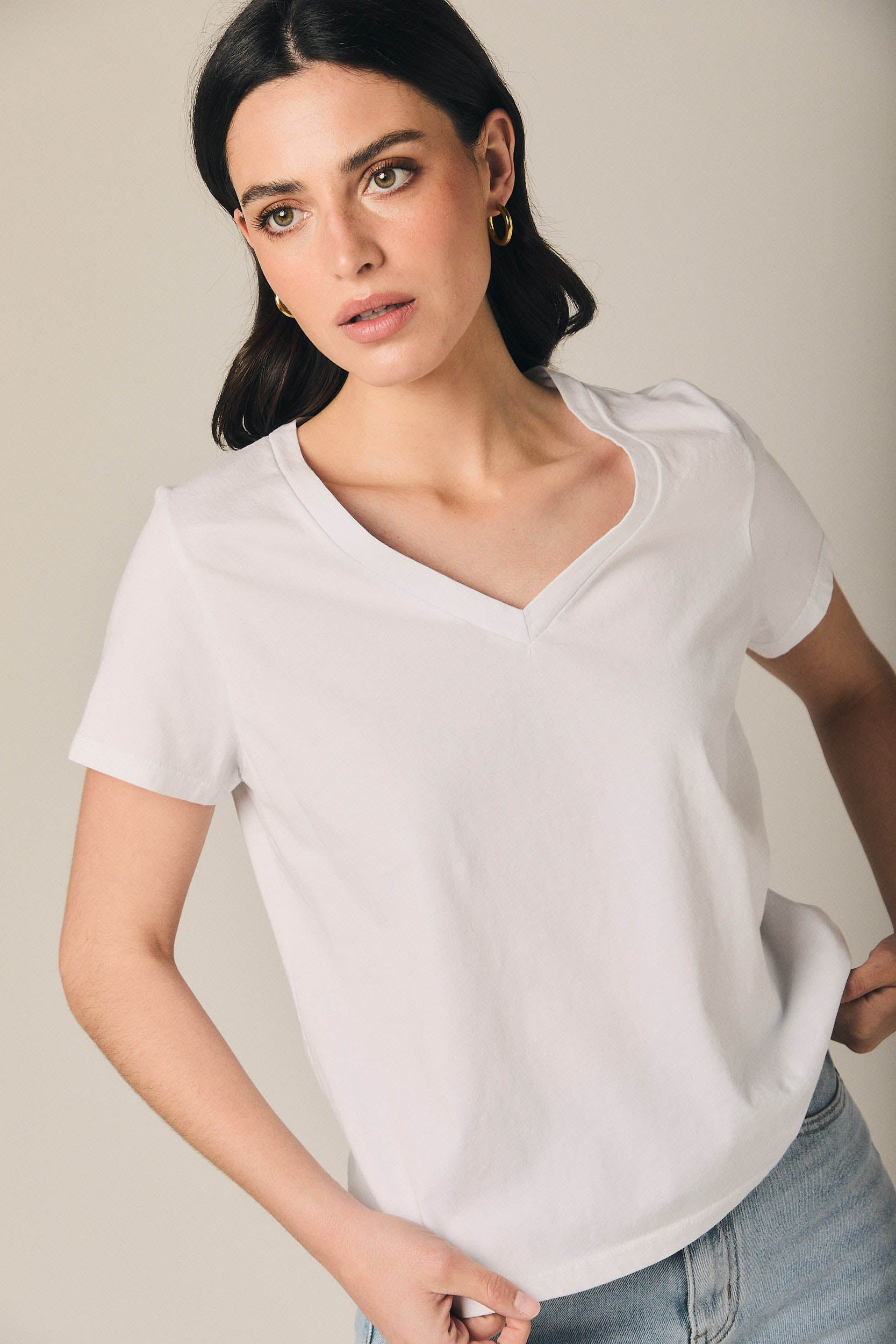 Camiseta de mujer en color blanco con corte recto y cuello en pico. Diseño de manga corta y silueta limpia que favorece sin ceñir. Un básico en tono verde suave que aporta luz y frescura a los looks de diario.