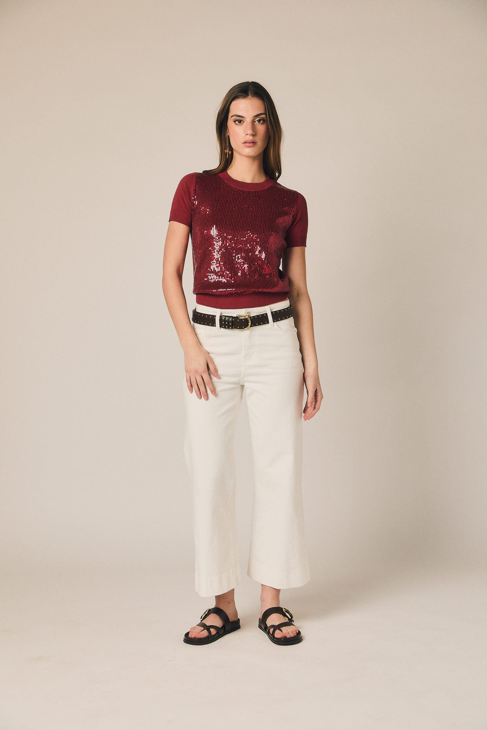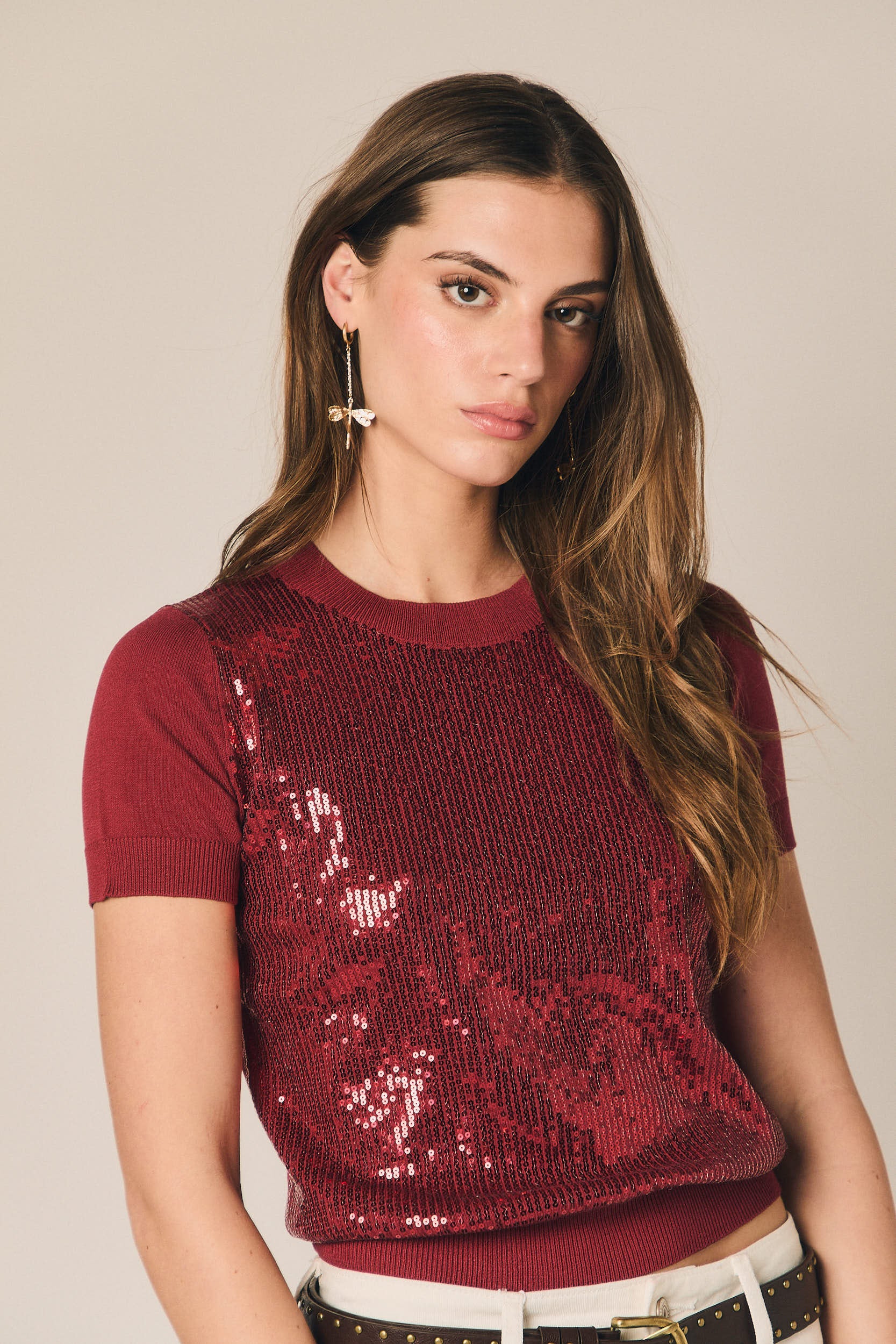 Camiseta de punto fino en tono burdeos con detalle de lentejuelas que aportan un brillo sutil y elegante. Presenta cuello redondo y manga corta, con acabado en rib que ajusta suavemente la prenda al cuerpo. Su diseño combina la comodidad del punto con un toque sofisticado, ideal para elevar looks cotidianos.