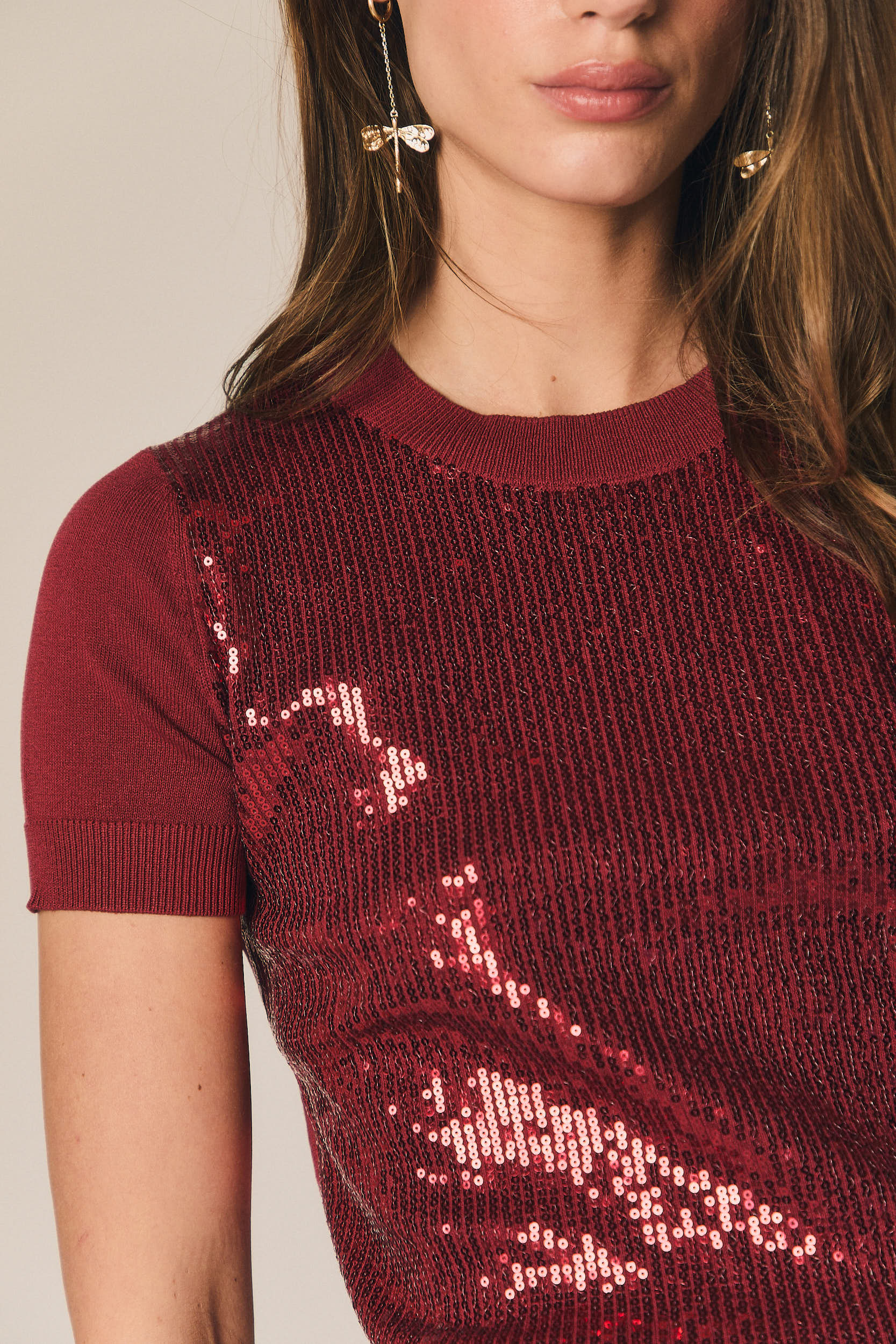 Camiseta de punto con lentejuelas burdeos