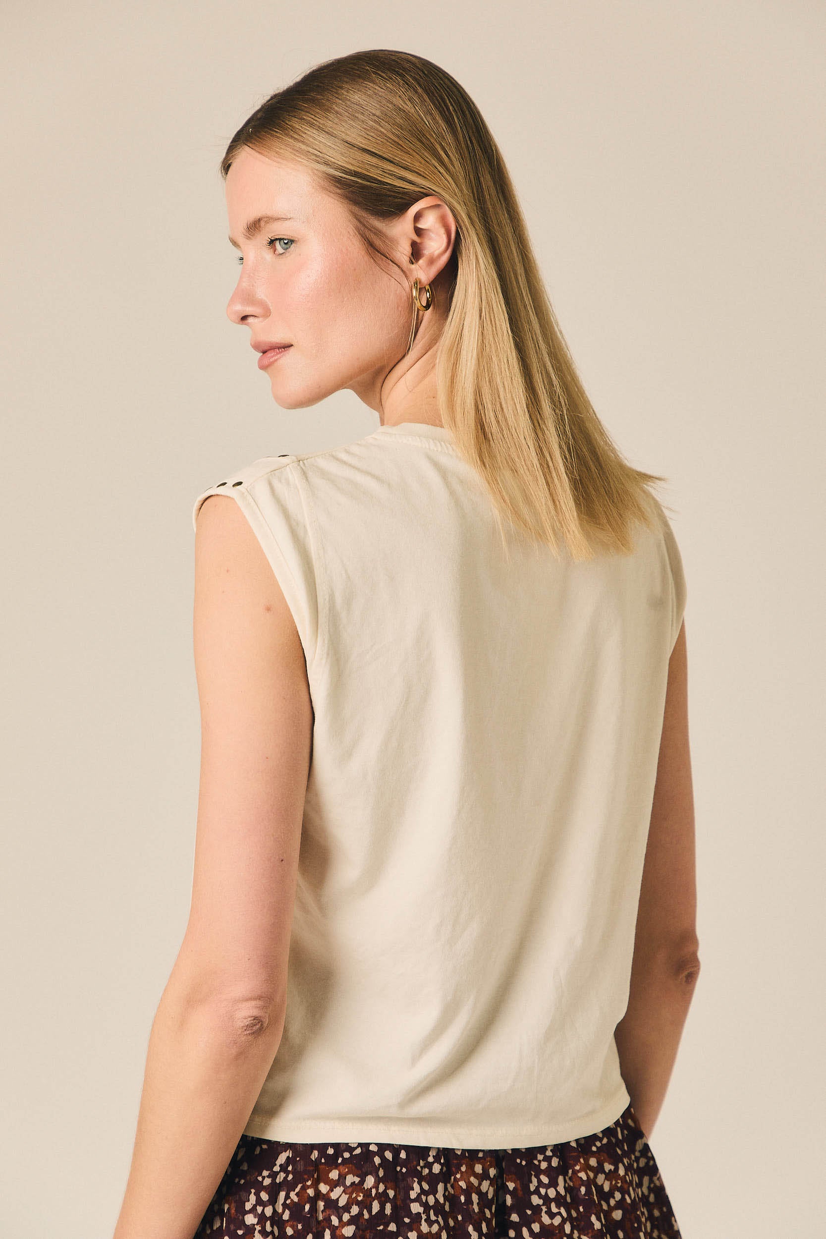Camiseta sin mangas con cuello redondo y hombros ligeramente estructurados. Presenta detalle de tachas metálicas a lo largo de la sisa que aportan un acabado decorativo al diseño. Su corte recto y largo ligeramente corto crean una silueta ligera y cómoda.