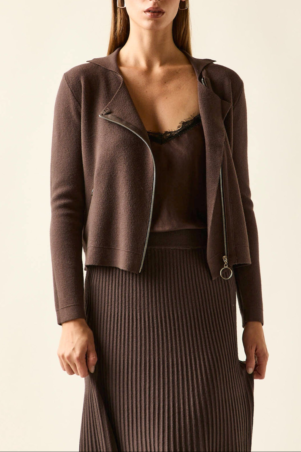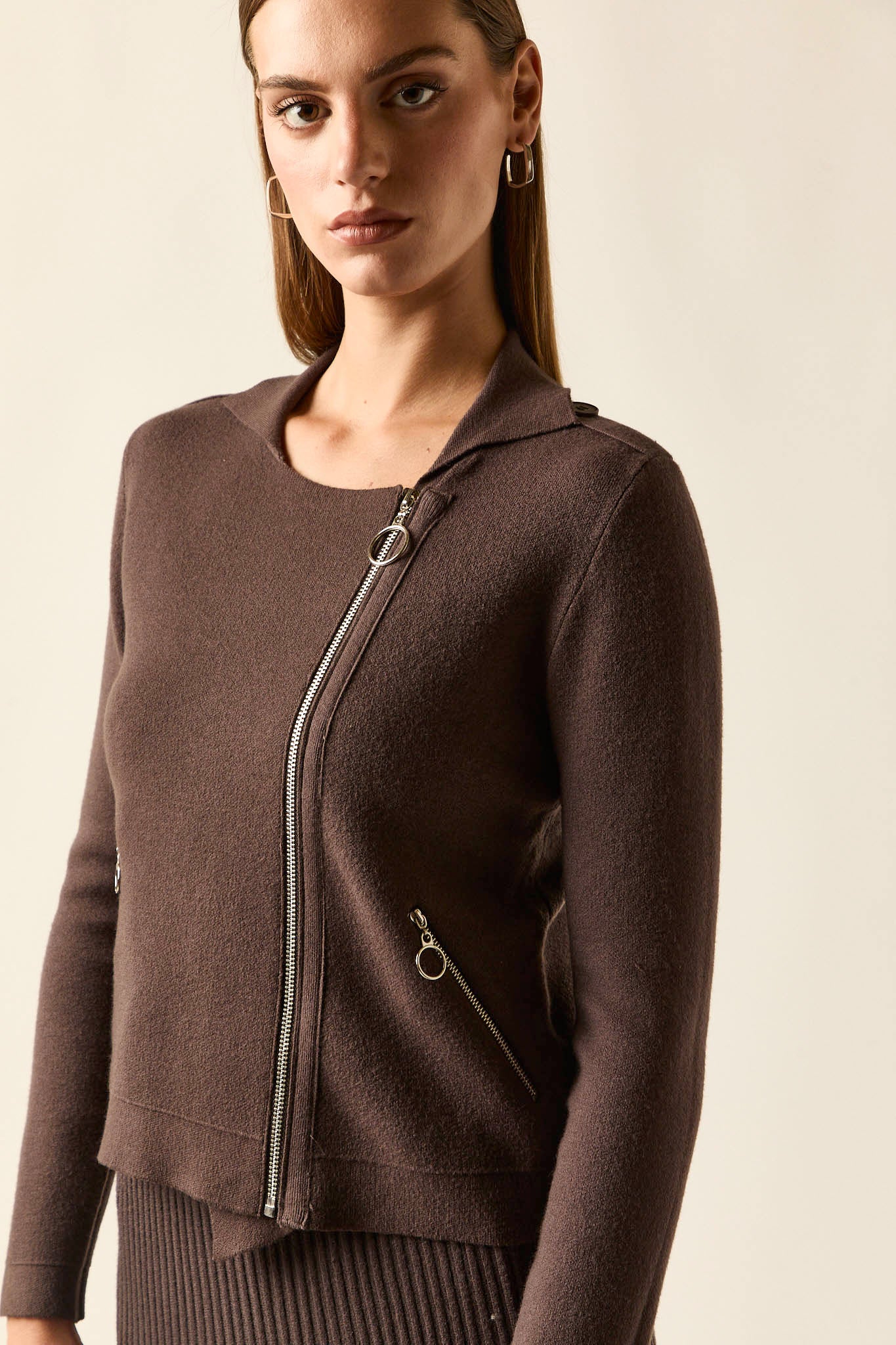 Chaqueta de punto en color marrón con diseño tipo perfecto. Presenta cierre frontal cruzado con cremallera metálica y tiradores de aro, bolsillos laterales también con cremallera y cuello solapa. Su corte recto y tejido suave la convierten en una prenda cómoda y versátil para el día a día.