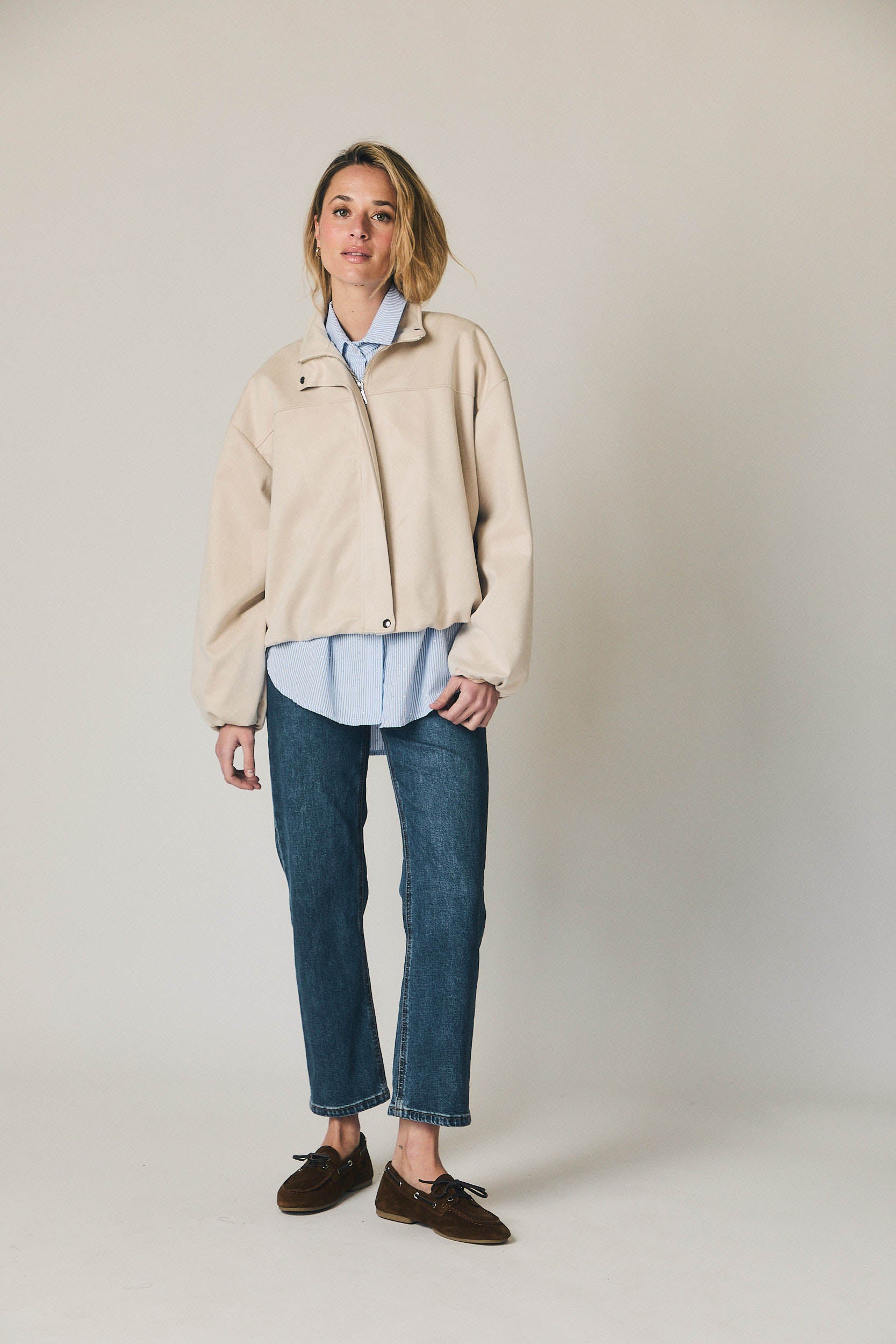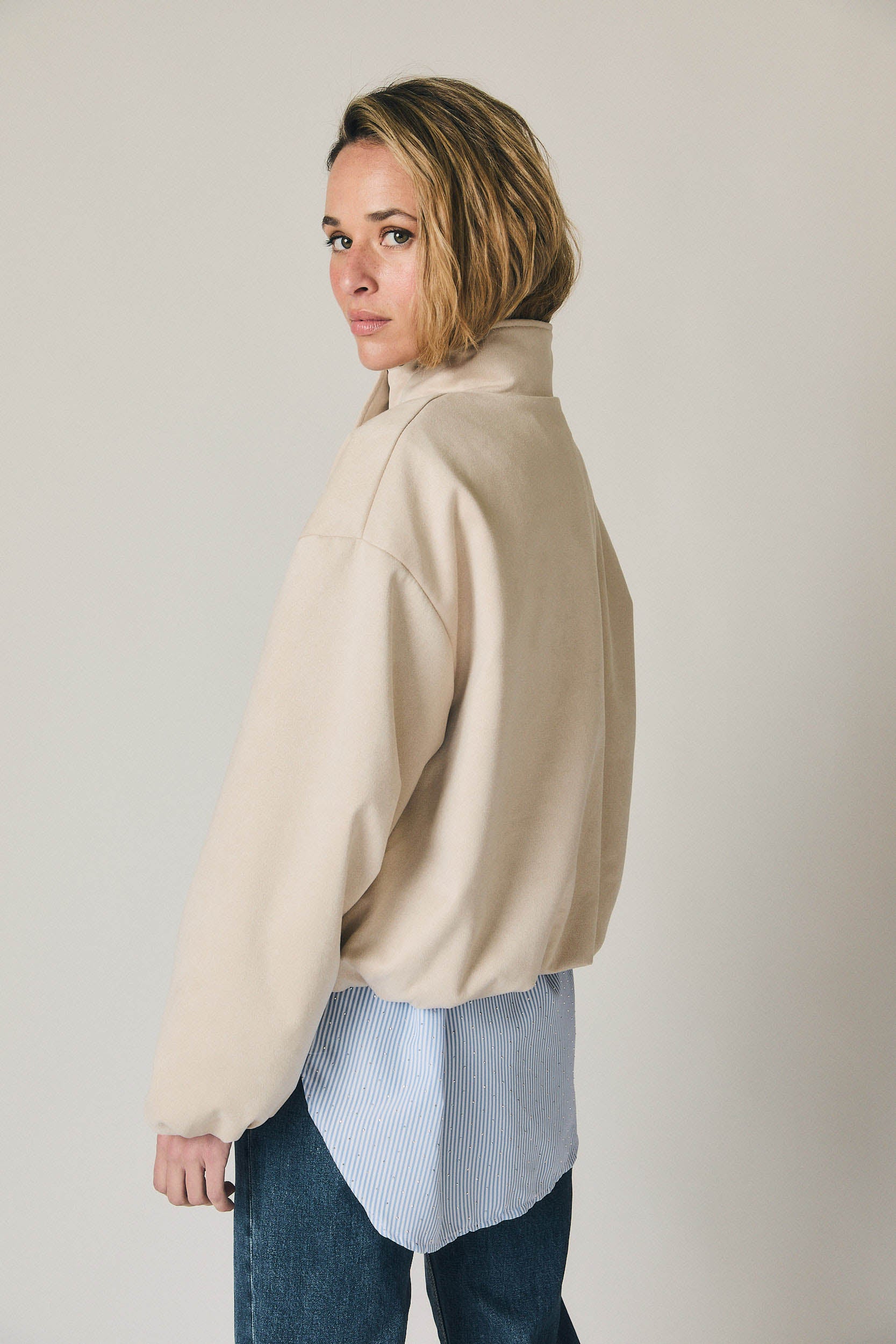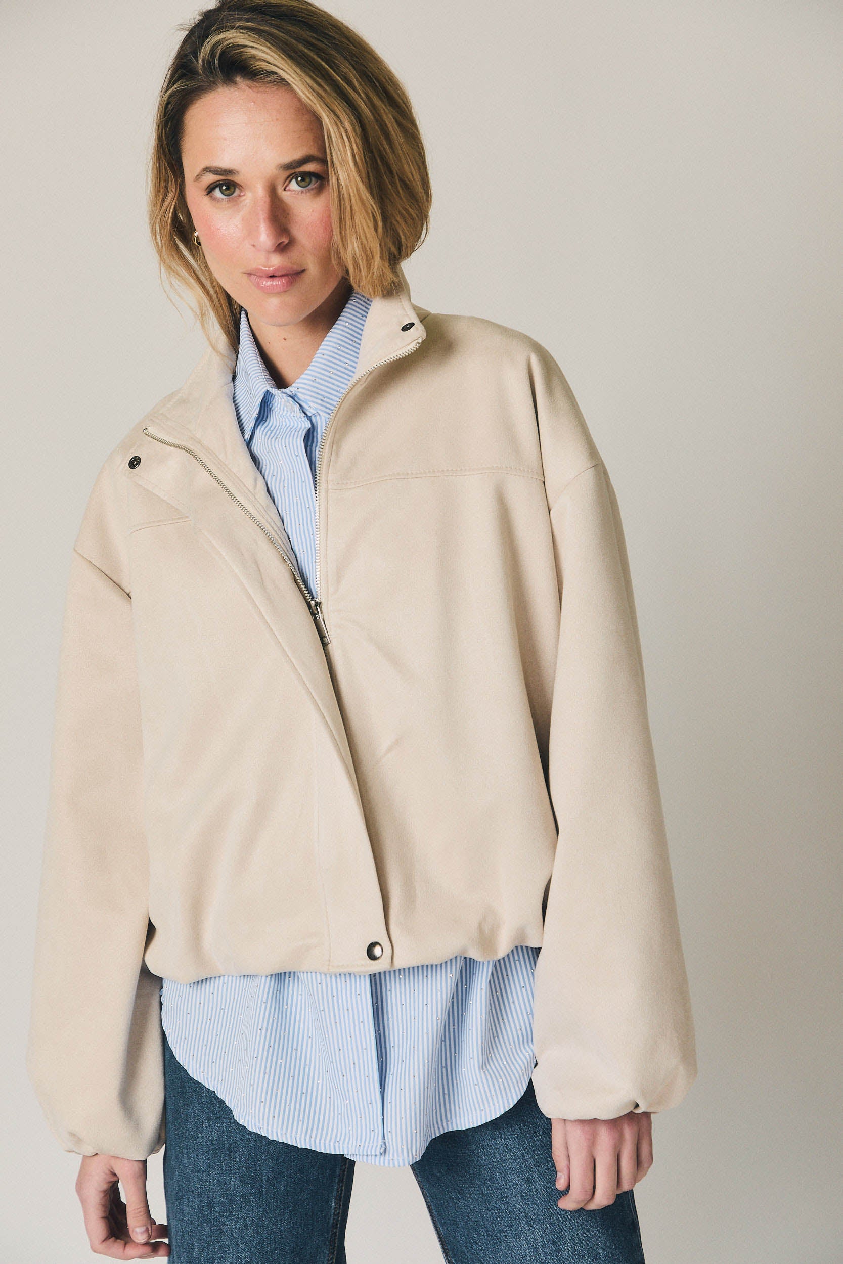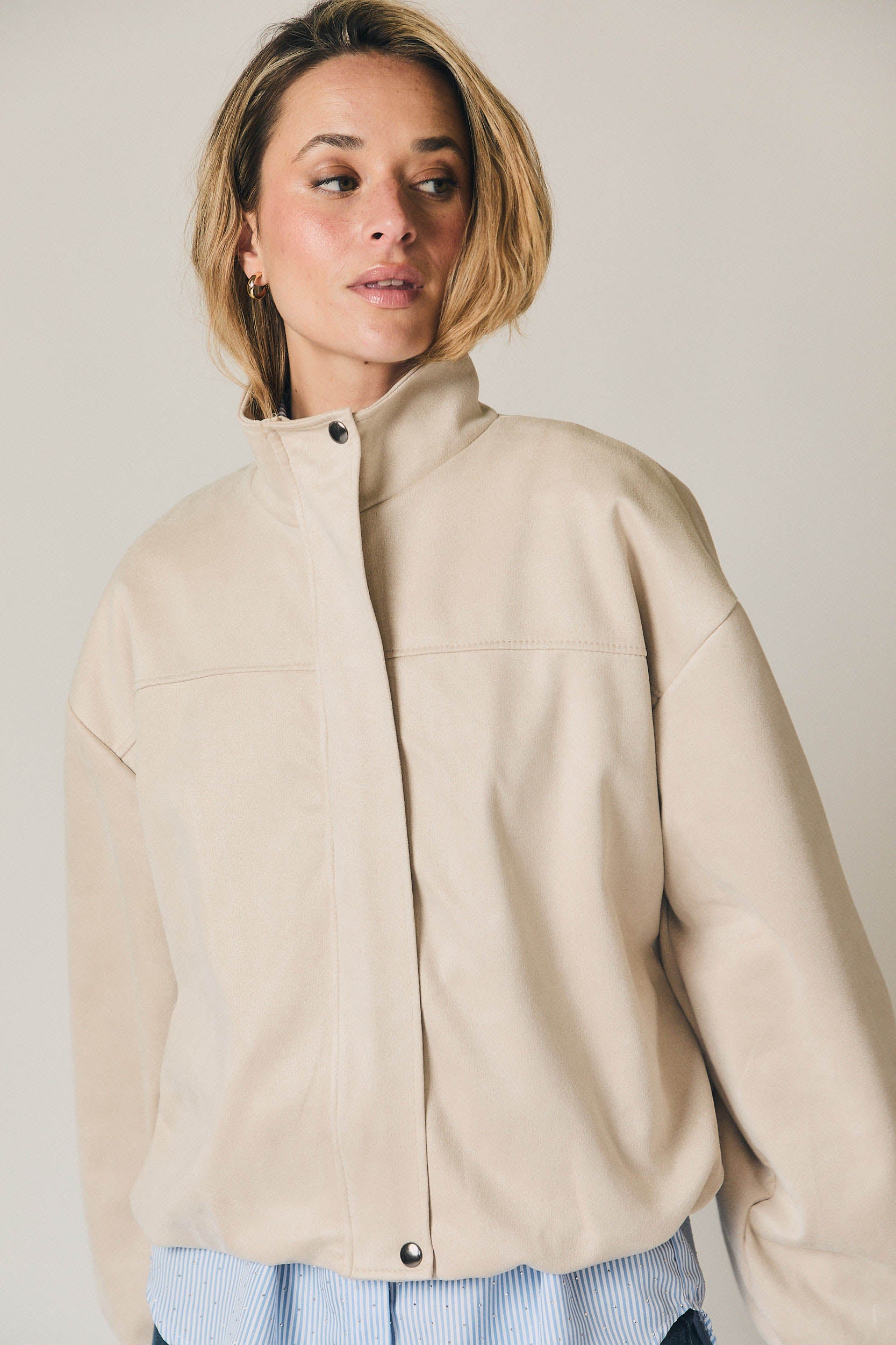 Chaqueta en tono beige con acabado efecto ante, de tacto suave y aspecto elegante. Presenta cuello subido y cierre frontal oculto con botón a presión, aportando una línea limpia y minimal. Destaca por su manga larga ligeramente abullonada, que añade volumen y carácter al diseño sin perder equilibrio. Bajo elástico que define la silueta y favorece el ajuste.