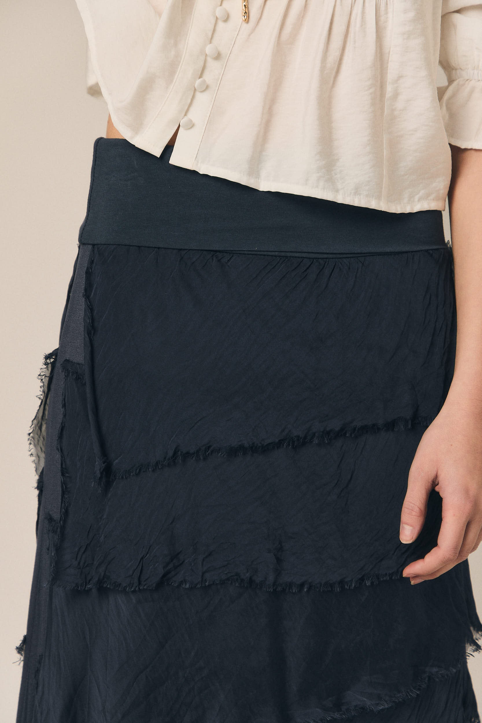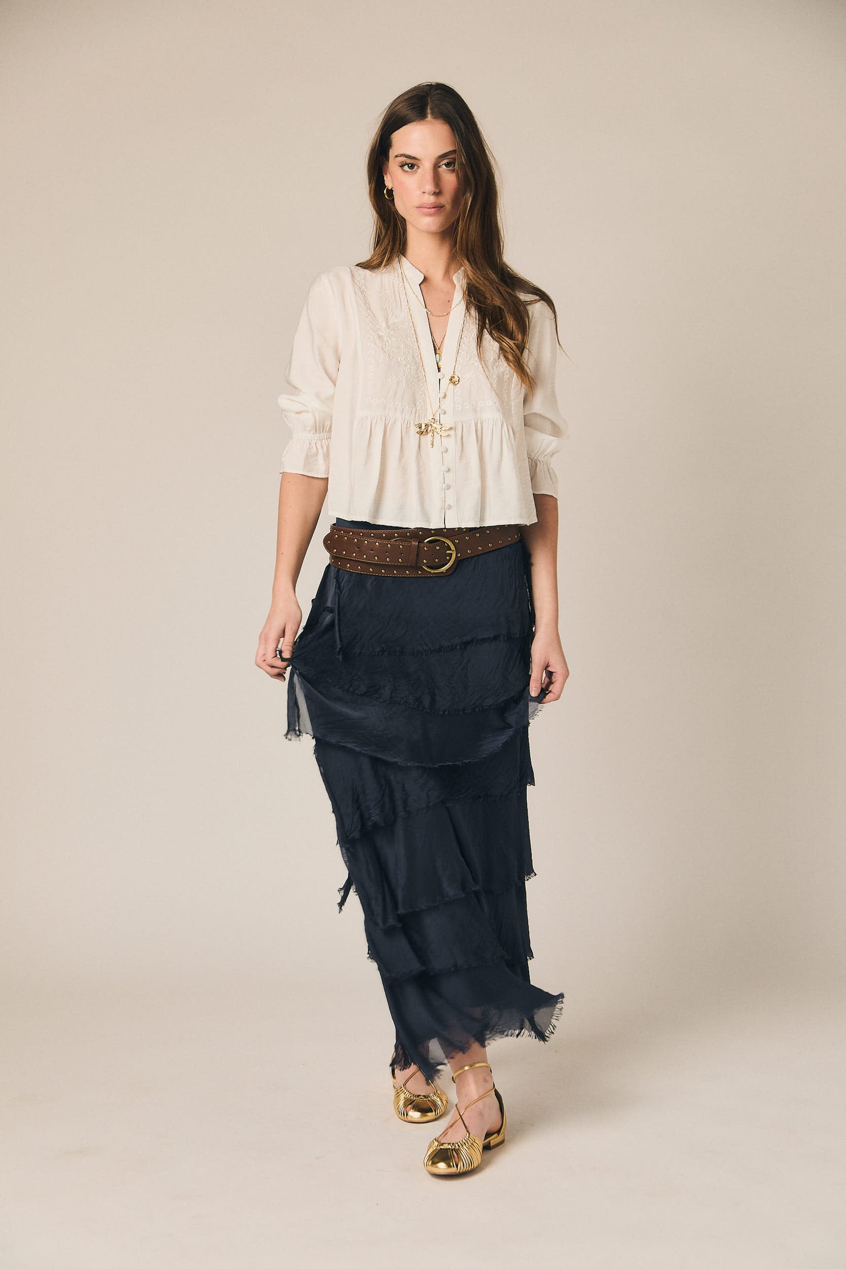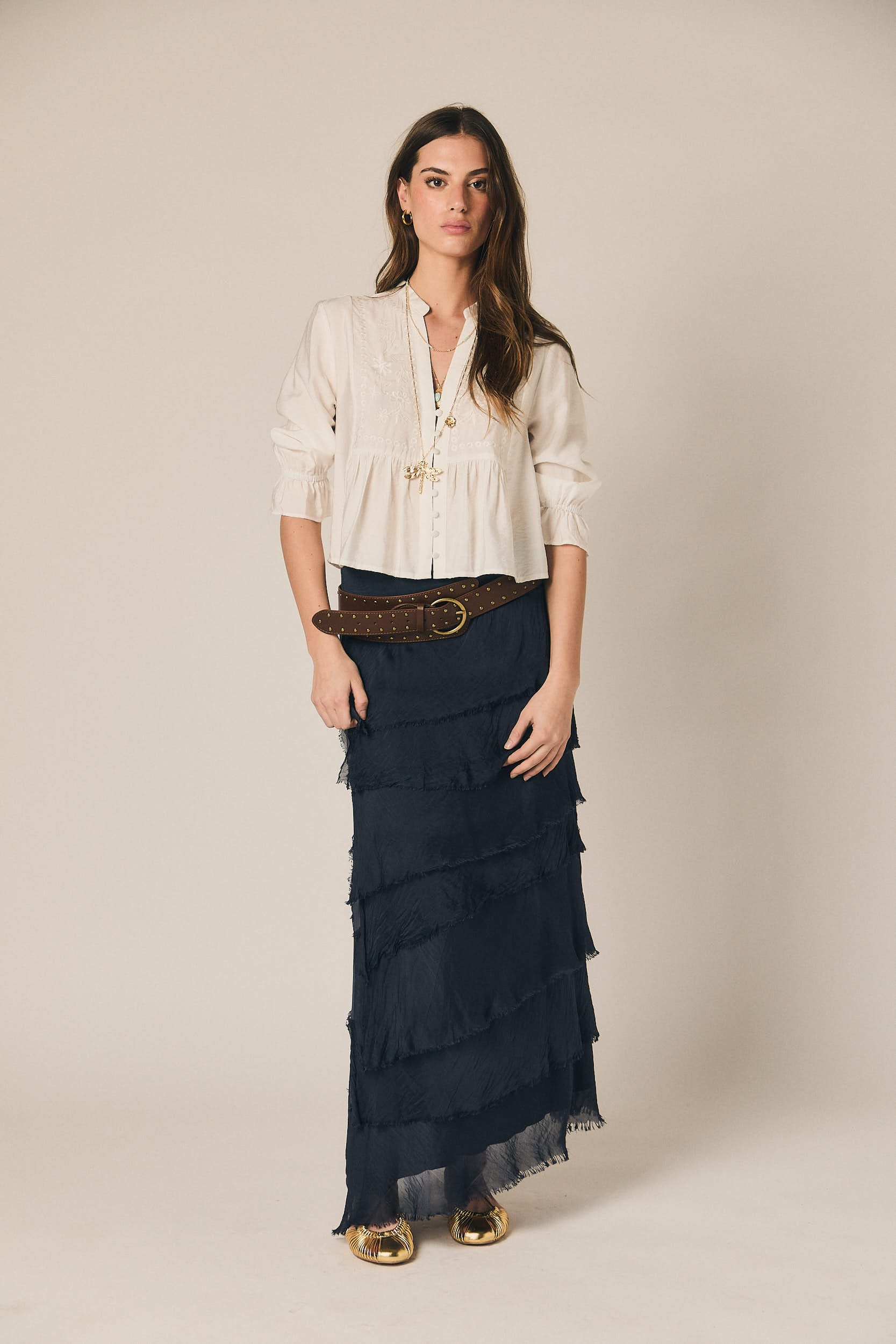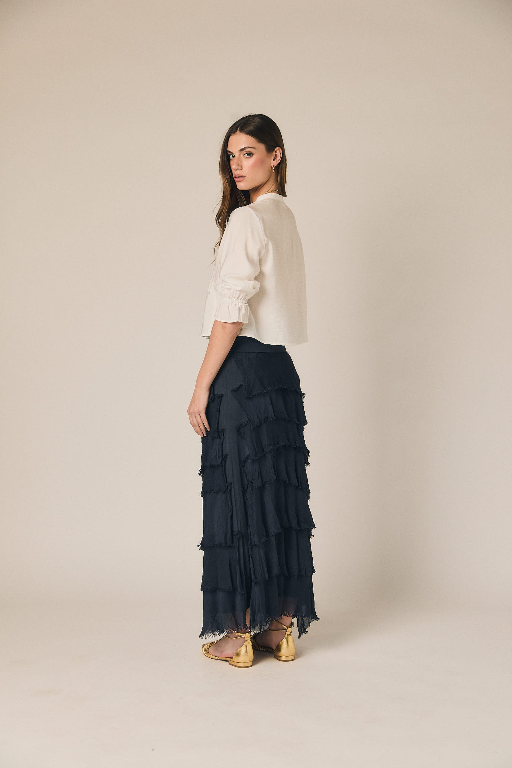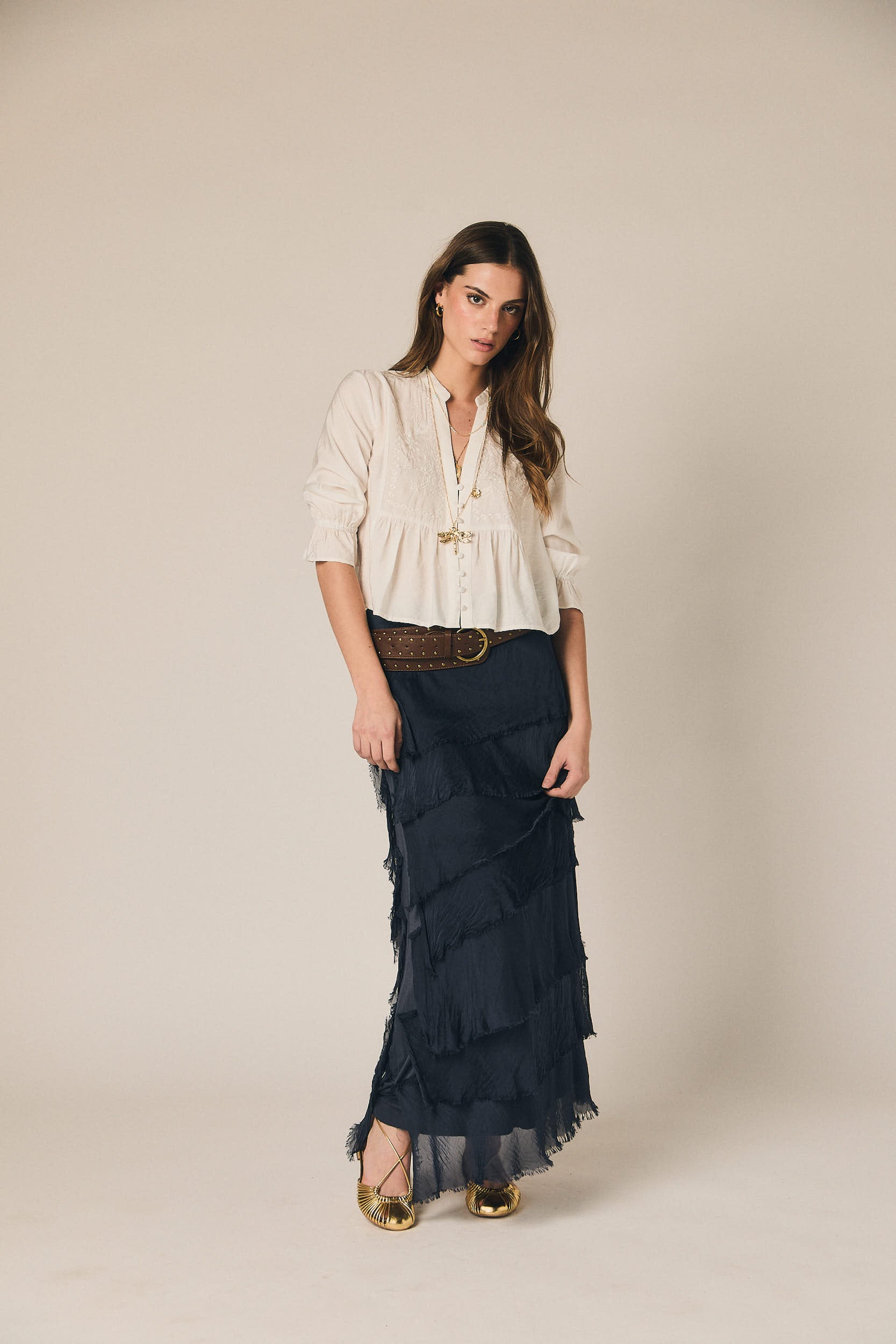 Falda larga de tejido ligero con diseño de volantes superpuestos que aportan movimiento y textura. Presenta cintura amplia con acabado elástico que se adapta cómodamente a la silueta. Su largo fluido crea una caída natural.