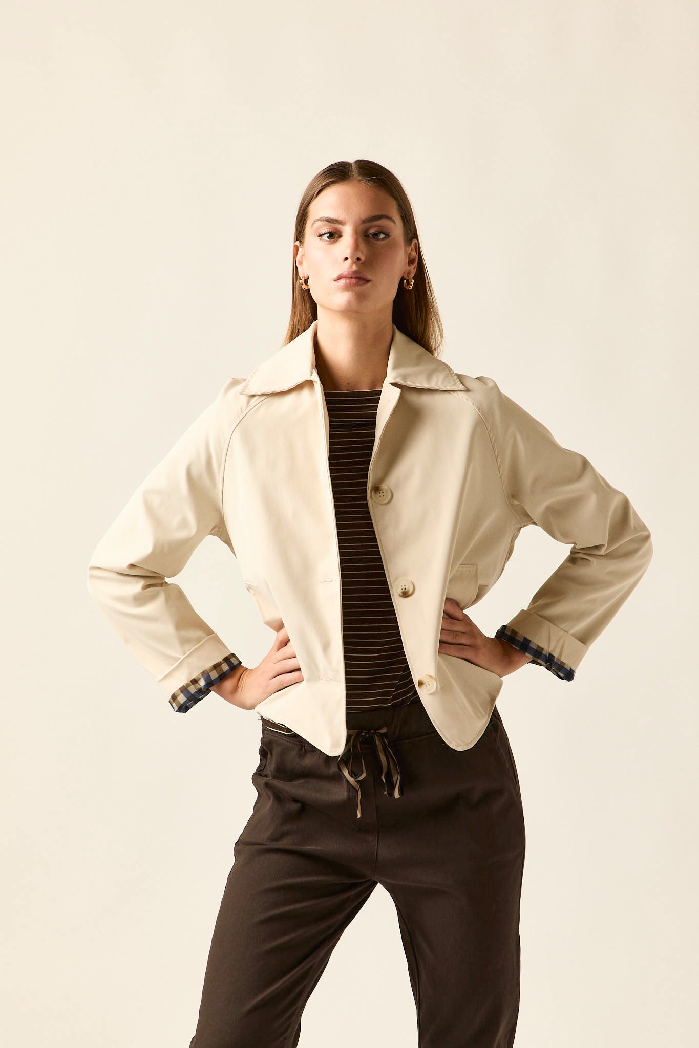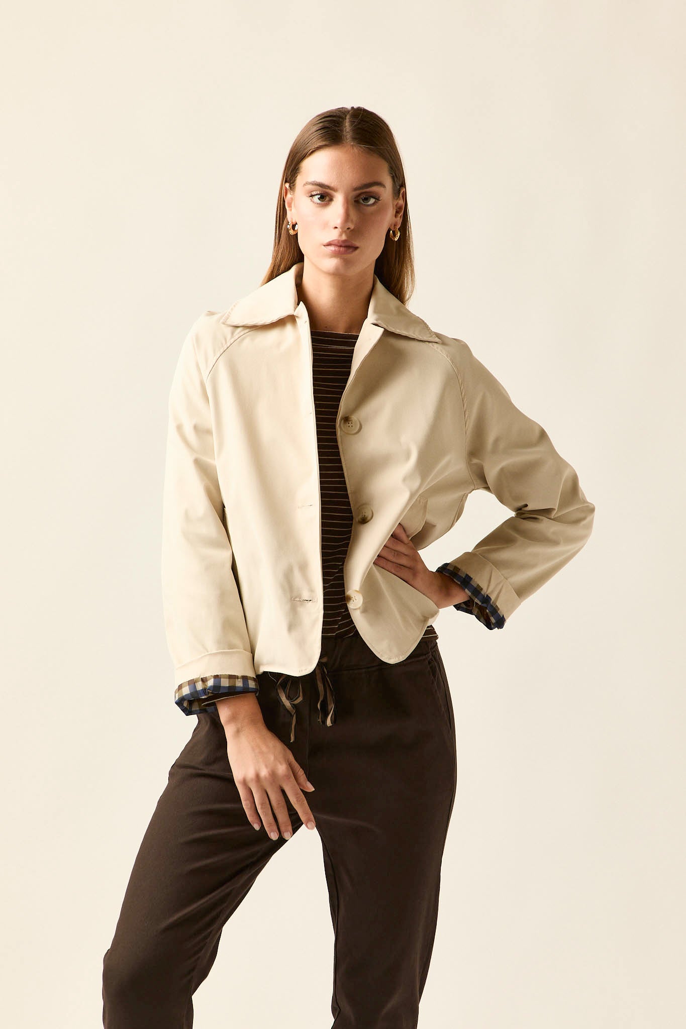 Gabardina corta en color beige con cierre frontal de botones grandes en contraste. Presenta cuello de solapa clásico, bolsillos laterales discretos y detalle de forro interior en estampado de cuadros que aporta un guiño especial al diseño. Su silueta recta y ligera la convierte en una prenda versátil para entretiempo.