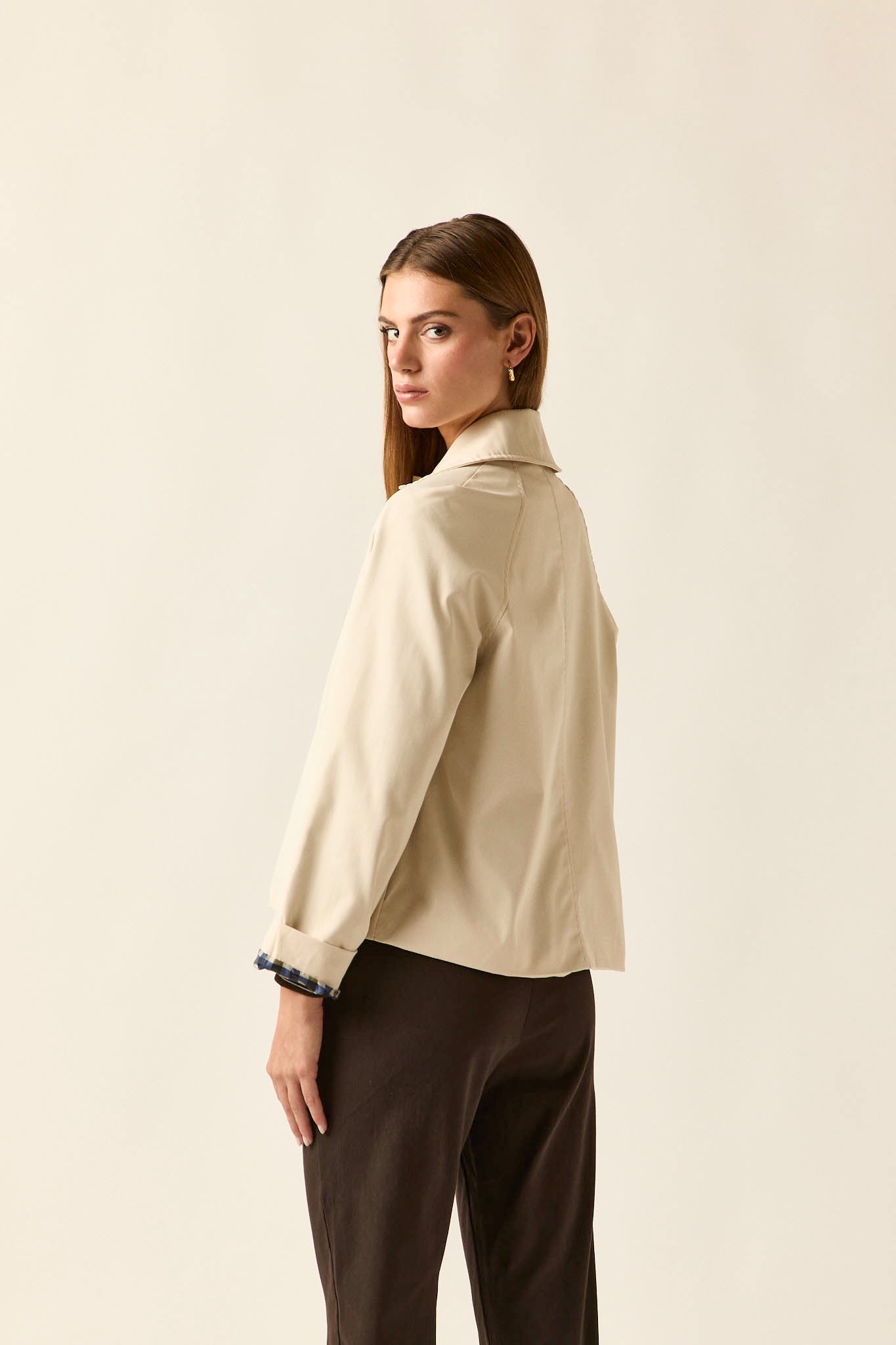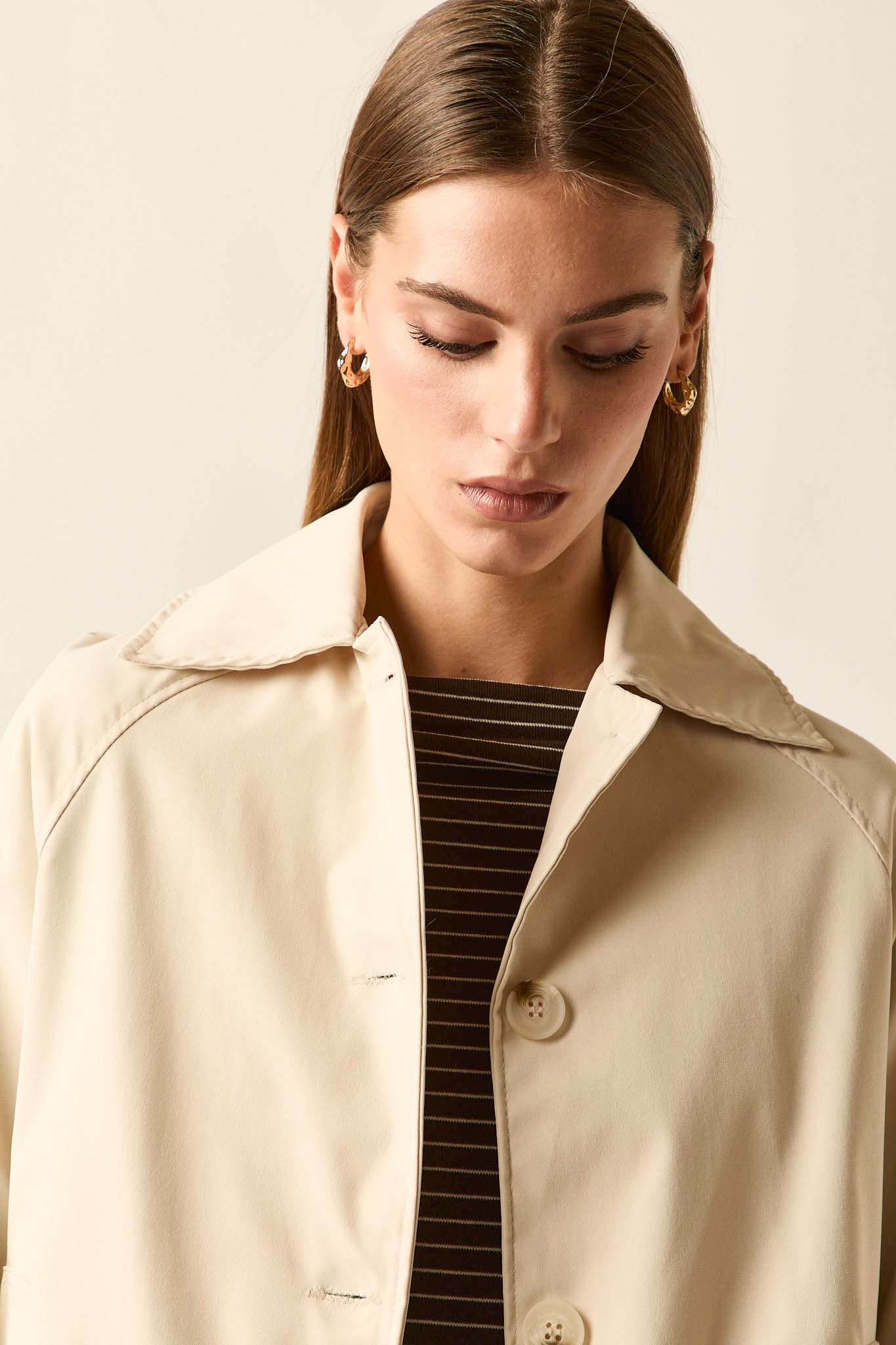 • Gabardina corta en tono beige