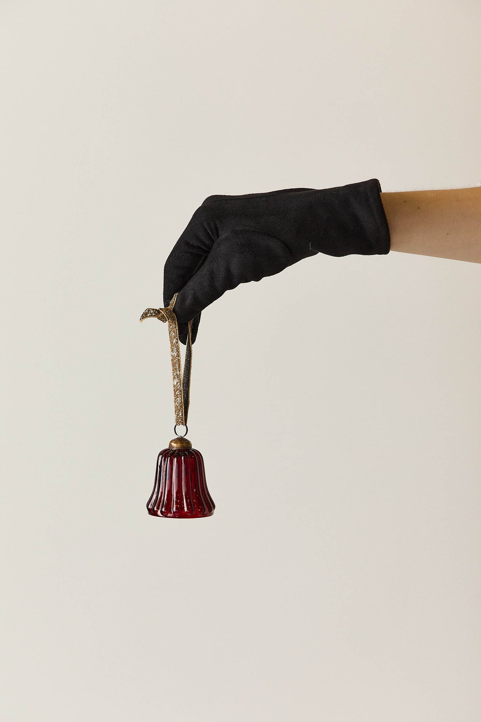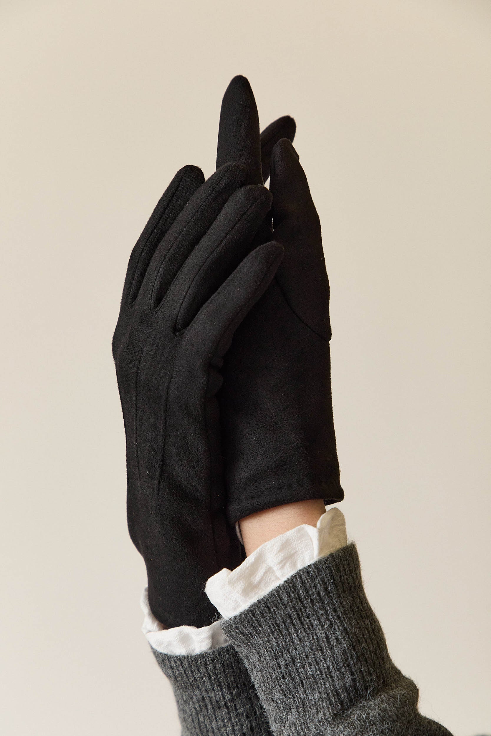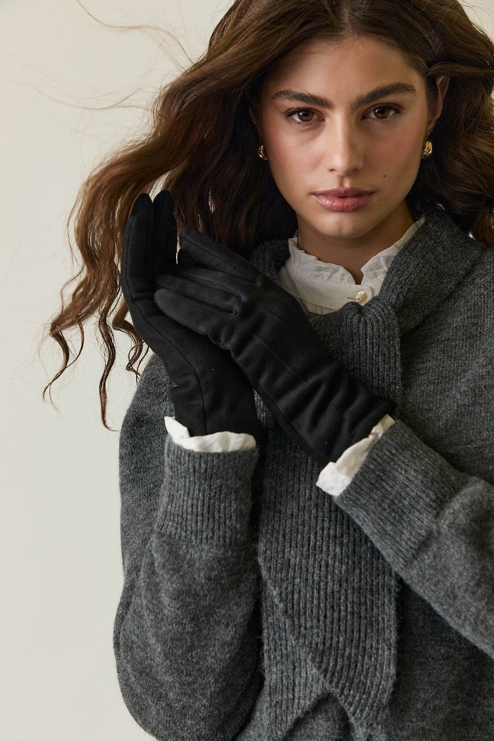 Guantes de ante en tono negro con acabado suave y líneas marcadas en la parte superior que estilizan la mano. Tienen un diseño fino, cómodo y ligeramente ajustado, pensado para acompañarte en los días fríos con un toque elegante y muy combinable.