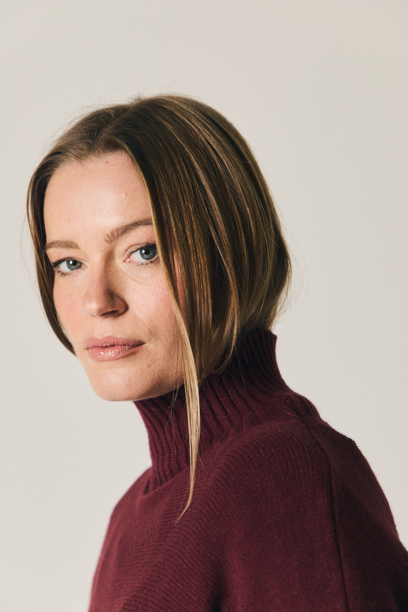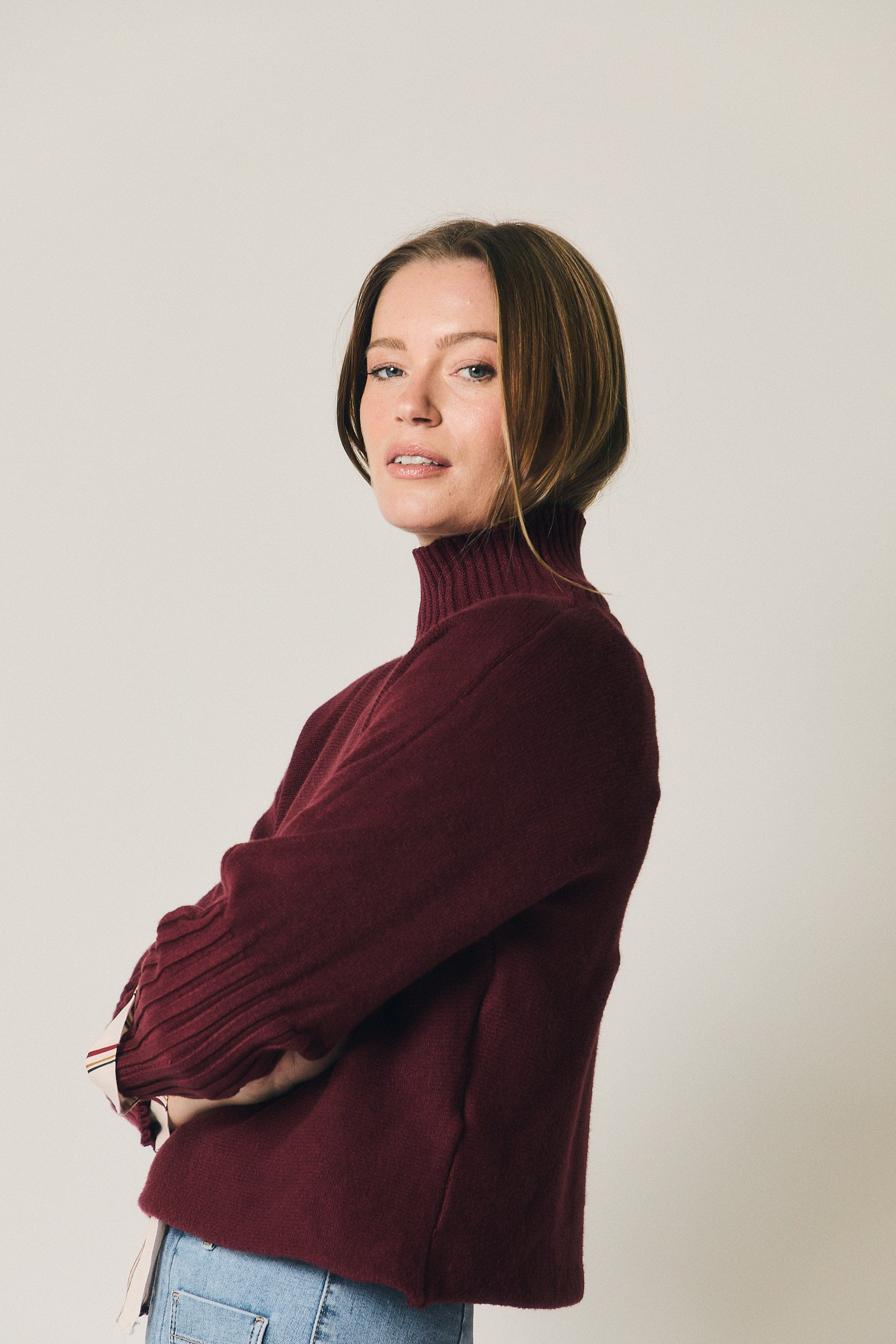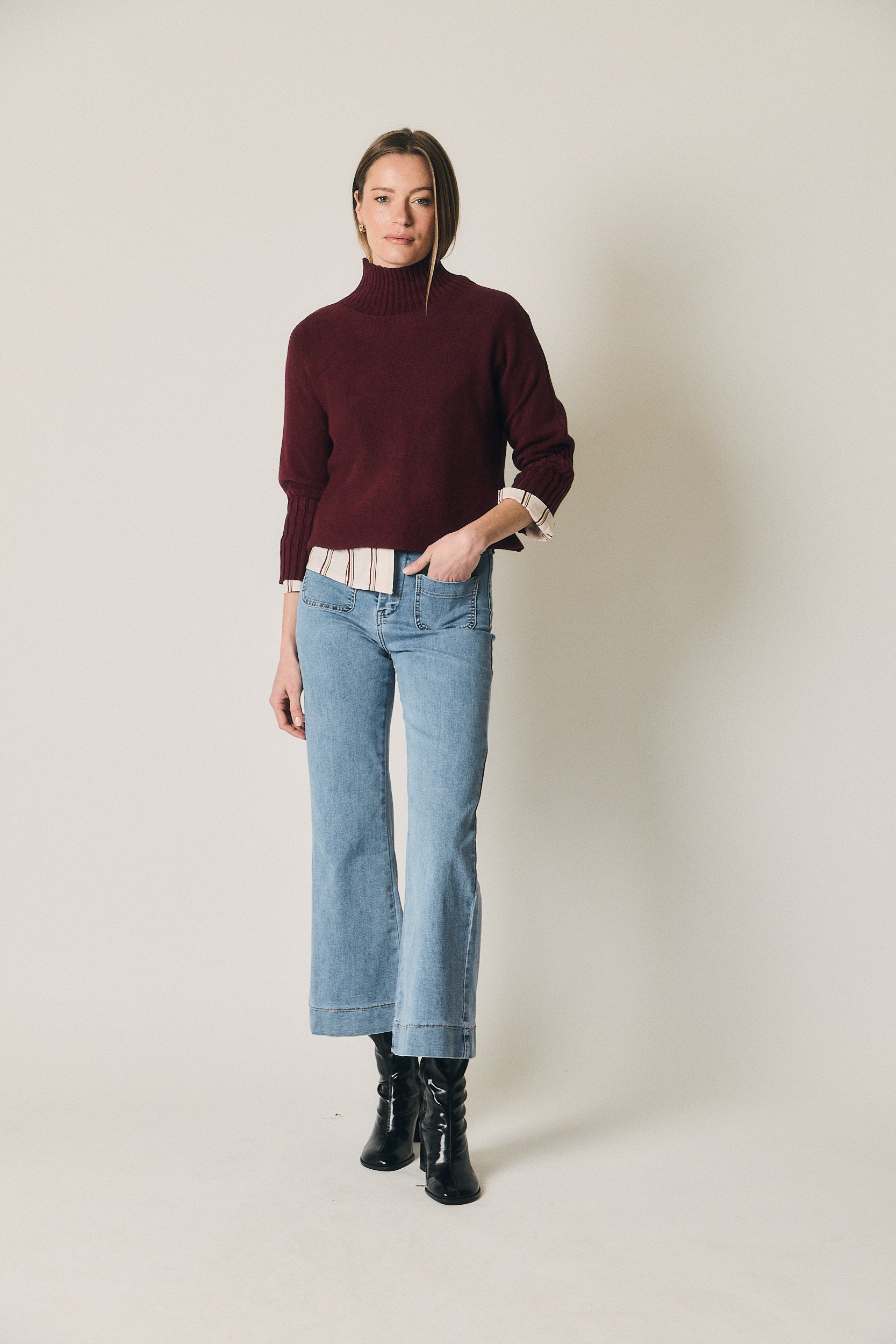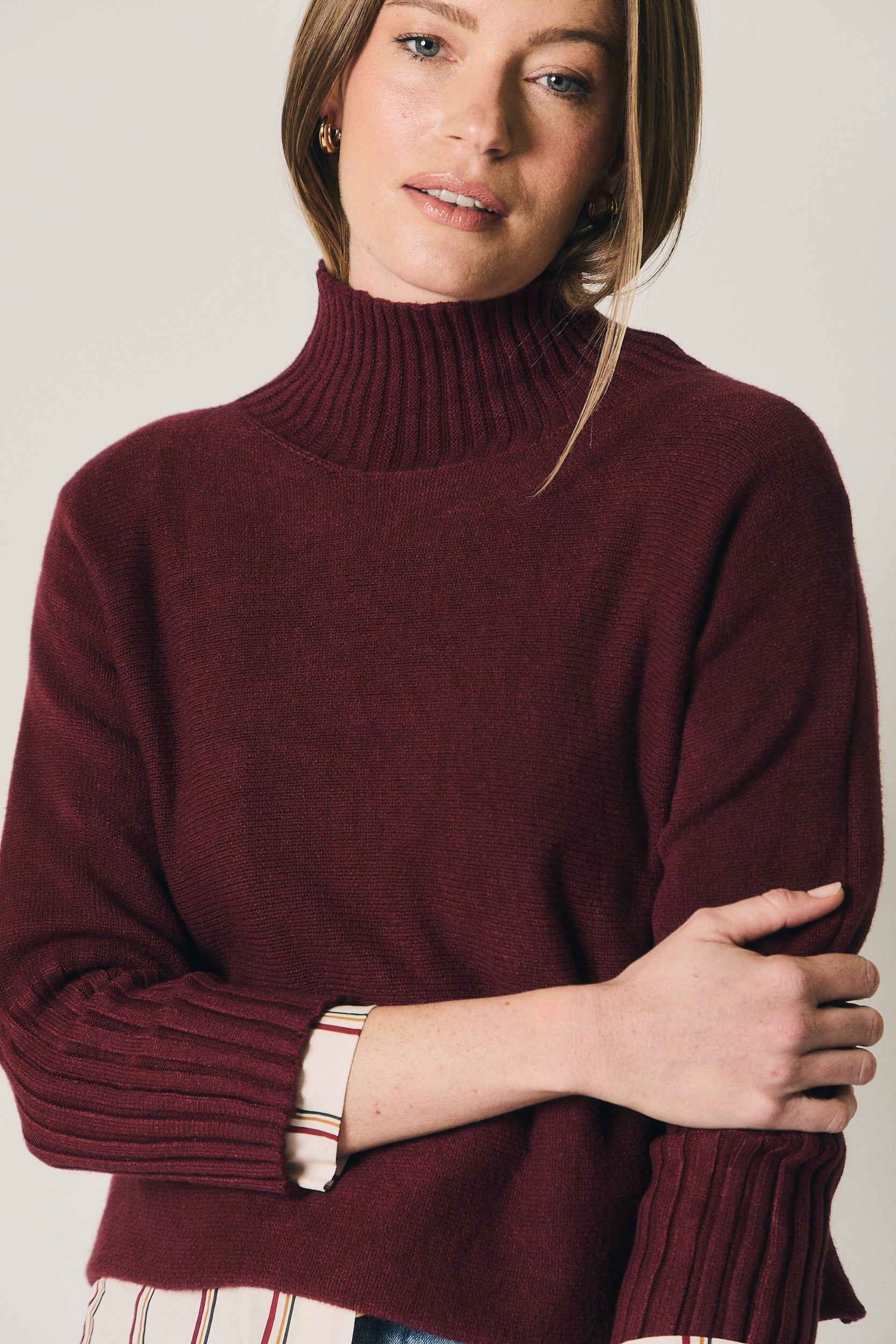 Jersey en tono vino de corte recto y silueta relajada. Presenta cuello alto con acabado en canalé y mangas largas con el mismo detalle, que aportan estructura y contraste al diseño liso del cuerpo. El bajo recto y la caída natural lo convierten en una prenda cómoda y fácil de integrar en el armario diario.