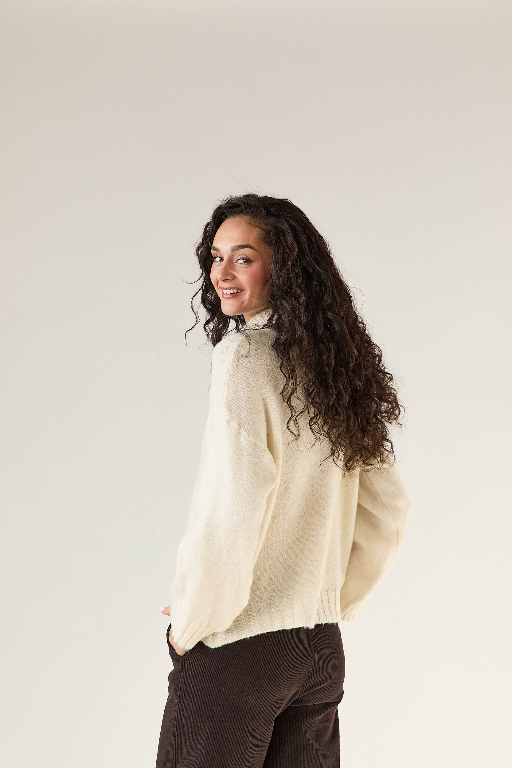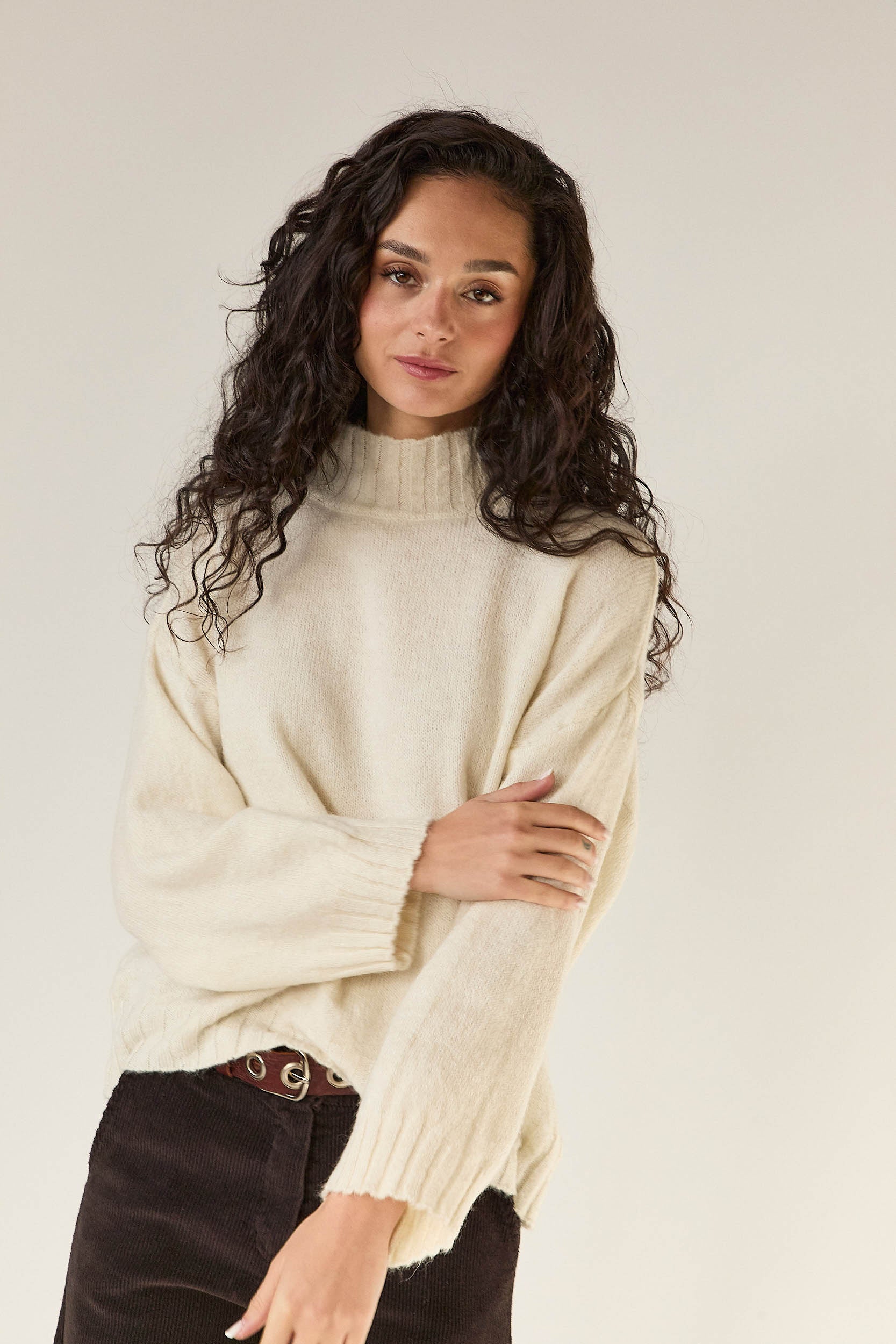 Jersey de punto en tono crudo, con corte recto y silueta relajada. Presenta cuello perkins ligeramente subido, manga larga y hombro caído que aporta un aire más desenfadado al diseño. Los acabados en puños y bajo mantienen la forma y aportan equilibrio al conjunto.