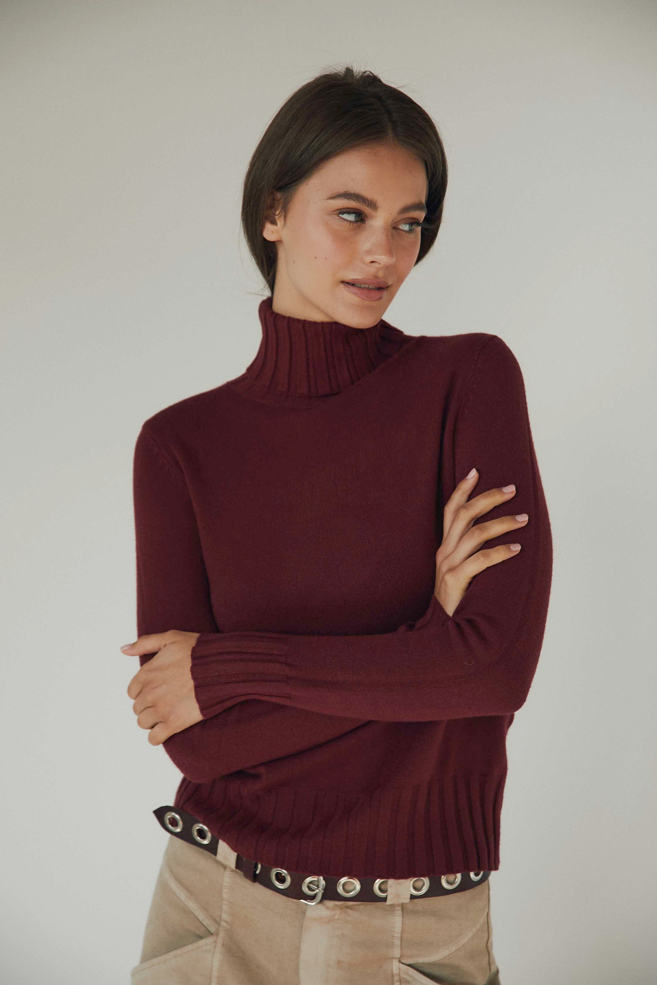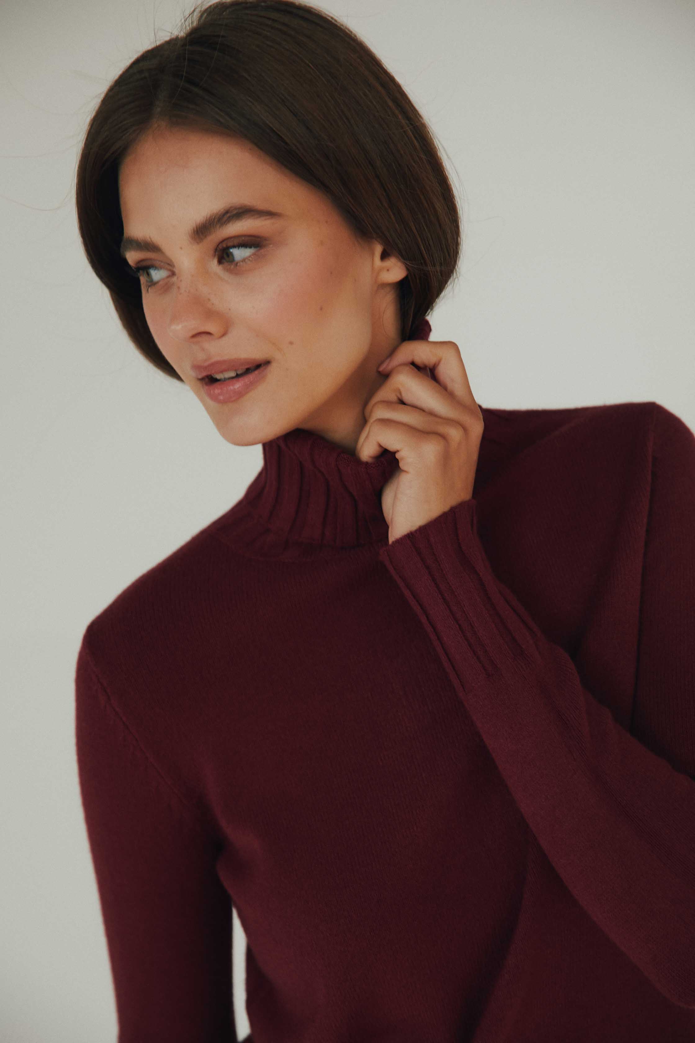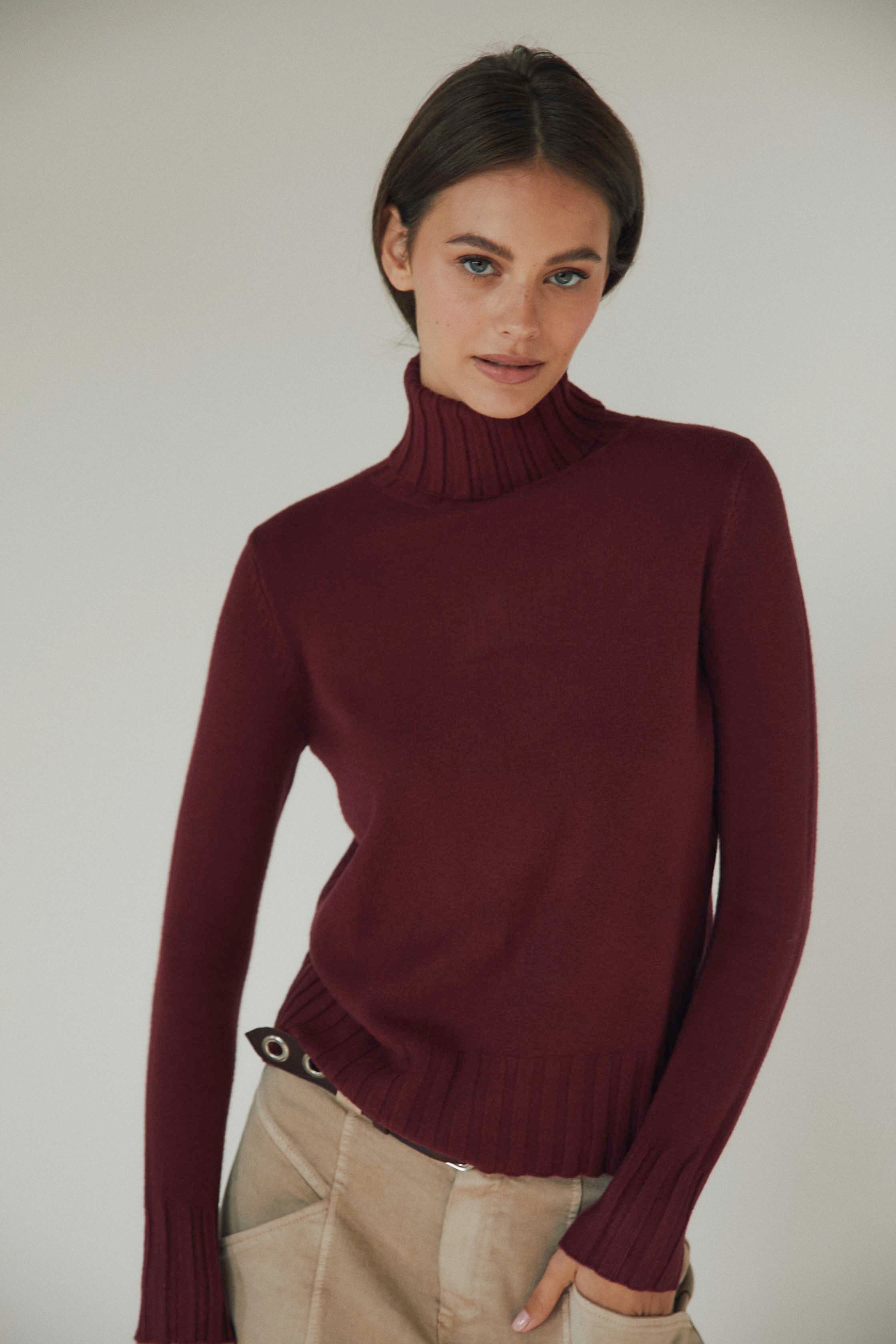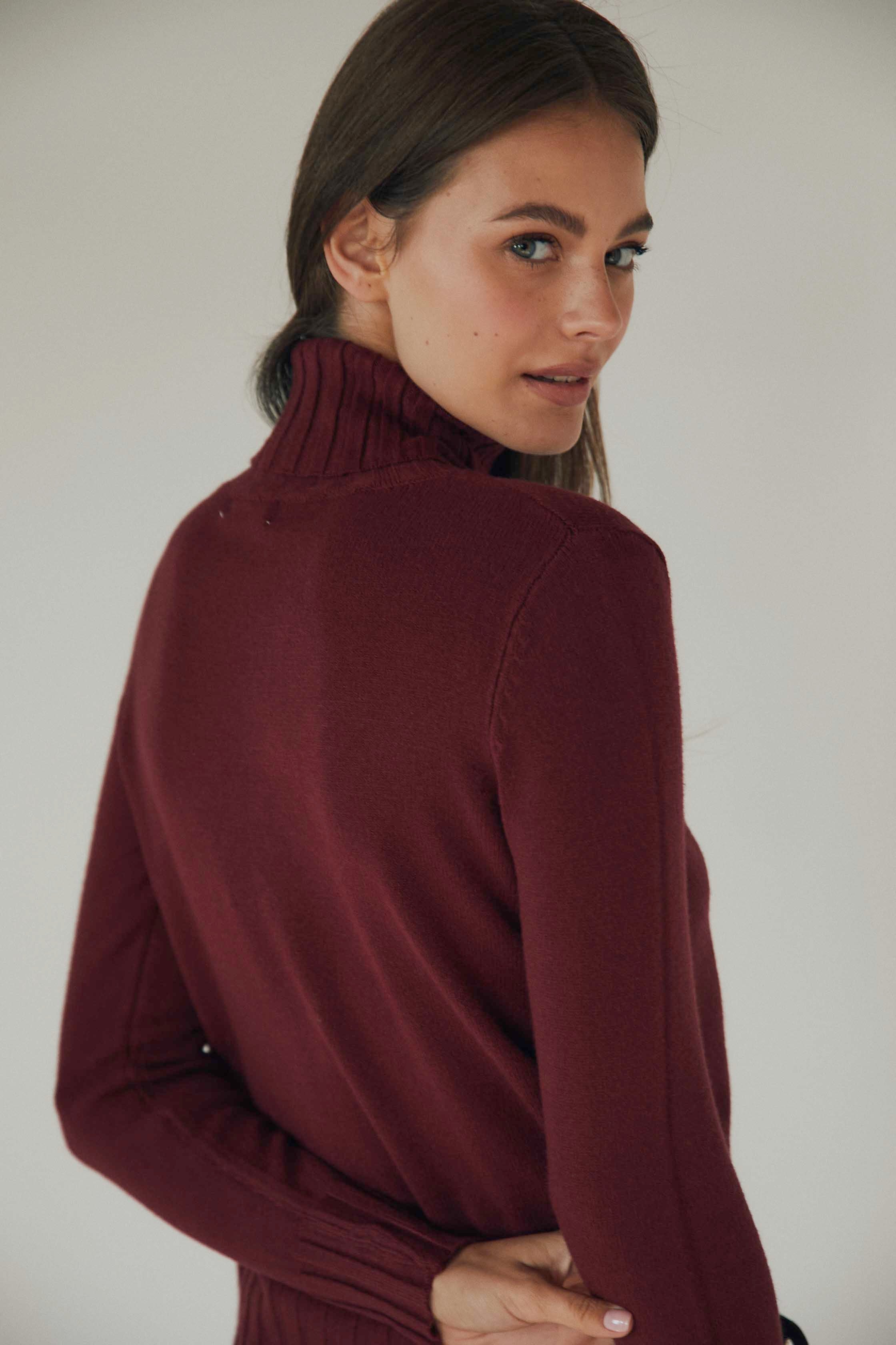 Jersey de punto en tono granate con cuello vuelto acanalado y acabado suave. La silueta es ajustada y limpia, con puños y bajo en canalé que aportan un toque estructurado. Una prenda cálida y favorecedora que añade un punto de color sofisticado a los looks de invierno.