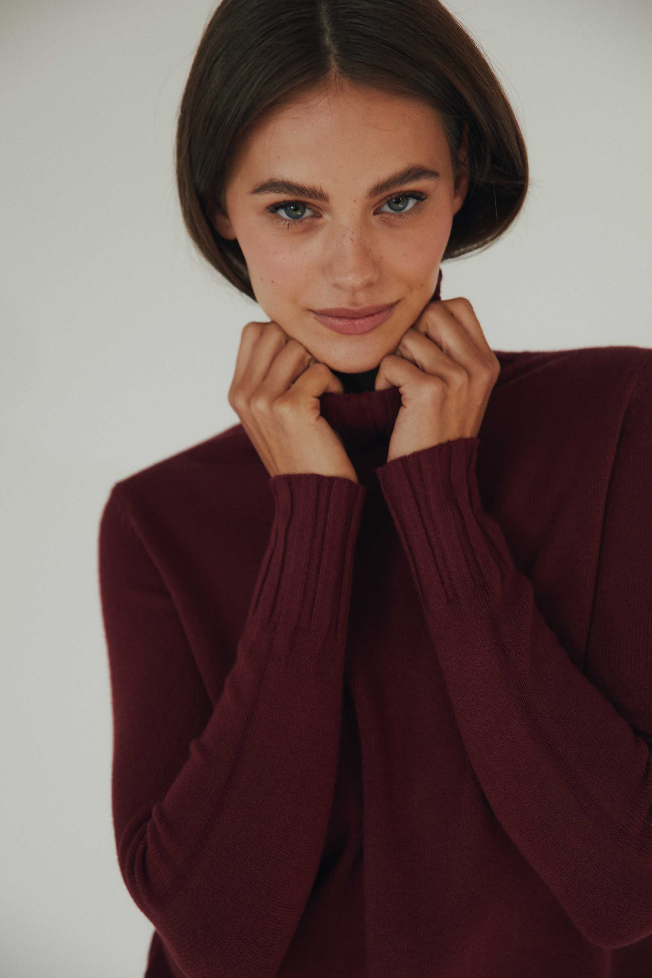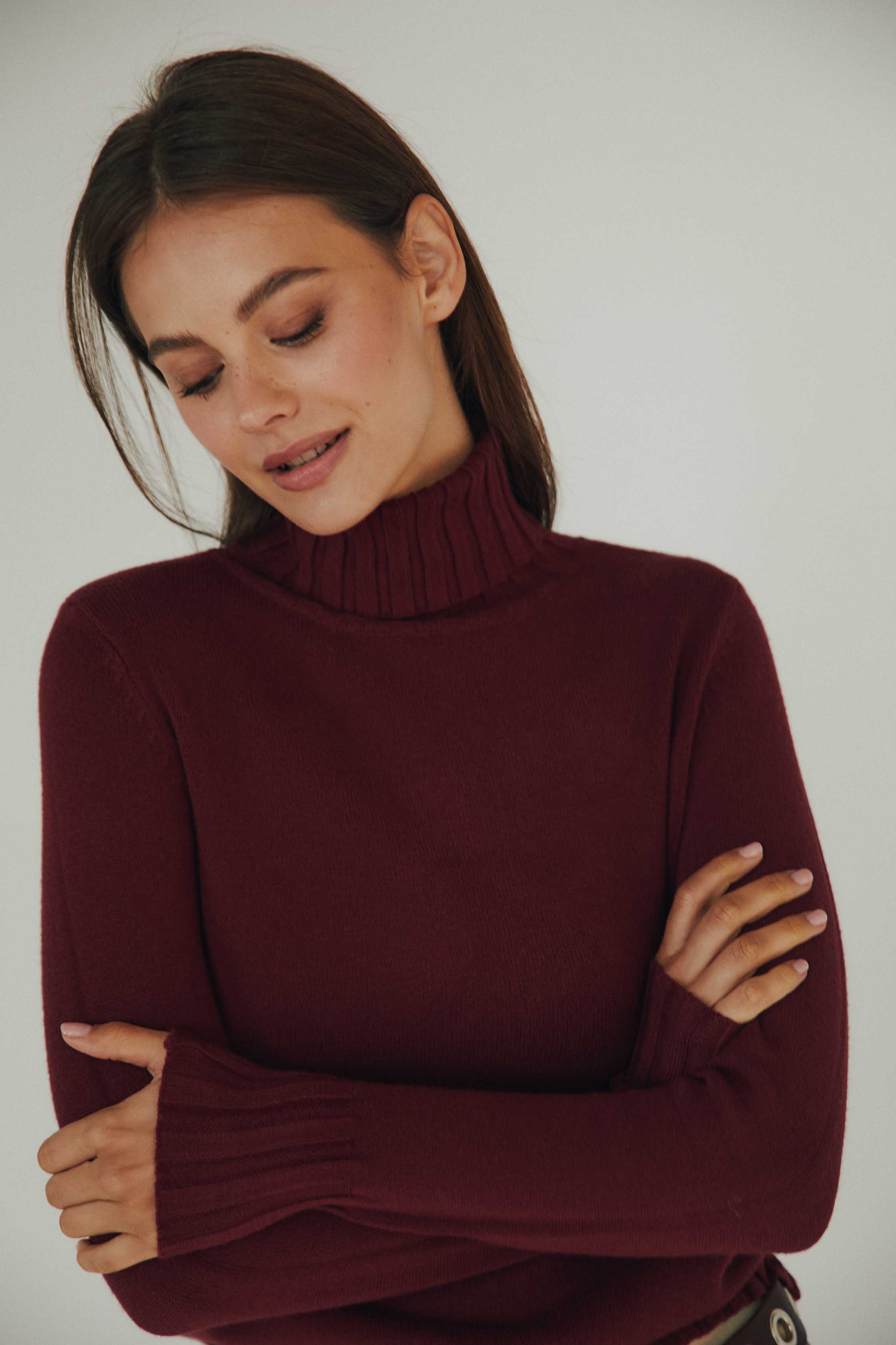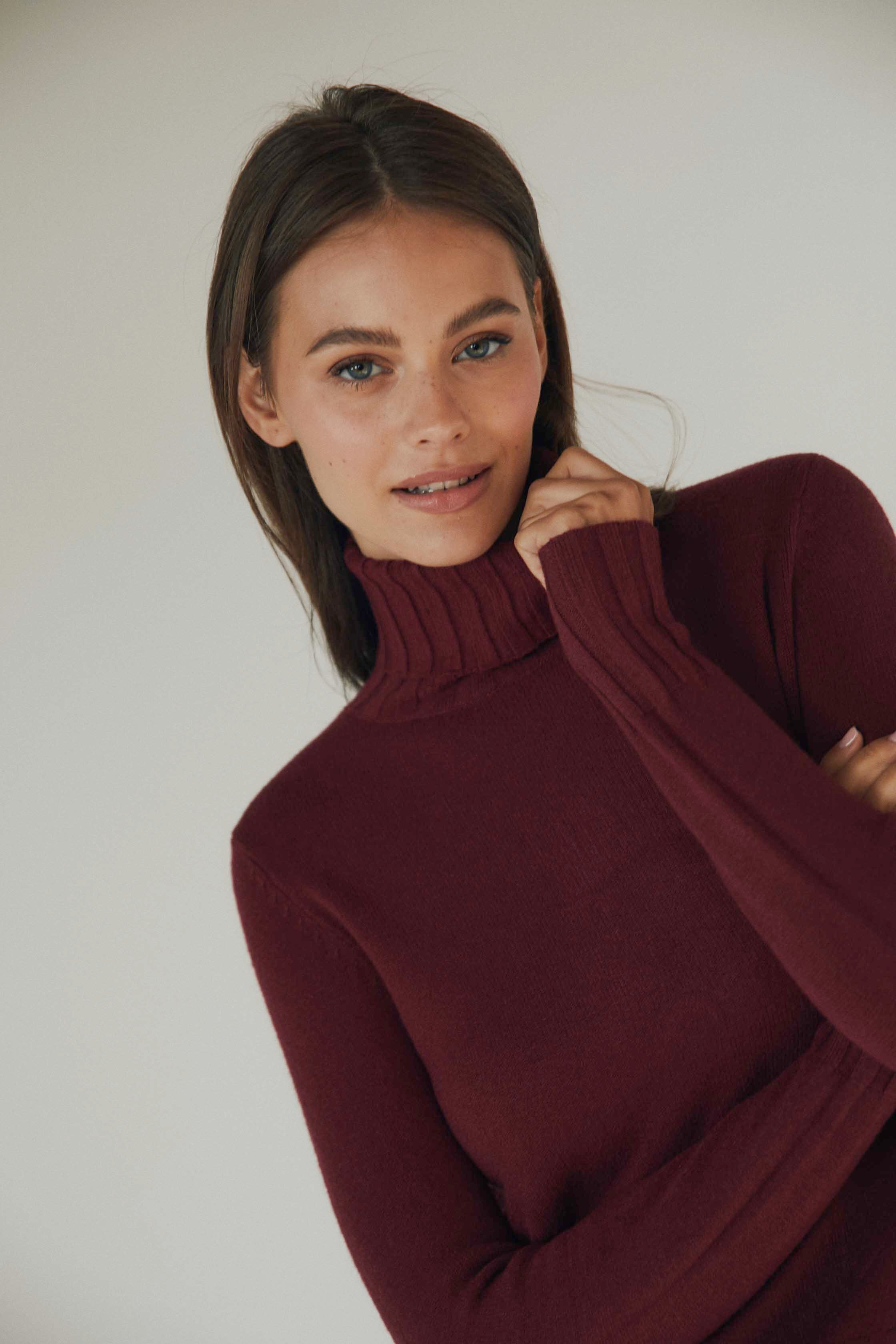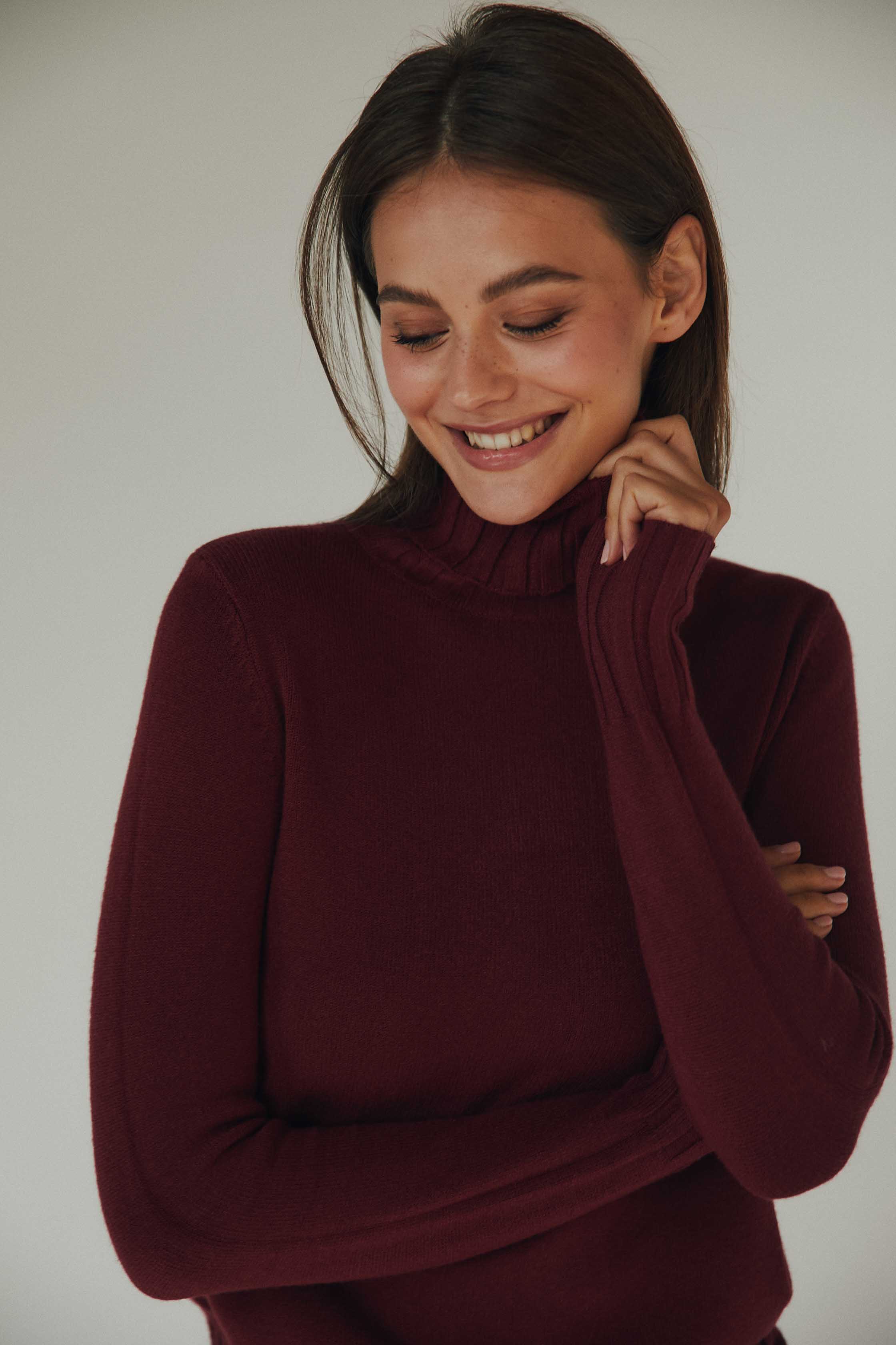 Jersey de punto en tono granate con cuello vuelto acanalado y acabado suave. La silueta es ajustada y limpia, con puños y bajo en canalé que aportan un toque estructurado. Una prenda cálida y favorecedora que añade un punto de color sofisticado a los looks de invierno.