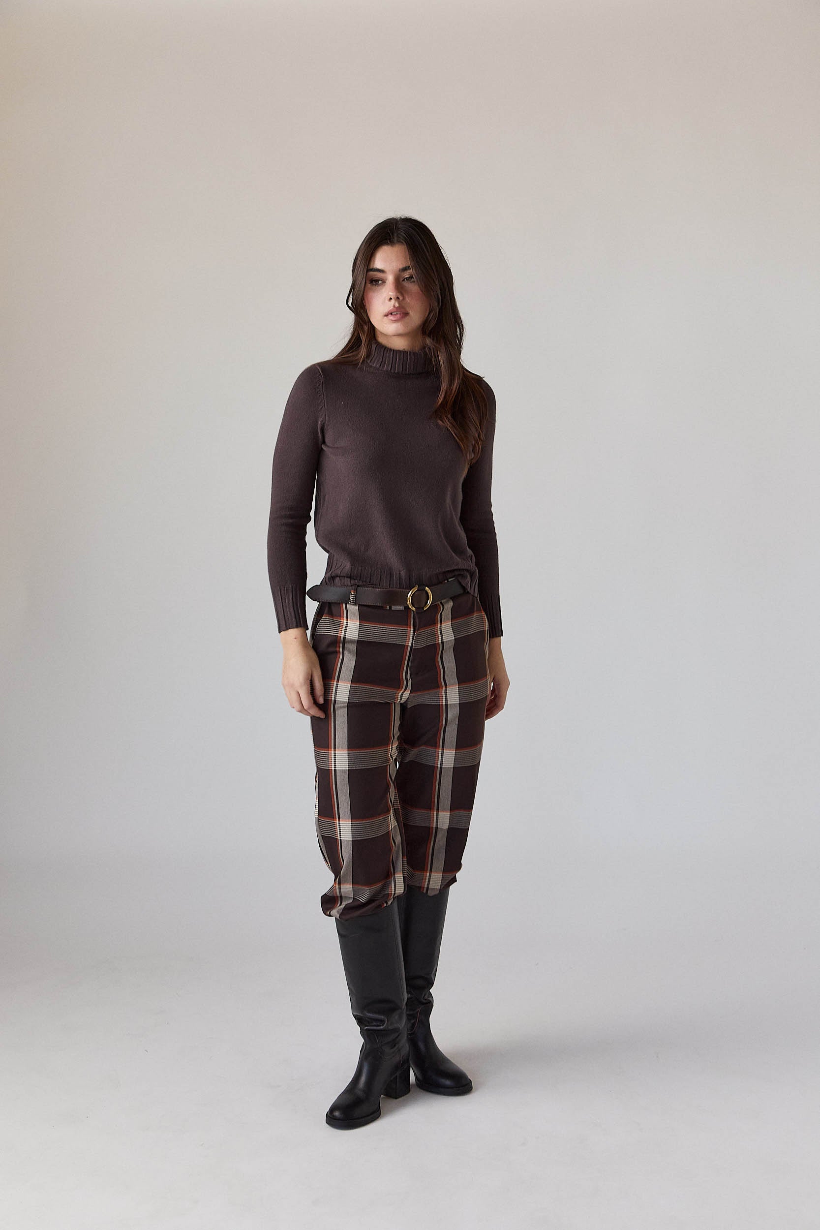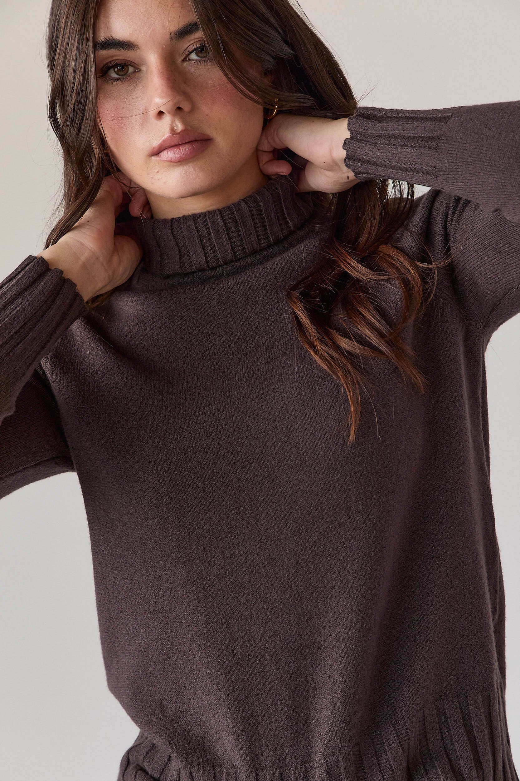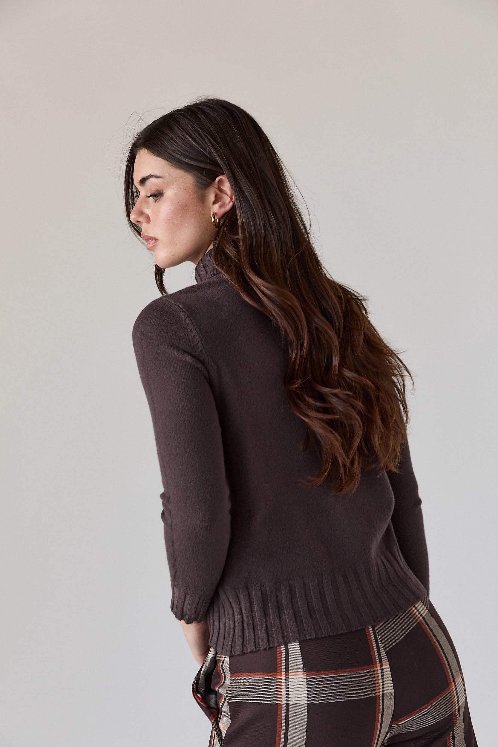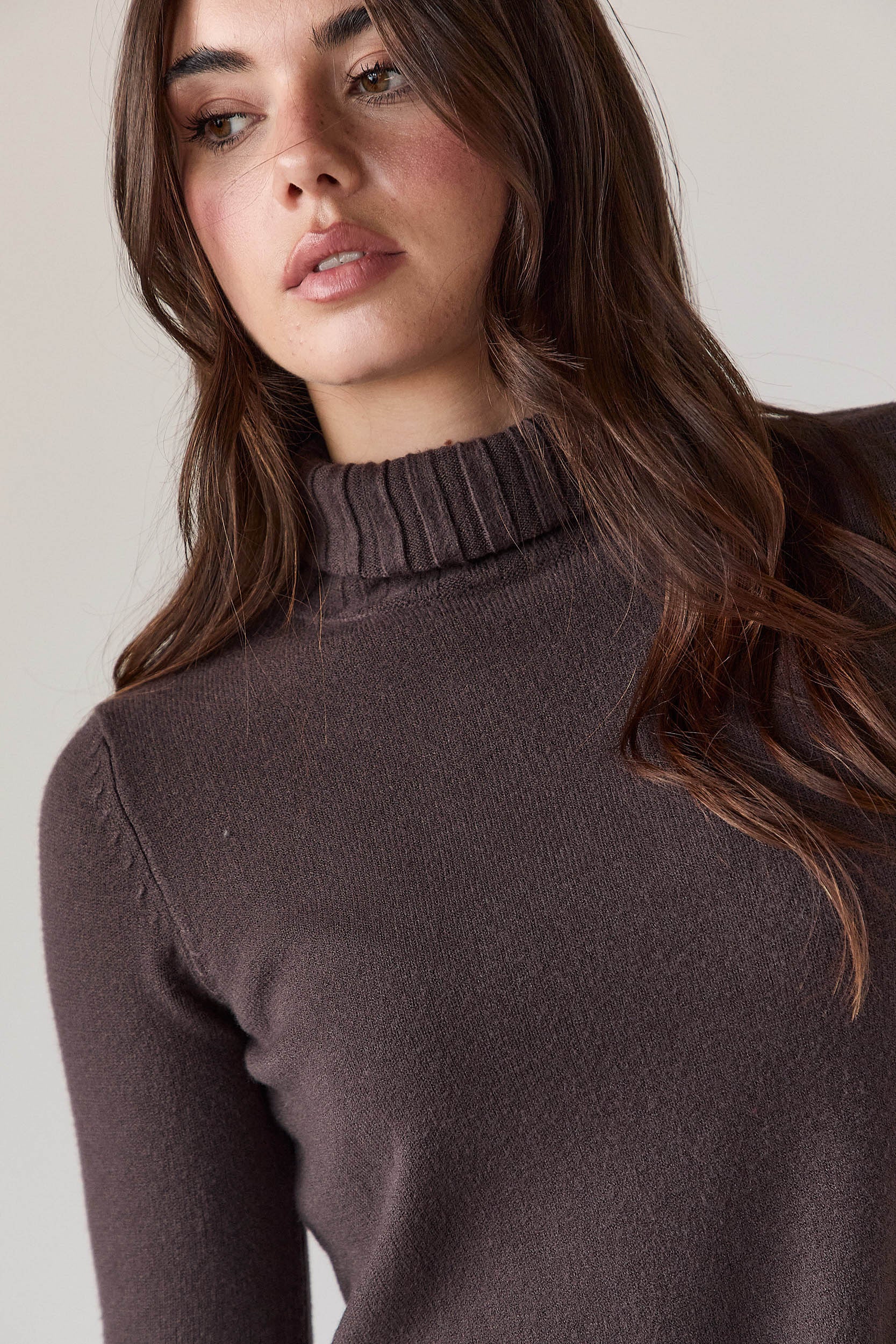 Jersey de punto en tono marrón con cuello vuelto acanalado y acabado suave. Su silueta es ajustada y limpia, con puños y bajo también en canalé que aportan un toque estructurado. Un básico cálido y versátil, perfecto para acompañarte durante toda la temporada.
