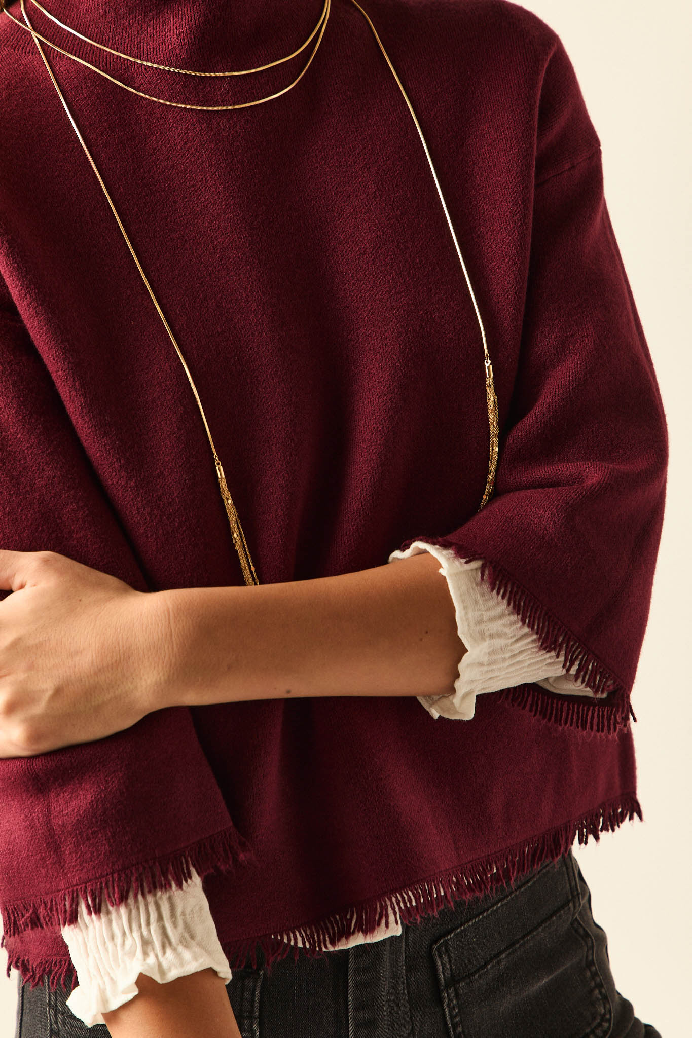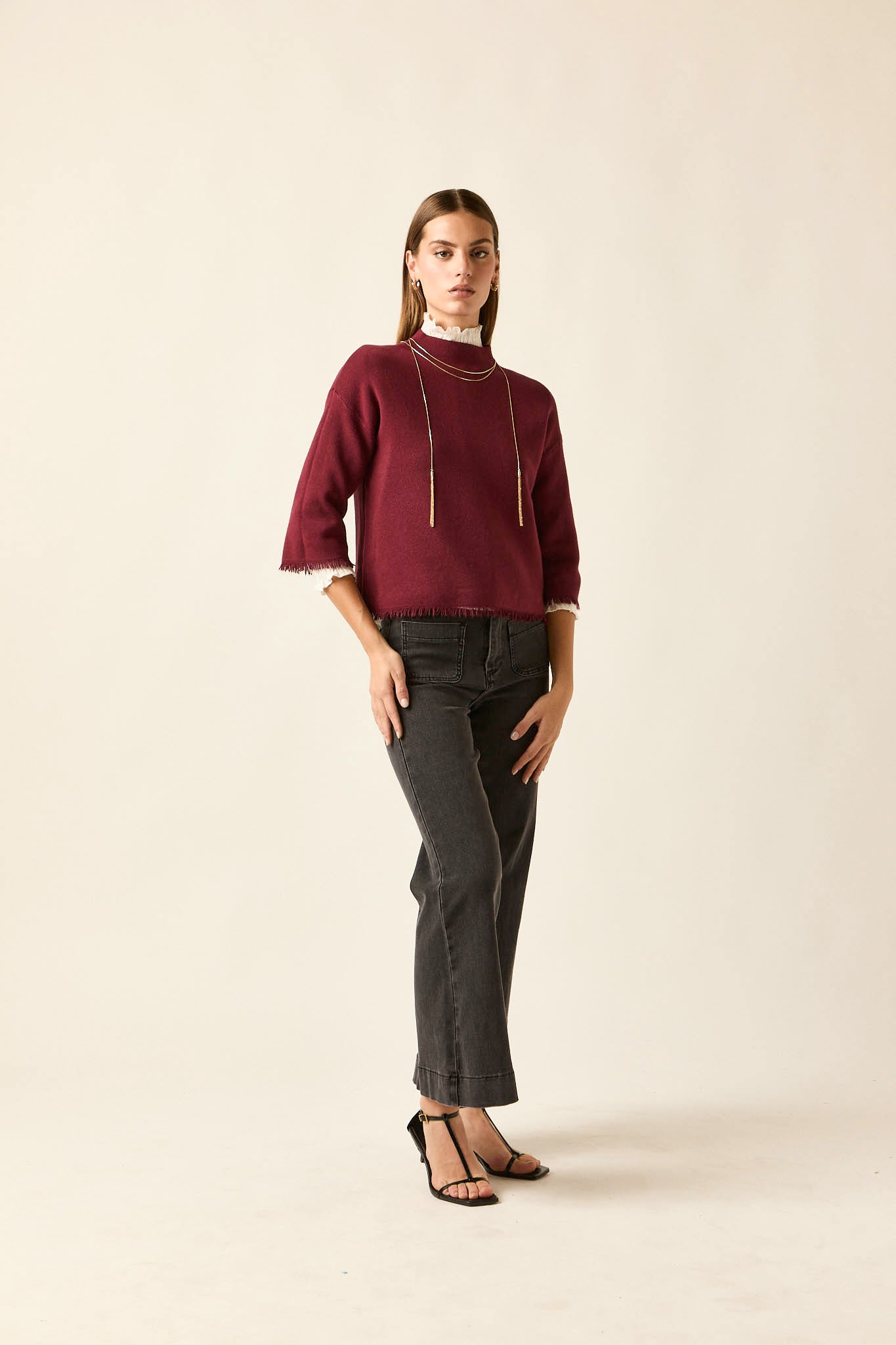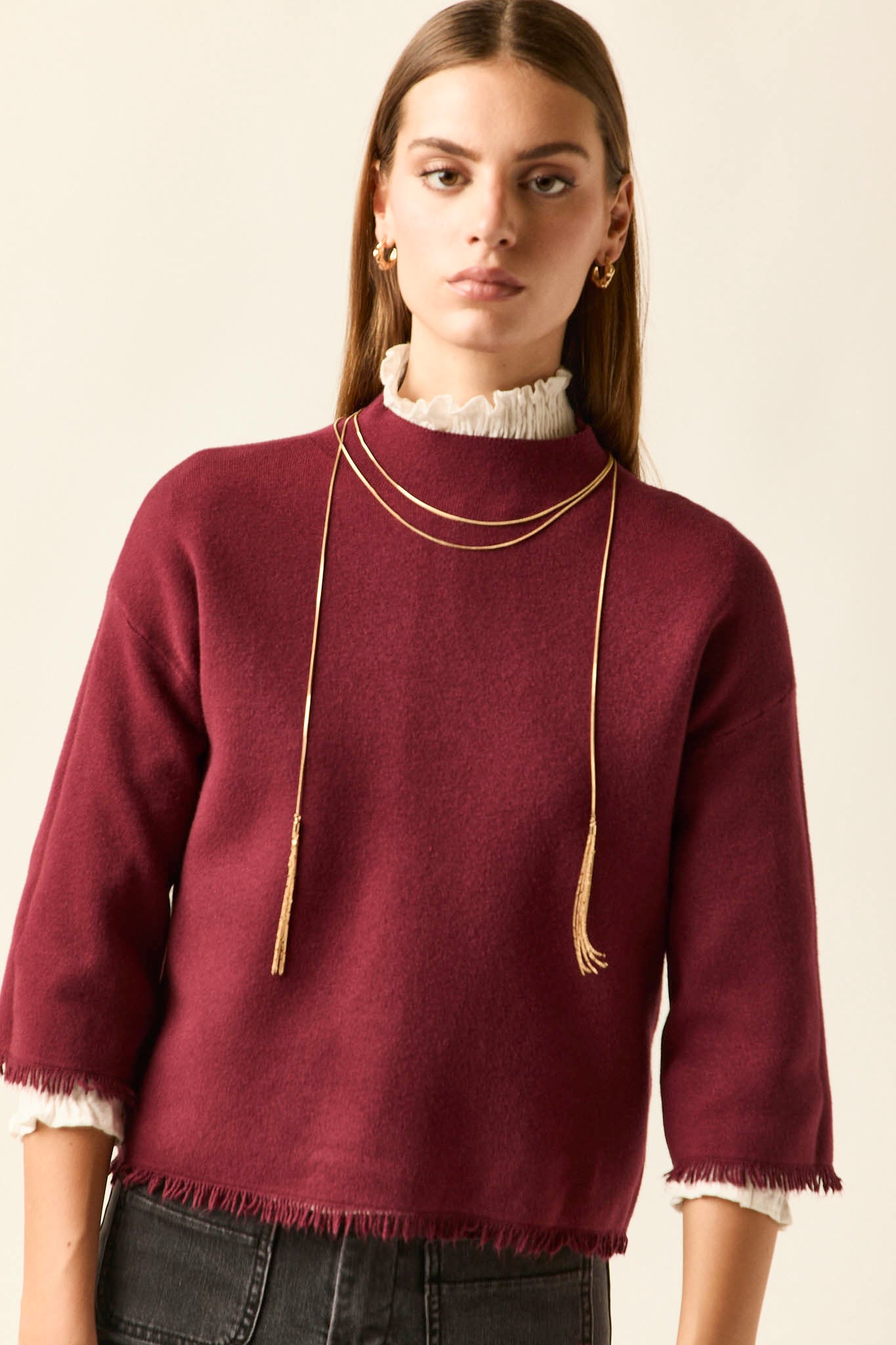 Jersey corto en color burdeos, con cuello redondo y manga tres cuartos. El diseño presenta acabados deshilachados en bajos, puños y cuello, que aportan un aire desenfadado y moderno. Su silueta recta y ligeramente amplia lo convierte en una prenda cómoda y versátil para combinar en múltiples looks.