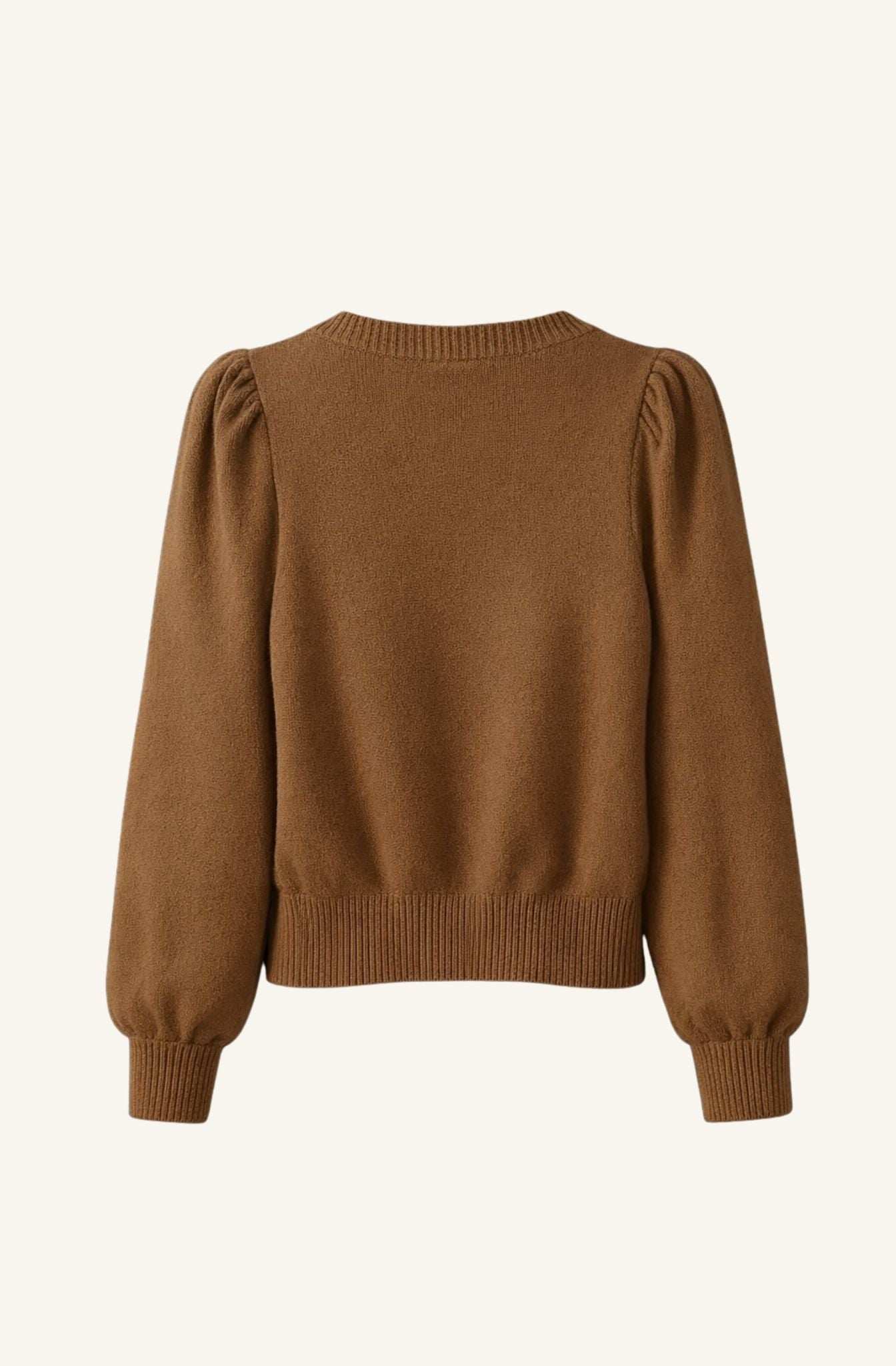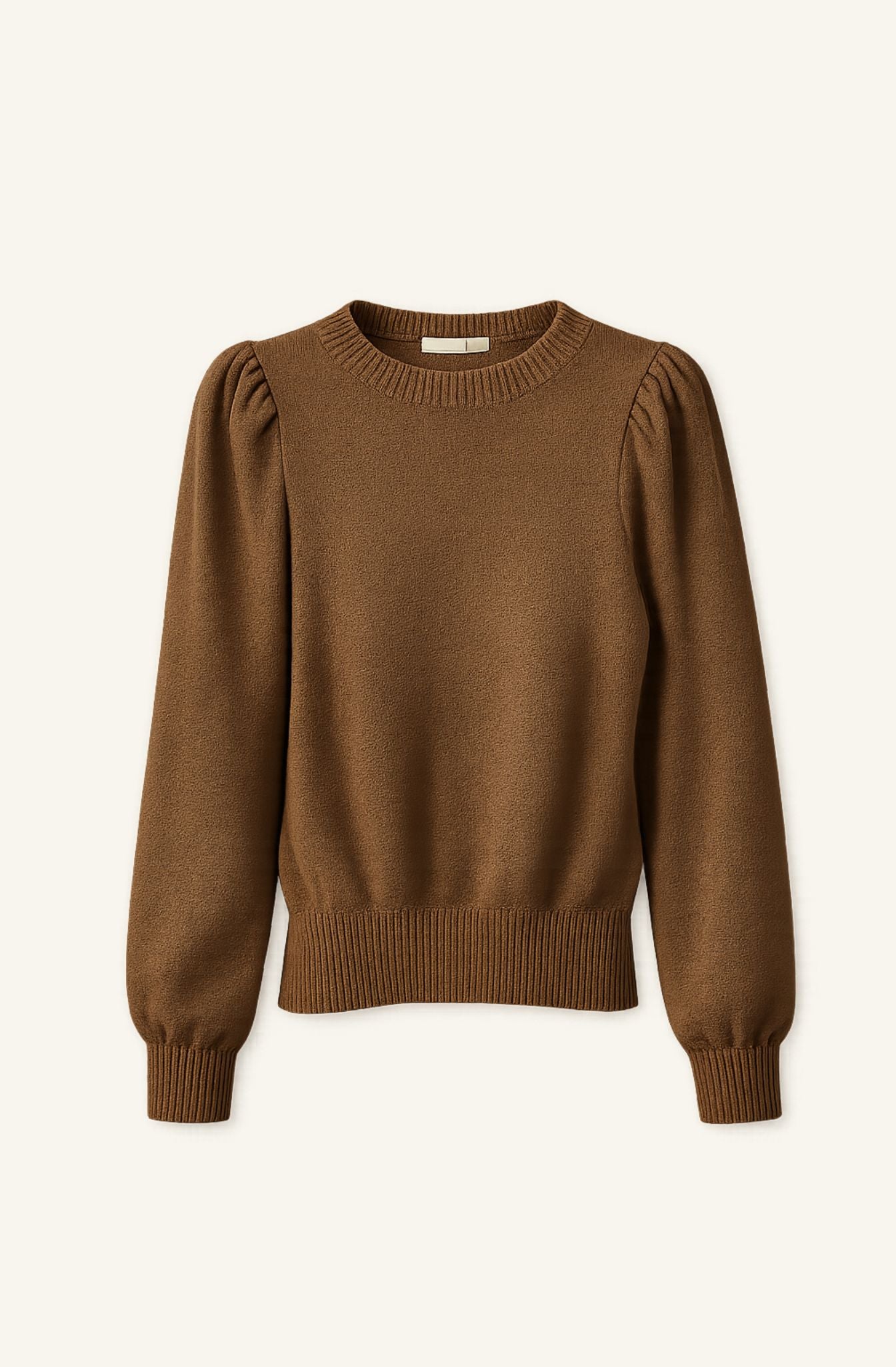 Jersey de punto en color topo con cuello redondo y manga larga tipo farol. Diseño ajustado en el cuerpo con volumen sutil en hombros y mangas, equilibrado por los acabados elásticos en puños y bajo. Una prenda cómoda y favorecedora, pensada para el entretiempo y los primeros looks de primavera.