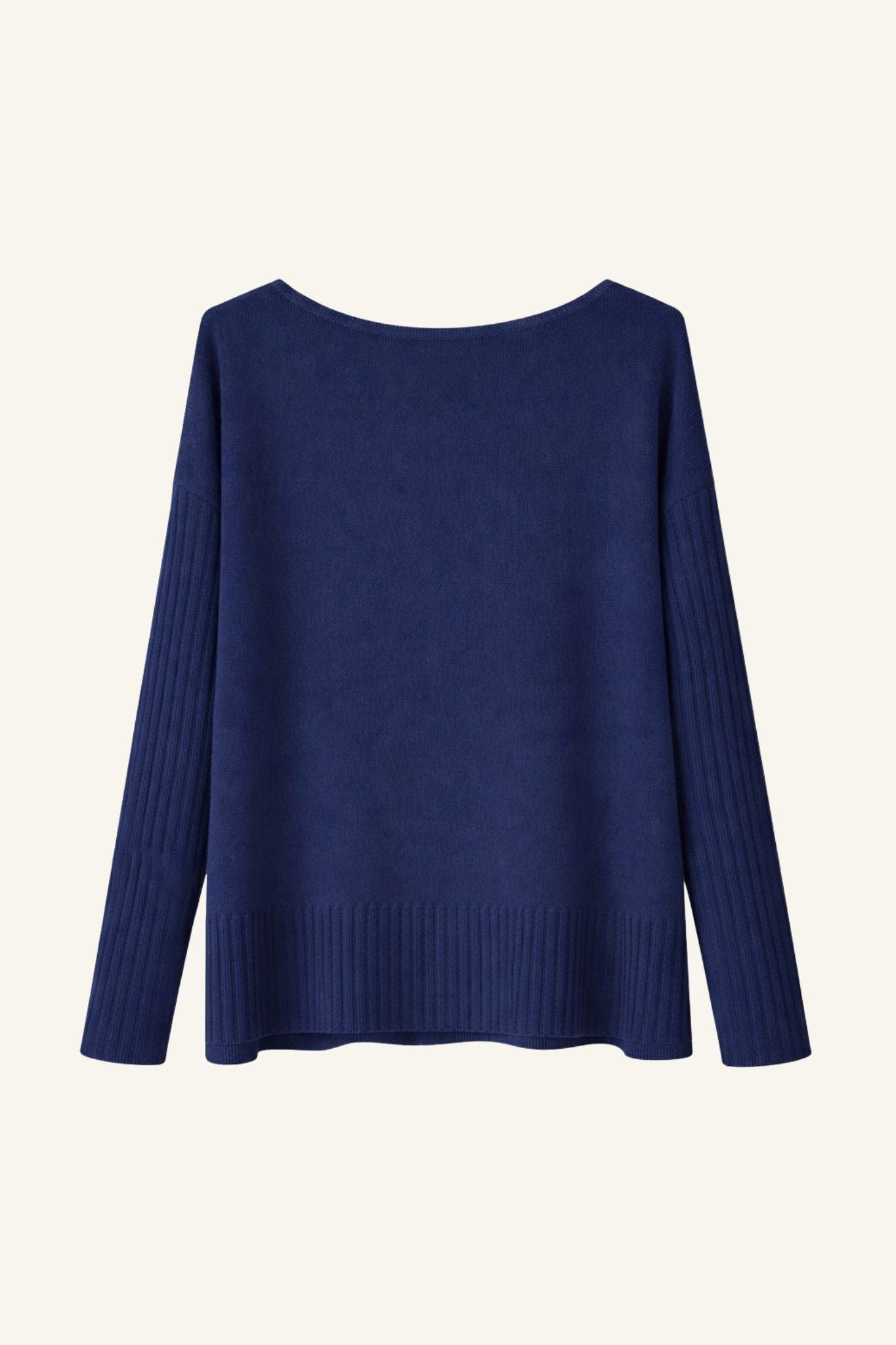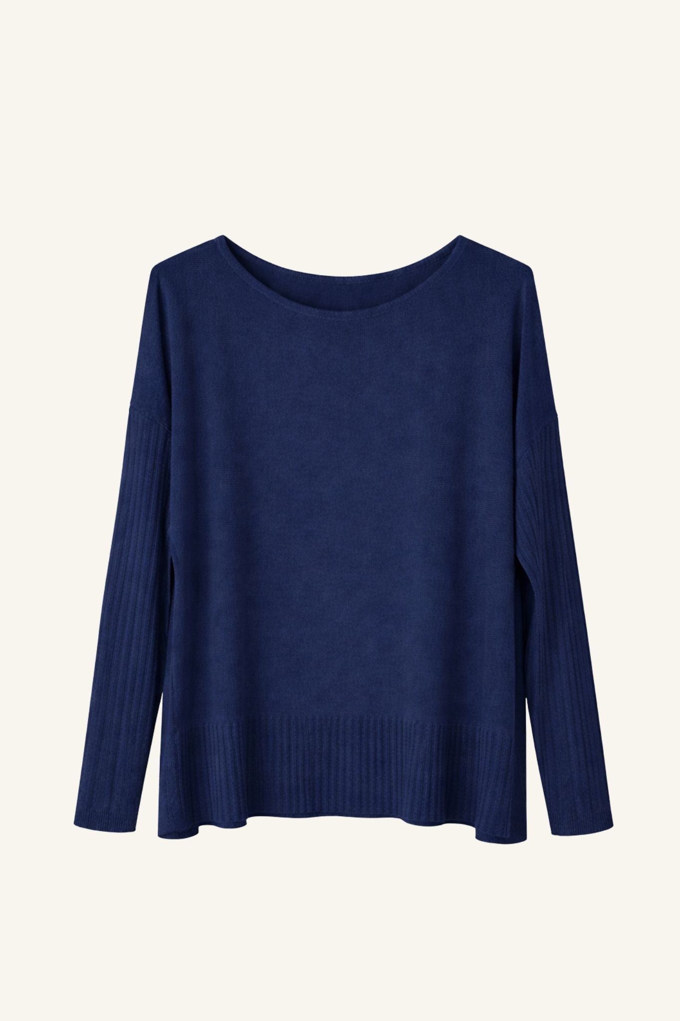 Jersey de punto fino en tono azul marino, con cuello redondo y manga larga. El diseño combina un cuerpo de textura lisa con mangas en canalé, aportando un sutil contraste y un acabado más cuidado. Corte recto y silueta relajada, pensada para un ajuste cómodo y favorecedor.