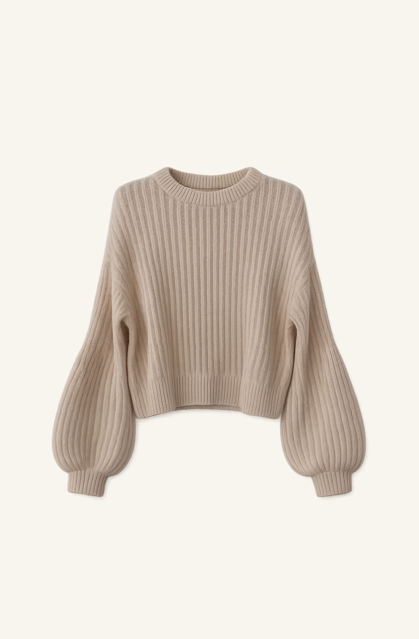 Jersey de punto en tono beige con cuello redondo y manga larga tipo globo. Destaca por su textura en canalé y el volumen de las mangas, que aportan un toque especial al diseño sin perder equilibrio. Corte ligeramente cropped y silueta relajada, pensada para un ajuste cómodo y favorecedor.
