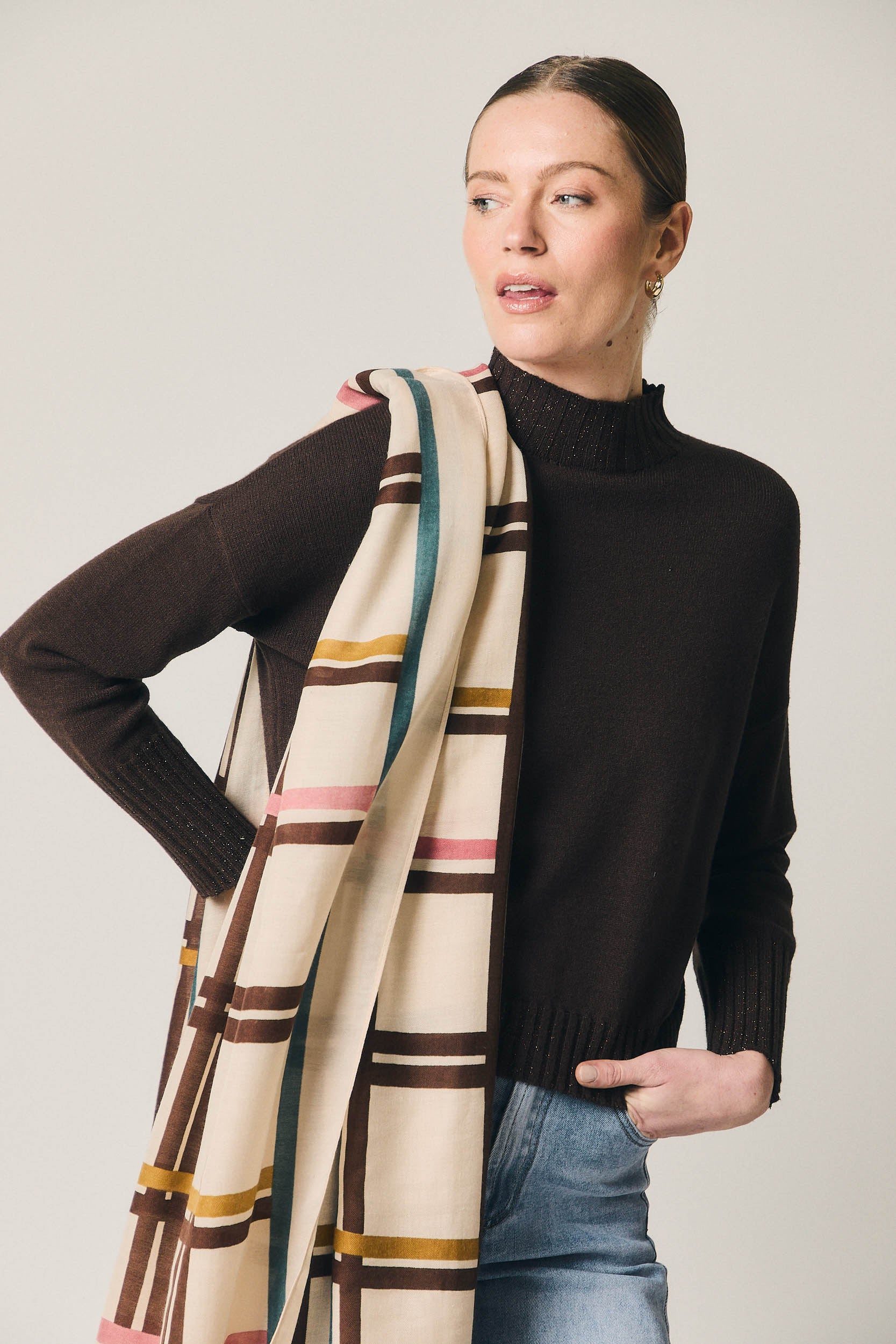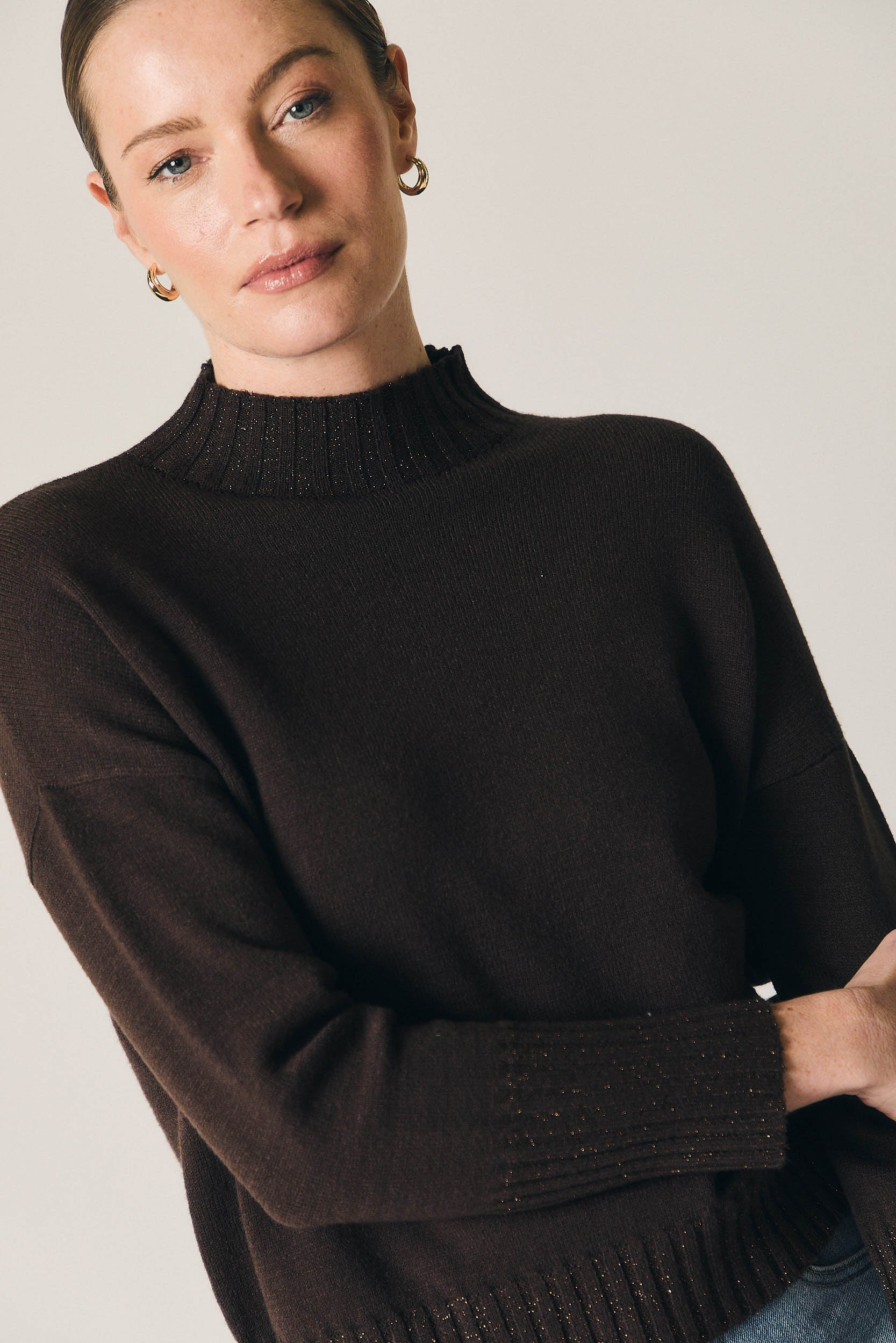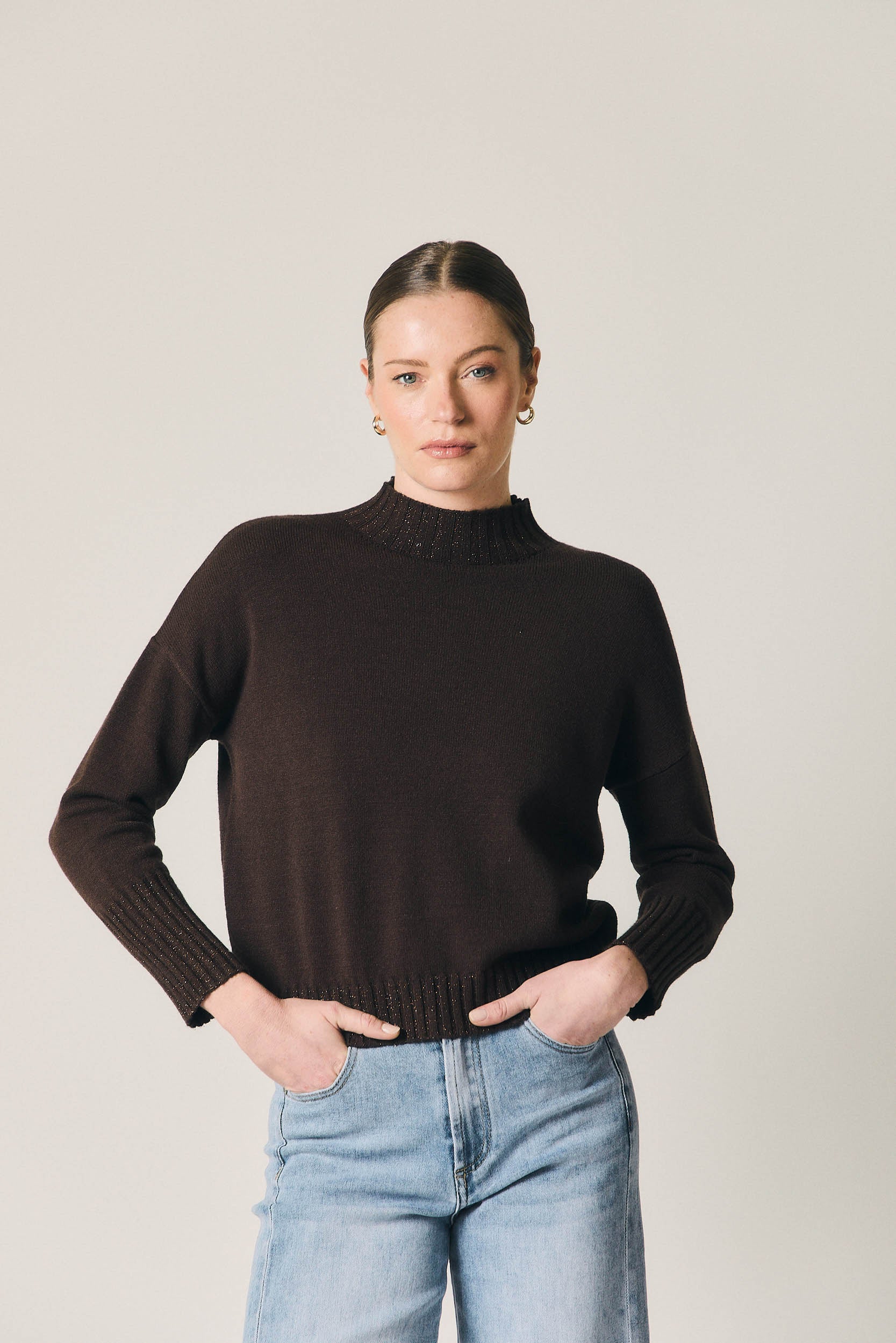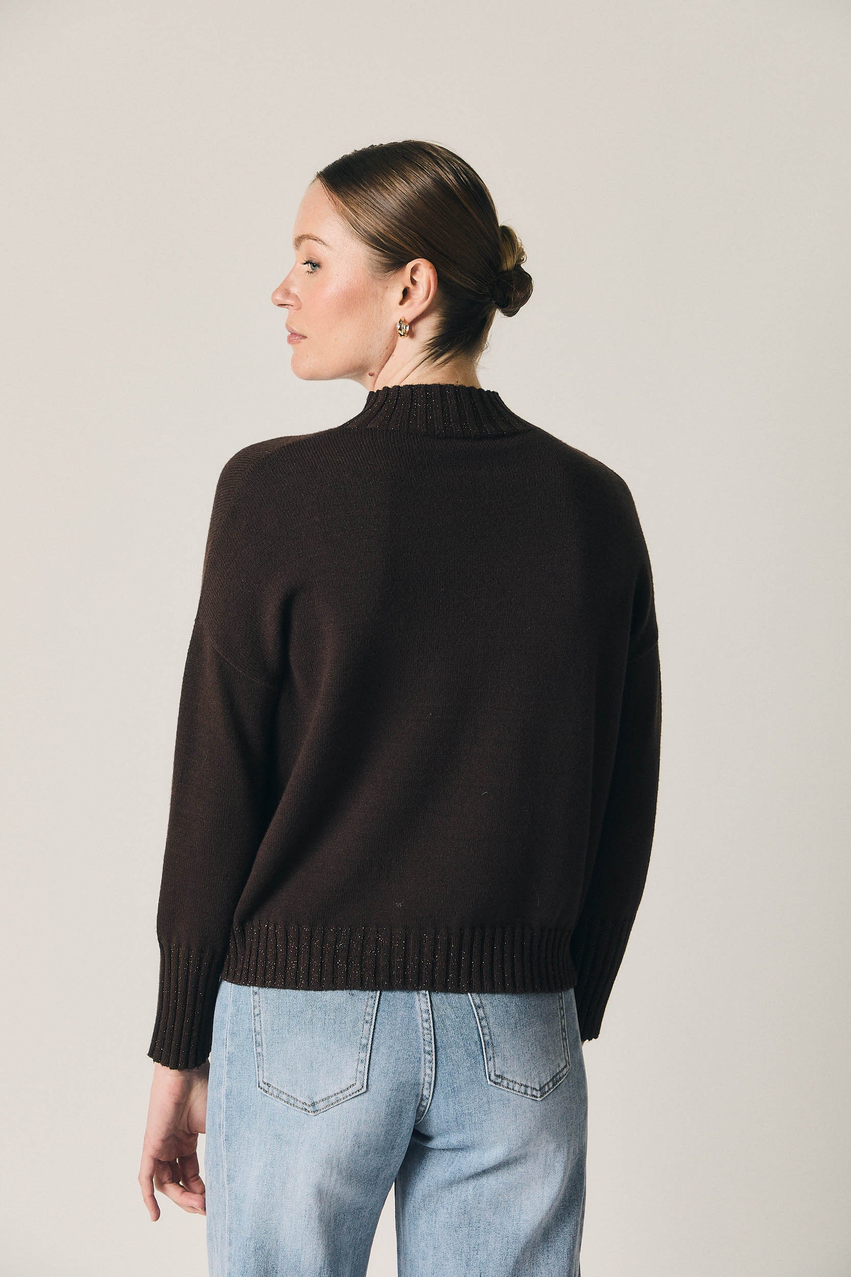 Jersey de punto en tono marrón con sutil brillo integrado. Diseño de corte recto, cuello tipo Perkins con acabado canalé y manga larga con puño marcado. La estructura limpia y el ligero destello aportan un punto especial sin perder la sensación de prenda cómoda y fácil de llevar.