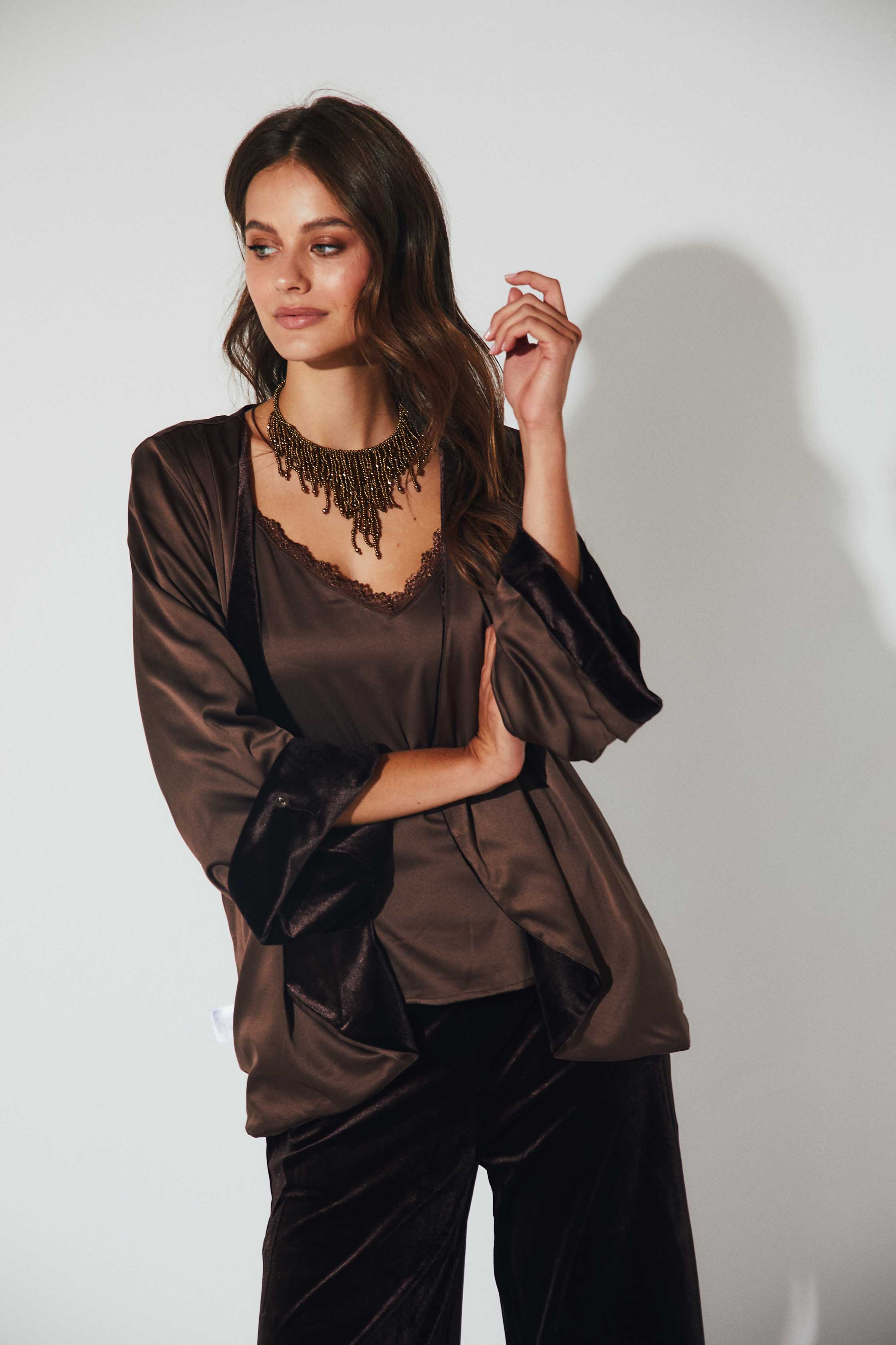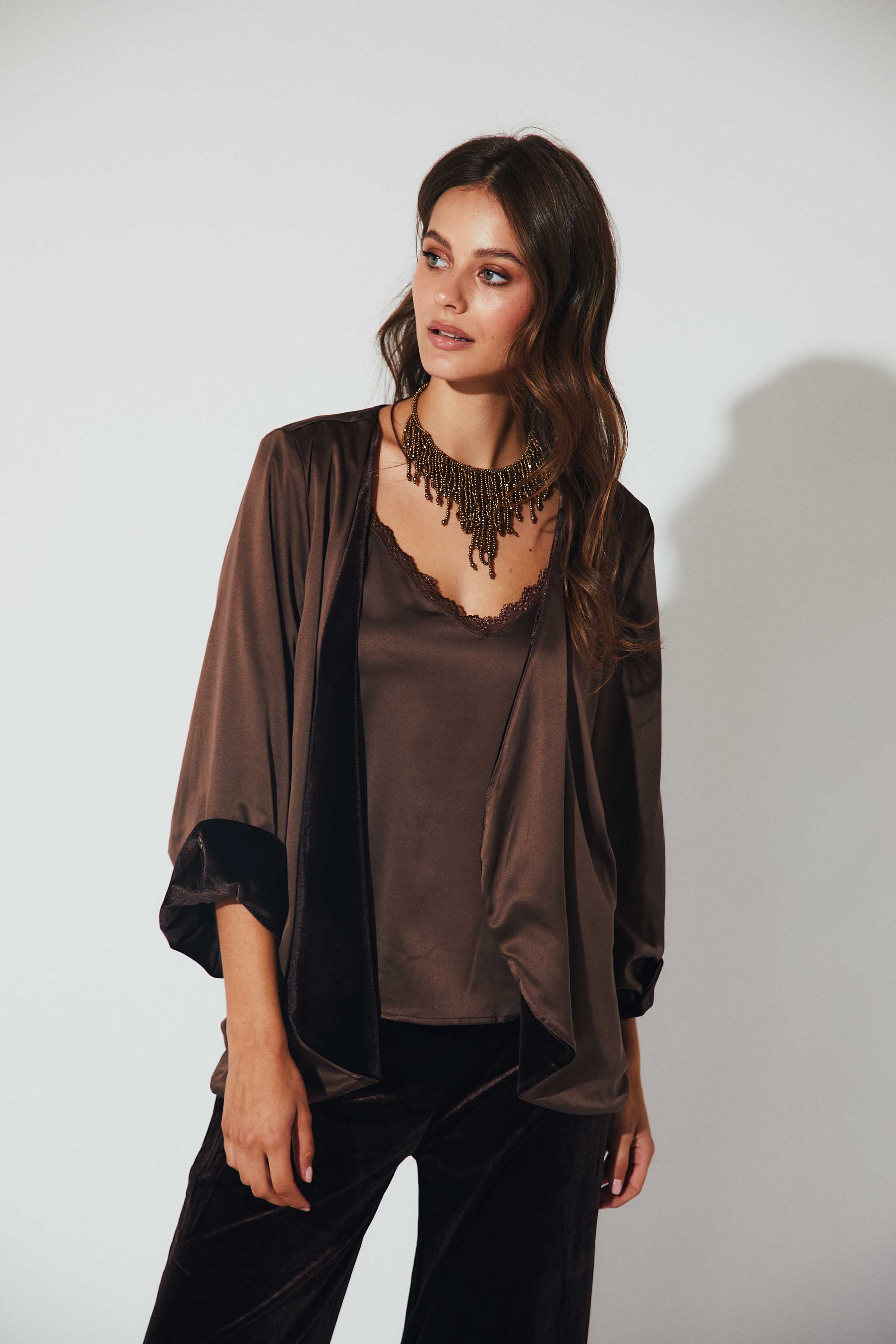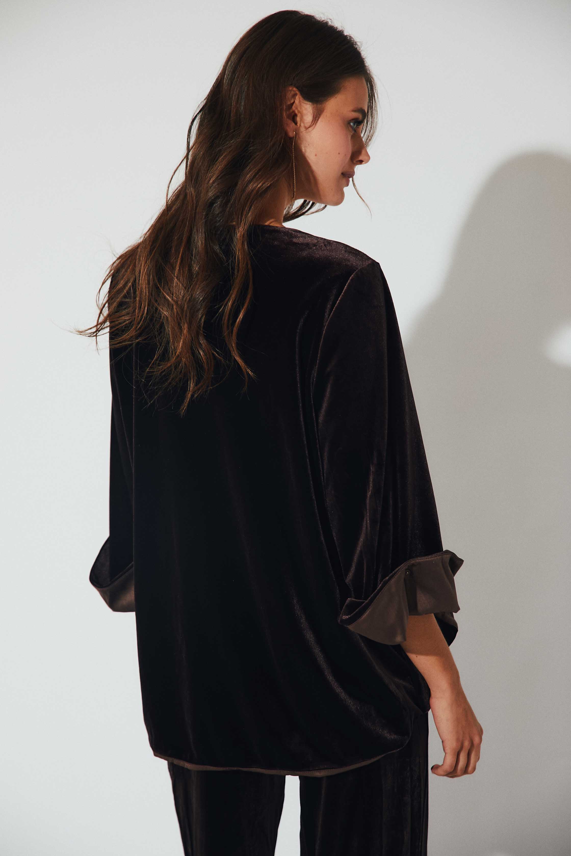 Kimono reversible en tejido de terciopelo marrón con acabado satinado en el interior. Su diseño suelto y fluido, con manga amplia y vuelta contrastada, ofrece dos formas de llevarlo: por el lado de terciopelo o por el de raso, según el look o la ocasión.