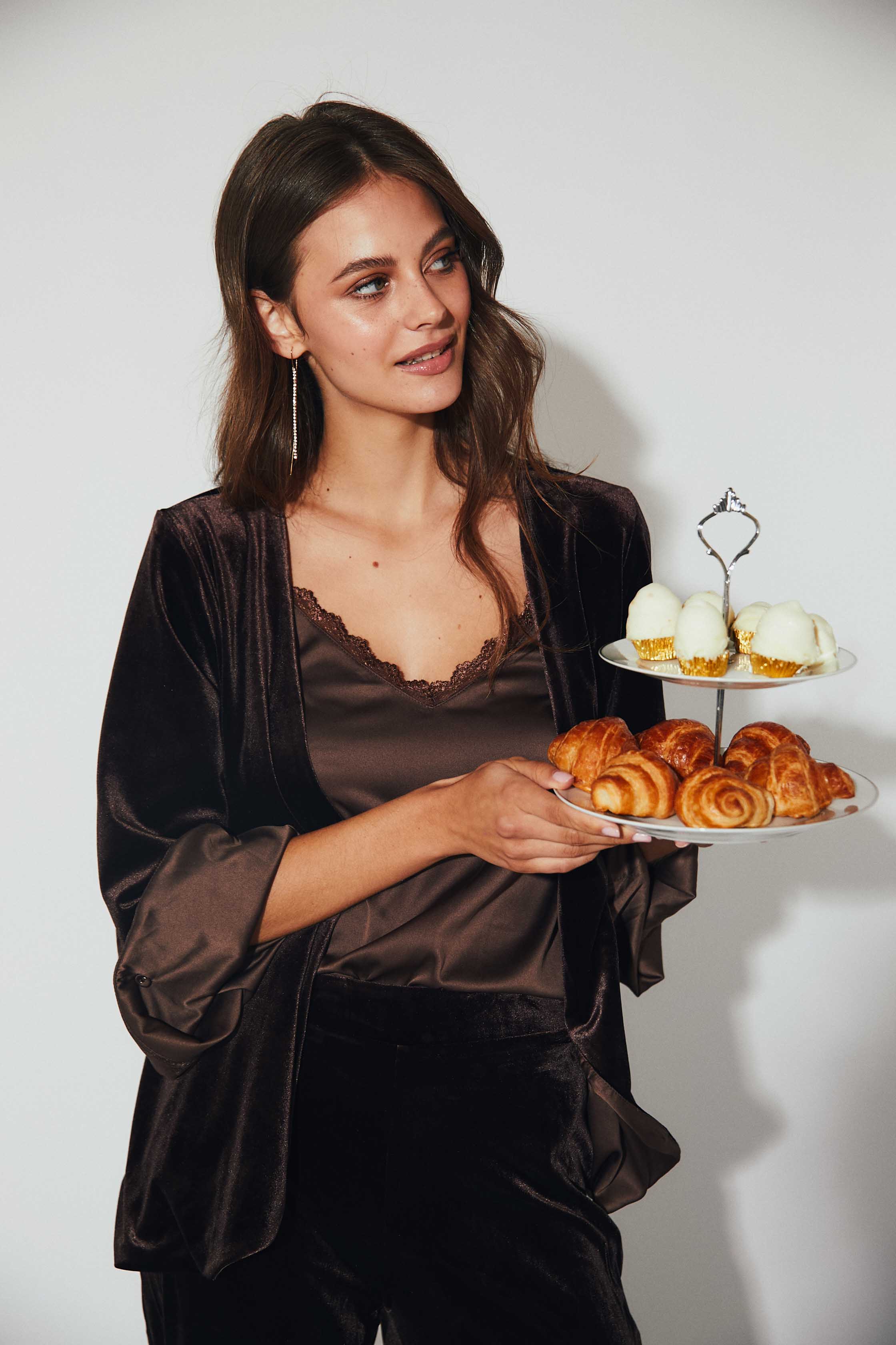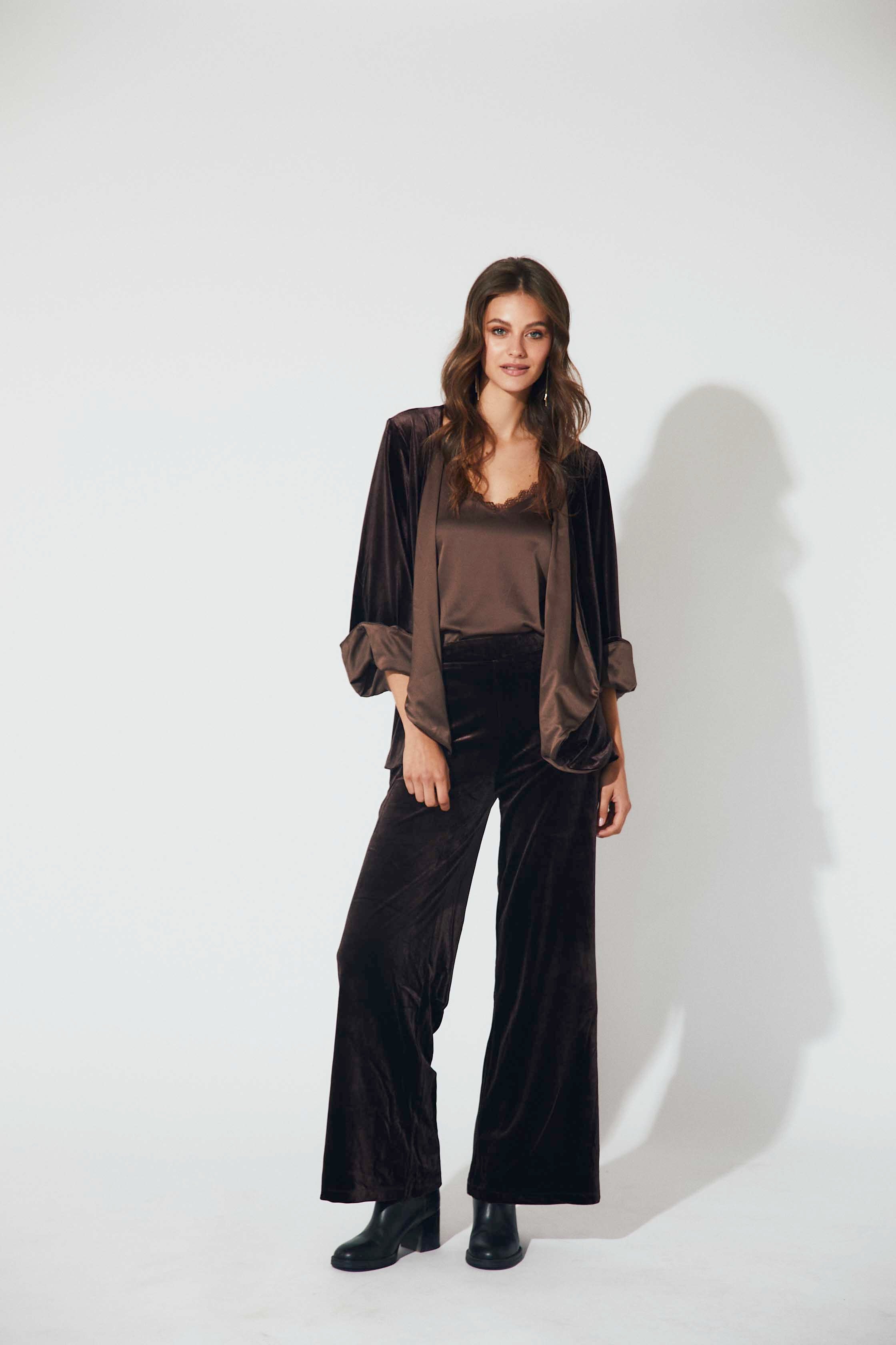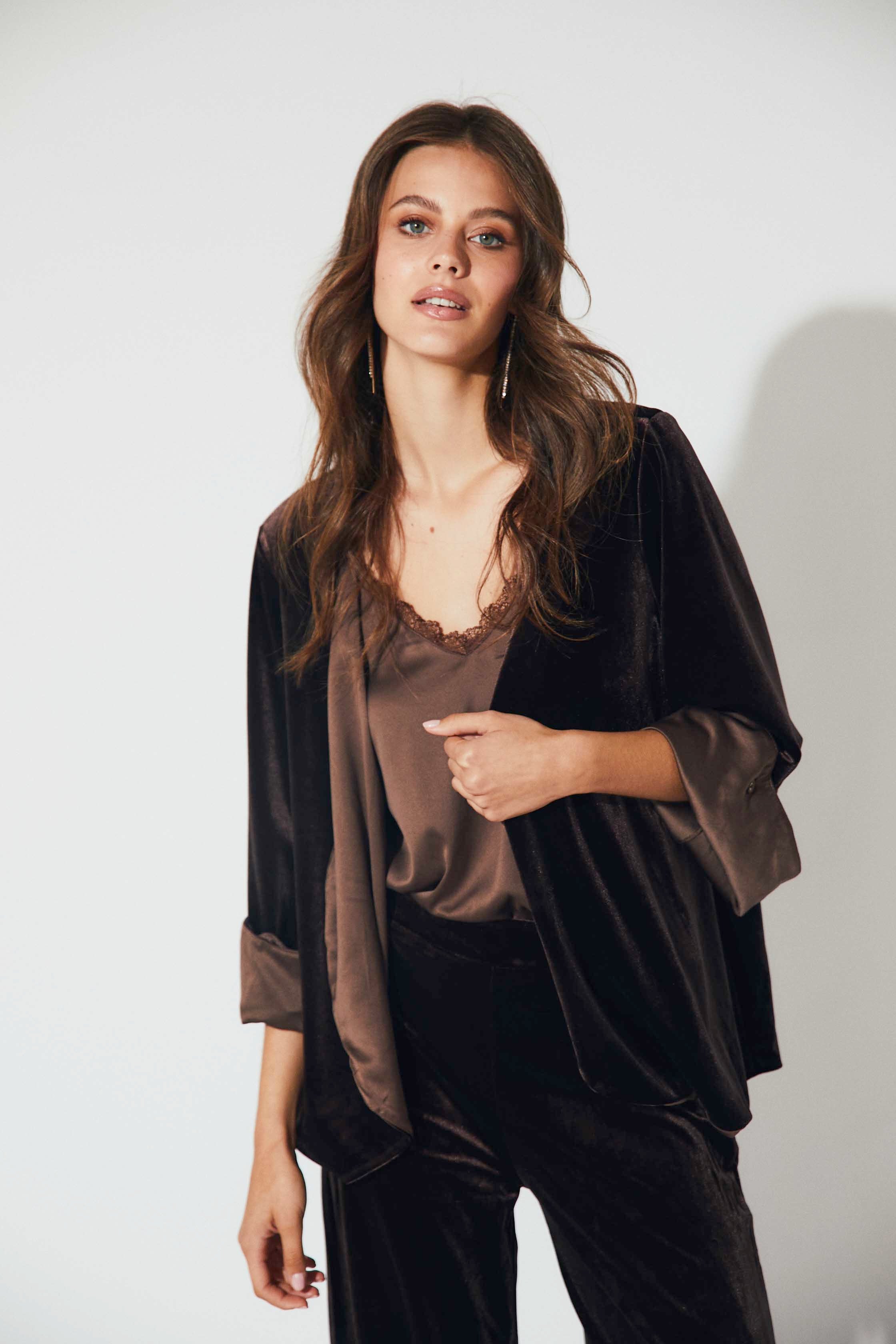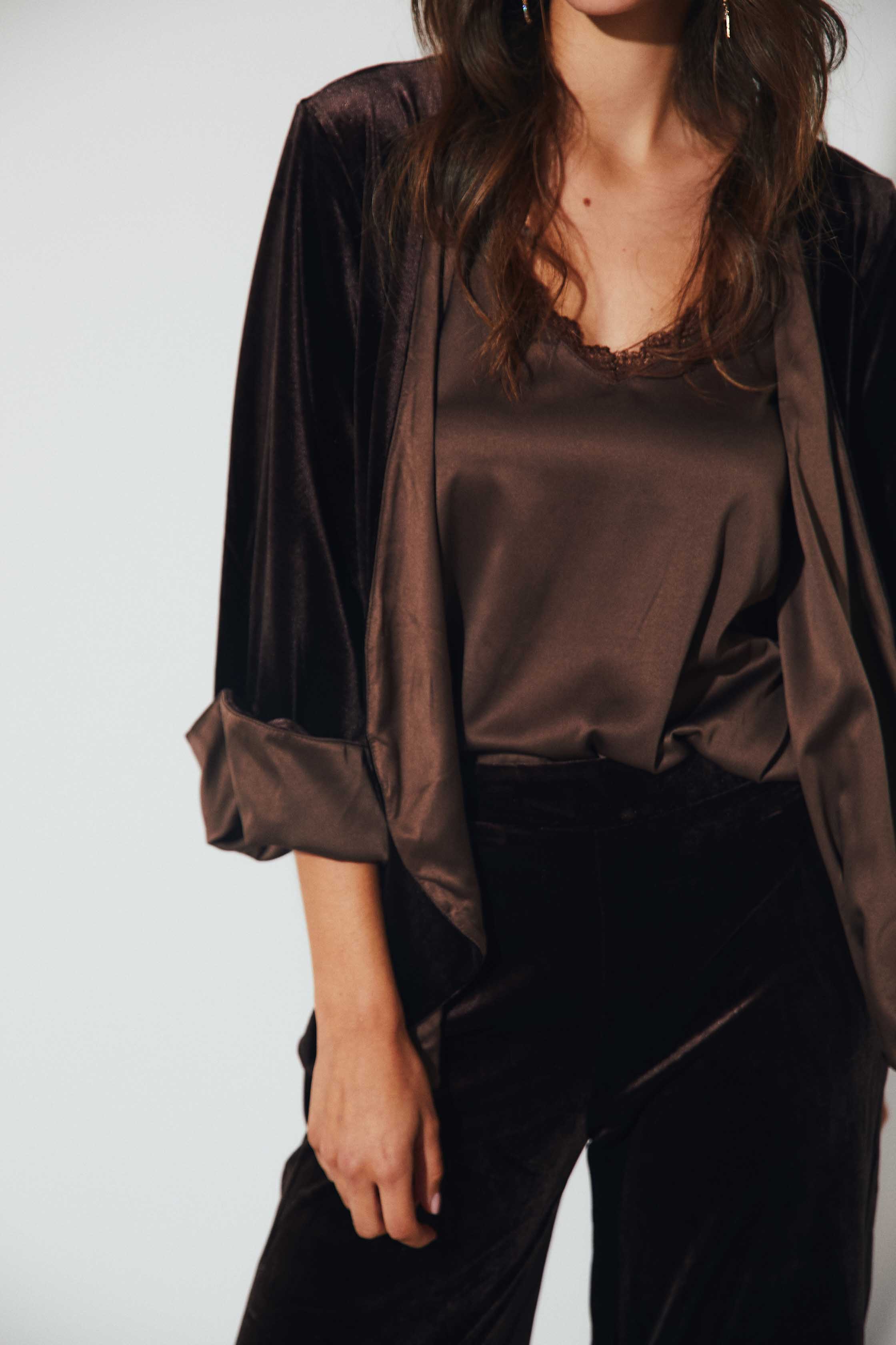 Kimono reversible en tejido de terciopelo marrón con acabado satinado en el interior. Su diseño suelto y fluido, con manga amplia y vuelta contrastada, ofrece dos formas de llevarlo: por el lado de terciopelo o por el de raso, según el look o la ocasión.
