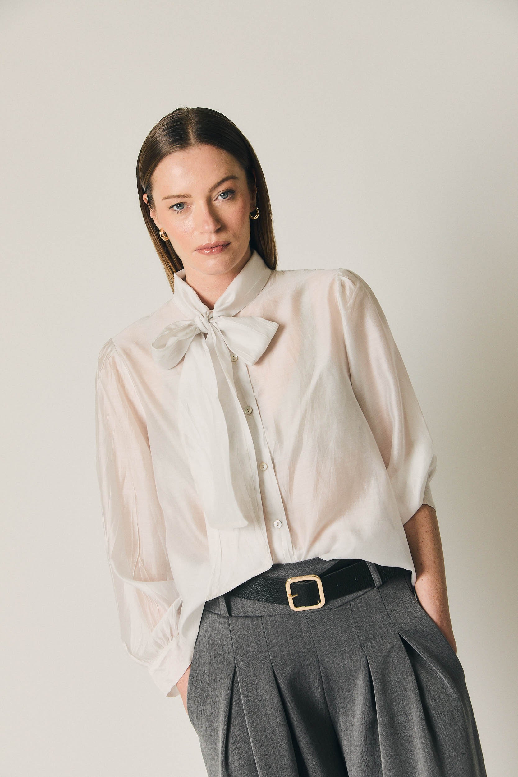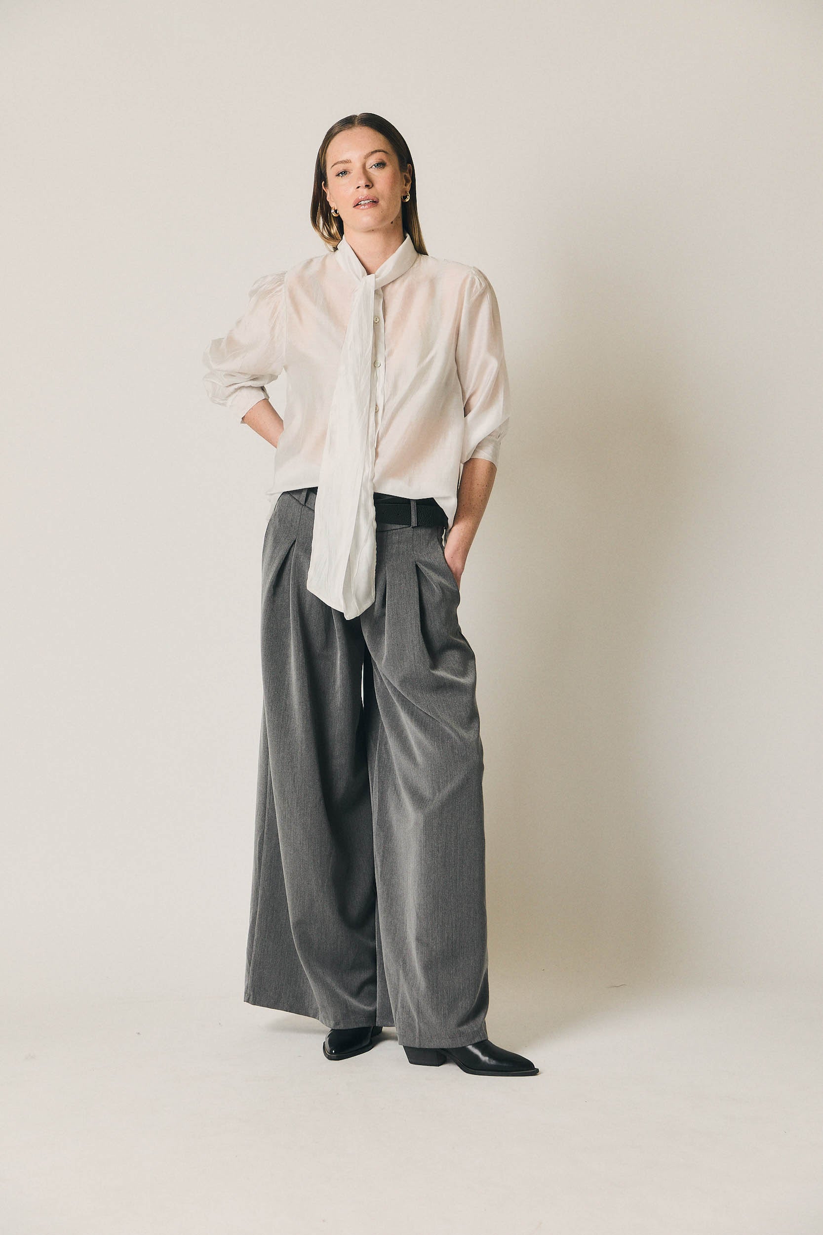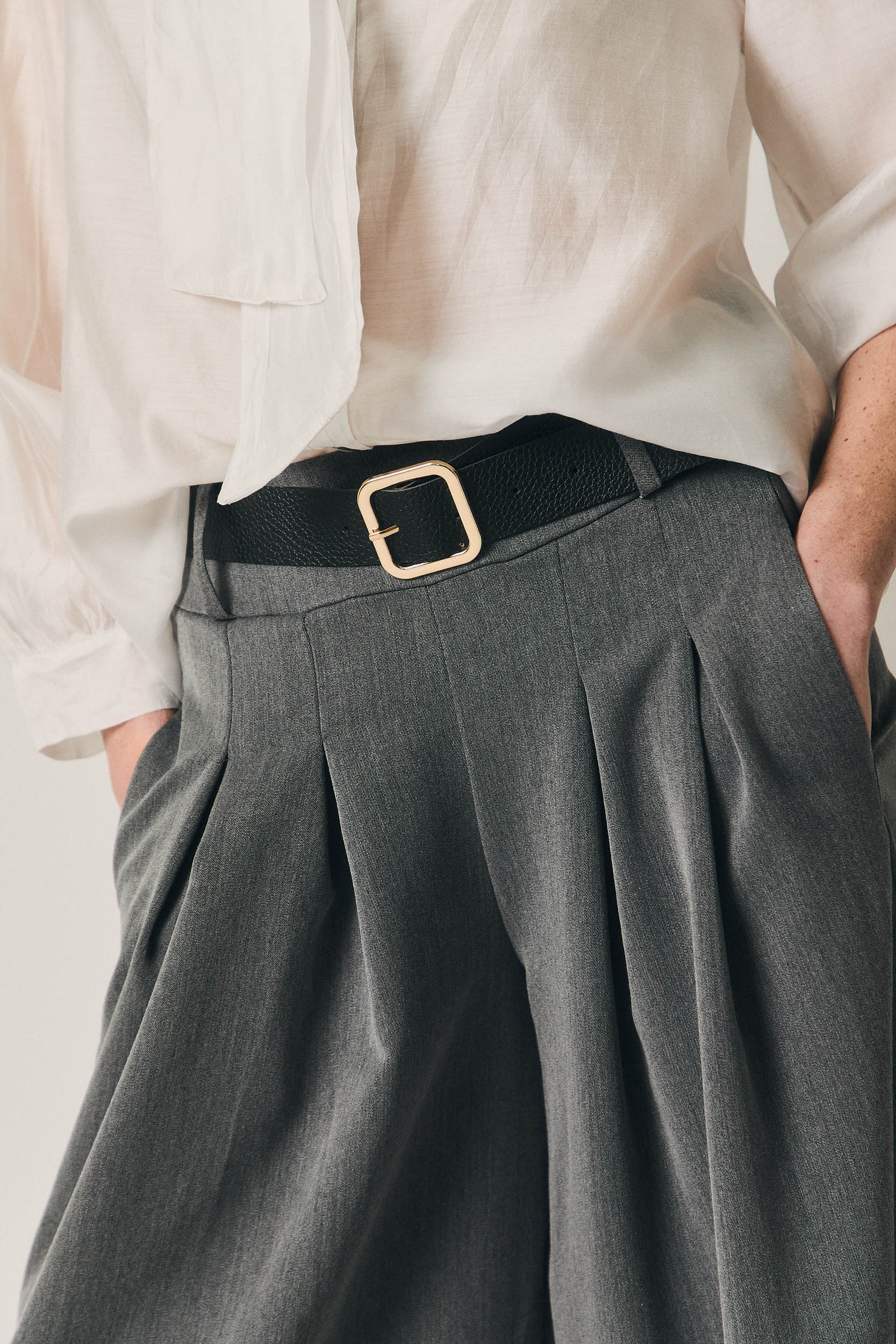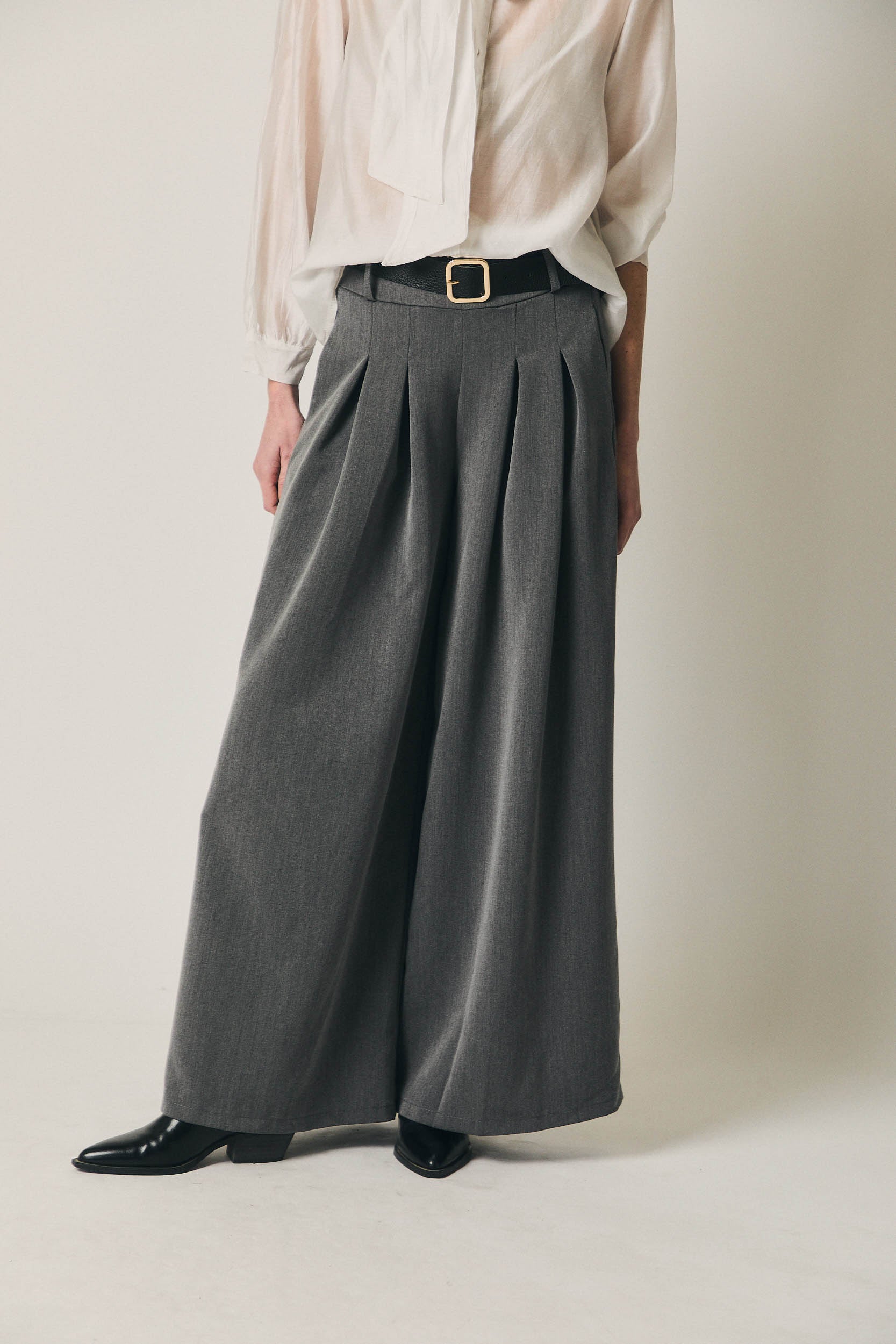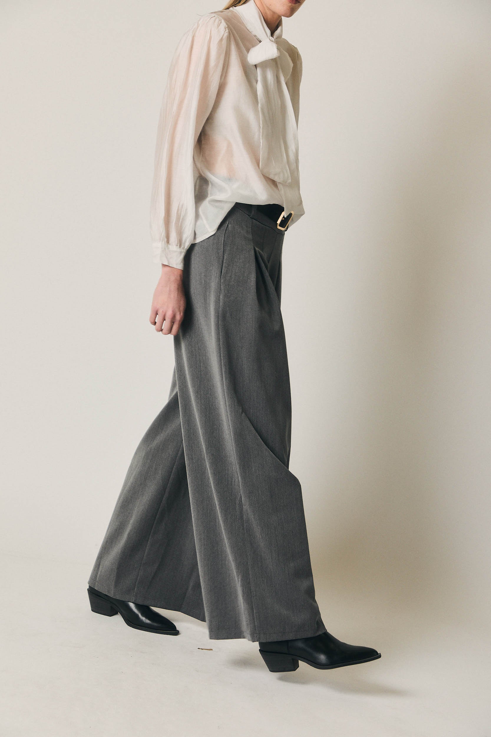 Pantalón de pernera ancha en color gris con pinzas frontales que aportan estructura y caída fluida. Diseño de tiro medio, cinturilla con trabillas y cierre frontal con cremallera y botón. La silueta amplia estiliza y alarga visualmente la pierna, manteniendo un equilibrio entre comodidad y línea cuidada.