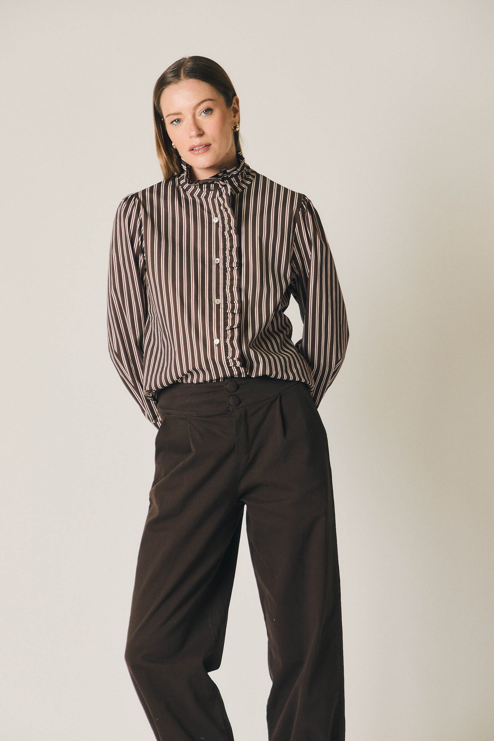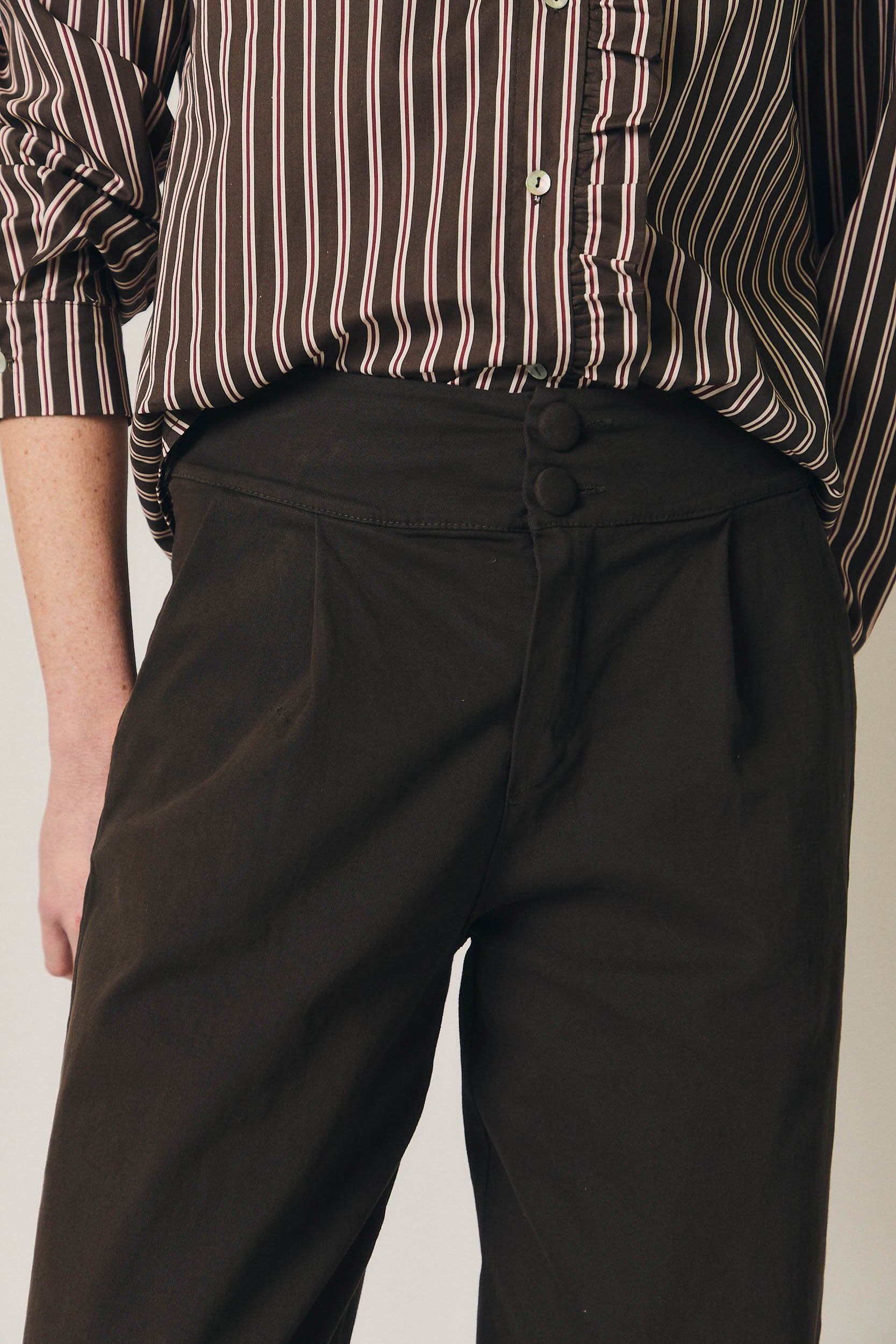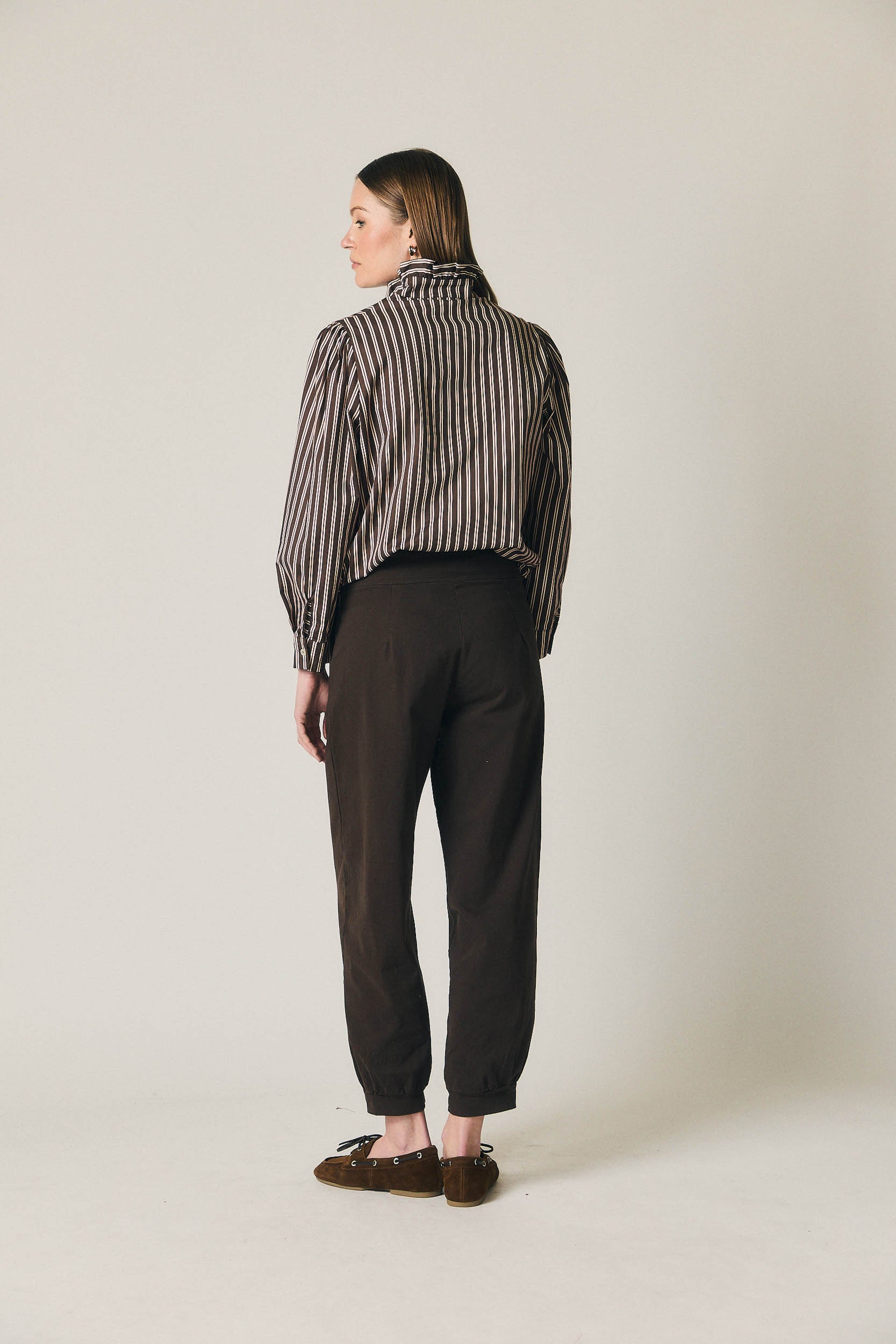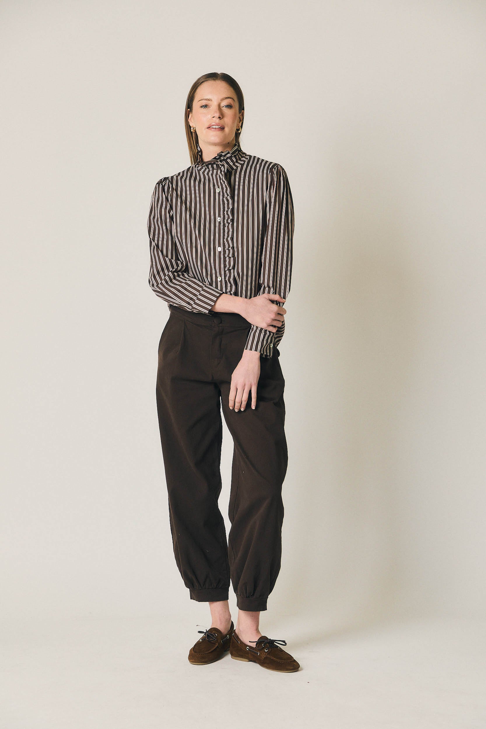 Pantalón de silueta bombacho en tono marrón, con volumen progresivo y bajo ligeramente ajustado que define la forma. Diseño de tiro medio, pinzas frontales y cierre con botones forrados, aportando estructura sin perder comodidad. La pernera amplia en la parte superior crea una caída relajada y actual.