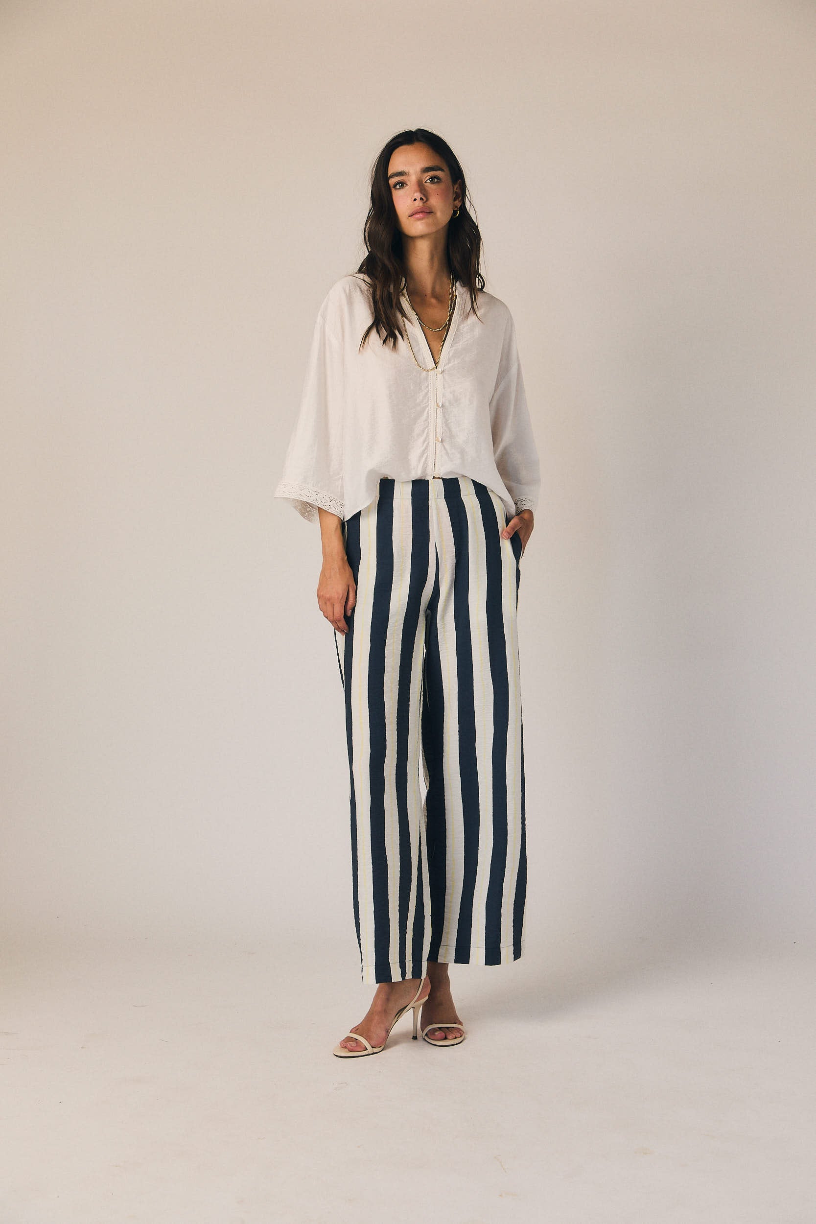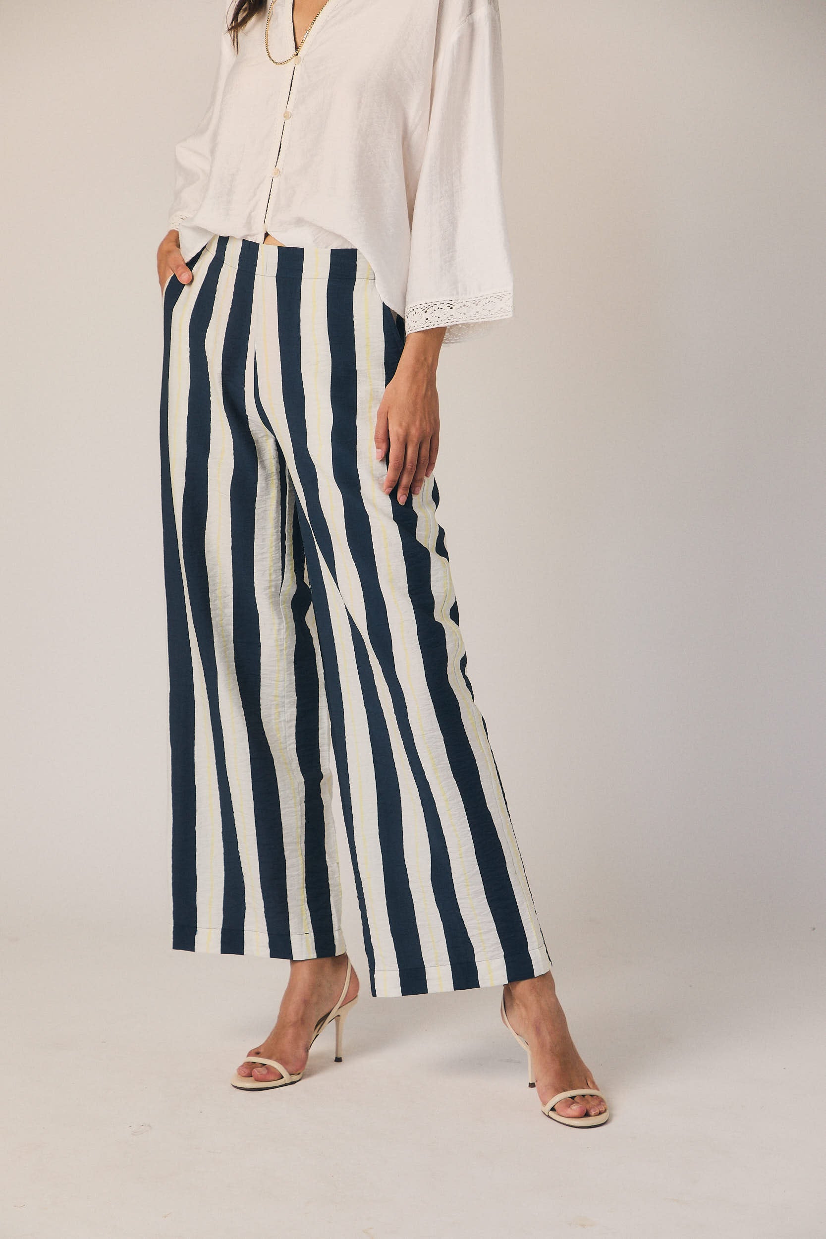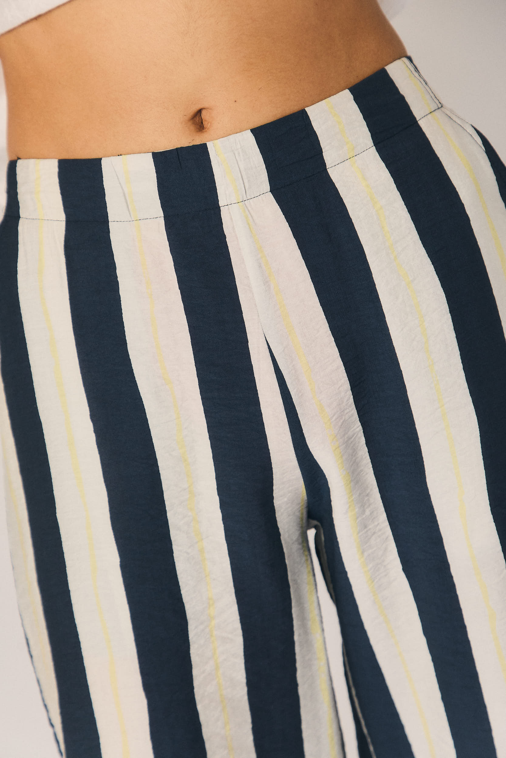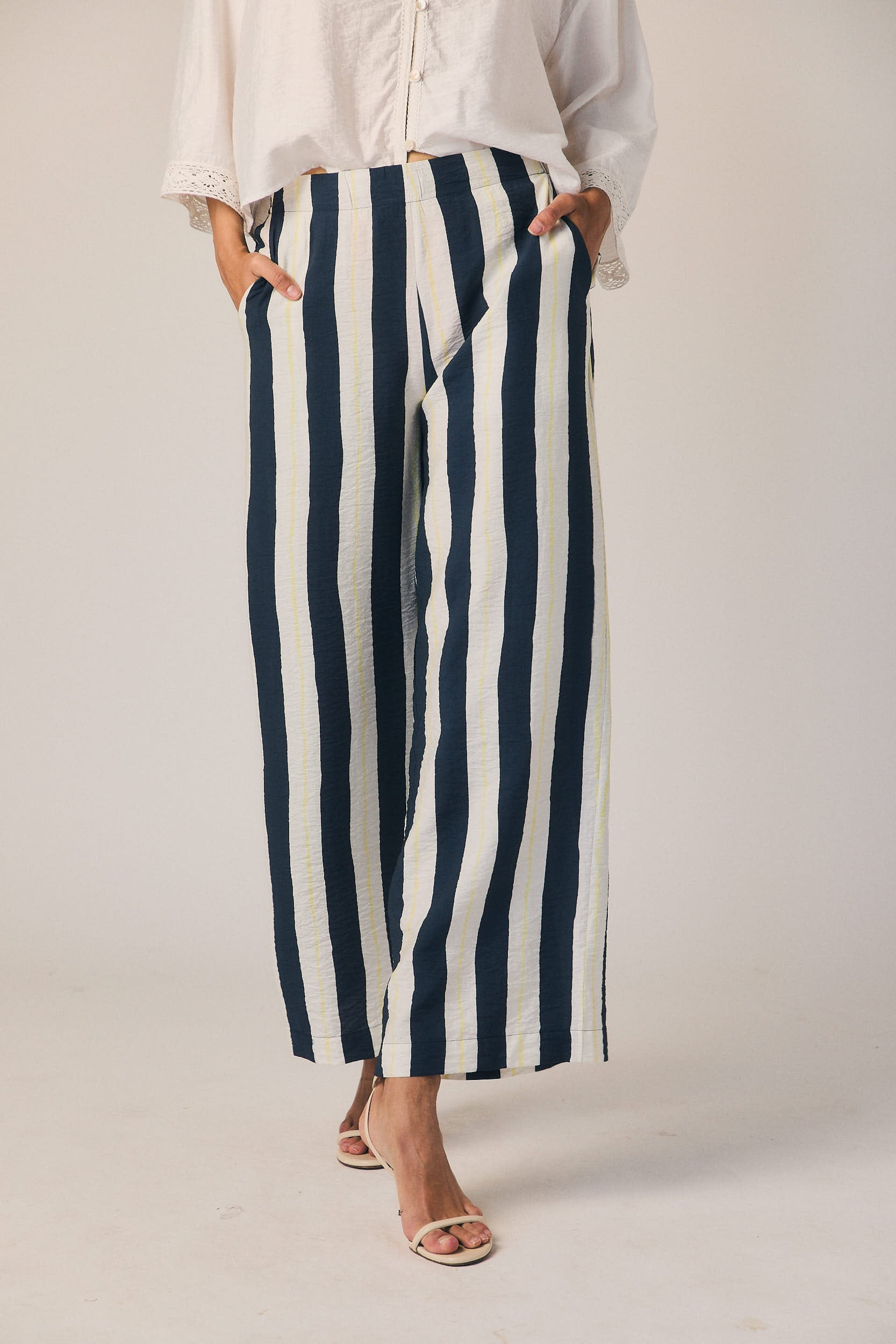 Pantalón largo de tiro medio con estampado de rayas verticales en azul marino y blanco. Corte recto y fluido, con caída ligera que alarga la silueta. Cintura con ajuste cómodo y bolsillos laterales discretos.