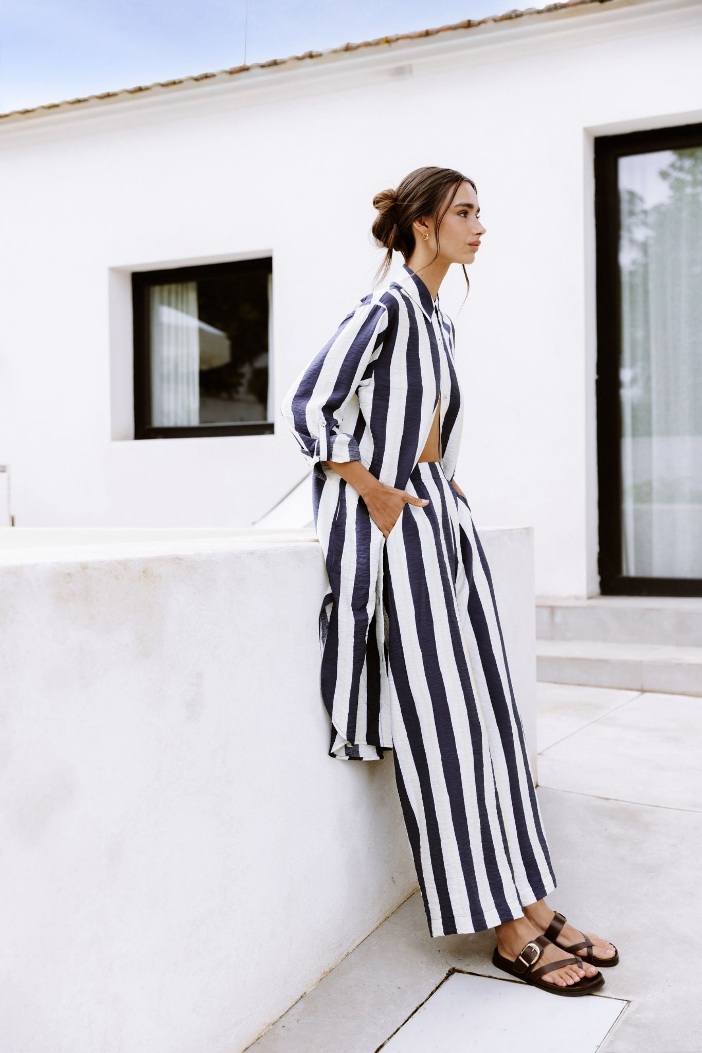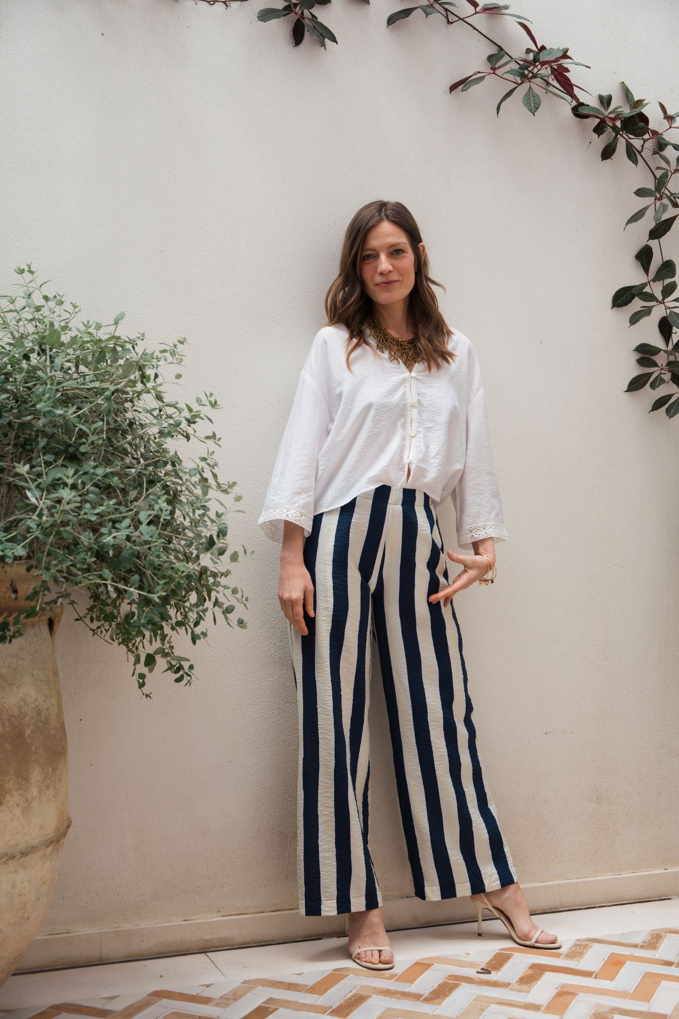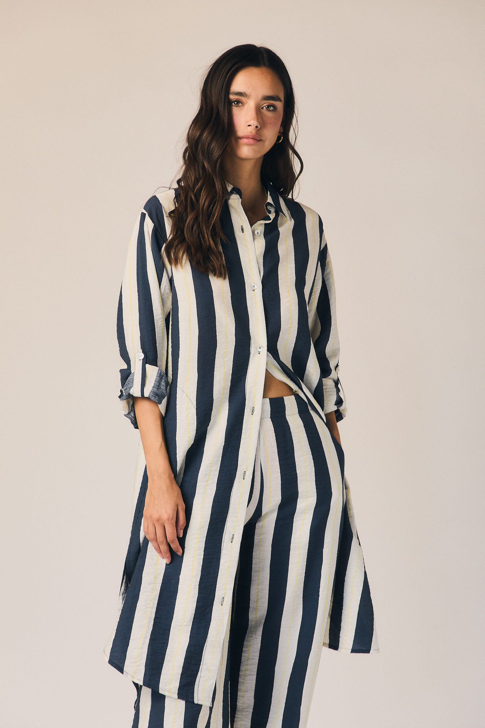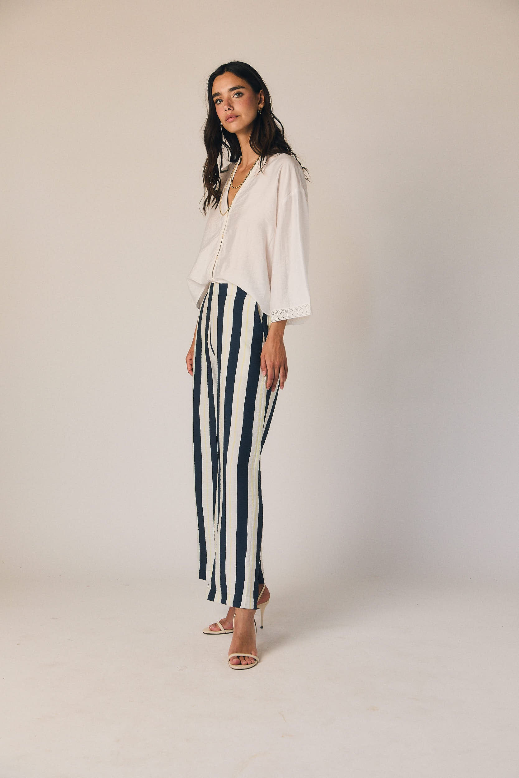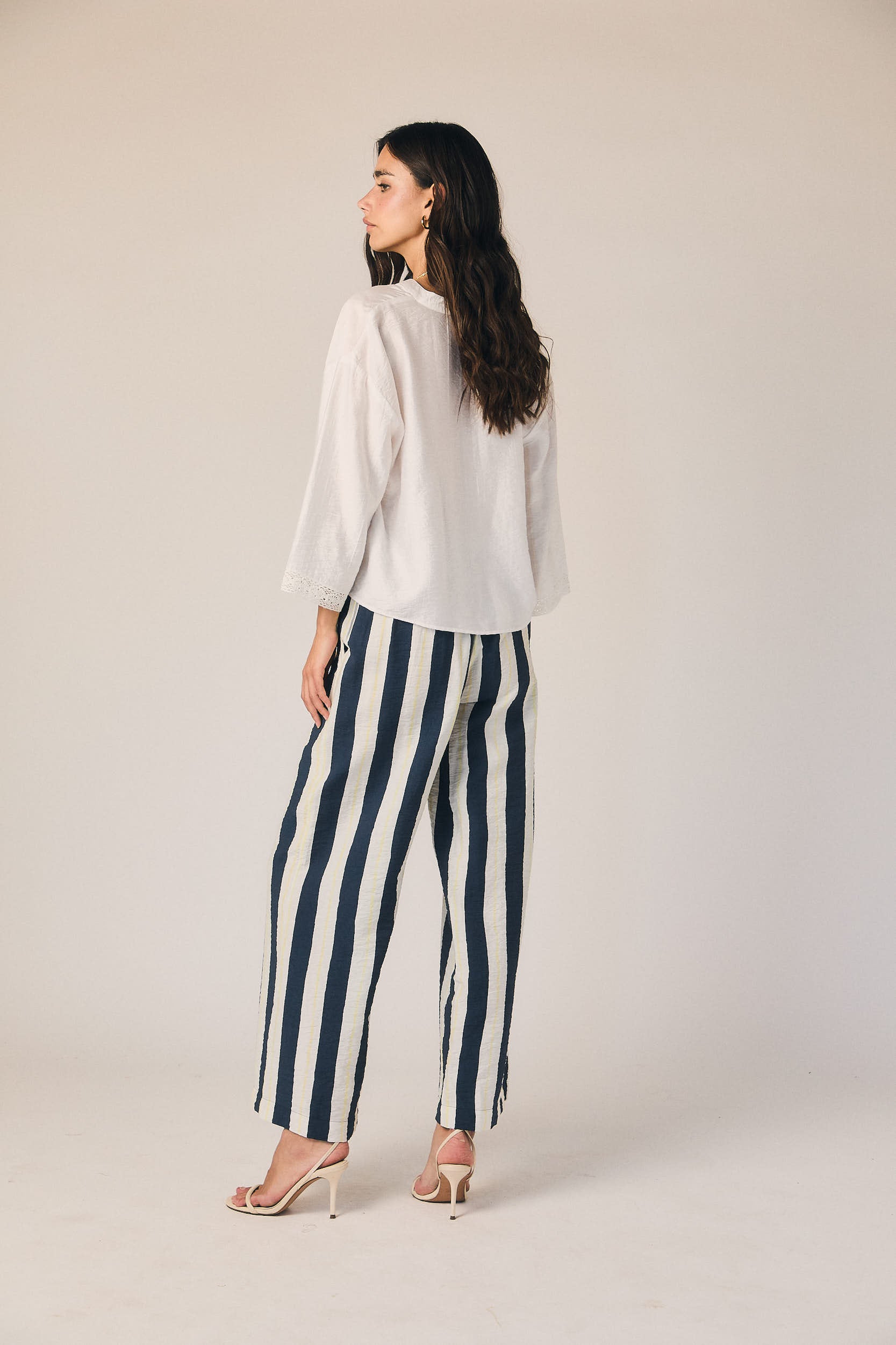 Pantalón largo de tiro medio con estampado de rayas verticales en azul marino y blanco. Corte recto y fluido, con caída ligera que alarga la silueta. Cintura con ajuste cómodo y bolsillos laterales discretos.