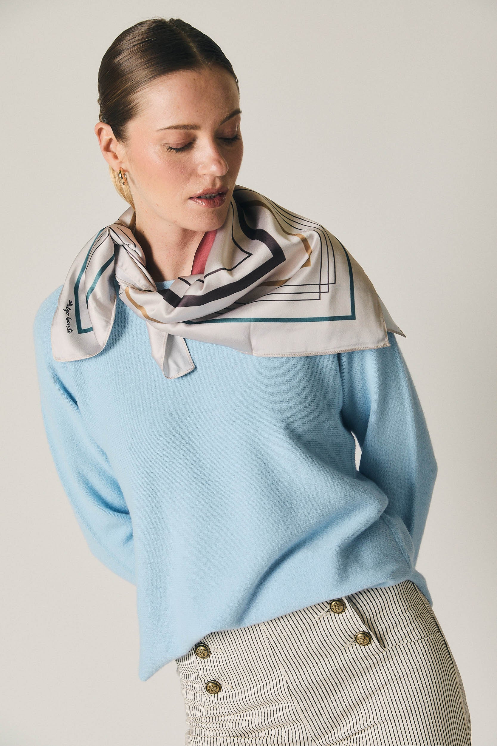 Pañuelo pequeño en base crema con estampado geométrico multicolor. Formato cuadrado y acabado limpio, con contraste de líneas en tonos suaves que enmarcan el diseño. Su tamaño permite llevarlo anudado al cuello, al bolso o como detalle en el pelo, aportando color sin recargar el conjunto.