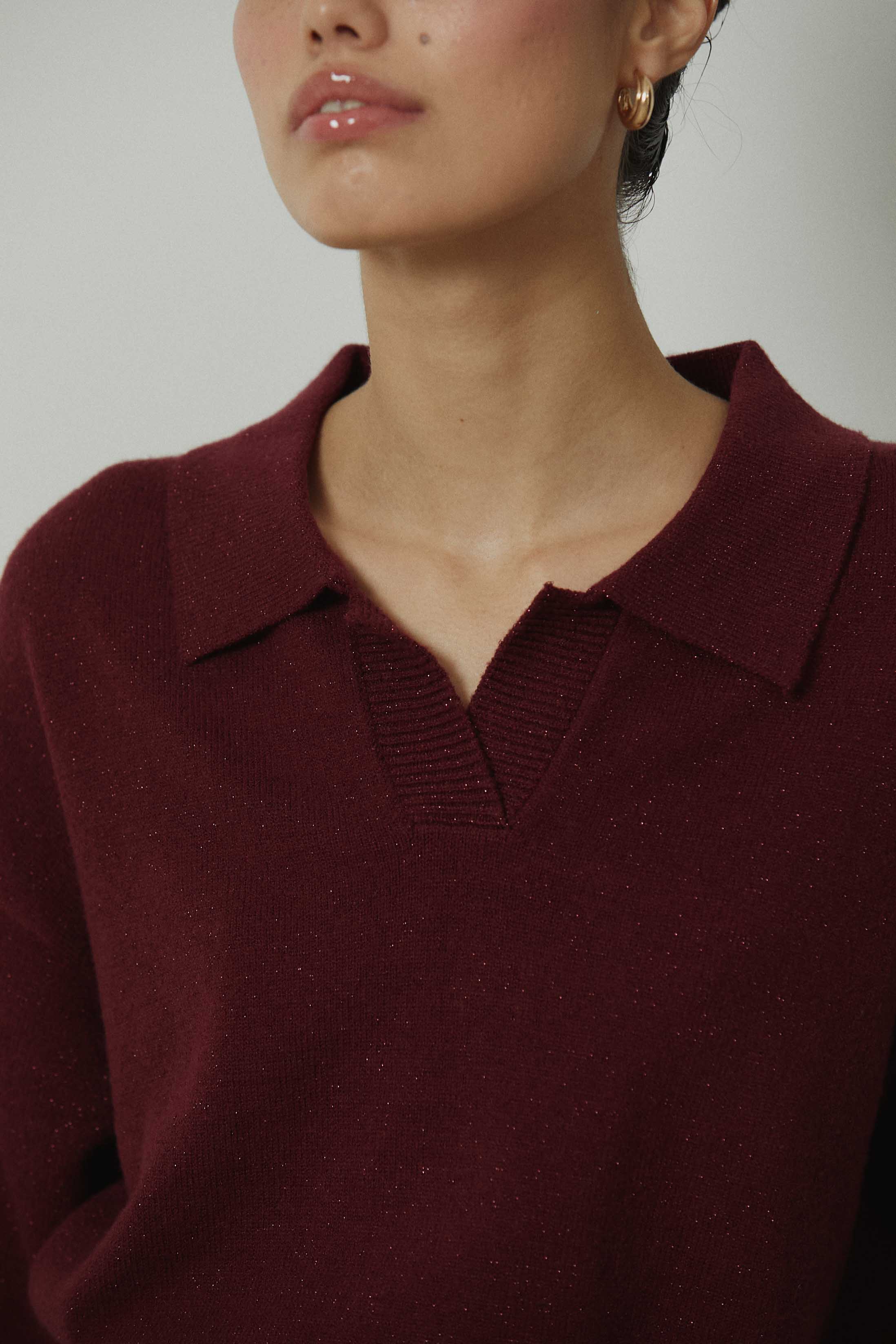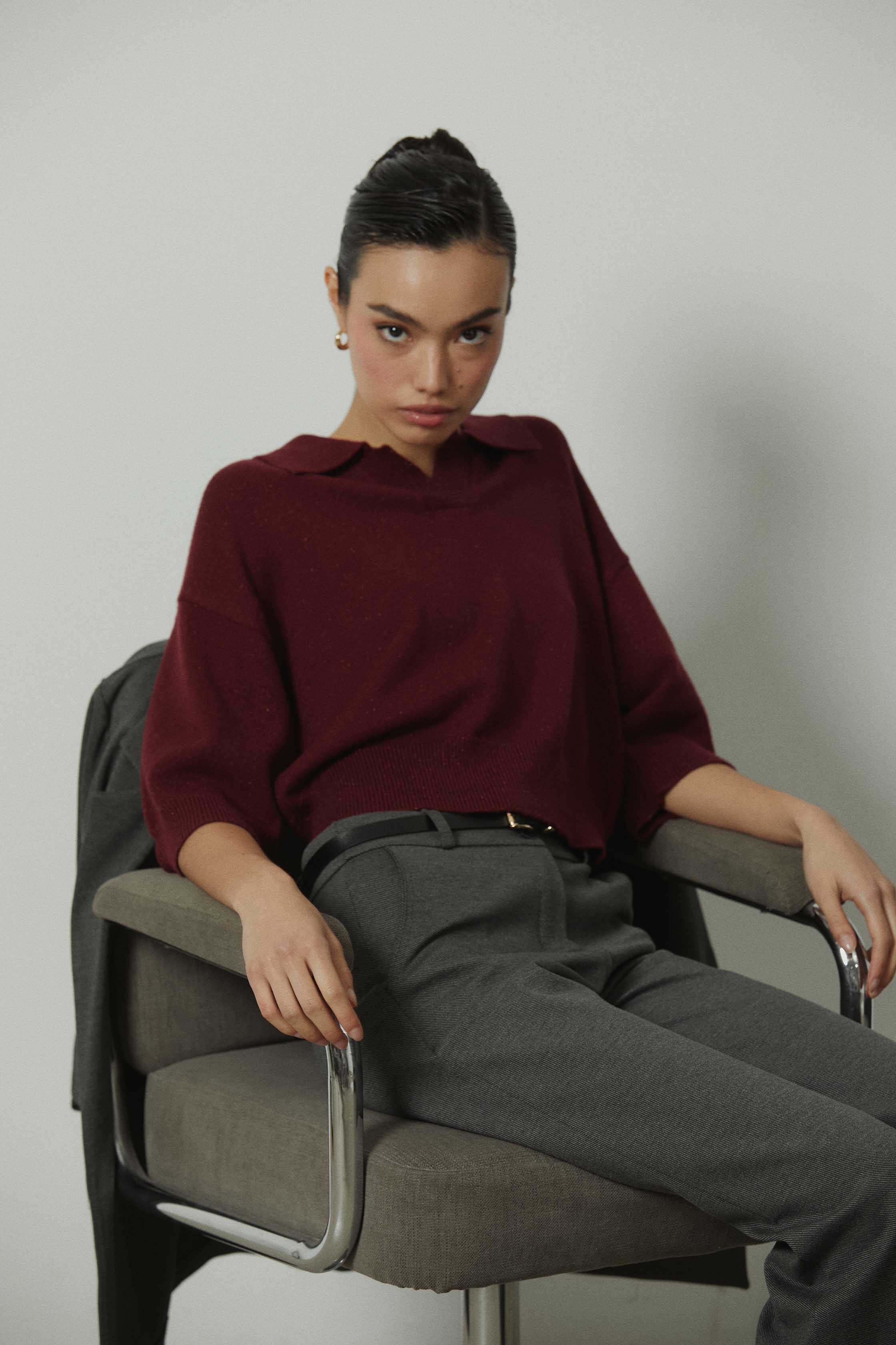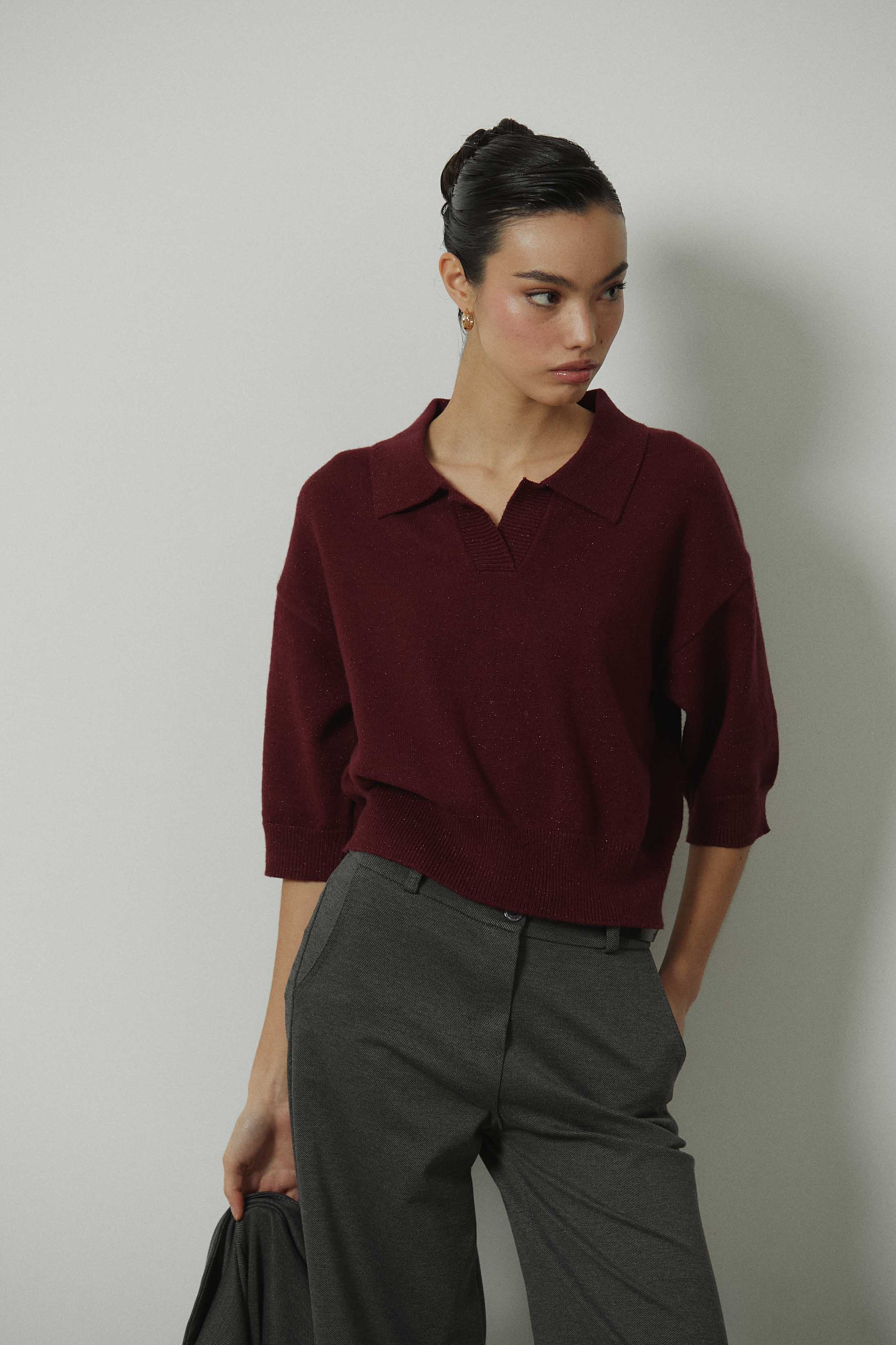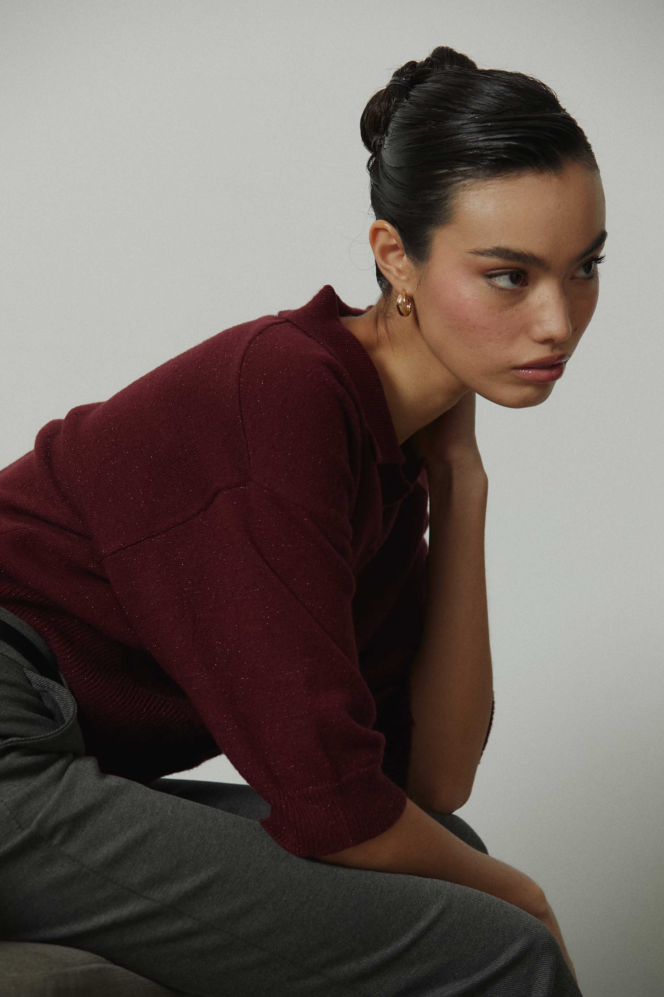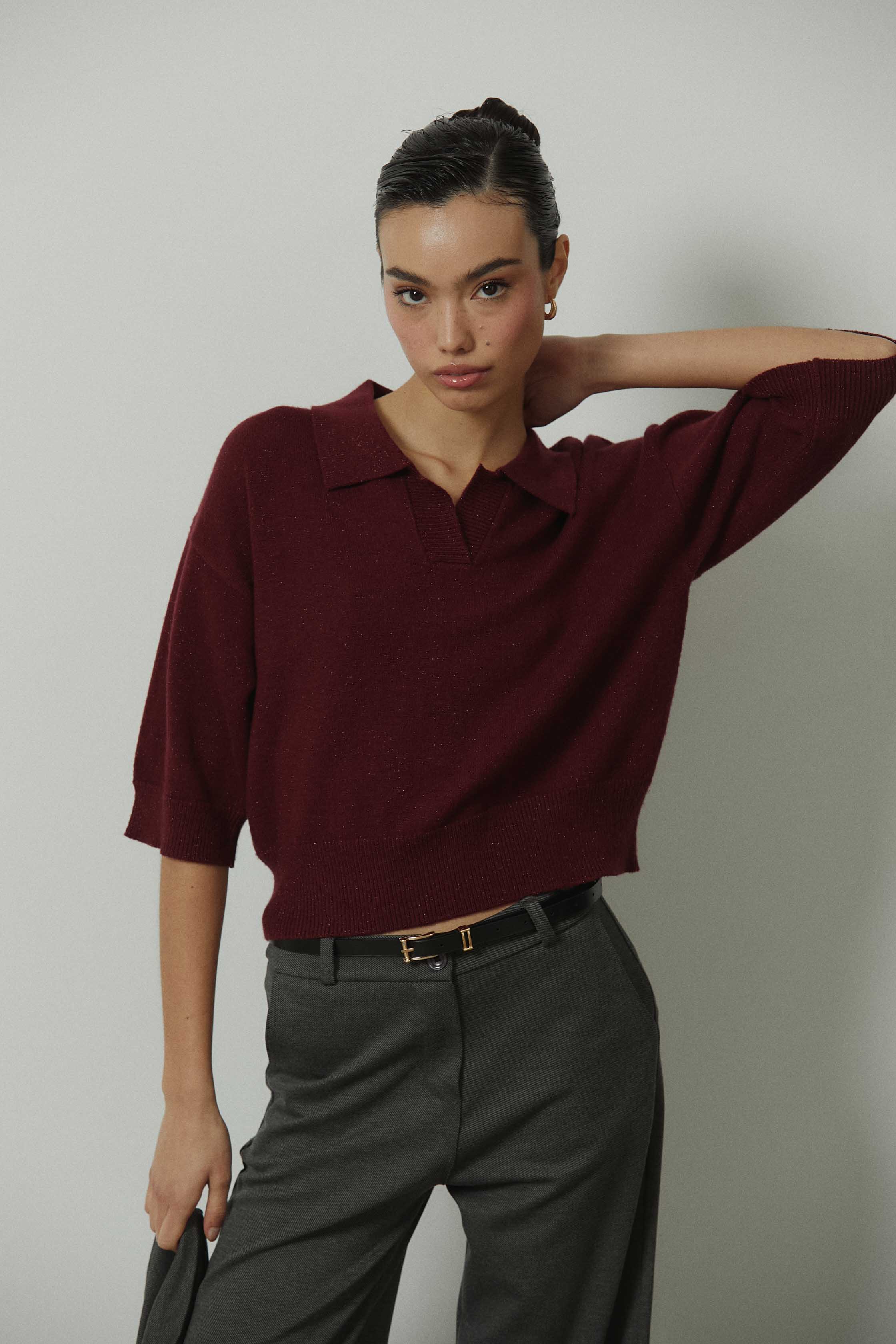 Polo de punto fino en tono berenjena, con cuello camisero y escote en pico sin botones. Manga corta ligeramente amplia y acabados acanalados en bajo y mangas que aportan estructura al diseño. Corte recto y largo a la cadera, pensado para un ajuste cómodo y equilibrado.